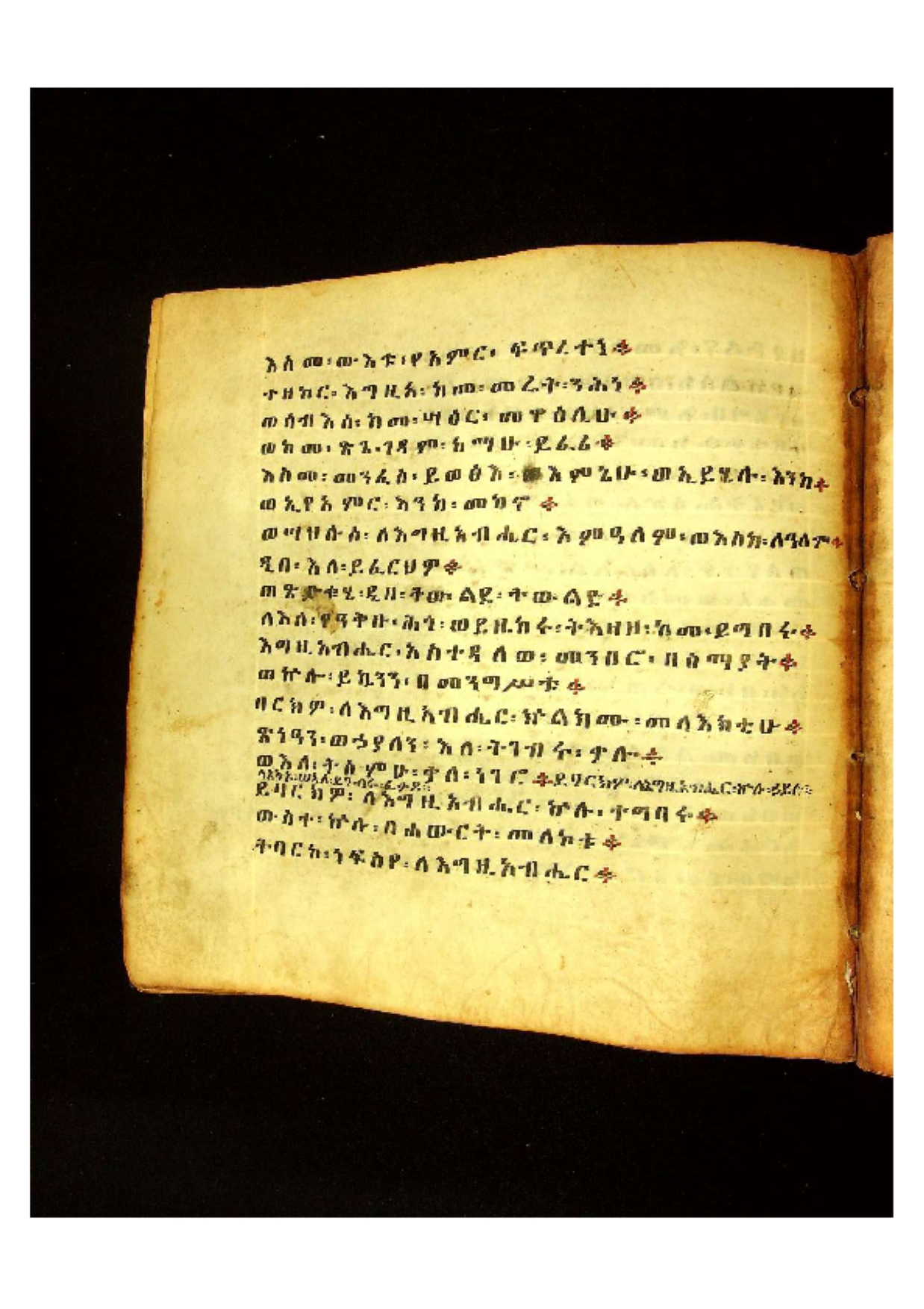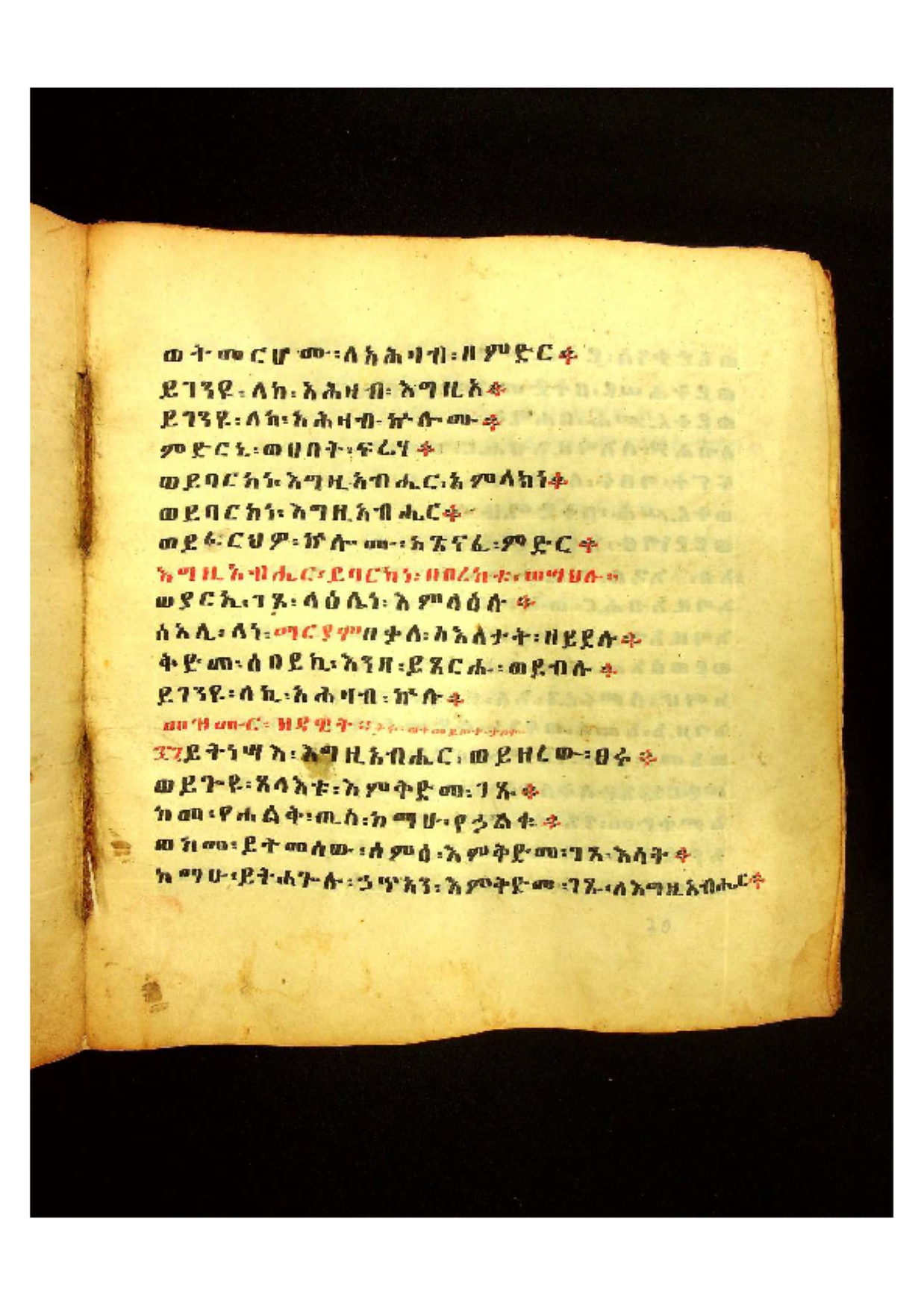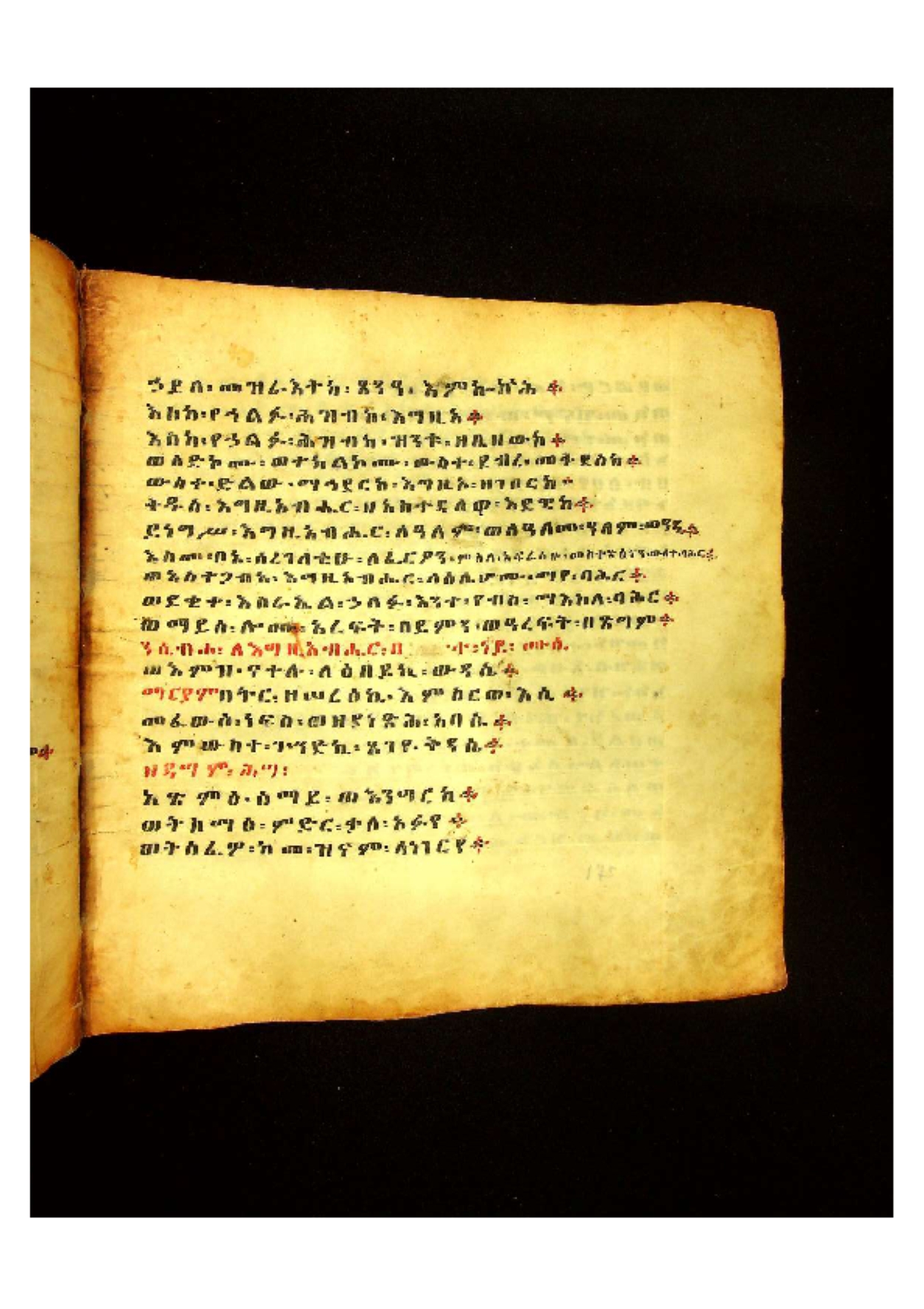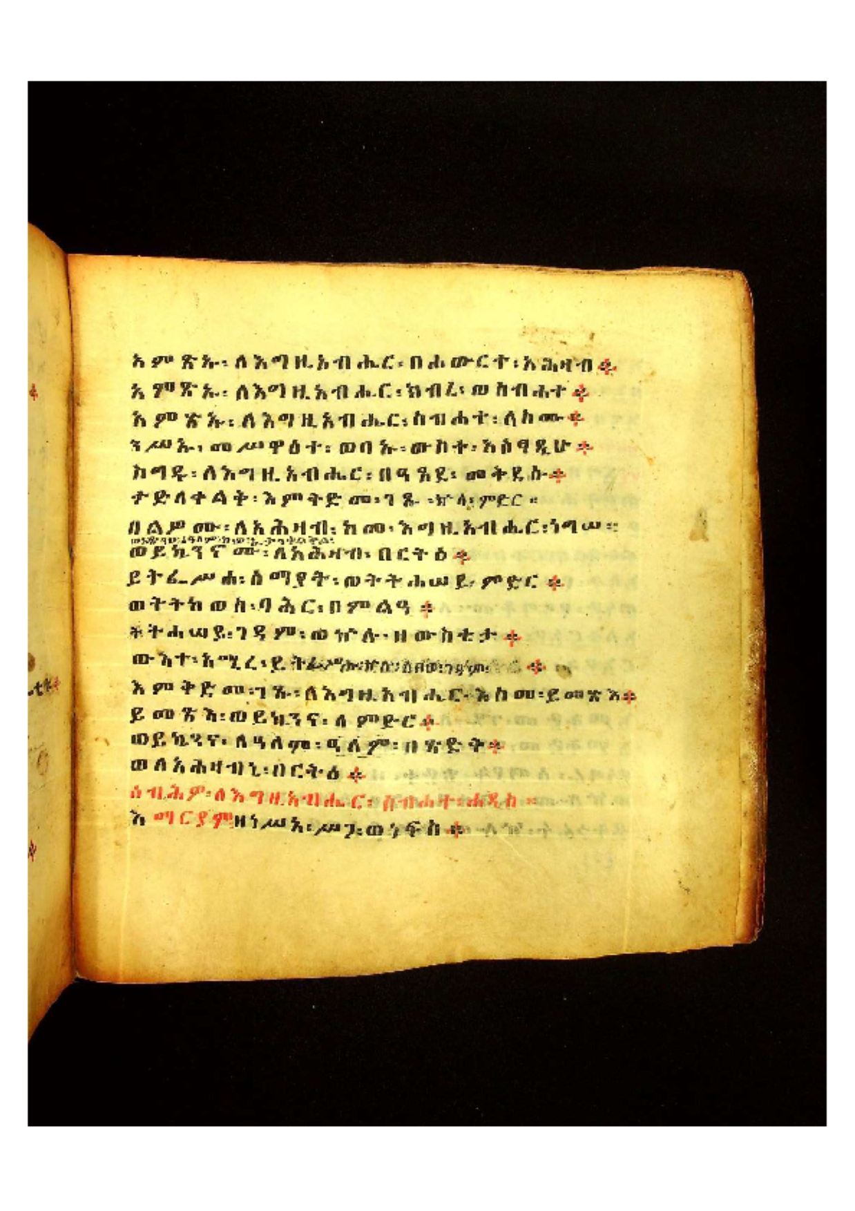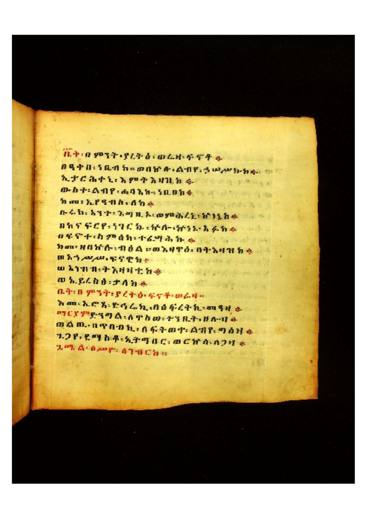 1. F. 2r: donation note written vertically in the outer margin, in black ink: “alla famiglia Bruschettini, Pussy […] Battaglia dell’Amba Aradam il 16 febbraio 1936 XIV”. The note, written in Italian and partly illegible, indicates the Bruschettini family as the receiver of the book and mentions the Battle of Amba Aradam, which took place on 16 February 1936. 2. F. 5r: note written in Italian in the outer upper margin, in red pencil: “Amba Aradam 16/2/XIV ore 17.30 P. Paloboni (?)”. This note also mentions the Battle of Amba Aradam, together with an individual whose name is partially unclear (P. Paloboni?). 3. F. 173v: supplication note written in small script in a mediocre hand, at the end of the “Psalms of David”: ዕቀበኒ፡ እምዓይነ፡ ደዌ፡ ወሞት፡ ለገብርከ፡ ደቅስዮስ፡, “protect me, your servant Däqsəyos, from the eye of infirmity and death”. The note mentions a certain Däqsəyos, indicated as “your servant” (possibly a later owner of the codex). 4. F. 173v: incipit of the Gəʿəz and Amharic prayer, perhaps a writing exercise. The note is written in an inaccurate calligraphy on the outer margin of the folio, next to the prayer. The entire text is የህፂ፡ ኖኅን፡ ከማየ[፡] አይኅ። እስራኤልን፡ ከፈርዖን፡ ዳዊትን፡ ከሳኦል፡ ከኢሎፍሊ። ኤ. 5. F. 190v: donation note, written in black ink in a mediocre hand. Text: ዝመጽሐፍ፡ ዘደብተራ፡ ኪሮስ፡ ዘወሀቦ፡ ለታቦተ፡ ሚካኤል፡ ኢትርስዑኒ፡ በአቡነ፡ ዘበሰማያት፡ ዘአቡየ፡ ገብረ፡ ማርያም፡ ወለእምየ፡ ወለተ፡ ሩፋኤል፡, “This book belongs to däbtära Kiros, who donated it to the tabot of [the church of St] Michael. Do not forget me for our Father who is in heaven. [It also belongs] to my father Gäbrä Maryam and my mother Wälättä Rufaʾel”. 6. F. 199v: writings executed in an inaccurate hand, perhaps the same of note 4. The note includes pen trials (ፈቲነ፡ ብርዕ፡ ዘፈረና፡ etc.), reproduces the explicit of the “Song of the songs” (ስብሐታተኪ፡ ማርያም፡ ከመ፡ እንተ፡ ሕልቀት፡ etc.) and the incipit of the “Praise of Mary” (ውዳሴ፡ ዘሰኑይ፡ ፈቀደ፡ እግዚእ፡ etc., partly rubricated). The writings also mention Däqsəyos, indicated as “your servant” (possibly a later owner of the codex) 7. F. 220ra–va: Genealogic note written on two columns. The note illustrates the family tree of King Yoḥannǝs I, who reigned from 1667 to 1682. The text is acephalous. Incipit: [ወለ]ደ፡ እምሐና፡ ብእሲቱ፡ አሦተ፡ ቅዱሳንሃ፡ ወአሦተ፡ ቅዱሳንኒ፡ እምነ፡ ጳውሊ፡ ብእሲሃ፡ ወለደቶሙ፡ ለአቤተኁን፡ ማእምሮ፡ ወለዘሥላሴ፡ ወአቤተኁን፡ ማእምሮኒ፡ ወለደ፡ አቃርዮስ፡ ወአቃርዮስኒ፡ ወለደ፡ እመቤት፡ እኅተ፡ ክርስቶስሃ፡. The text is published and translated in Proverbio D.V., 2000, ‘Inventario sommario dei manoscritti arabi, ebraici, etiopici – con notizia dei turchi – conservati presso la Biblioteca della Badia di Grottaferrata’. Atti della Accademia nazionale dei Lincei, Memorie, Classe di scienze morali, storiche e filologiche, serie IX, 12 (2000), 468–570 (here pp. 496–97, Appendice III). 8. F. 220va–b: Protective prayer against snakes, written on two columns. Incipit: በስመ፡ አብ፡ … ጸሎት፡ በእንተ፡ ዓርዌ፡ ምድር። ሶበ፡ በጽሐ፡ መልእክት፡ ሐሰውከ፡ በል፡ ፫ጊዜ፡ አኂዘከ፡ ዘፈረ፡ ልብሰ፡ ለእመ፡ ሀሎ፡ ርሑቀ፡ አስትዮ፡. The prayer is probably written in the same hand of note 7. 9. F. 220vb: Unidentified magic prayer containing asmat-names. Incipit: በስመ፡ አብ፡ … ኦላዘላህም፡ አህጉረ፡ ቀዳ[.]፡ ፍሖም፡ ሊስ፡ አፍሊስ፡ ምልክዮስ፡ ዘ[..]ማኤል፡ በዝንቱ፡ አስማቲከ፡ [.]ጽ[..] ኃይለ፡ በረድ፡ ወነፋስ፡ ከማሁ፡. |