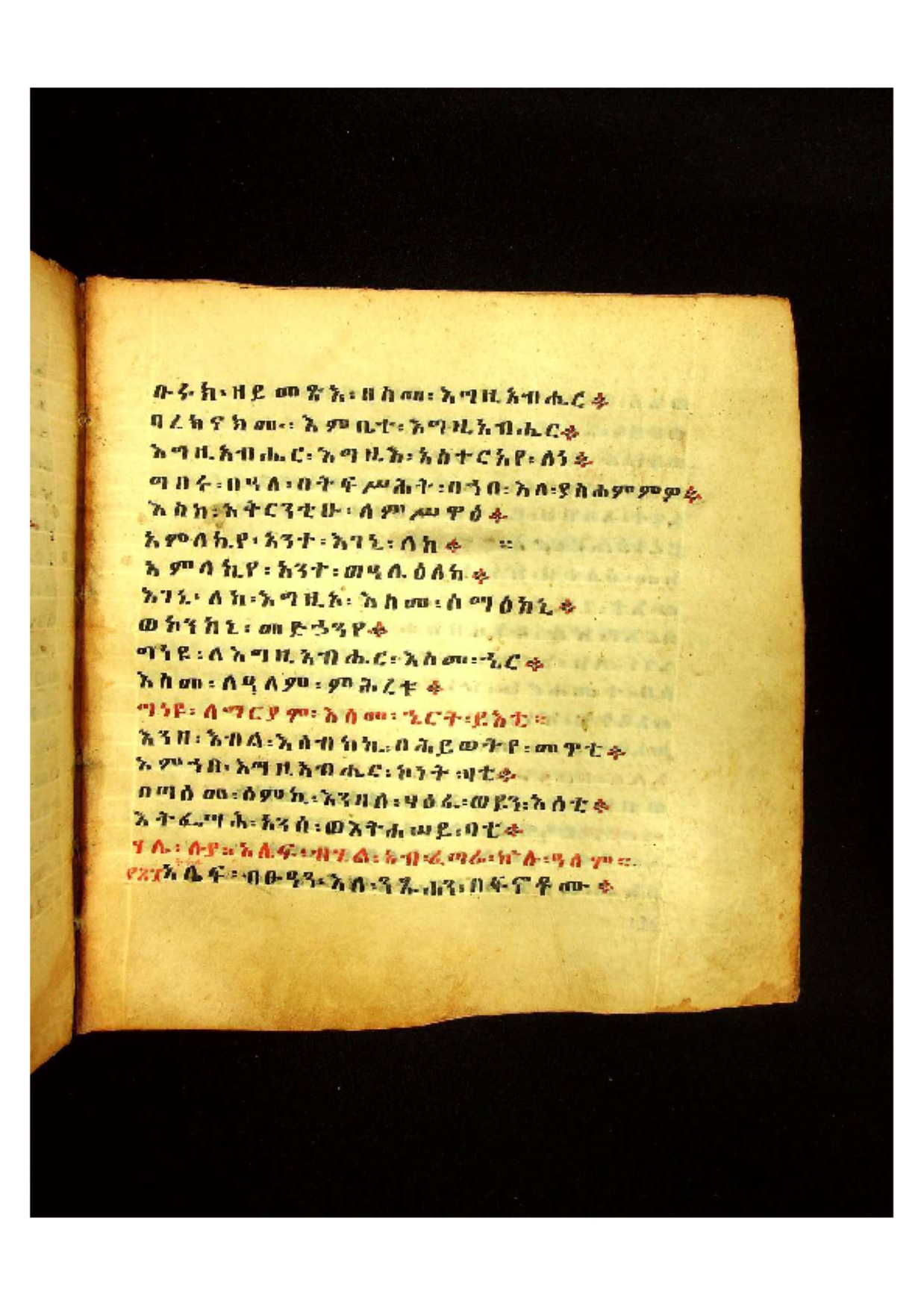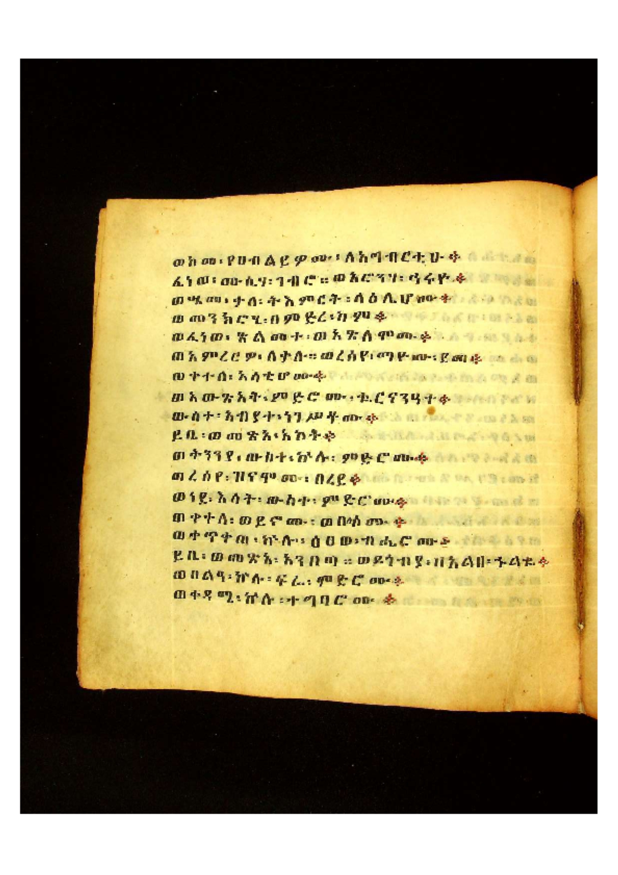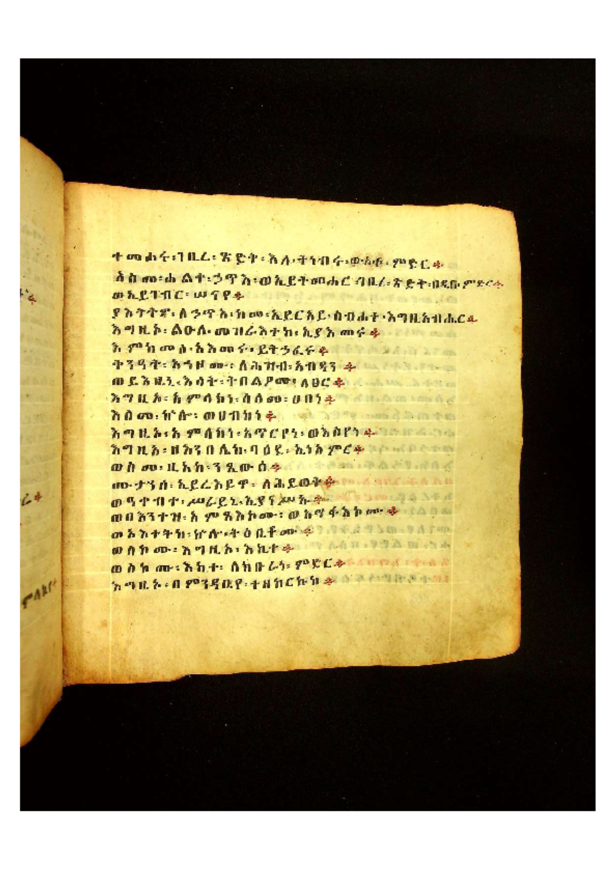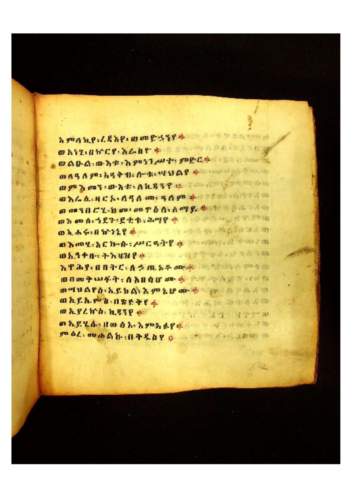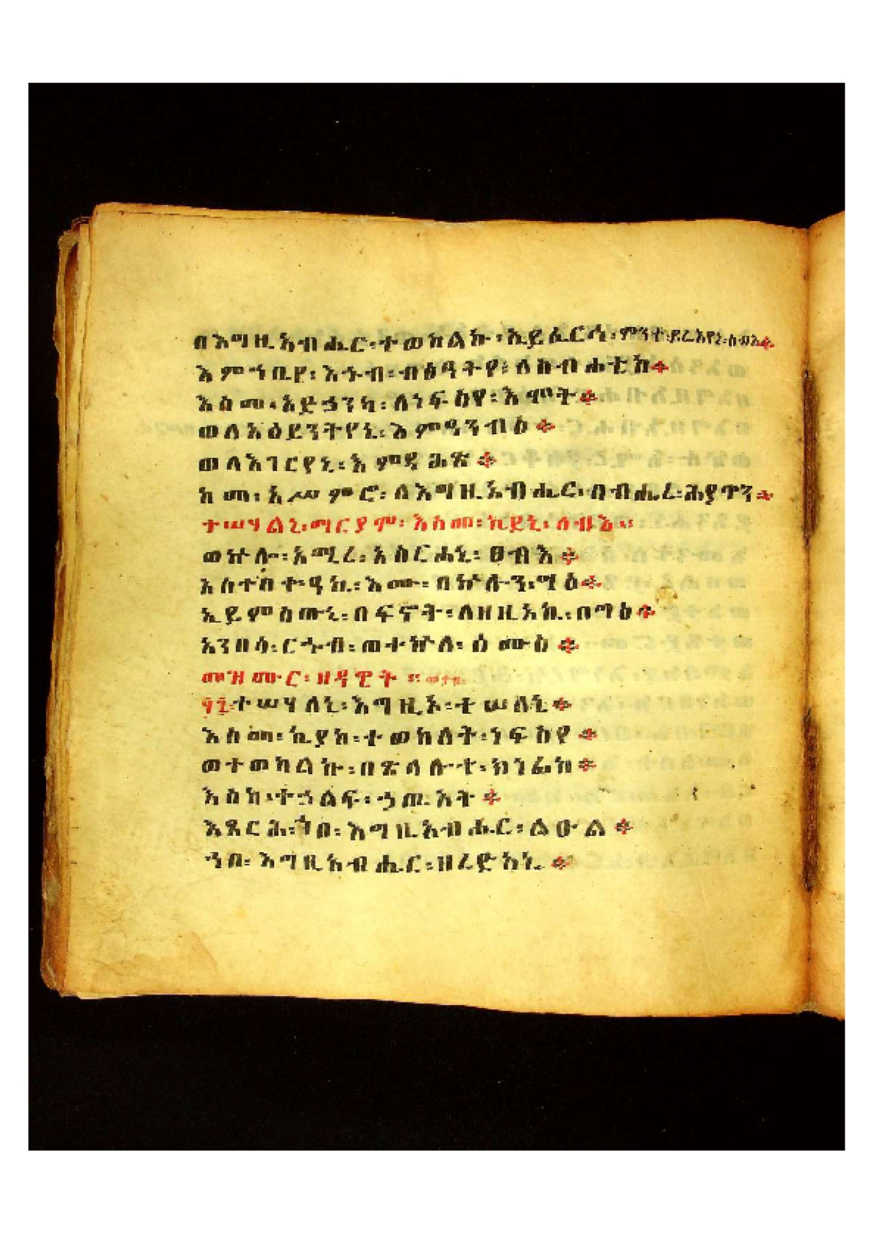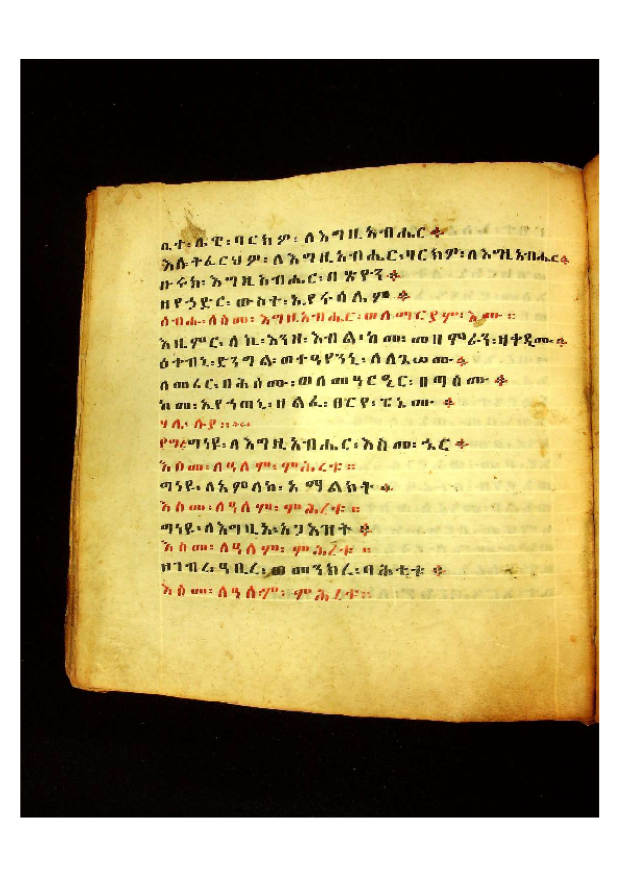 1. F. 2r: donation note written vertically in the outer margin, in black ink: “alla famiglia Bruschettini, Pussy […] Battaglia dell’Amba Aradam il 16 febbraio 1936 XIV”. The note, written in Italian and partly illegible, indicates the Bruschettini family as the receiver of the book and mentions the Battle of Amba Aradam, which took place on 16 February 1936. 2. F. 5r: note written in Italian in the outer upper margin, in red pencil: “Amba Aradam 16/2/XIV ore 17.30 P. Paloboni (?)”. This note also mentions the Battle of Amba Aradam, together with an individual whose name is partially unclear (P. Paloboni?). 3. F. 173v: supplication note written in small script in a mediocre hand, at the end of the “Psalms of David”: ዕቀበኒ፡ እምዓይነ፡ ደዌ፡ ወሞት፡ ለገብርከ፡ ደቅስዮስ፡, “protect me, your servant Däqsəyos, from the eye of infirmity and death”. The note mentions a certain Däqsəyos, indicated as “your servant” (possibly a later owner of the codex). 4. F. 173v: incipit of the Gəʿəz and Amharic prayer, perhaps a writing exercise. The note is written in an inaccurate calligraphy on the outer margin of the folio, next to the prayer. The entire text is የህፂ፡ ኖኅን፡ ከማየ[፡] አይኅ። እስራኤልን፡ ከፈርዖን፡ ዳዊትን፡ ከሳኦል፡ ከኢሎፍሊ። ኤ. 5. F. 190v: donation note, written in black ink in a mediocre hand. Text: ዝመጽሐፍ፡ ዘደብተራ፡ ኪሮስ፡ ዘወሀቦ፡ ለታቦተ፡ ሚካኤል፡ ኢትርስዑኒ፡ በአቡነ፡ ዘበሰማያት፡ ዘአቡየ፡ ገብረ፡ ማርያም፡ ወለእምየ፡ ወለተ፡ ሩፋኤል፡, “This book belongs to däbtära Kiros, who donated it to the tabot of [the church of St] Michael. Do not forget me for our Father who is in heaven. [It also belongs] to my father Gäbrä Maryam and my mother Wälättä Rufaʾel”. 6. F. 199v: writings executed in an inaccurate hand, perhaps the same of note 4. The note includes pen trials (ፈቲነ፡ ብርዕ፡ ዘፈረና፡ etc.), reproduces the explicit of the “Song of the songs” (ስብሐታተኪ፡ ማርያም፡ ከመ፡ እንተ፡ ሕልቀት፡ etc.) and the incipit of the “Praise of Mary” (ውዳሴ፡ ዘሰኑይ፡ ፈቀደ፡ እግዚእ፡ etc., partly rubricated). The writings also mention Däqsəyos, indicated as “your servant” (possibly a later owner of the codex) 7. F. 220ra–va: Genealogic note written on two columns. The note illustrates the family tree of King Yoḥannǝs I, who reigned from 1667 to 1682. The text is acephalous. Incipit: [ወለ]ደ፡ እምሐና፡ ብእሲቱ፡ አሦተ፡ ቅዱሳንሃ፡ ወአሦተ፡ ቅዱሳንኒ፡ እምነ፡ ጳውሊ፡ ብእሲሃ፡ ወለደቶሙ፡ ለአቤተኁን፡ ማእምሮ፡ ወለዘሥላሴ፡ ወአቤተኁን፡ ማእምሮኒ፡ ወለደ፡ አቃርዮስ፡ ወአቃርዮስኒ፡ ወለደ፡ እመቤት፡ እኅተ፡ ክርስቶስሃ፡. The text is published and translated in Proverbio D.V., 2000, ‘Inventario sommario dei manoscritti arabi, ebraici, etiopici – con notizia dei turchi – conservati presso la Biblioteca della Badia di Grottaferrata’. Atti della Accademia nazionale dei Lincei, Memorie, Classe di scienze morali, storiche e filologiche, serie IX, 12 (2000), 468–570 (here pp. 496–97, Appendice III). 8. F. 220va–b: Protective prayer against snakes, written on two columns. Incipit: በስመ፡ አብ፡ … ጸሎት፡ በእንተ፡ ዓርዌ፡ ምድር። ሶበ፡ በጽሐ፡ መልእክት፡ ሐሰውከ፡ በል፡ ፫ጊዜ፡ አኂዘከ፡ ዘፈረ፡ ልብሰ፡ ለእመ፡ ሀሎ፡ ርሑቀ፡ አስትዮ፡. The prayer is probably written in the same hand of note 7. 9. F. 220vb: Unidentified magic prayer containing asmat-names. Incipit: በስመ፡ አብ፡ … ኦላዘላህም፡ አህጉረ፡ ቀዳ[.]፡ ፍሖም፡ ሊስ፡ አፍሊስ፡ ምልክዮስ፡ ዘ[..]ማኤል፡ በዝንቱ፡ አስማቲከ፡ [.]ጽ[..] ኃይለ፡ በረድ፡ ወነፋስ፡ ከማሁ፡. |