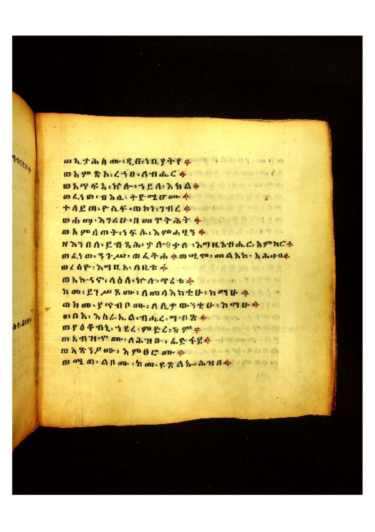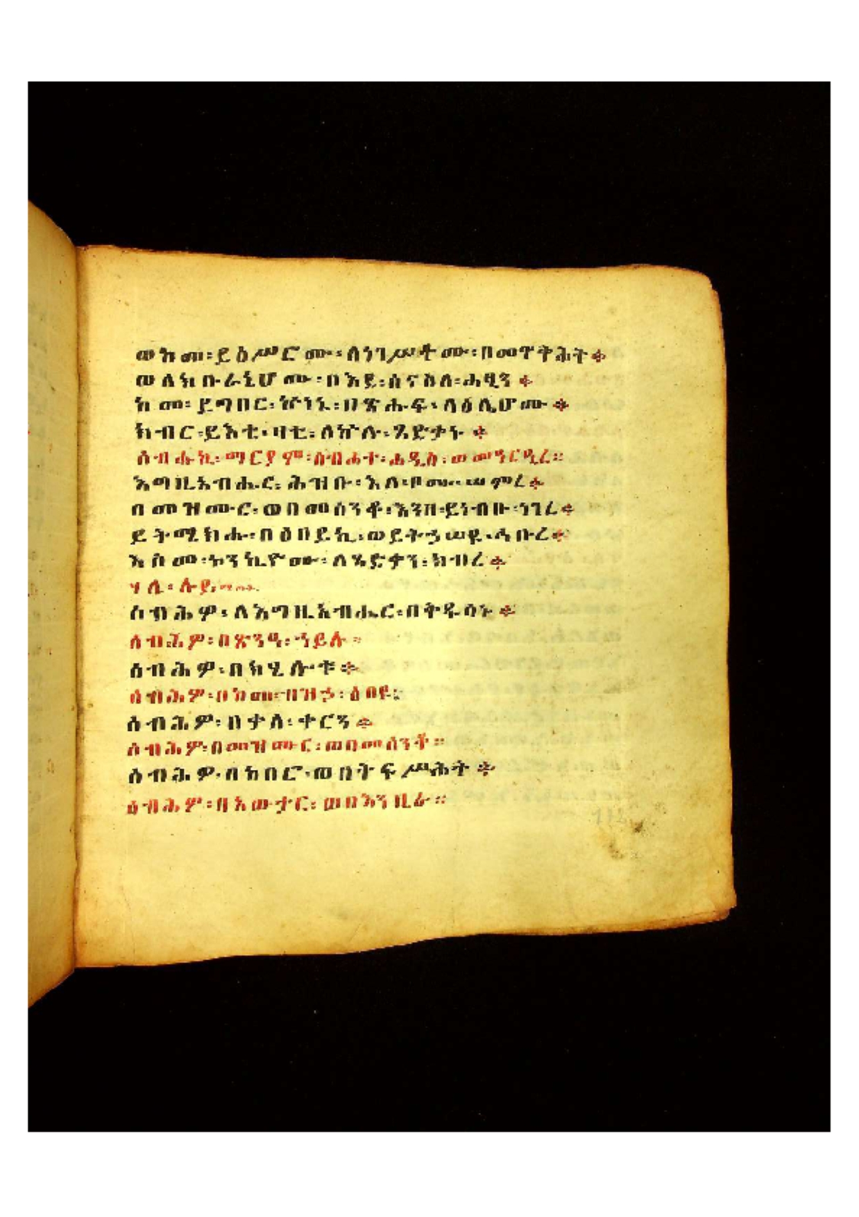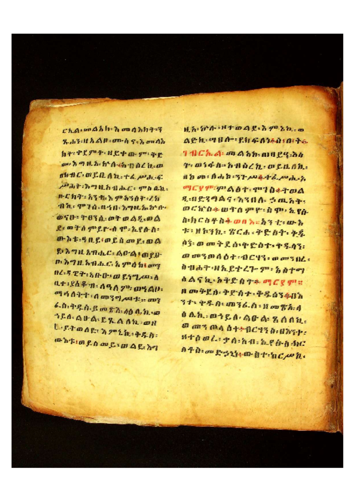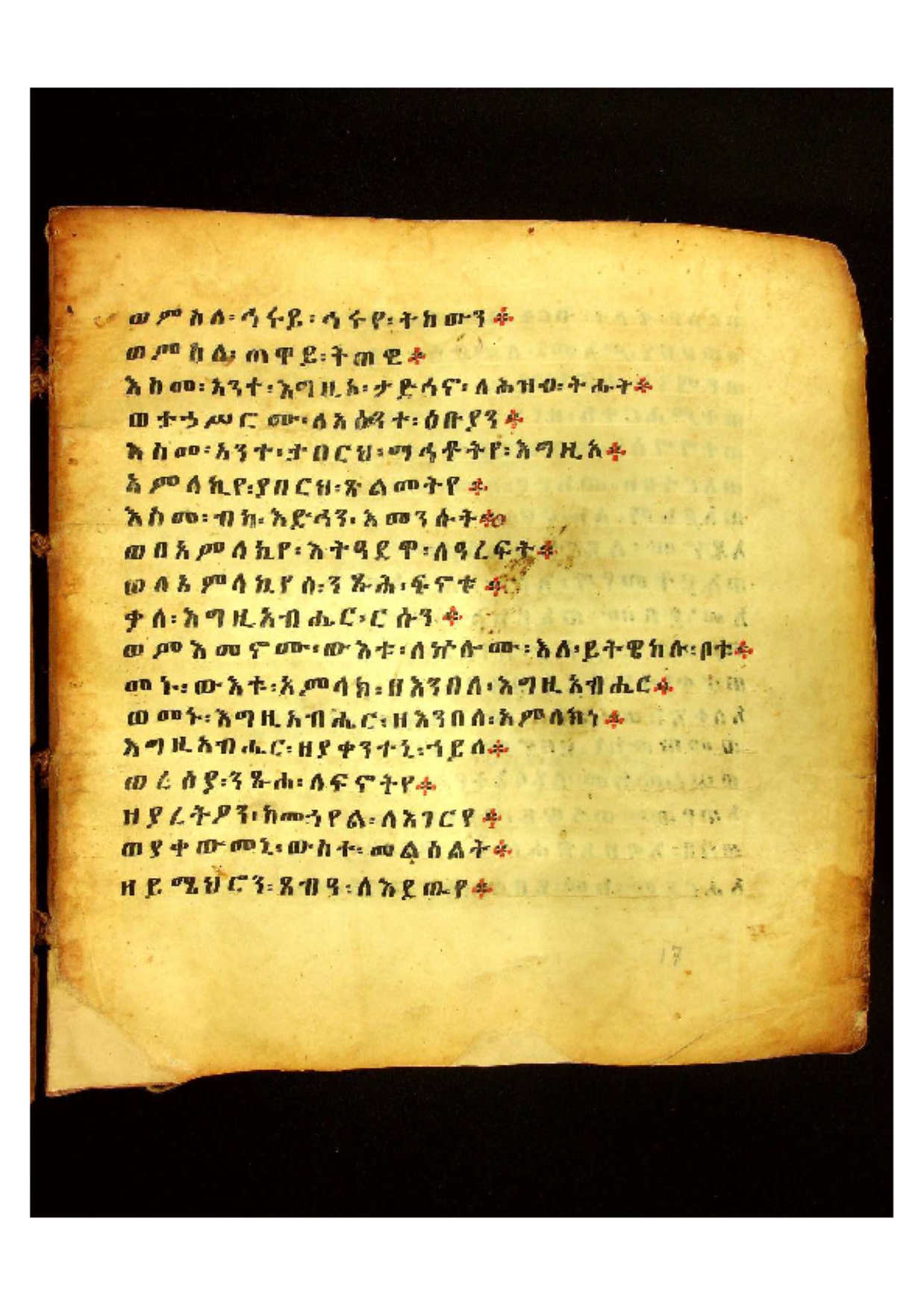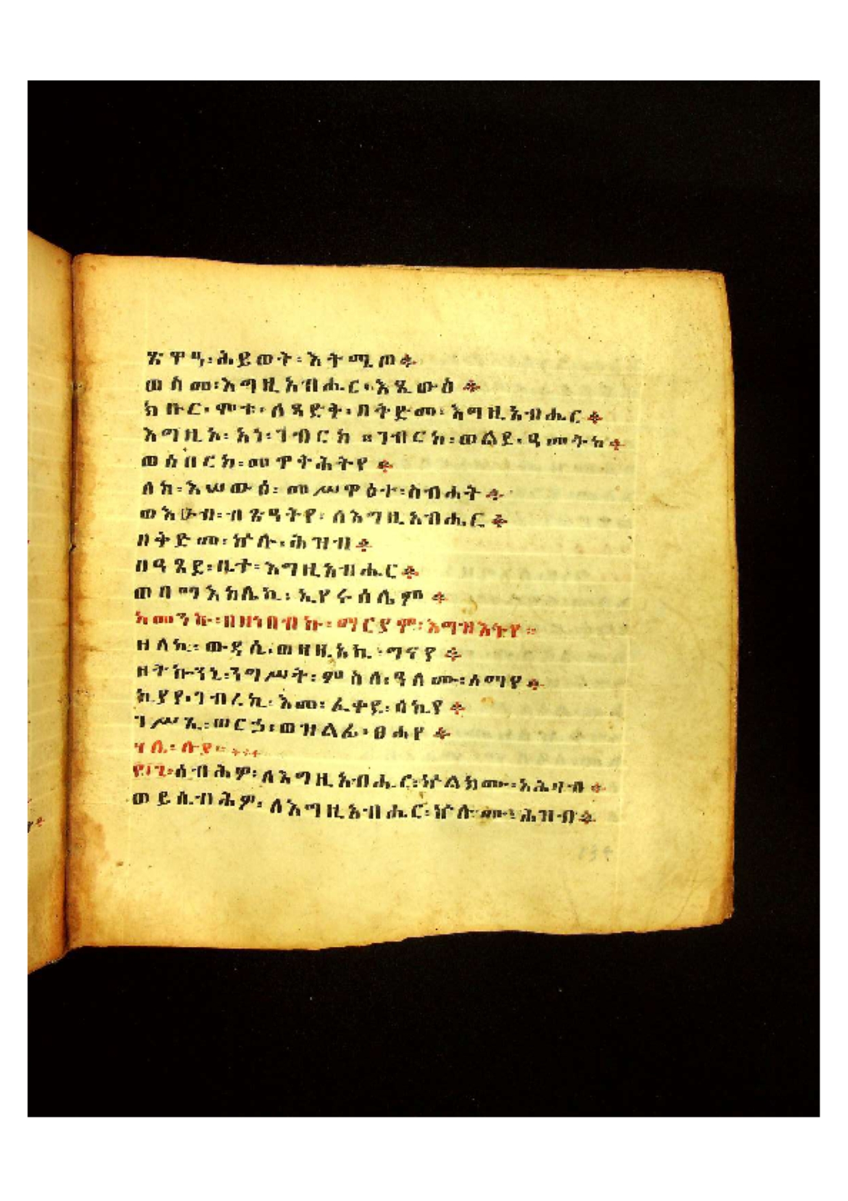 1. F. 2r: donation note written vertically in the outer margin, in black ink: “alla famiglia Bruschettini, Pussy […] Battaglia dell’Amba Aradam il 16 febbraio 1936 XIV”. The note, written in Italian and partly illegible, indicates the Bruschettini family as the receiver of the book and mentions the Battle of Amba Aradam, which took place on 16 February 1936. 2. F. 5r: note written in Italian in the outer upper margin, in red pencil: “Amba Aradam 16/2/XIV ore 17.30 P. Paloboni (?)”. This note also mentions the Battle of Amba Aradam, together with an individual whose name is partially unclear (P. Paloboni?). 3. F. 173v: supplication note written in small script in a mediocre hand, at the end of the “Psalms of David”: ዕቀበኒ፡ እምዓይነ፡ ደዌ፡ ወሞት፡ ለገብርከ፡ ደቅስዮስ፡, “protect me, your servant Däqsəyos, from the eye of infirmity and death”. The note mentions a certain Däqsəyos, indicated as “your servant” (possibly a later owner of the codex). 4. F. 173v: incipit of the Gəʿəz and Amharic prayer, perhaps a writing exercise. The note is written in an inaccurate calligraphy on the outer margin of the folio, next to the prayer. The entire text is የህፂ፡ ኖኅን፡ ከማየ[፡] አይኅ። እስራኤልን፡ ከፈርዖን፡ ዳዊትን፡ ከሳኦል፡ ከኢሎፍሊ። ኤ. 5. F. 190v: donation note, written in black ink in a mediocre hand. Text: ዝመጽሐፍ፡ ዘደብተራ፡ ኪሮስ፡ ዘወሀቦ፡ ለታቦተ፡ ሚካኤል፡ ኢትርስዑኒ፡ በአቡነ፡ ዘበሰማያት፡ ዘአቡየ፡ ገብረ፡ ማርያም፡ ወለእምየ፡ ወለተ፡ ሩፋኤል፡, “This book belongs to däbtära Kiros, who donated it to the tabot of [the church of St] Michael. Do not forget me for our Father who is in heaven. [It also belongs] to my father Gäbrä Maryam and my mother Wälättä Rufaʾel”. 6. F. 199v: writings executed in an inaccurate hand, perhaps the same of note 4. The note includes pen trials (ፈቲነ፡ ብርዕ፡ ዘፈረና፡ etc.), reproduces the explicit of the “Song of the songs” (ስብሐታተኪ፡ ማርያም፡ ከመ፡ እንተ፡ ሕልቀት፡ etc.) and the incipit of the “Praise of Mary” (ውዳሴ፡ ዘሰኑይ፡ ፈቀደ፡ እግዚእ፡ etc., partly rubricated). The writings also mention Däqsəyos, indicated as “your servant” (possibly a later owner of the codex) 7. F. 220ra–va: Genealogic note written on two columns. The note illustrates the family tree of King Yoḥannǝs I, who reigned from 1667 to 1682. The text is acephalous. Incipit: [ወለ]ደ፡ እምሐና፡ ብእሲቱ፡ አሦተ፡ ቅዱሳንሃ፡ ወአሦተ፡ ቅዱሳንኒ፡ እምነ፡ ጳውሊ፡ ብእሲሃ፡ ወለደቶሙ፡ ለአቤተኁን፡ ማእምሮ፡ ወለዘሥላሴ፡ ወአቤተኁን፡ ማእምሮኒ፡ ወለደ፡ አቃርዮስ፡ ወአቃርዮስኒ፡ ወለደ፡ እመቤት፡ እኅተ፡ ክርስቶስሃ፡. The text is published and translated in Proverbio D.V., 2000, ‘Inventario sommario dei manoscritti arabi, ebraici, etiopici – con notizia dei turchi – conservati presso la Biblioteca della Badia di Grottaferrata’. Atti della Accademia nazionale dei Lincei, Memorie, Classe di scienze morali, storiche e filologiche, serie IX, 12 (2000), 468–570 (here pp. 496–97, Appendice III). 8. F. 220va–b: Protective prayer against snakes, written on two columns. Incipit: በስመ፡ አብ፡ … ጸሎት፡ በእንተ፡ ዓርዌ፡ ምድር። ሶበ፡ በጽሐ፡ መልእክት፡ ሐሰውከ፡ በል፡ ፫ጊዜ፡ አኂዘከ፡ ዘፈረ፡ ልብሰ፡ ለእመ፡ ሀሎ፡ ርሑቀ፡ አስትዮ፡. The prayer is probably written in the same hand of note 7. 9. F. 220vb: Unidentified magic prayer containing asmat-names. Incipit: በስመ፡ አብ፡ … ኦላዘላህም፡ አህጉረ፡ ቀዳ[.]፡ ፍሖም፡ ሊስ፡ አፍሊስ፡ ምልክዮስ፡ ዘ[..]ማኤል፡ በዝንቱ፡ አስማቲከ፡ [.]ጽ[..] ኃይለ፡ በረድ፡ ወነፋስ፡ ከማሁ፡. |