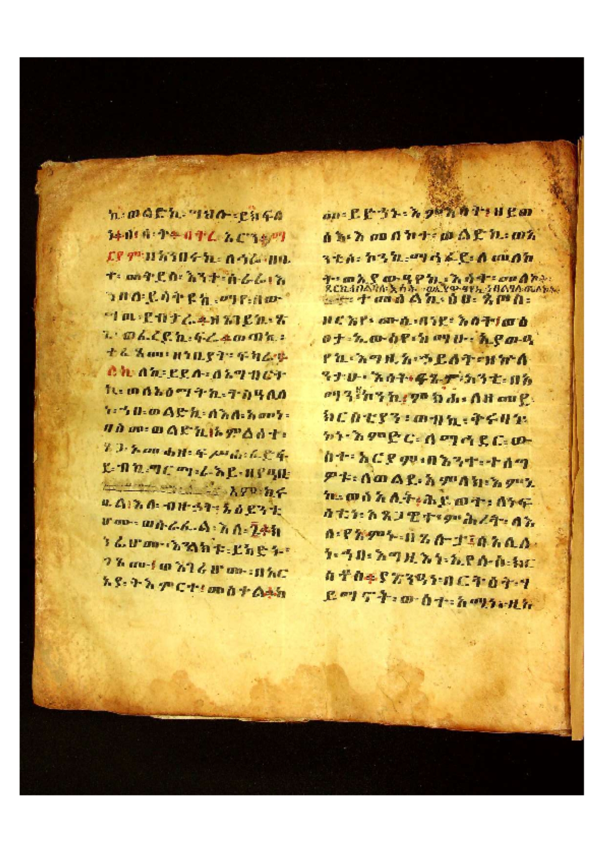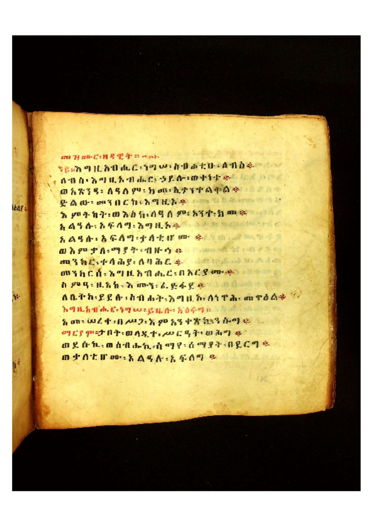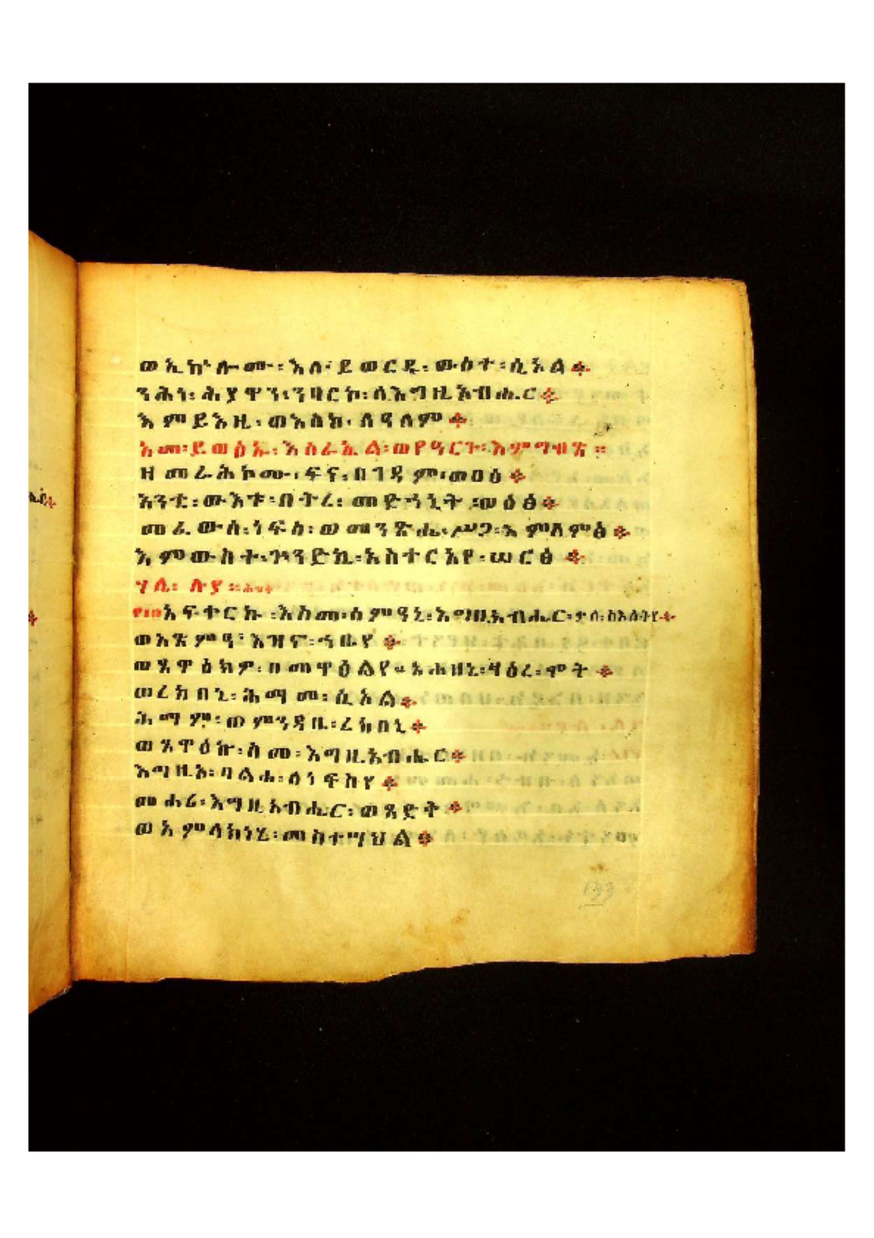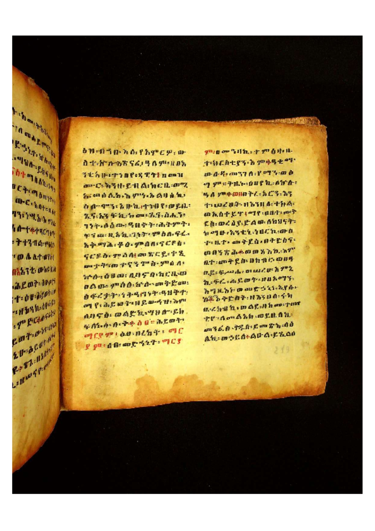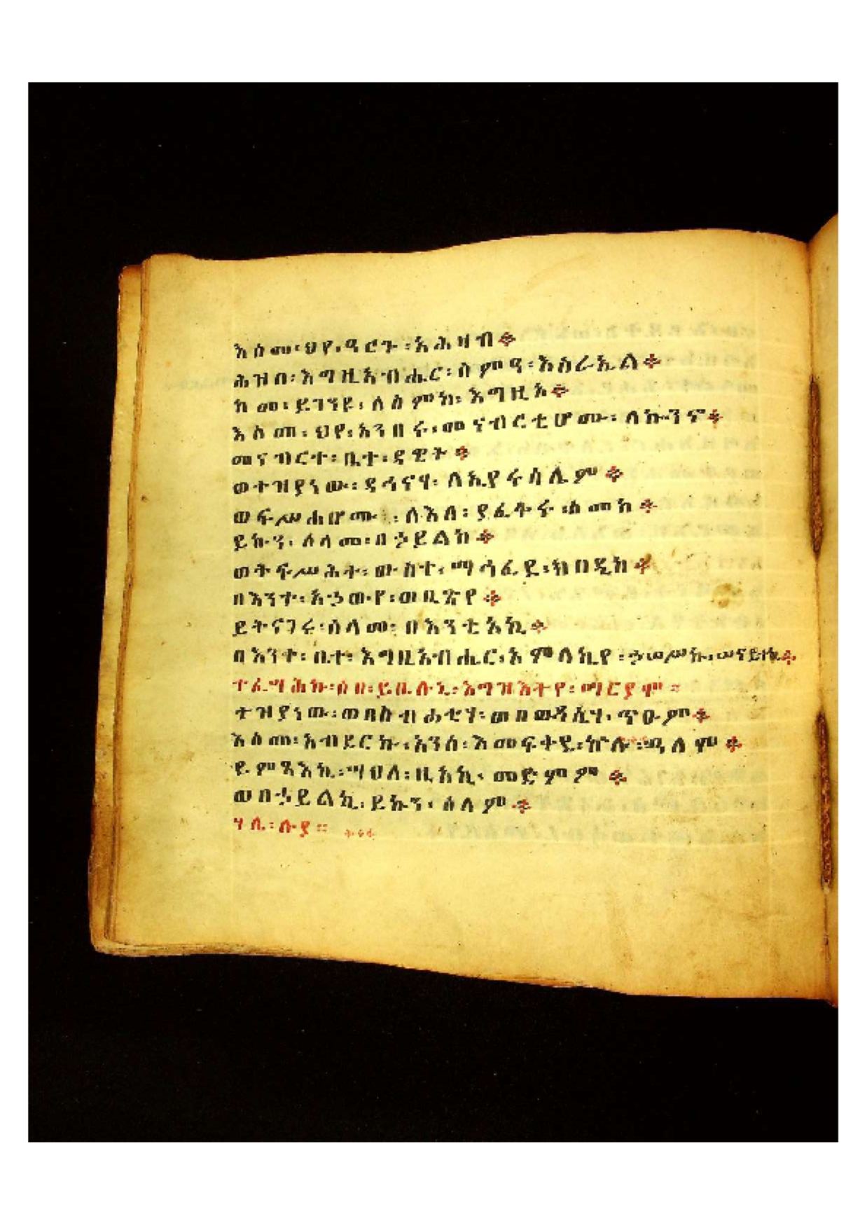 1. F. 2r: donation note written vertically in the outer margin, in black ink: “alla famiglia Bruschettini, Pussy […] Battaglia dell’Amba Aradam il 16 febbraio 1936 XIV”. The note, written in Italian and partly illegible, indicates the Bruschettini family as the receiver of the book and mentions the Battle of Amba Aradam, which took place on 16 February 1936. 2. F. 5r: note written in Italian in the outer upper margin, in red pencil: “Amba Aradam 16/2/XIV ore 17.30 P. Paloboni (?)”. This note also mentions the Battle of Amba Aradam, together with an individual whose name is partially unclear (P. Paloboni?). 3. F. 173v: supplication note written in small script in a mediocre hand, at the end of the “Psalms of David”: ዕቀበኒ፡ እምዓይነ፡ ደዌ፡ ወሞት፡ ለገብርከ፡ ደቅስዮስ፡, “protect me, your servant Däqsəyos, from the eye of infirmity and death”. The note mentions a certain Däqsəyos, indicated as “your servant” (possibly a later owner of the codex). 4. F. 173v: incipit of the Gəʿəz and Amharic prayer, perhaps a writing exercise. The note is written in an inaccurate calligraphy on the outer margin of the folio, next to the prayer. The entire text is የህፂ፡ ኖኅን፡ ከማየ[፡] አይኅ። እስራኤልን፡ ከፈርዖን፡ ዳዊትን፡ ከሳኦል፡ ከኢሎፍሊ። ኤ. 5. F. 190v: donation note, written in black ink in a mediocre hand. Text: ዝመጽሐፍ፡ ዘደብተራ፡ ኪሮስ፡ ዘወሀቦ፡ ለታቦተ፡ ሚካኤል፡ ኢትርስዑኒ፡ በአቡነ፡ ዘበሰማያት፡ ዘአቡየ፡ ገብረ፡ ማርያም፡ ወለእምየ፡ ወለተ፡ ሩፋኤል፡, “This book belongs to däbtära Kiros, who donated it to the tabot of [the church of St] Michael. Do not forget me for our Father who is in heaven. [It also belongs] to my father Gäbrä Maryam and my mother Wälättä Rufaʾel”. 6. F. 199v: writings executed in an inaccurate hand, perhaps the same of note 4. The note includes pen trials (ፈቲነ፡ ብርዕ፡ ዘፈረና፡ etc.), reproduces the explicit of the “Song of the songs” (ስብሐታተኪ፡ ማርያም፡ ከመ፡ እንተ፡ ሕልቀት፡ etc.) and the incipit of the “Praise of Mary” (ውዳሴ፡ ዘሰኑይ፡ ፈቀደ፡ እግዚእ፡ etc., partly rubricated). The writings also mention Däqsəyos, indicated as “your servant” (possibly a later owner of the codex) 7. F. 220ra–va: Genealogic note written on two columns. The note illustrates the family tree of King Yoḥannǝs I, who reigned from 1667 to 1682. The text is acephalous. Incipit: [ወለ]ደ፡ እምሐና፡ ብእሲቱ፡ አሦተ፡ ቅዱሳንሃ፡ ወአሦተ፡ ቅዱሳንኒ፡ እምነ፡ ጳውሊ፡ ብእሲሃ፡ ወለደቶሙ፡ ለአቤተኁን፡ ማእምሮ፡ ወለዘሥላሴ፡ ወአቤተኁን፡ ማእምሮኒ፡ ወለደ፡ አቃርዮስ፡ ወአቃርዮስኒ፡ ወለደ፡ እመቤት፡ እኅተ፡ ክርስቶስሃ፡. The text is published and translated in Proverbio D.V., 2000, ‘Inventario sommario dei manoscritti arabi, ebraici, etiopici – con notizia dei turchi – conservati presso la Biblioteca della Badia di Grottaferrata’. Atti della Accademia nazionale dei Lincei, Memorie, Classe di scienze morali, storiche e filologiche, serie IX, 12 (2000), 468–570 (here pp. 496–97, Appendice III). 8. F. 220va–b: Protective prayer against snakes, written on two columns. Incipit: በስመ፡ አብ፡ … ጸሎት፡ በእንተ፡ ዓርዌ፡ ምድር። ሶበ፡ በጽሐ፡ መልእክት፡ ሐሰውከ፡ በል፡ ፫ጊዜ፡ አኂዘከ፡ ዘፈረ፡ ልብሰ፡ ለእመ፡ ሀሎ፡ ርሑቀ፡ አስትዮ፡. The prayer is probably written in the same hand of note 7. 9. F. 220vb: Unidentified magic prayer containing asmat-names. Incipit: በስመ፡ አብ፡ … ኦላዘላህም፡ አህጉረ፡ ቀዳ[.]፡ ፍሖም፡ ሊስ፡ አፍሊስ፡ ምልክዮስ፡ ዘ[..]ማኤል፡ በዝንቱ፡ አስማቲከ፡ [.]ጽ[..] ኃይለ፡ በረድ፡ ወነፋስ፡ ከማሁ፡. |