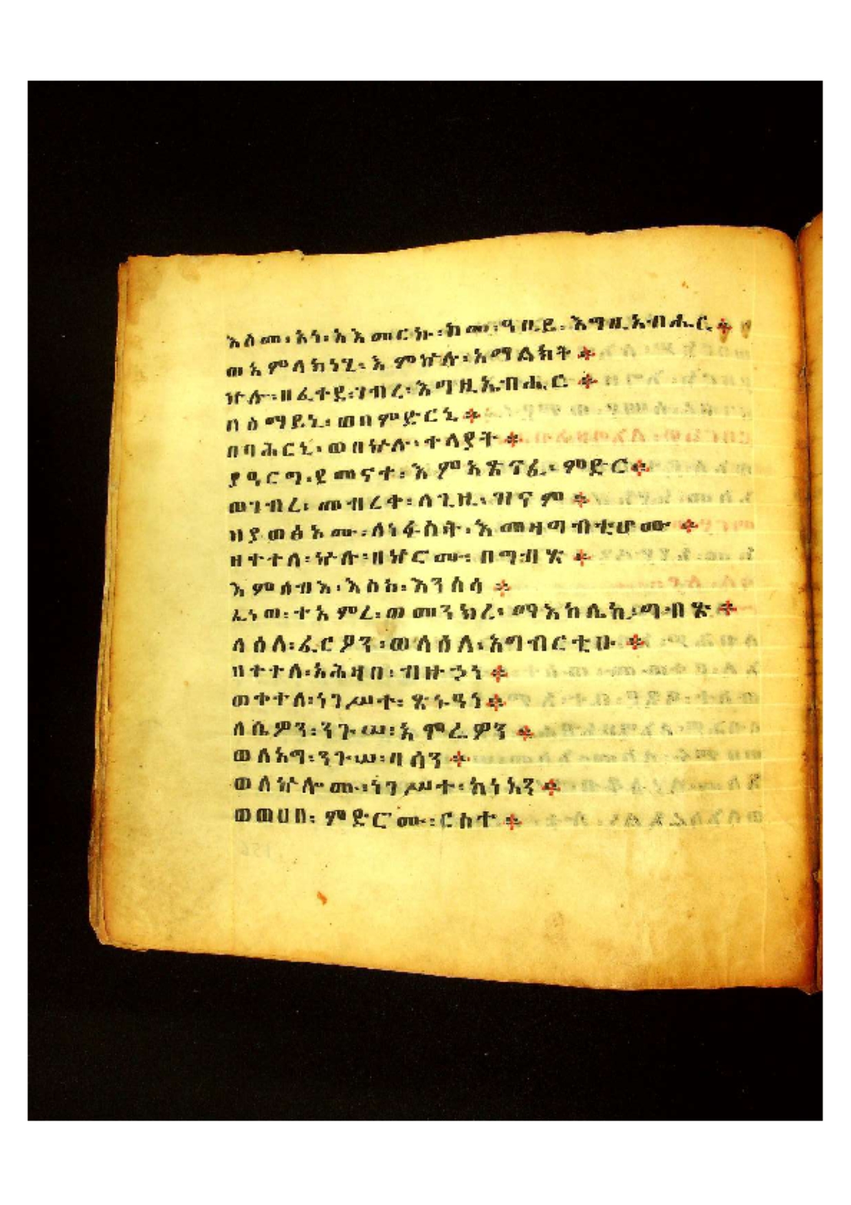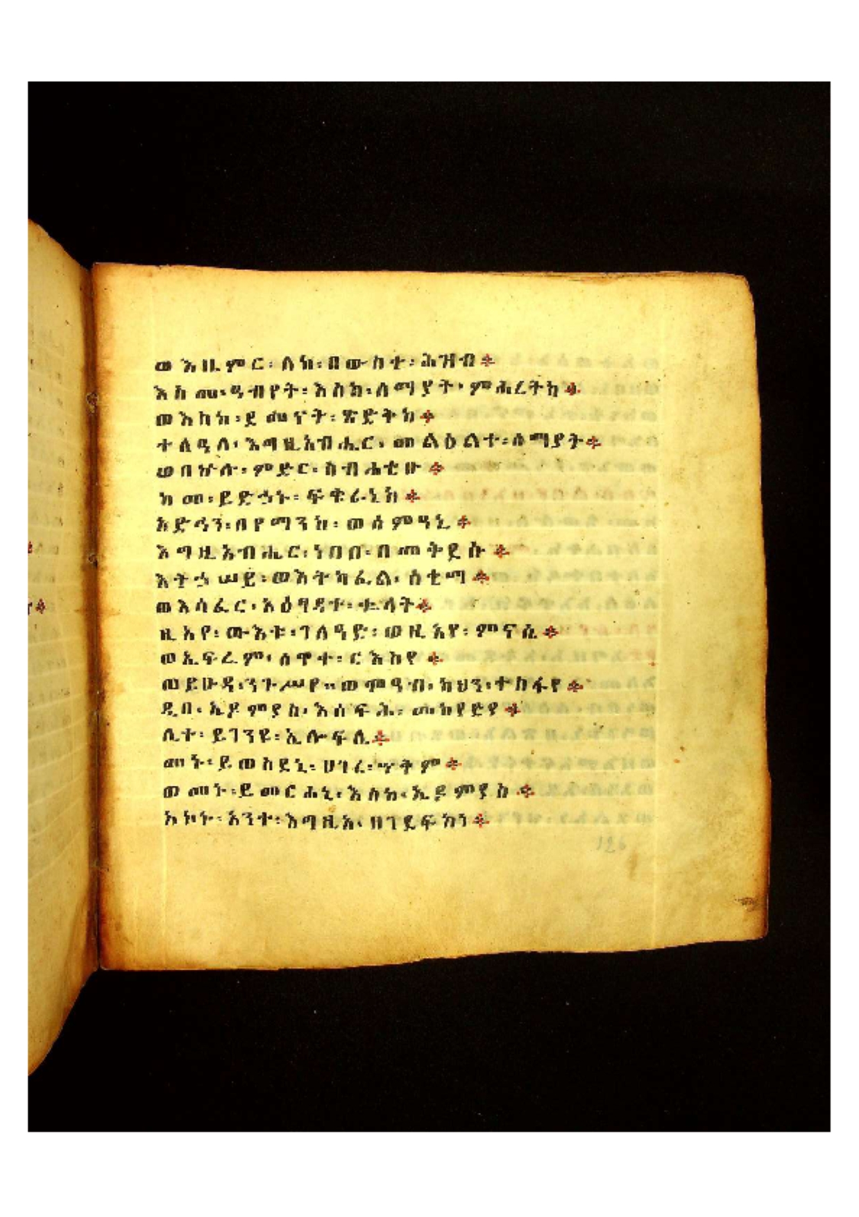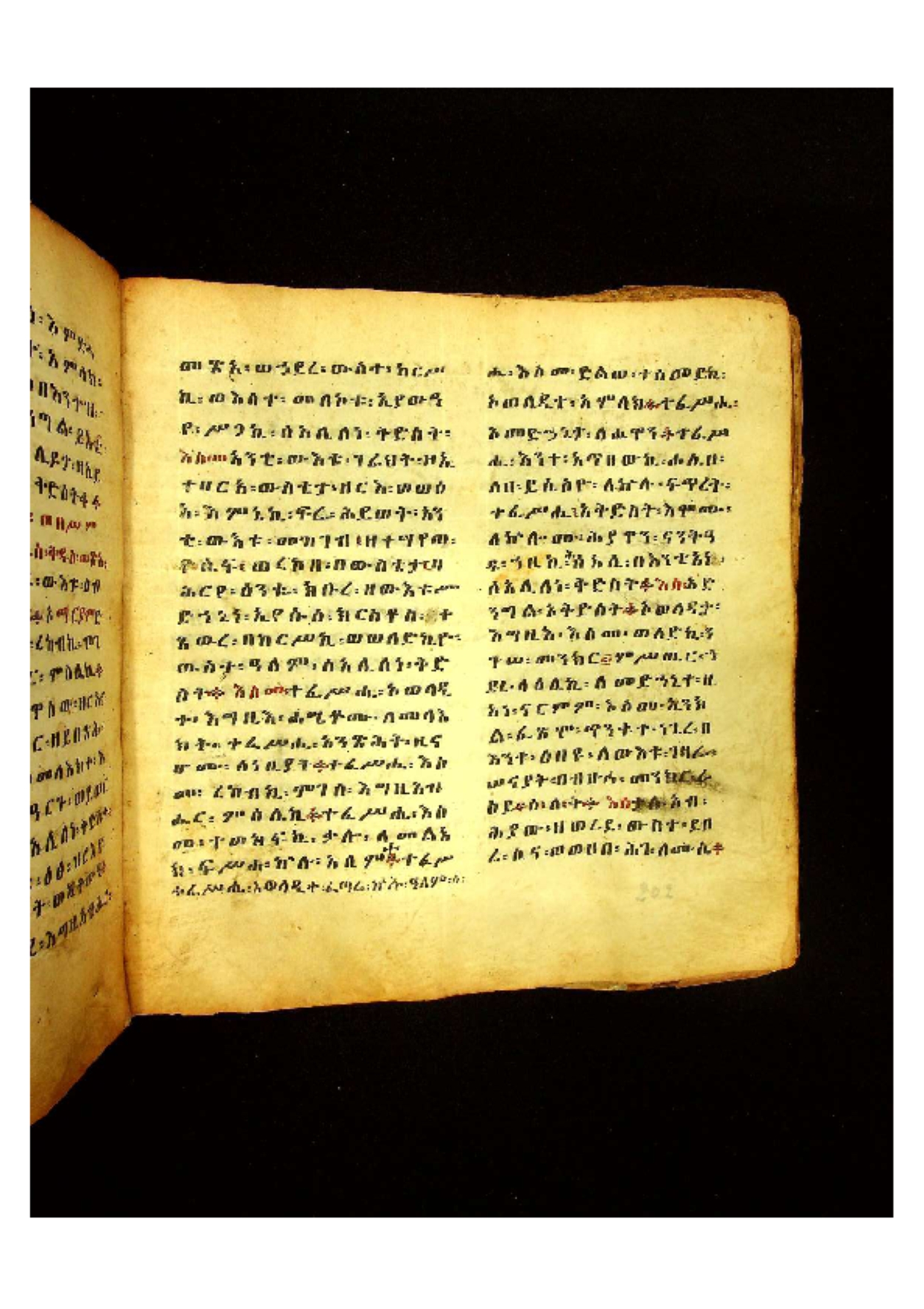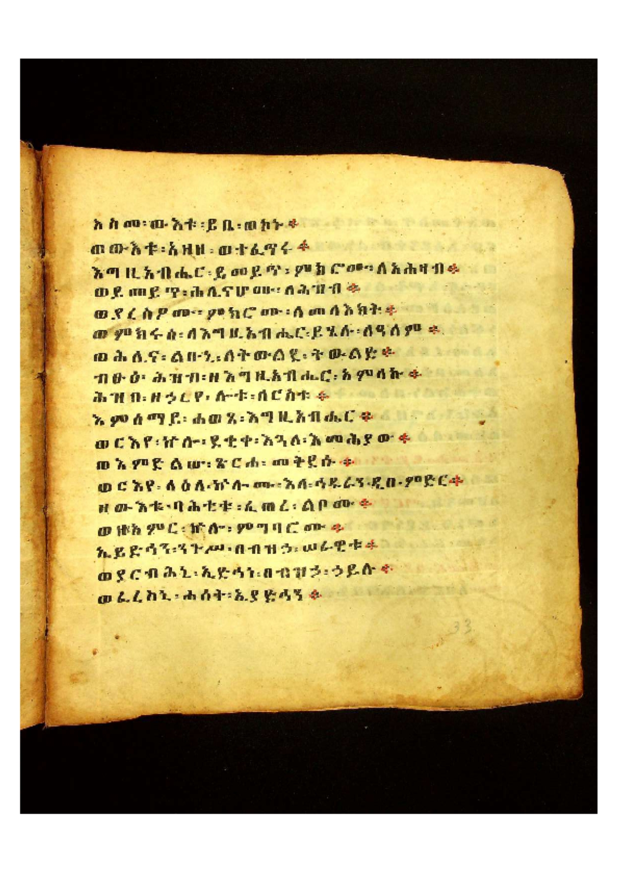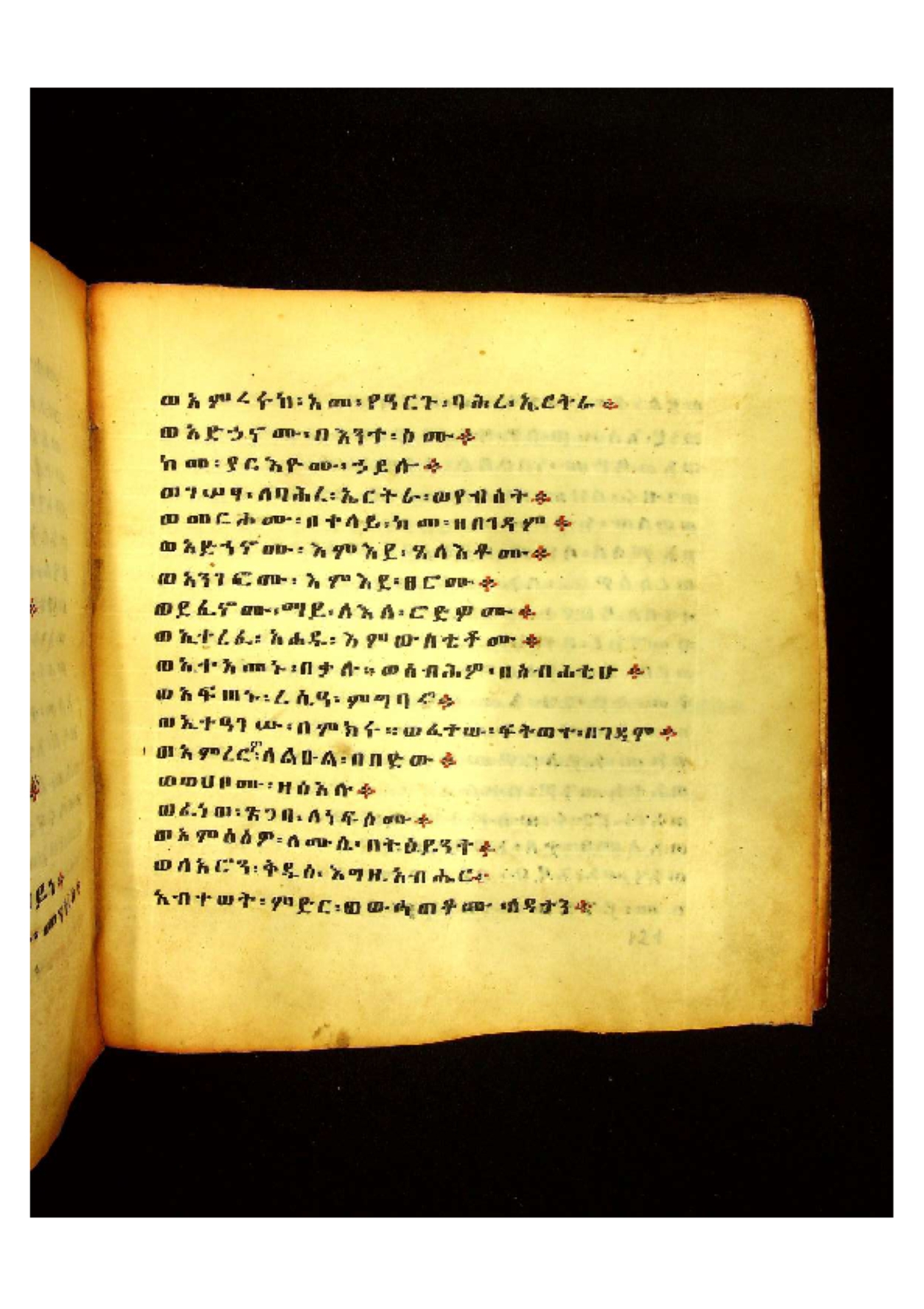 1. F. 2r: donation note written vertically in the outer margin, in black ink: “alla famiglia Bruschettini, Pussy […] Battaglia dell’Amba Aradam il 16 febbraio 1936 XIV”. The note, written in Italian and partly illegible, indicates the Bruschettini family as the receiver of the book and mentions the Battle of Amba Aradam, which took place on 16 February 1936. 2. F. 5r: note written in Italian in the outer upper margin, in red pencil: “Amba Aradam 16/2/XIV ore 17.30 P. Paloboni (?)”. This note also mentions the Battle of Amba Aradam, together with an individual whose name is partially unclear (P. Paloboni?). 3. F. 173v: supplication note written in small script in a mediocre hand, at the end of the “Psalms of David”: ዕቀበኒ፡ እምዓይነ፡ ደዌ፡ ወሞት፡ ለገብርከ፡ ደቅስዮስ፡, “protect me, your servant Däqsəyos, from the eye of infirmity and death”. The note mentions a certain Däqsəyos, indicated as “your servant” (possibly a later owner of the codex). 4. F. 173v: incipit of the Gəʿəz and Amharic prayer, perhaps a writing exercise. The note is written in an inaccurate calligraphy on the outer margin of the folio, next to the prayer. The entire text is የህፂ፡ ኖኅን፡ ከማየ[፡] አይኅ። እስራኤልን፡ ከፈርዖን፡ ዳዊትን፡ ከሳኦል፡ ከኢሎፍሊ። ኤ. 5. F. 190v: donation note, written in black ink in a mediocre hand. Text: ዝመጽሐፍ፡ ዘደብተራ፡ ኪሮስ፡ ዘወሀቦ፡ ለታቦተ፡ ሚካኤል፡ ኢትርስዑኒ፡ በአቡነ፡ ዘበሰማያት፡ ዘአቡየ፡ ገብረ፡ ማርያም፡ ወለእምየ፡ ወለተ፡ ሩፋኤል፡, “This book belongs to däbtära Kiros, who donated it to the tabot of [the church of St] Michael. Do not forget me for our Father who is in heaven. [It also belongs] to my father Gäbrä Maryam and my mother Wälättä Rufaʾel”. 6. F. 199v: writings executed in an inaccurate hand, perhaps the same of note 4. The note includes pen trials (ፈቲነ፡ ብርዕ፡ ዘፈረና፡ etc.), reproduces the explicit of the “Song of the songs” (ስብሐታተኪ፡ ማርያም፡ ከመ፡ እንተ፡ ሕልቀት፡ etc.) and the incipit of the “Praise of Mary” (ውዳሴ፡ ዘሰኑይ፡ ፈቀደ፡ እግዚእ፡ etc., partly rubricated). The writings also mention Däqsəyos, indicated as “your servant” (possibly a later owner of the codex) 7. F. 220ra–va: Genealogic note written on two columns. The note illustrates the family tree of King Yoḥannǝs I, who reigned from 1667 to 1682. The text is acephalous. Incipit: [ወለ]ደ፡ እምሐና፡ ብእሲቱ፡ አሦተ፡ ቅዱሳንሃ፡ ወአሦተ፡ ቅዱሳንኒ፡ እምነ፡ ጳውሊ፡ ብእሲሃ፡ ወለደቶሙ፡ ለአቤተኁን፡ ማእምሮ፡ ወለዘሥላሴ፡ ወአቤተኁን፡ ማእምሮኒ፡ ወለደ፡ አቃርዮስ፡ ወአቃርዮስኒ፡ ወለደ፡ እመቤት፡ እኅተ፡ ክርስቶስሃ፡. The text is published and translated in Proverbio D.V., 2000, ‘Inventario sommario dei manoscritti arabi, ebraici, etiopici – con notizia dei turchi – conservati presso la Biblioteca della Badia di Grottaferrata’. Atti della Accademia nazionale dei Lincei, Memorie, Classe di scienze morali, storiche e filologiche, serie IX, 12 (2000), 468–570 (here pp. 496–97, Appendice III). 8. F. 220va–b: Protective prayer against snakes, written on two columns. Incipit: በስመ፡ አብ፡ … ጸሎት፡ በእንተ፡ ዓርዌ፡ ምድር። ሶበ፡ በጽሐ፡ መልእክት፡ ሐሰውከ፡ በል፡ ፫ጊዜ፡ አኂዘከ፡ ዘፈረ፡ ልብሰ፡ ለእመ፡ ሀሎ፡ ርሑቀ፡ አስትዮ፡. The prayer is probably written in the same hand of note 7. 9. F. 220vb: Unidentified magic prayer containing asmat-names. Incipit: በስመ፡ አብ፡ … ኦላዘላህም፡ አህጉረ፡ ቀዳ[.]፡ ፍሖም፡ ሊስ፡ አፍሊስ፡ ምልክዮስ፡ ዘ[..]ማኤል፡ በዝንቱ፡ አስማቲከ፡ [.]ጽ[..] ኃይለ፡ በረድ፡ ወነፋስ፡ ከማሁ፡. |