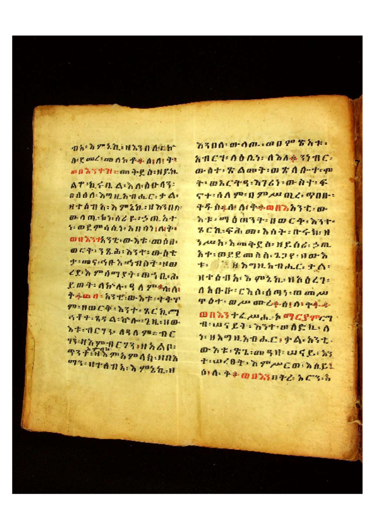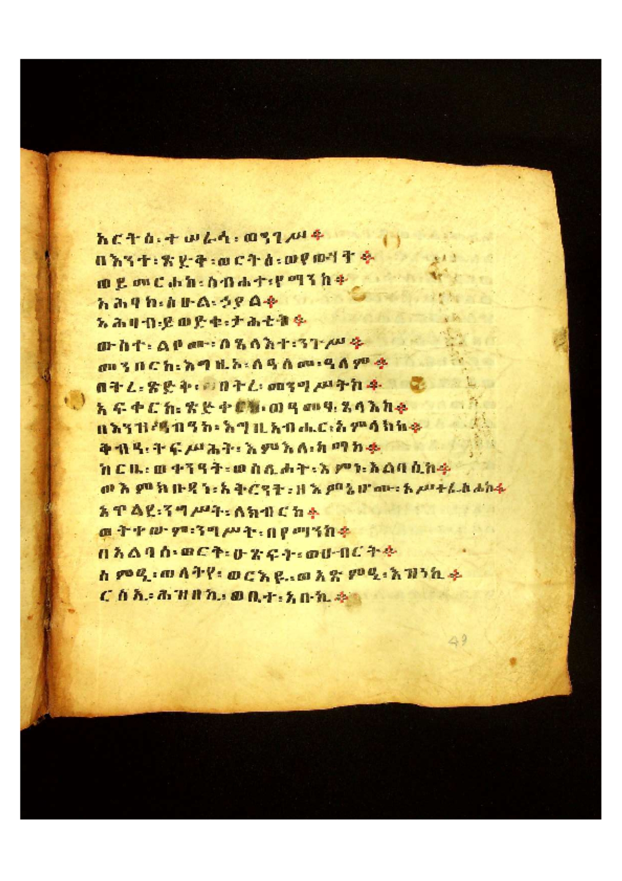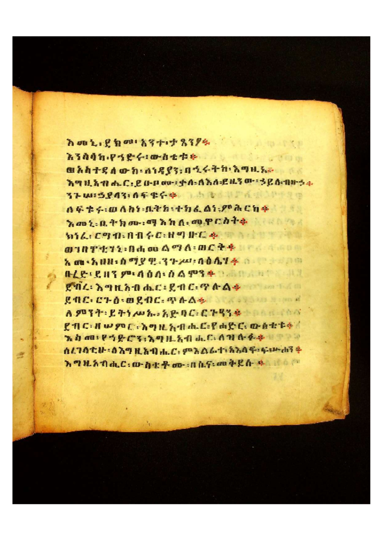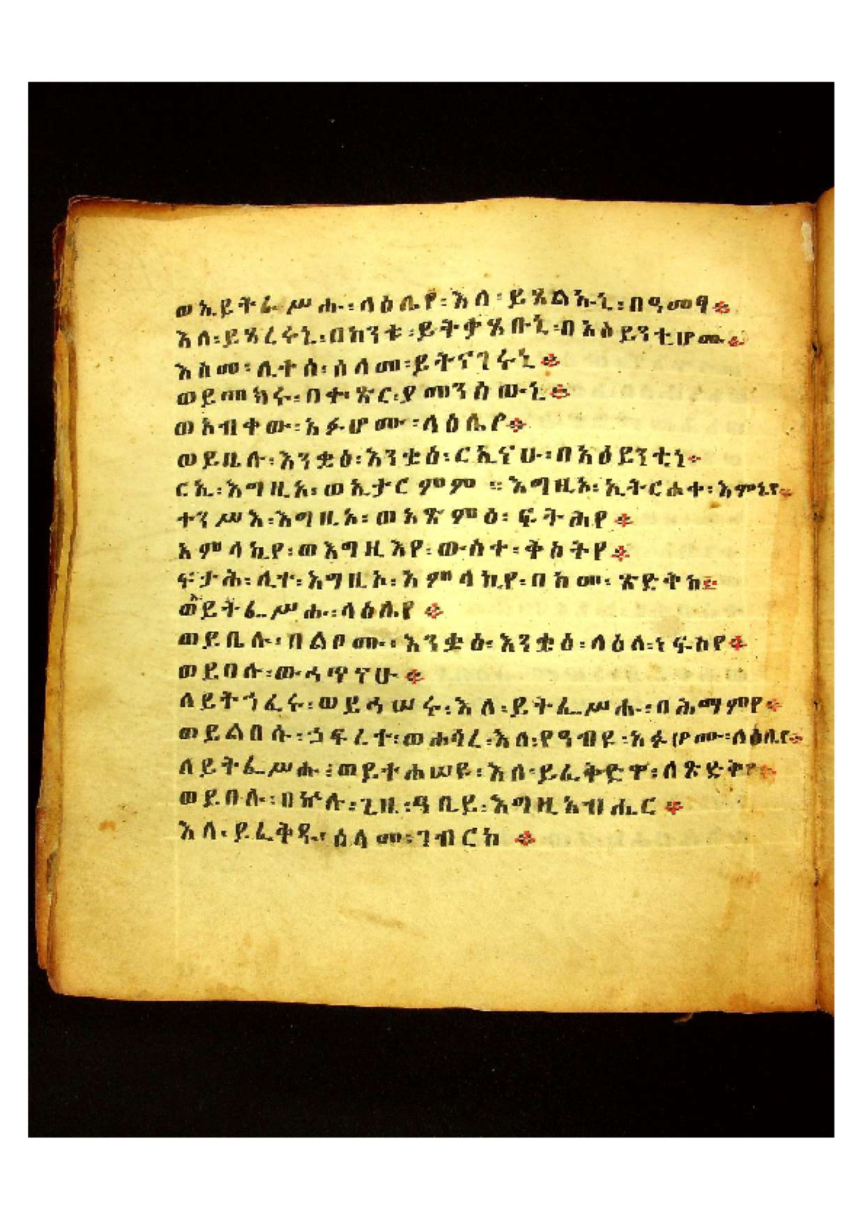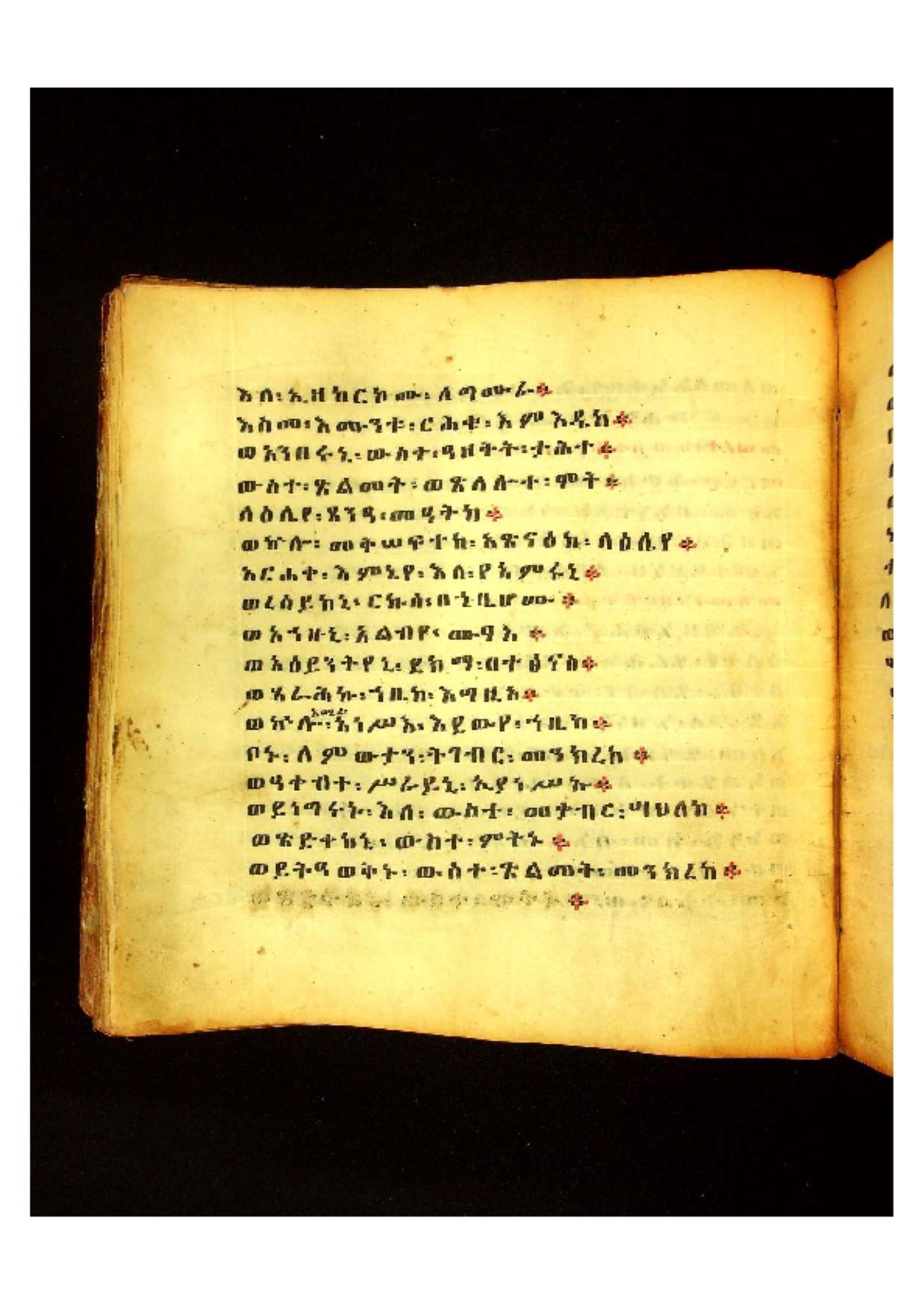 1. F. 2r: donation note written vertically in the outer margin, in black ink: “alla famiglia Bruschettini, Pussy […] Battaglia dell’Amba Aradam il 16 febbraio 1936 XIV”. The note, written in Italian and partly illegible, indicates the Bruschettini family as the receiver of the book and mentions the Battle of Amba Aradam, which took place on 16 February 1936. 2. F. 5r: note written in Italian in the outer upper margin, in red pencil: “Amba Aradam 16/2/XIV ore 17.30 P. Paloboni (?)”. This note also mentions the Battle of Amba Aradam, together with an individual whose name is partially unclear (P. Paloboni?). 3. F. 173v: supplication note written in small script in a mediocre hand, at the end of the “Psalms of David”: ዕቀበኒ፡ እምዓይነ፡ ደዌ፡ ወሞት፡ ለገብርከ፡ ደቅስዮስ፡, “protect me, your servant Däqsəyos, from the eye of infirmity and death”. The note mentions a certain Däqsəyos, indicated as “your servant” (possibly a later owner of the codex). 4. F. 173v: incipit of the Gəʿəz and Amharic prayer, perhaps a writing exercise. The note is written in an inaccurate calligraphy on the outer margin of the folio, next to the prayer. The entire text is የህፂ፡ ኖኅን፡ ከማየ[፡] አይኅ። እስራኤልን፡ ከፈርዖን፡ ዳዊትን፡ ከሳኦል፡ ከኢሎፍሊ። ኤ. 5. F. 190v: donation note, written in black ink in a mediocre hand. Text: ዝመጽሐፍ፡ ዘደብተራ፡ ኪሮስ፡ ዘወሀቦ፡ ለታቦተ፡ ሚካኤል፡ ኢትርስዑኒ፡ በአቡነ፡ ዘበሰማያት፡ ዘአቡየ፡ ገብረ፡ ማርያም፡ ወለእምየ፡ ወለተ፡ ሩፋኤል፡, “This book belongs to däbtära Kiros, who donated it to the tabot of [the church of St] Michael. Do not forget me for our Father who is in heaven. [It also belongs] to my father Gäbrä Maryam and my mother Wälättä Rufaʾel”. 6. F. 199v: writings executed in an inaccurate hand, perhaps the same of note 4. The note includes pen trials (ፈቲነ፡ ብርዕ፡ ዘፈረና፡ etc.), reproduces the explicit of the “Song of the songs” (ስብሐታተኪ፡ ማርያም፡ ከመ፡ እንተ፡ ሕልቀት፡ etc.) and the incipit of the “Praise of Mary” (ውዳሴ፡ ዘሰኑይ፡ ፈቀደ፡ እግዚእ፡ etc., partly rubricated). The writings also mention Däqsəyos, indicated as “your servant” (possibly a later owner of the codex) 7. F. 220ra–va: Genealogic note written on two columns. The note illustrates the family tree of King Yoḥannǝs I, who reigned from 1667 to 1682. The text is acephalous. Incipit: [ወለ]ደ፡ እምሐና፡ ብእሲቱ፡ አሦተ፡ ቅዱሳንሃ፡ ወአሦተ፡ ቅዱሳንኒ፡ እምነ፡ ጳውሊ፡ ብእሲሃ፡ ወለደቶሙ፡ ለአቤተኁን፡ ማእምሮ፡ ወለዘሥላሴ፡ ወአቤተኁን፡ ማእምሮኒ፡ ወለደ፡ አቃርዮስ፡ ወአቃርዮስኒ፡ ወለደ፡ እመቤት፡ እኅተ፡ ክርስቶስሃ፡. The text is published and translated in Proverbio D.V., 2000, ‘Inventario sommario dei manoscritti arabi, ebraici, etiopici – con notizia dei turchi – conservati presso la Biblioteca della Badia di Grottaferrata’. Atti della Accademia nazionale dei Lincei, Memorie, Classe di scienze morali, storiche e filologiche, serie IX, 12 (2000), 468–570 (here pp. 496–97, Appendice III). 8. F. 220va–b: Protective prayer against snakes, written on two columns. Incipit: በስመ፡ አብ፡ … ጸሎት፡ በእንተ፡ ዓርዌ፡ ምድር። ሶበ፡ በጽሐ፡ መልእክት፡ ሐሰውከ፡ በል፡ ፫ጊዜ፡ አኂዘከ፡ ዘፈረ፡ ልብሰ፡ ለእመ፡ ሀሎ፡ ርሑቀ፡ አስትዮ፡. The prayer is probably written in the same hand of note 7. 9. F. 220vb: Unidentified magic prayer containing asmat-names. Incipit: በስመ፡ አብ፡ … ኦላዘላህም፡ አህጉረ፡ ቀዳ[.]፡ ፍሖም፡ ሊስ፡ አፍሊስ፡ ምልክዮስ፡ ዘ[..]ማኤል፡ በዝንቱ፡ አስማቲከ፡ [.]ጽ[..] ኃይለ፡ በረድ፡ ወነፋስ፡ ከማሁ፡. |