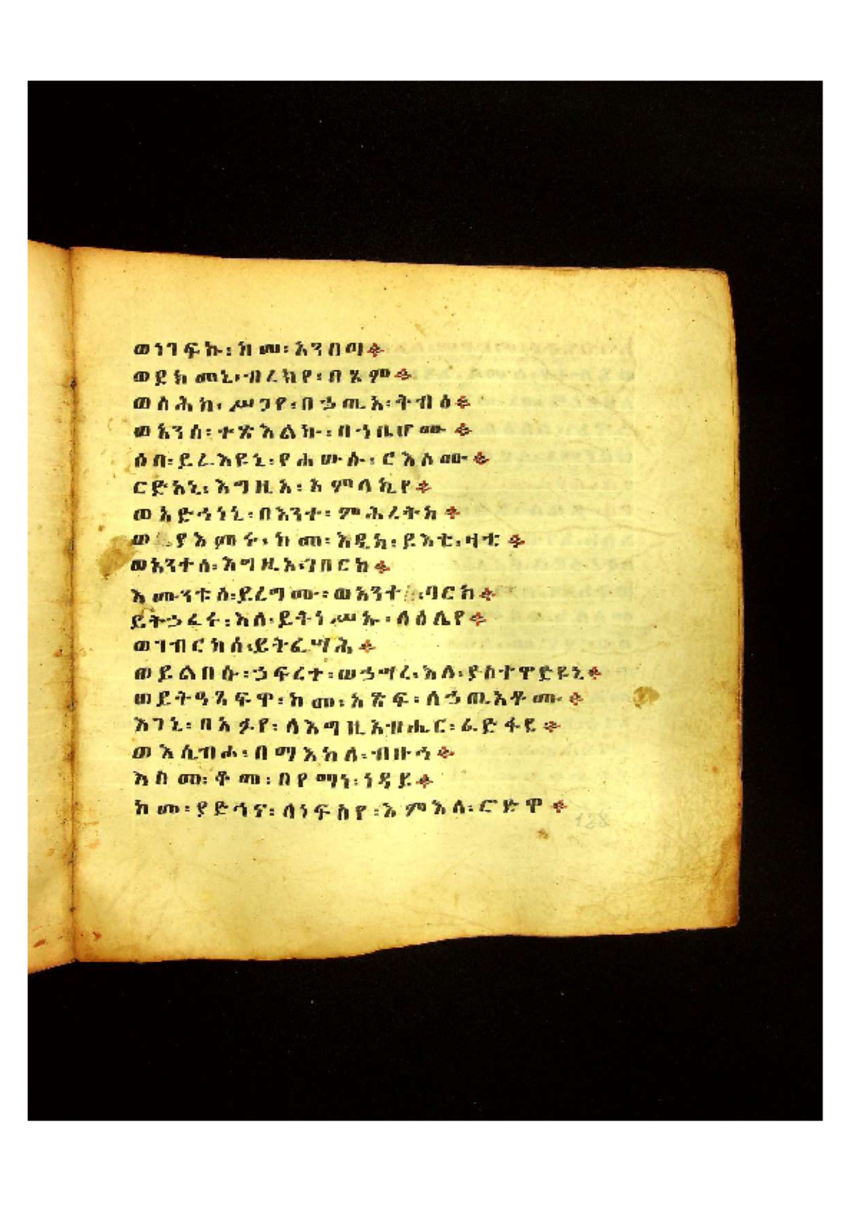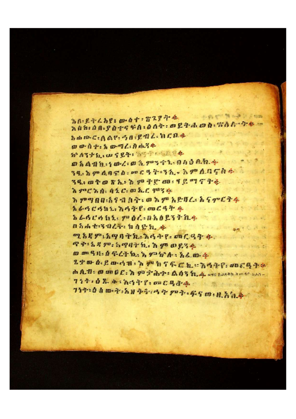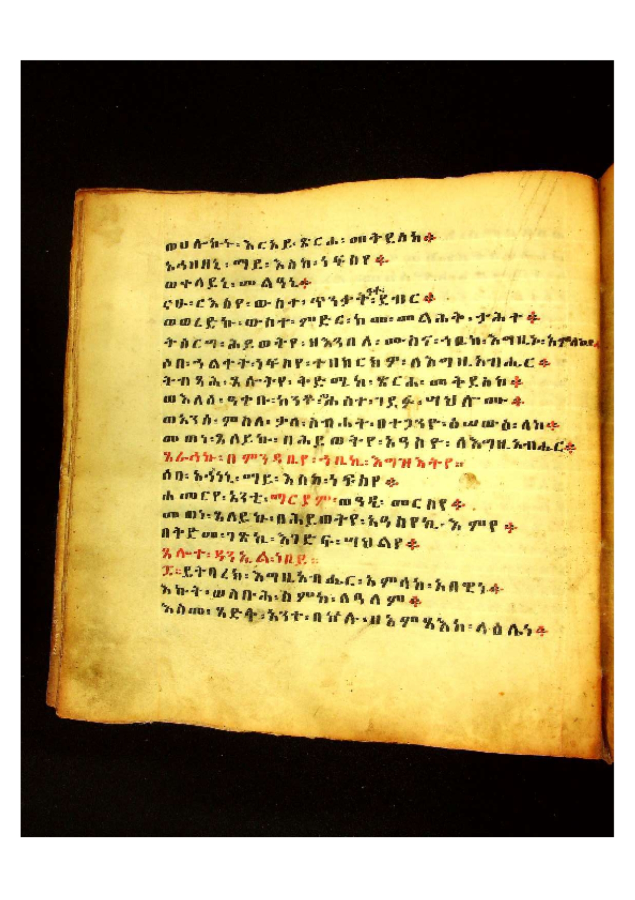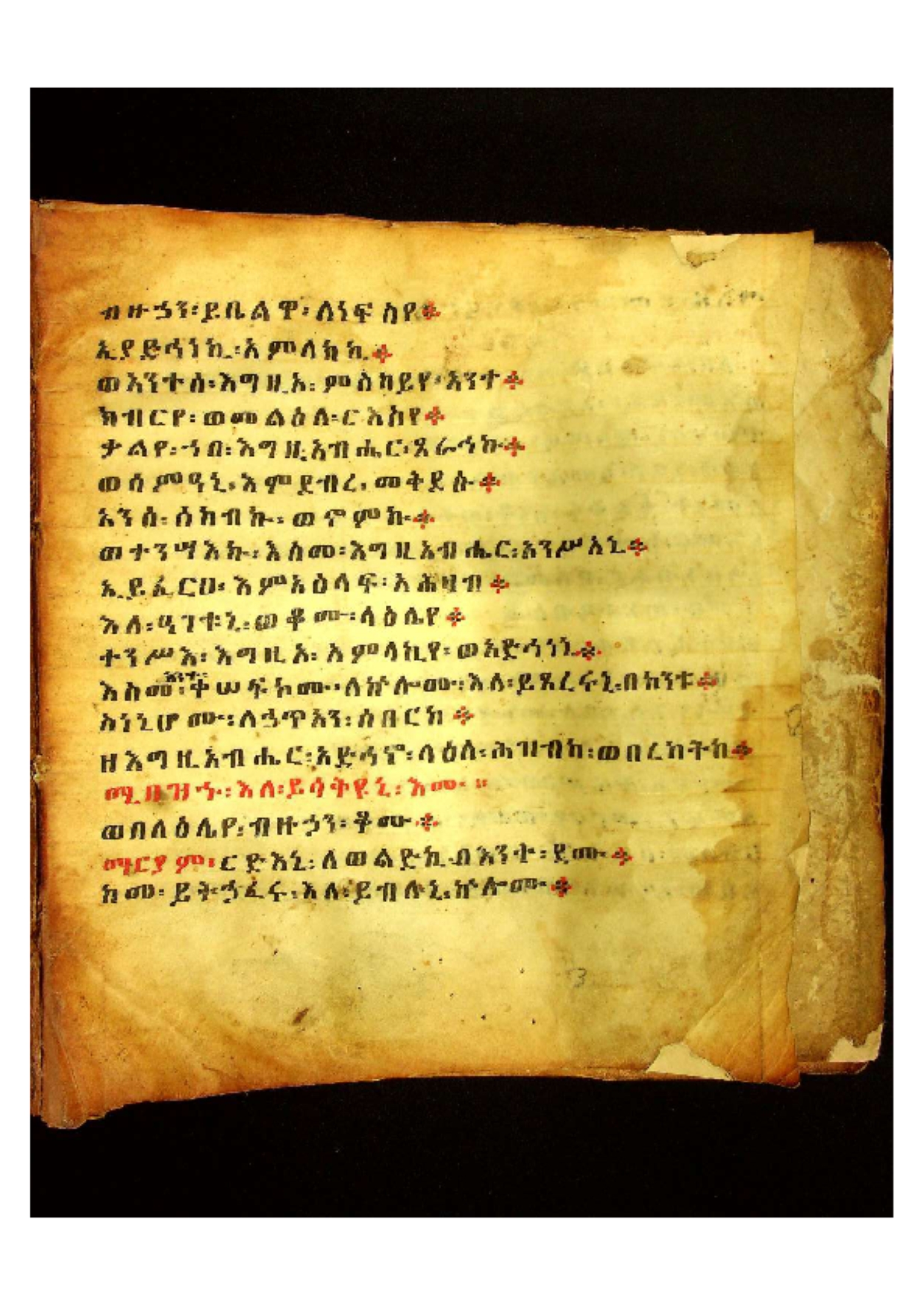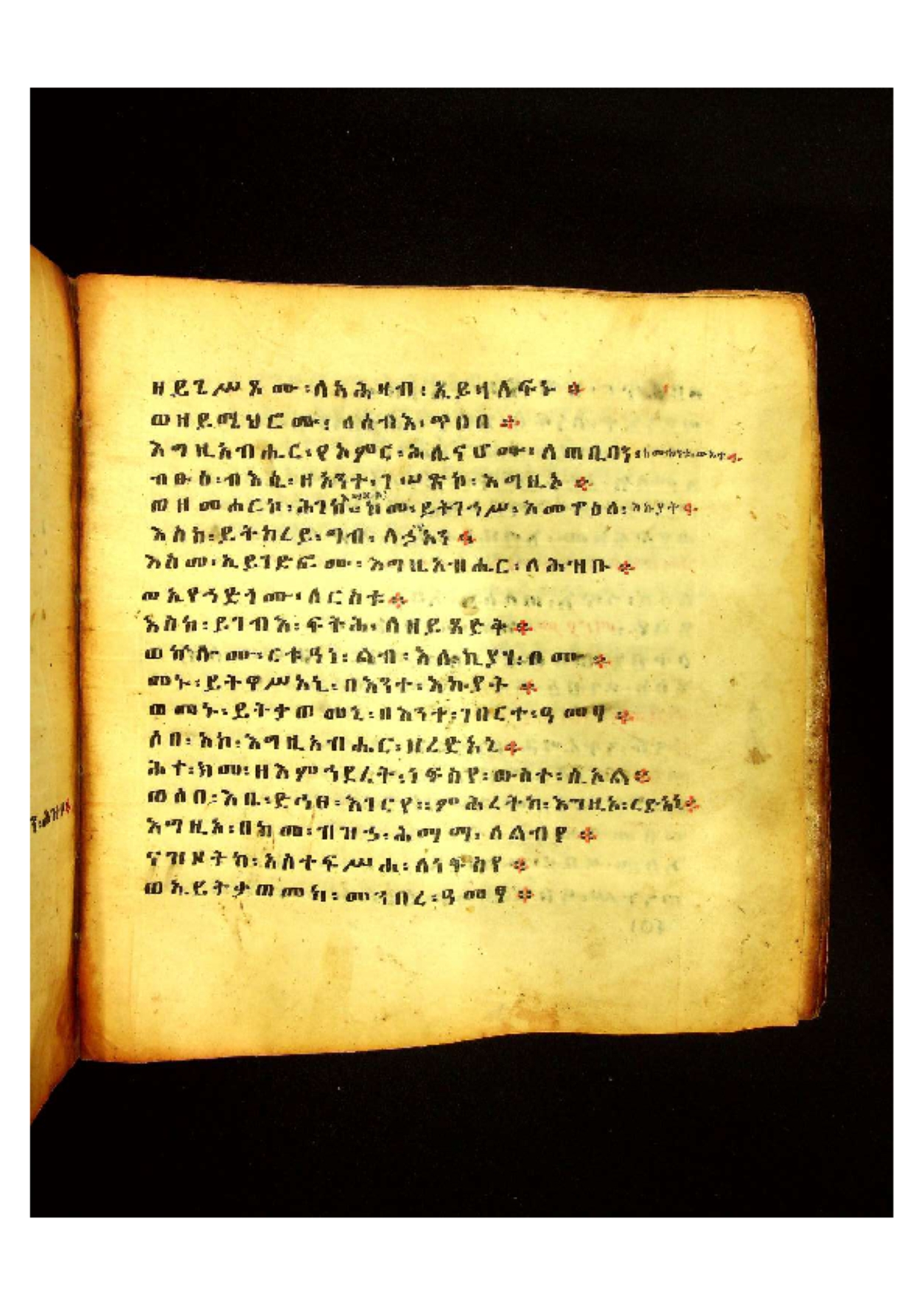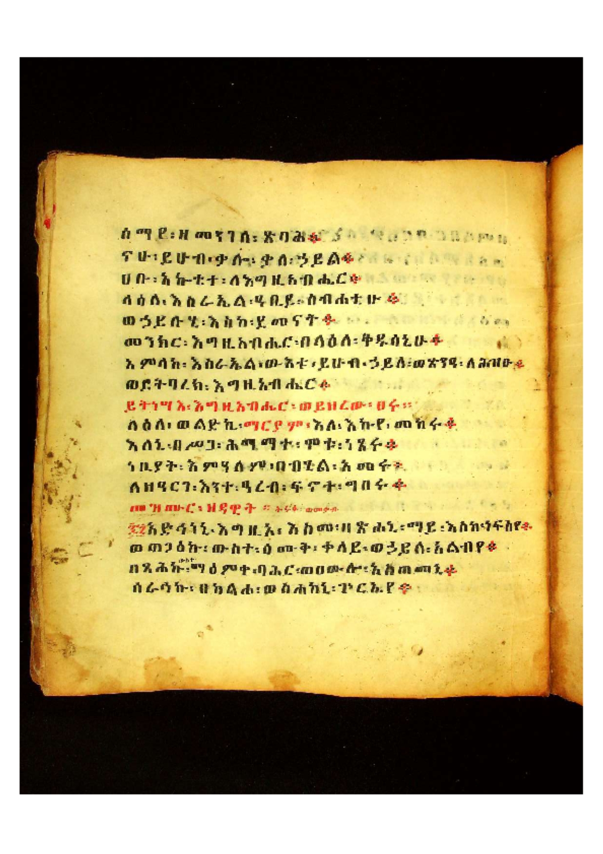 1. F. 2r: donation note written vertically in the outer margin, in black ink: “alla famiglia Bruschettini, Pussy […] Battaglia dell’Amba Aradam il 16 febbraio 1936 XIV”. The note, written in Italian and partly illegible, indicates the Bruschettini family as the receiver of the book and mentions the Battle of Amba Aradam, which took place on 16 February 1936. 2. F. 5r: note written in Italian in the outer upper margin, in red pencil: “Amba Aradam 16/2/XIV ore 17.30 P. Paloboni (?)”. This note also mentions the Battle of Amba Aradam, together with an individual whose name is partially unclear (P. Paloboni?). 3. F. 173v: supplication note written in small script in a mediocre hand, at the end of the “Psalms of David”: ዕቀበኒ፡ እምዓይነ፡ ደዌ፡ ወሞት፡ ለገብርከ፡ ደቅስዮስ፡, “protect me, your servant Däqsəyos, from the eye of infirmity and death”. The note mentions a certain Däqsəyos, indicated as “your servant” (possibly a later owner of the codex). 4. F. 173v: incipit of the Gəʿəz and Amharic prayer, perhaps a writing exercise. The note is written in an inaccurate calligraphy on the outer margin of the folio, next to the prayer. The entire text is የህፂ፡ ኖኅን፡ ከማየ[፡] አይኅ። እስራኤልን፡ ከፈርዖን፡ ዳዊትን፡ ከሳኦል፡ ከኢሎፍሊ። ኤ. 5. F. 190v: donation note, written in black ink in a mediocre hand. Text: ዝመጽሐፍ፡ ዘደብተራ፡ ኪሮስ፡ ዘወሀቦ፡ ለታቦተ፡ ሚካኤል፡ ኢትርስዑኒ፡ በአቡነ፡ ዘበሰማያት፡ ዘአቡየ፡ ገብረ፡ ማርያም፡ ወለእምየ፡ ወለተ፡ ሩፋኤል፡, “This book belongs to däbtära Kiros, who donated it to the tabot of [the church of St] Michael. Do not forget me for our Father who is in heaven. [It also belongs] to my father Gäbrä Maryam and my mother Wälättä Rufaʾel”. 6. F. 199v: writings executed in an inaccurate hand, perhaps the same of note 4. The note includes pen trials (ፈቲነ፡ ብርዕ፡ ዘፈረና፡ etc.), reproduces the explicit of the “Song of the songs” (ስብሐታተኪ፡ ማርያም፡ ከመ፡ እንተ፡ ሕልቀት፡ etc.) and the incipit of the “Praise of Mary” (ውዳሴ፡ ዘሰኑይ፡ ፈቀደ፡ እግዚእ፡ etc., partly rubricated). The writings also mention Däqsəyos, indicated as “your servant” (possibly a later owner of the codex) 7. F. 220ra–va: Genealogic note written on two columns. The note illustrates the family tree of King Yoḥannǝs I, who reigned from 1667 to 1682. The text is acephalous. Incipit: [ወለ]ደ፡ እምሐና፡ ብእሲቱ፡ አሦተ፡ ቅዱሳንሃ፡ ወአሦተ፡ ቅዱሳንኒ፡ እምነ፡ ጳውሊ፡ ብእሲሃ፡ ወለደቶሙ፡ ለአቤተኁን፡ ማእምሮ፡ ወለዘሥላሴ፡ ወአቤተኁን፡ ማእምሮኒ፡ ወለደ፡ አቃርዮስ፡ ወአቃርዮስኒ፡ ወለደ፡ እመቤት፡ እኅተ፡ ክርስቶስሃ፡. The text is published and translated in Proverbio D.V., 2000, ‘Inventario sommario dei manoscritti arabi, ebraici, etiopici – con notizia dei turchi – conservati presso la Biblioteca della Badia di Grottaferrata’. Atti della Accademia nazionale dei Lincei, Memorie, Classe di scienze morali, storiche e filologiche, serie IX, 12 (2000), 468–570 (here pp. 496–97, Appendice III). 8. F. 220va–b: Protective prayer against snakes, written on two columns. Incipit: በስመ፡ አብ፡ … ጸሎት፡ በእንተ፡ ዓርዌ፡ ምድር። ሶበ፡ በጽሐ፡ መልእክት፡ ሐሰውከ፡ በል፡ ፫ጊዜ፡ አኂዘከ፡ ዘፈረ፡ ልብሰ፡ ለእመ፡ ሀሎ፡ ርሑቀ፡ አስትዮ፡. The prayer is probably written in the same hand of note 7. 9. F. 220vb: Unidentified magic prayer containing asmat-names. Incipit: በስመ፡ አብ፡ … ኦላዘላህም፡ አህጉረ፡ ቀዳ[.]፡ ፍሖም፡ ሊስ፡ አፍሊስ፡ ምልክዮስ፡ ዘ[..]ማኤል፡ በዝንቱ፡ አስማቲከ፡ [.]ጽ[..] ኃይለ፡ በረድ፡ ወነፋስ፡ ከማሁ፡. |