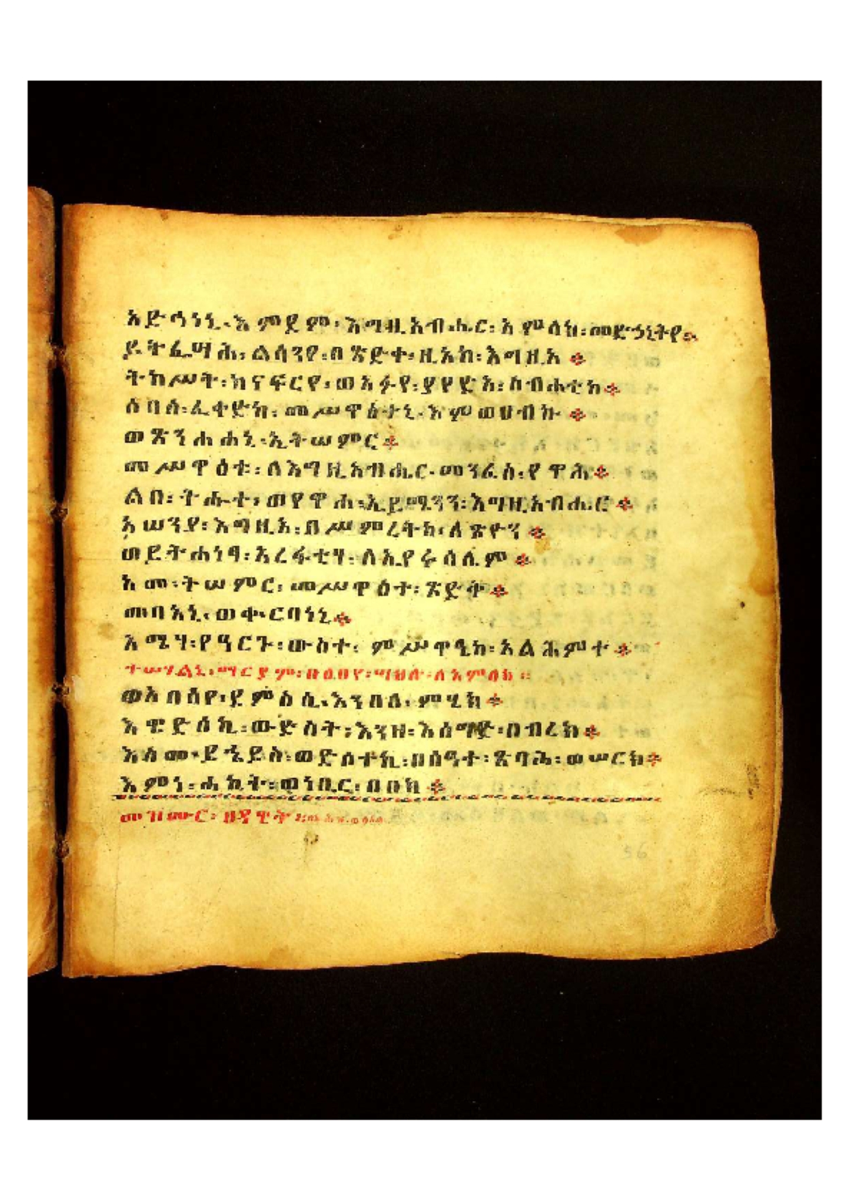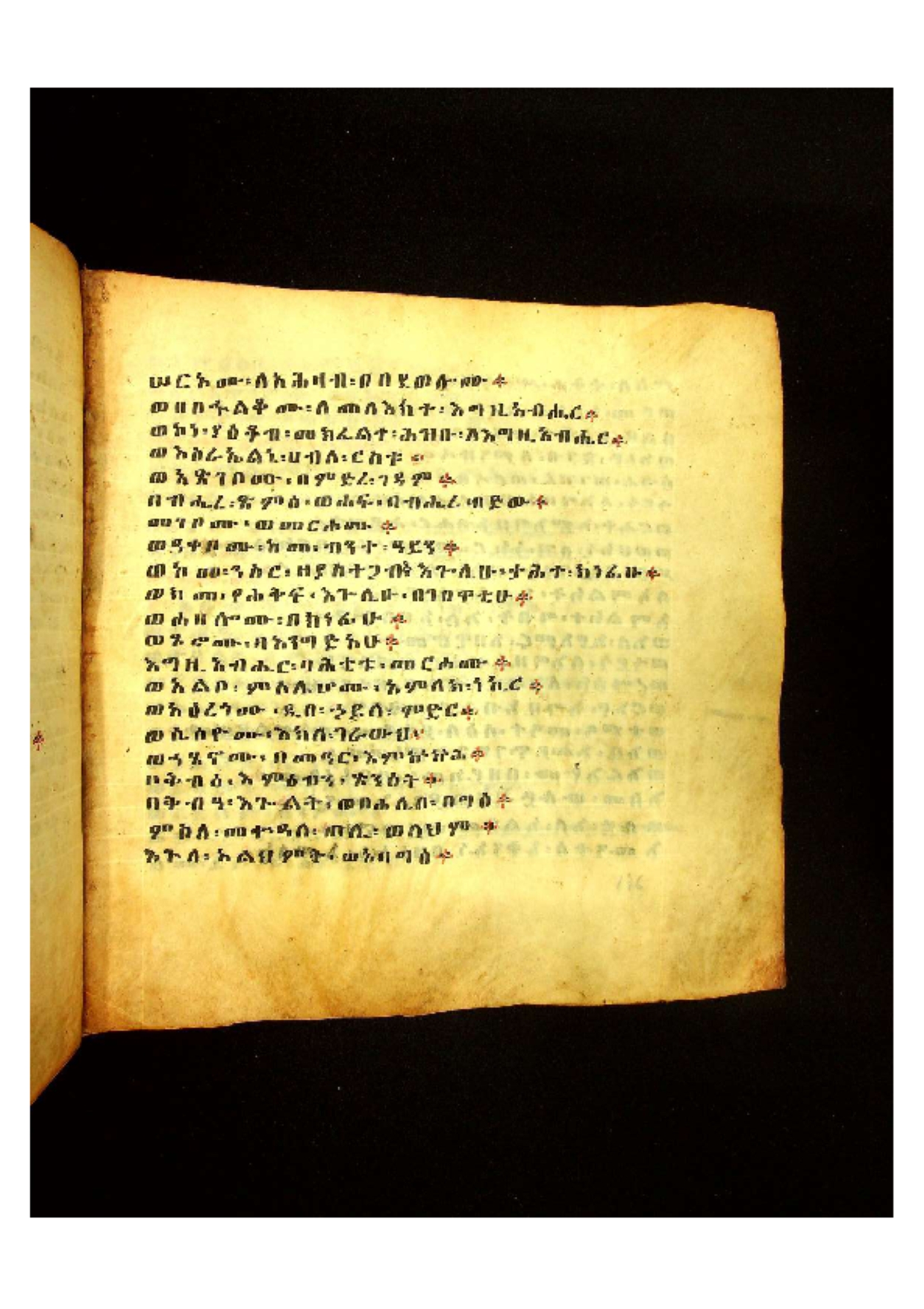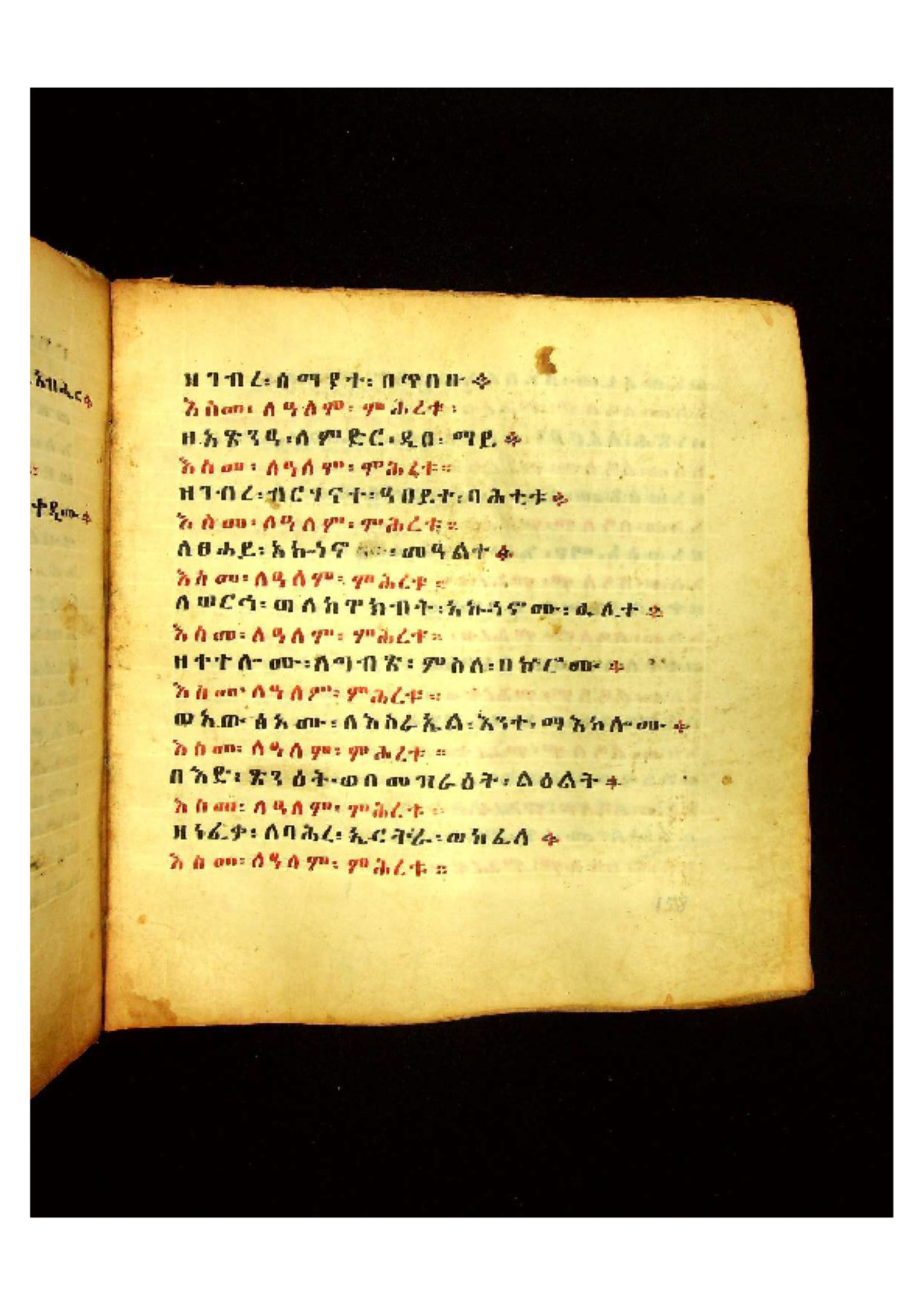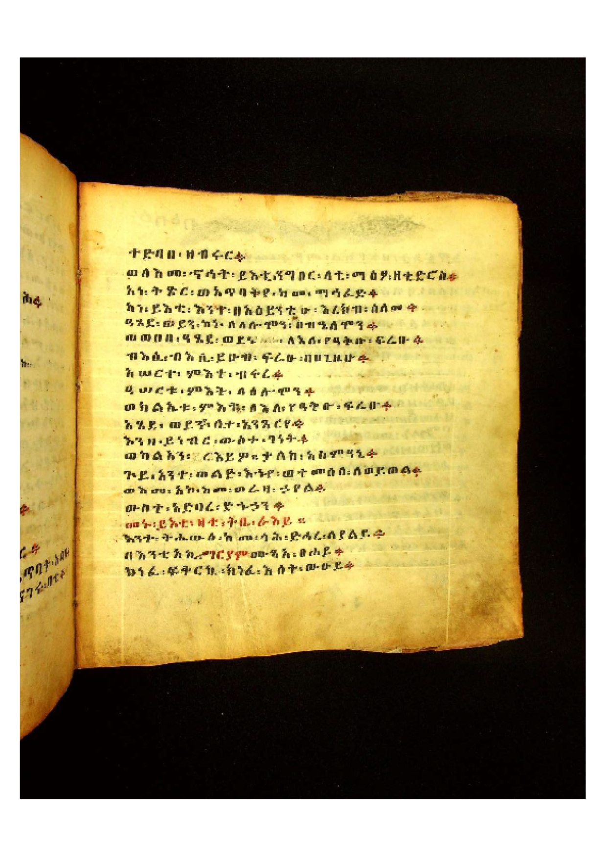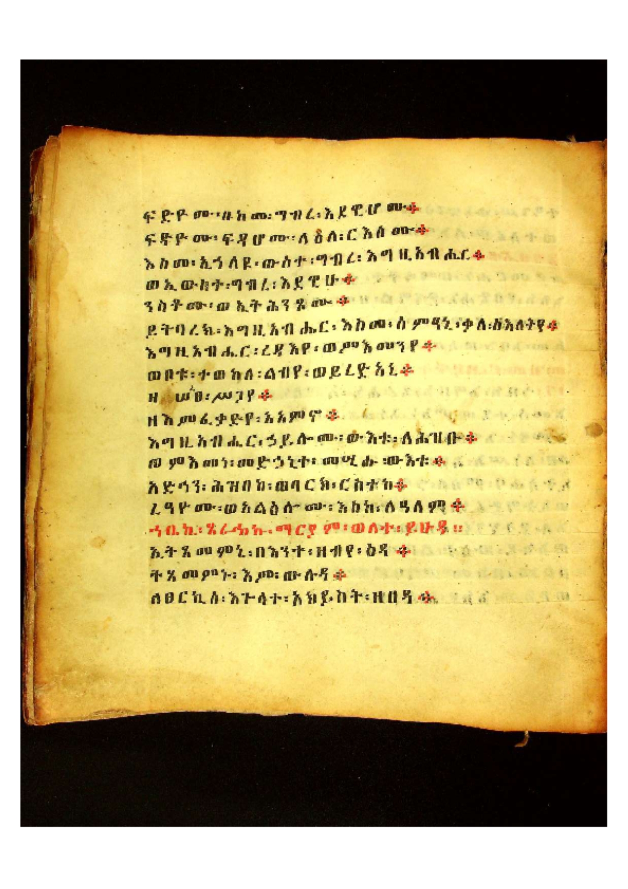 1. F. 2r: donation note written vertically in the outer margin, in black ink: “alla famiglia Bruschettini, Pussy […] Battaglia dell’Amba Aradam il 16 febbraio 1936 XIV”. The note, written in Italian and partly illegible, indicates the Bruschettini family as the receiver of the book and mentions the Battle of Amba Aradam, which took place on 16 February 1936. 2. F. 5r: note written in Italian in the outer upper margin, in red pencil: “Amba Aradam 16/2/XIV ore 17.30 P. Paloboni (?)”. This note also mentions the Battle of Amba Aradam, together with an individual whose name is partially unclear (P. Paloboni?). 3. F. 173v: supplication note written in small script in a mediocre hand, at the end of the “Psalms of David”: ዕቀበኒ፡ እምዓይነ፡ ደዌ፡ ወሞት፡ ለገብርከ፡ ደቅስዮስ፡, “protect me, your servant Däqsəyos, from the eye of infirmity and death”. The note mentions a certain Däqsəyos, indicated as “your servant” (possibly a later owner of the codex). 4. F. 173v: incipit of the Gəʿəz and Amharic prayer, perhaps a writing exercise. The note is written in an inaccurate calligraphy on the outer margin of the folio, next to the prayer. The entire text is የህፂ፡ ኖኅን፡ ከማየ[፡] አይኅ። እስራኤልን፡ ከፈርዖን፡ ዳዊትን፡ ከሳኦል፡ ከኢሎፍሊ። ኤ. 5. F. 190v: donation note, written in black ink in a mediocre hand. Text: ዝመጽሐፍ፡ ዘደብተራ፡ ኪሮስ፡ ዘወሀቦ፡ ለታቦተ፡ ሚካኤል፡ ኢትርስዑኒ፡ በአቡነ፡ ዘበሰማያት፡ ዘአቡየ፡ ገብረ፡ ማርያም፡ ወለእምየ፡ ወለተ፡ ሩፋኤል፡, “This book belongs to däbtära Kiros, who donated it to the tabot of [the church of St] Michael. Do not forget me for our Father who is in heaven. [It also belongs] to my father Gäbrä Maryam and my mother Wälättä Rufaʾel”. 6. F. 199v: writings executed in an inaccurate hand, perhaps the same of note 4. The note includes pen trials (ፈቲነ፡ ብርዕ፡ ዘፈረና፡ etc.), reproduces the explicit of the “Song of the songs” (ስብሐታተኪ፡ ማርያም፡ ከመ፡ እንተ፡ ሕልቀት፡ etc.) and the incipit of the “Praise of Mary” (ውዳሴ፡ ዘሰኑይ፡ ፈቀደ፡ እግዚእ፡ etc., partly rubricated). The writings also mention Däqsəyos, indicated as “your servant” (possibly a later owner of the codex) 7. F. 220ra–va: Genealogic note written on two columns. The note illustrates the family tree of King Yoḥannǝs I, who reigned from 1667 to 1682. The text is acephalous. Incipit: [ወለ]ደ፡ እምሐና፡ ብእሲቱ፡ አሦተ፡ ቅዱሳንሃ፡ ወአሦተ፡ ቅዱሳንኒ፡ እምነ፡ ጳውሊ፡ ብእሲሃ፡ ወለደቶሙ፡ ለአቤተኁን፡ ማእምሮ፡ ወለዘሥላሴ፡ ወአቤተኁን፡ ማእምሮኒ፡ ወለደ፡ አቃርዮስ፡ ወአቃርዮስኒ፡ ወለደ፡ እመቤት፡ እኅተ፡ ክርስቶስሃ፡. The text is published and translated in Proverbio D.V., 2000, ‘Inventario sommario dei manoscritti arabi, ebraici, etiopici – con notizia dei turchi – conservati presso la Biblioteca della Badia di Grottaferrata’. Atti della Accademia nazionale dei Lincei, Memorie, Classe di scienze morali, storiche e filologiche, serie IX, 12 (2000), 468–570 (here pp. 496–97, Appendice III). 8. F. 220va–b: Protective prayer against snakes, written on two columns. Incipit: በስመ፡ አብ፡ … ጸሎት፡ በእንተ፡ ዓርዌ፡ ምድር። ሶበ፡ በጽሐ፡ መልእክት፡ ሐሰውከ፡ በል፡ ፫ጊዜ፡ አኂዘከ፡ ዘፈረ፡ ልብሰ፡ ለእመ፡ ሀሎ፡ ርሑቀ፡ አስትዮ፡. The prayer is probably written in the same hand of note 7. 9. F. 220vb: Unidentified magic prayer containing asmat-names. Incipit: በስመ፡ አብ፡ … ኦላዘላህም፡ አህጉረ፡ ቀዳ[.]፡ ፍሖም፡ ሊስ፡ አፍሊስ፡ ምልክዮስ፡ ዘ[..]ማኤል፡ በዝንቱ፡ አስማቲከ፡ [.]ጽ[..] ኃይለ፡ በረድ፡ ወነፋስ፡ ከማሁ፡. |