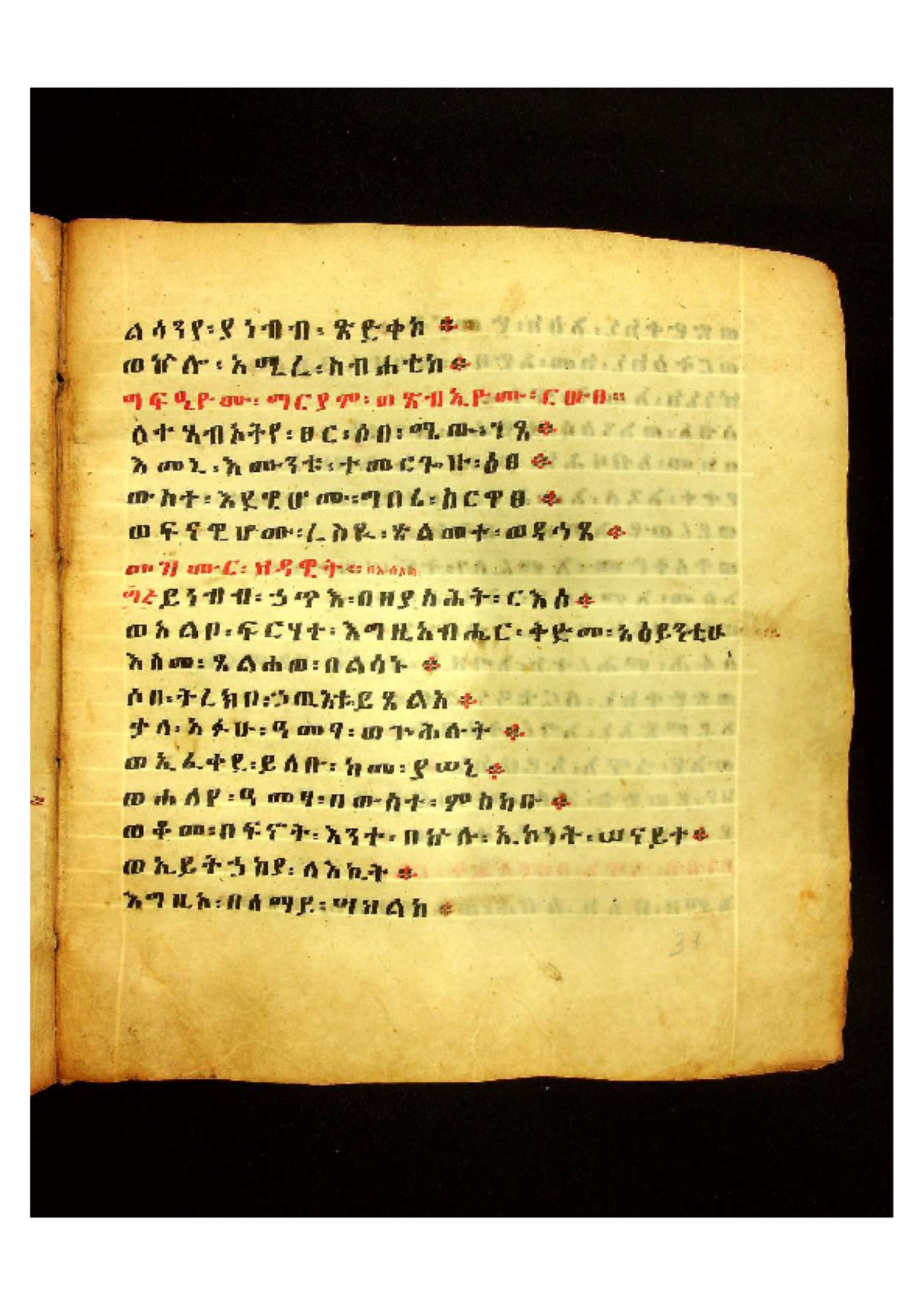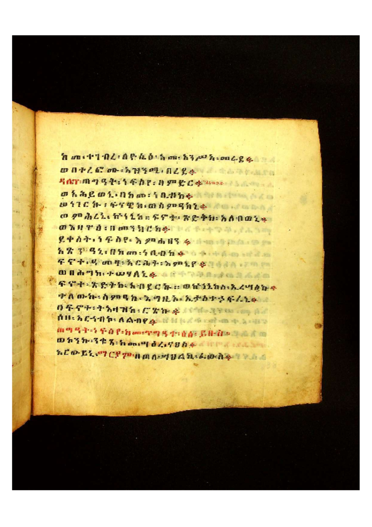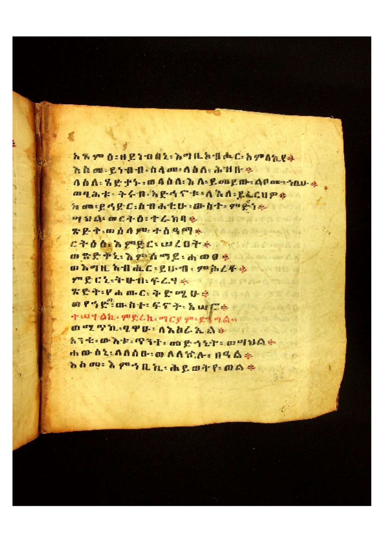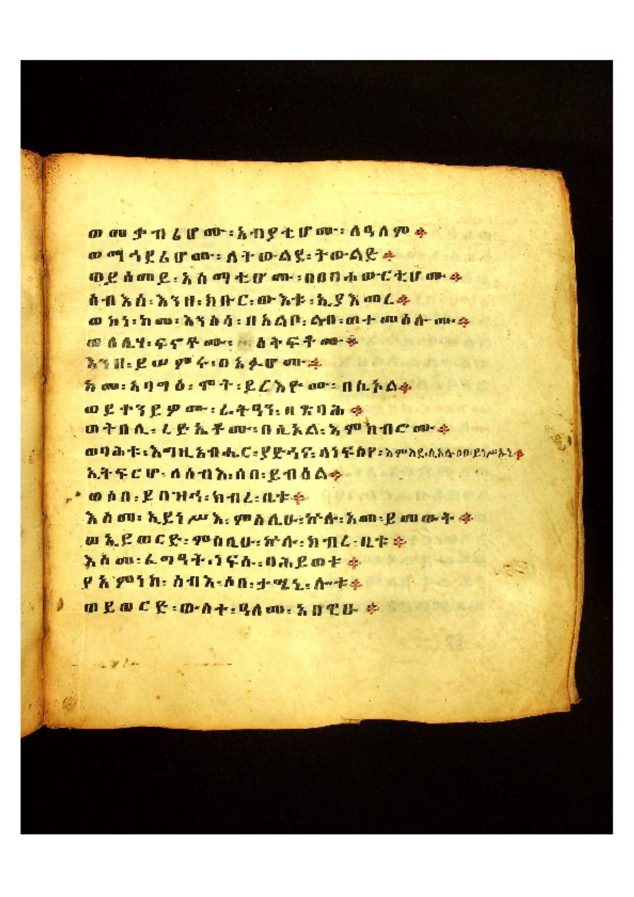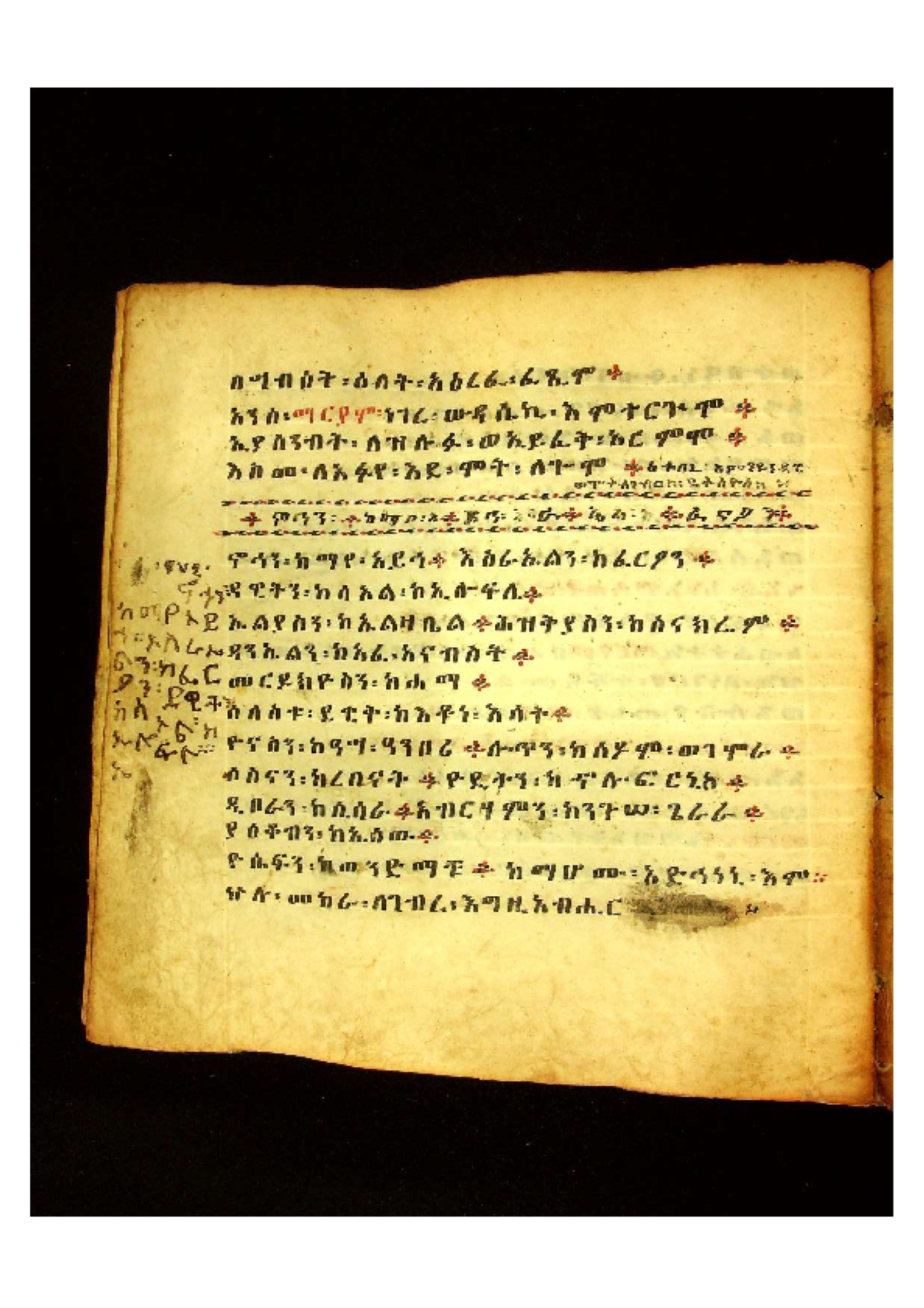 1. F. 2r: donation note written vertically in the outer margin, in black ink: “alla famiglia Bruschettini, Pussy […] Battaglia dell’Amba Aradam il 16 febbraio 1936 XIV”. The note, written in Italian and partly illegible, indicates the Bruschettini family as the receiver of the book and mentions the Battle of Amba Aradam, which took place on 16 February 1936. 2. F. 5r: note written in Italian in the outer upper margin, in red pencil: “Amba Aradam 16/2/XIV ore 17.30 P. Paloboni (?)”. This note also mentions the Battle of Amba Aradam, together with an individual whose name is partially unclear (P. Paloboni?). 3. F. 173v: supplication note written in small script in a mediocre hand, at the end of the “Psalms of David”: ዕቀበኒ፡ እምዓይነ፡ ደዌ፡ ወሞት፡ ለገብርከ፡ ደቅስዮስ፡, “protect me, your servant Däqsəyos, from the eye of infirmity and death”. The note mentions a certain Däqsəyos, indicated as “your servant” (possibly a later owner of the codex). 4. F. 173v: incipit of the Gəʿəz and Amharic prayer, perhaps a writing exercise. The note is written in an inaccurate calligraphy on the outer margin of the folio, next to the prayer. The entire text is የህፂ፡ ኖኅን፡ ከማየ[፡] አይኅ። እስራኤልን፡ ከፈርዖን፡ ዳዊትን፡ ከሳኦል፡ ከኢሎፍሊ። ኤ. 5. F. 190v: donation note, written in black ink in a mediocre hand. Text: ዝመጽሐፍ፡ ዘደብተራ፡ ኪሮስ፡ ዘወሀቦ፡ ለታቦተ፡ ሚካኤል፡ ኢትርስዑኒ፡ በአቡነ፡ ዘበሰማያት፡ ዘአቡየ፡ ገብረ፡ ማርያም፡ ወለእምየ፡ ወለተ፡ ሩፋኤል፡, “This book belongs to däbtära Kiros, who donated it to the tabot of [the church of St] Michael. Do not forget me for our Father who is in heaven. [It also belongs] to my father Gäbrä Maryam and my mother Wälättä Rufaʾel”. 6. F. 199v: writings executed in an inaccurate hand, perhaps the same of note 4. The note includes pen trials (ፈቲነ፡ ብርዕ፡ ዘፈረና፡ etc.), reproduces the explicit of the “Song of the songs” (ስብሐታተኪ፡ ማርያም፡ ከመ፡ እንተ፡ ሕልቀት፡ etc.) and the incipit of the “Praise of Mary” (ውዳሴ፡ ዘሰኑይ፡ ፈቀደ፡ እግዚእ፡ etc., partly rubricated). The writings also mention Däqsəyos, indicated as “your servant” (possibly a later owner of the codex) 7. F. 220ra–va: Genealogic note written on two columns. The note illustrates the family tree of King Yoḥannǝs I, who reigned from 1667 to 1682. The text is acephalous. Incipit: [ወለ]ደ፡ እምሐና፡ ብእሲቱ፡ አሦተ፡ ቅዱሳንሃ፡ ወአሦተ፡ ቅዱሳንኒ፡ እምነ፡ ጳውሊ፡ ብእሲሃ፡ ወለደቶሙ፡ ለአቤተኁን፡ ማእምሮ፡ ወለዘሥላሴ፡ ወአቤተኁን፡ ማእምሮኒ፡ ወለደ፡ አቃርዮስ፡ ወአቃርዮስኒ፡ ወለደ፡ እመቤት፡ እኅተ፡ ክርስቶስሃ፡. The text is published and translated in Proverbio D.V., 2000, ‘Inventario sommario dei manoscritti arabi, ebraici, etiopici – con notizia dei turchi – conservati presso la Biblioteca della Badia di Grottaferrata’. Atti della Accademia nazionale dei Lincei, Memorie, Classe di scienze morali, storiche e filologiche, serie IX, 12 (2000), 468–570 (here pp. 496–97, Appendice III). 8. F. 220va–b: Protective prayer against snakes, written on two columns. Incipit: በስመ፡ አብ፡ … ጸሎት፡ በእንተ፡ ዓርዌ፡ ምድር። ሶበ፡ በጽሐ፡ መልእክት፡ ሐሰውከ፡ በል፡ ፫ጊዜ፡ አኂዘከ፡ ዘፈረ፡ ልብሰ፡ ለእመ፡ ሀሎ፡ ርሑቀ፡ አስትዮ፡. The prayer is probably written in the same hand of note 7. 9. F. 220vb: Unidentified magic prayer containing asmat-names. Incipit: በስመ፡ አብ፡ … ኦላዘላህም፡ አህጉረ፡ ቀዳ[.]፡ ፍሖም፡ ሊስ፡ አፍሊስ፡ ምልክዮስ፡ ዘ[..]ማኤል፡ በዝንቱ፡ አስማቲከ፡ [.]ጽ[..] ኃይለ፡ በረድ፡ ወነፋስ፡ ከማሁ፡. |