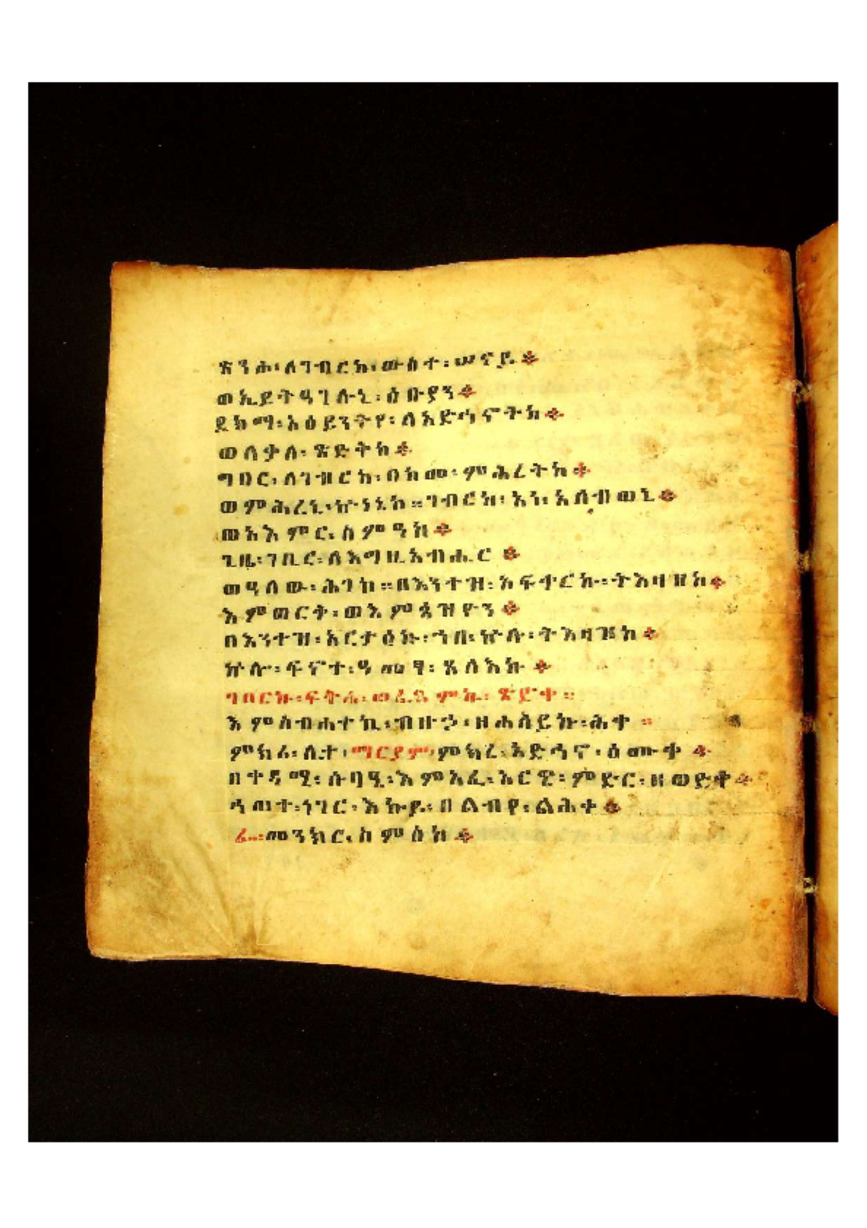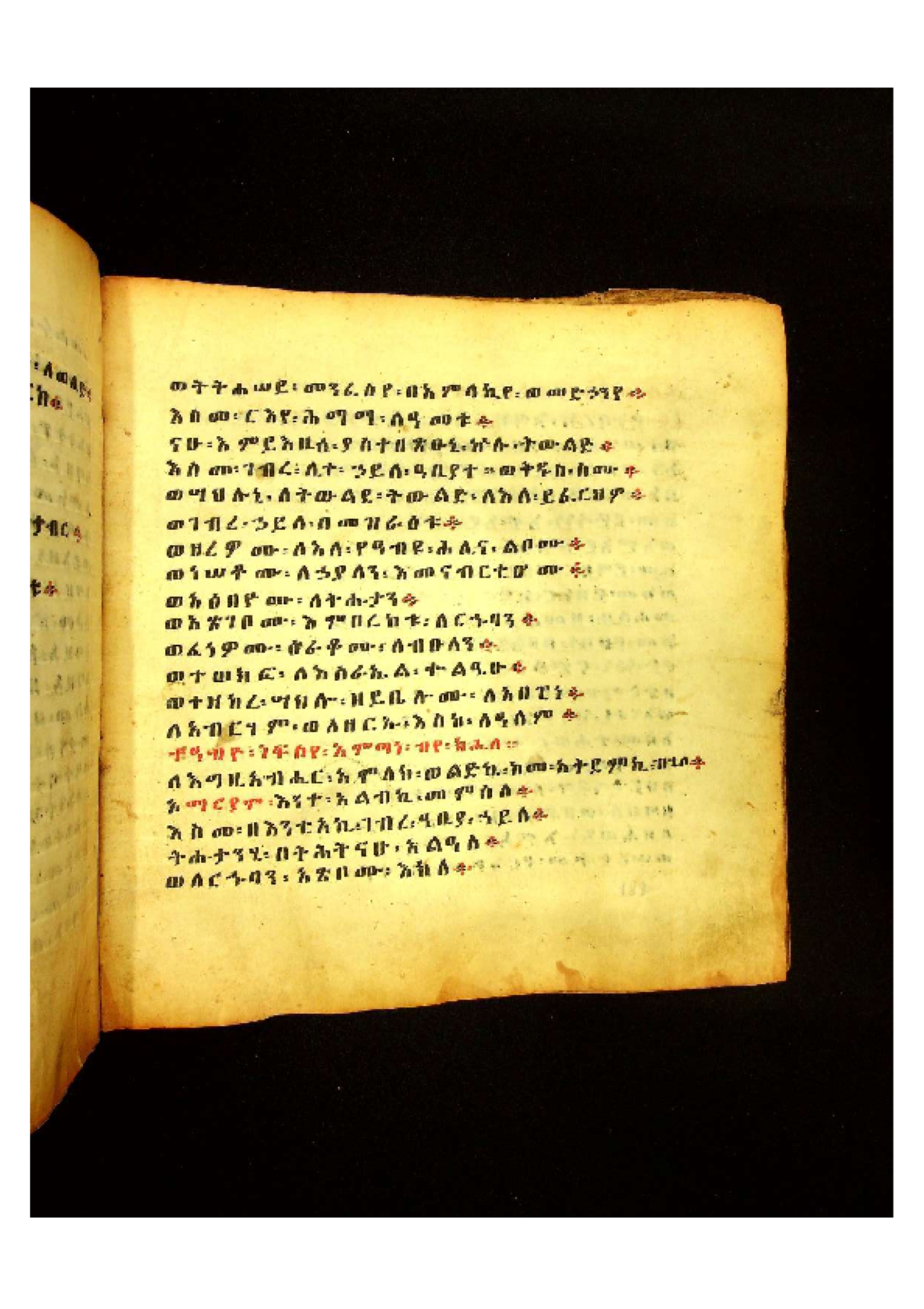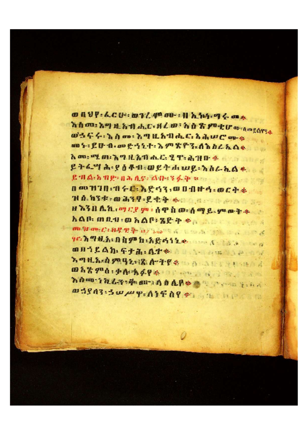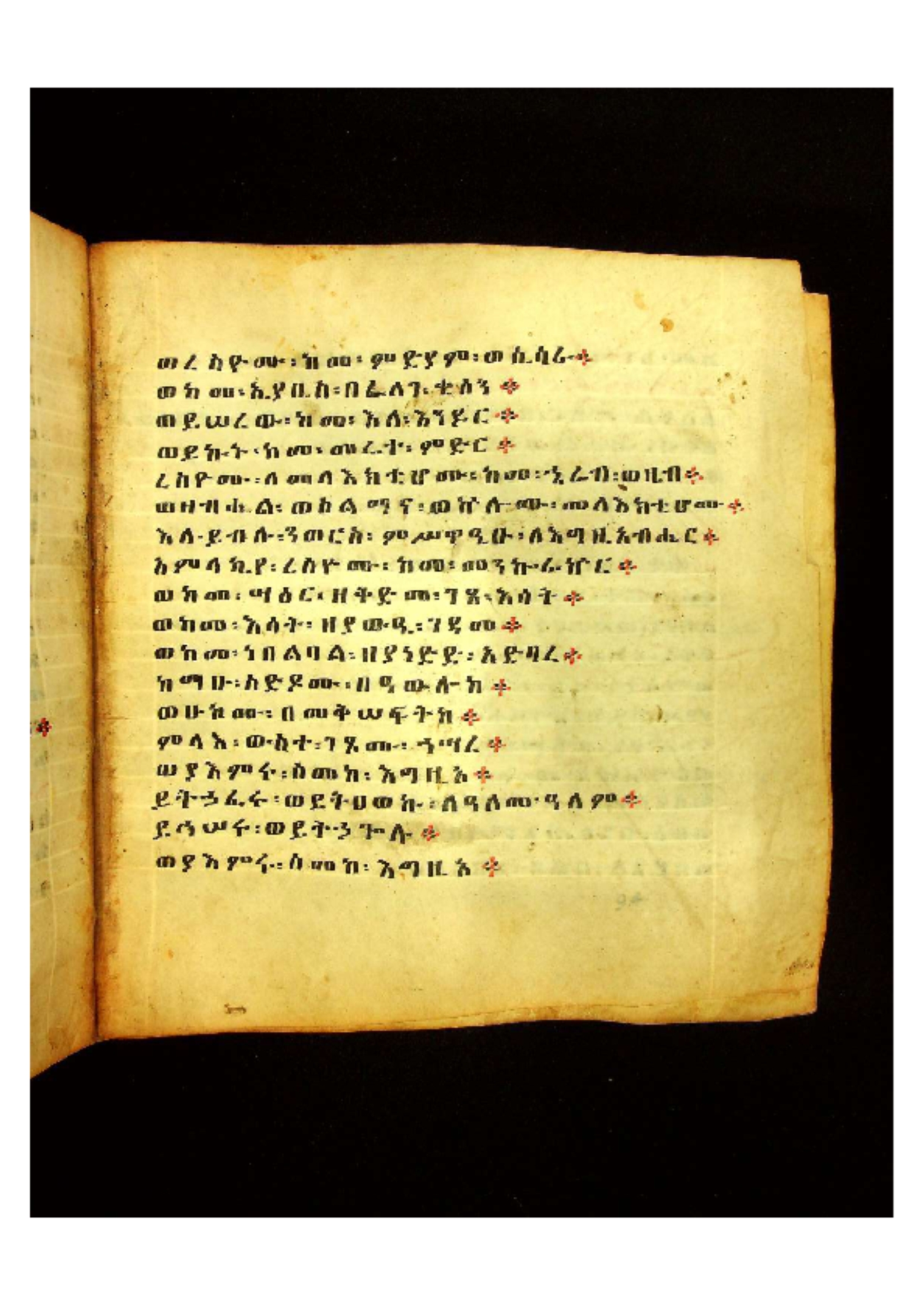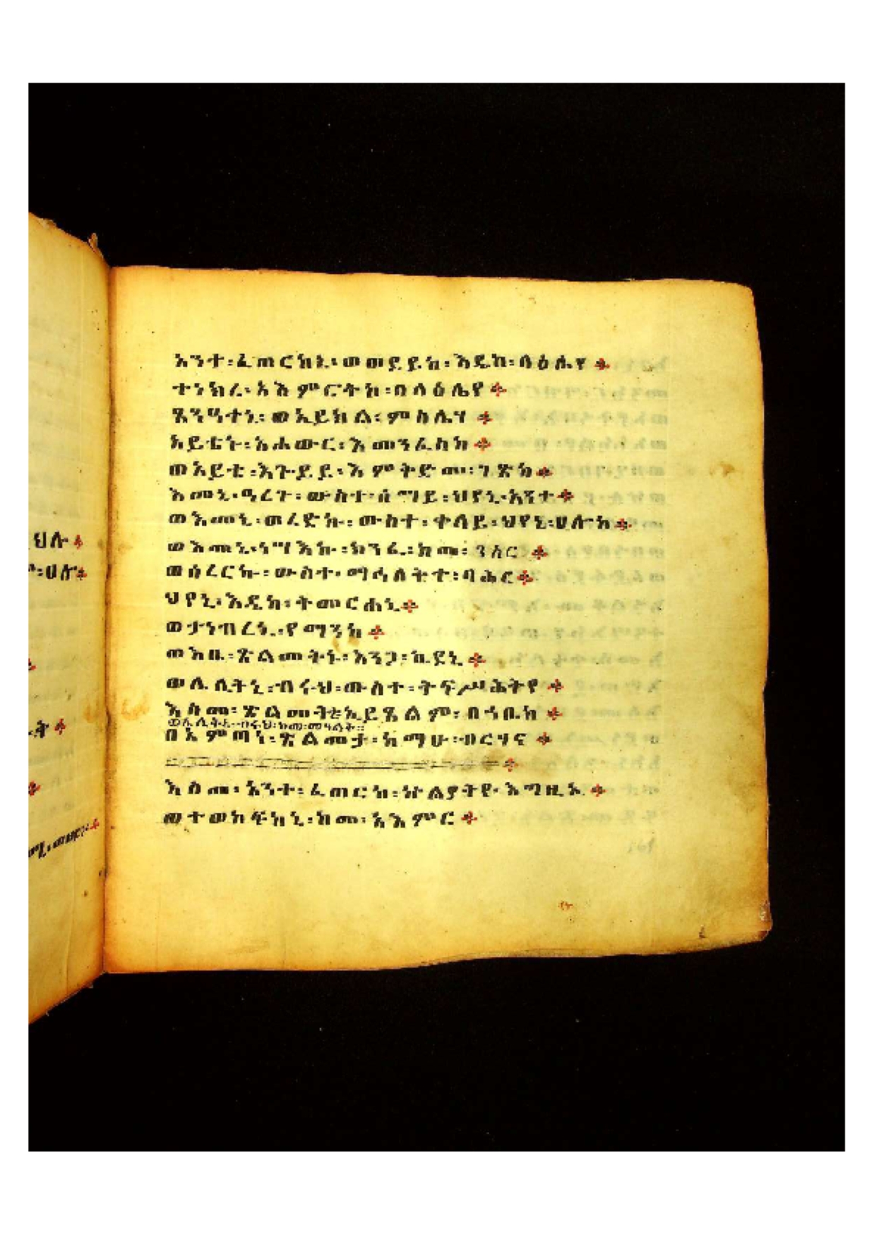 1. F. 2r: donation note written vertically in the outer margin, in black ink: “alla famiglia Bruschettini, Pussy […] Battaglia dell’Amba Aradam il 16 febbraio 1936 XIV”. The note, written in Italian and partly illegible, indicates the Bruschettini family as the receiver of the book and mentions the Battle of Amba Aradam, which took place on 16 February 1936. 2. F. 5r: note written in Italian in the outer upper margin, in red pencil: “Amba Aradam 16/2/XIV ore 17.30 P. Paloboni (?)”. This note also mentions the Battle of Amba Aradam, together with an individual whose name is partially unclear (P. Paloboni?). 3. F. 173v: supplication note written in small script in a mediocre hand, at the end of the “Psalms of David”: ዕቀበኒ፡ እምዓይነ፡ ደዌ፡ ወሞት፡ ለገብርከ፡ ደቅስዮስ፡, “protect me, your servant Däqsəyos, from the eye of infirmity and death”. The note mentions a certain Däqsəyos, indicated as “your servant” (possibly a later owner of the codex). 4. F. 173v: incipit of the Gəʿəz and Amharic prayer, perhaps a writing exercise. The note is written in an inaccurate calligraphy on the outer margin of the folio, next to the prayer. The entire text is የህፂ፡ ኖኅን፡ ከማየ[፡] አይኅ። እስራኤልን፡ ከፈርዖን፡ ዳዊትን፡ ከሳኦል፡ ከኢሎፍሊ። ኤ. 5. F. 190v: donation note, written in black ink in a mediocre hand. Text: ዝመጽሐፍ፡ ዘደብተራ፡ ኪሮስ፡ ዘወሀቦ፡ ለታቦተ፡ ሚካኤል፡ ኢትርስዑኒ፡ በአቡነ፡ ዘበሰማያት፡ ዘአቡየ፡ ገብረ፡ ማርያም፡ ወለእምየ፡ ወለተ፡ ሩፋኤል፡, “This book belongs to däbtära Kiros, who donated it to the tabot of [the church of St] Michael. Do not forget me for our Father who is in heaven. [It also belongs] to my father Gäbrä Maryam and my mother Wälättä Rufaʾel”. 6. F. 199v: writings executed in an inaccurate hand, perhaps the same of note 4. The note includes pen trials (ፈቲነ፡ ብርዕ፡ ዘፈረና፡ etc.), reproduces the explicit of the “Song of the songs” (ስብሐታተኪ፡ ማርያም፡ ከመ፡ እንተ፡ ሕልቀት፡ etc.) and the incipit of the “Praise of Mary” (ውዳሴ፡ ዘሰኑይ፡ ፈቀደ፡ እግዚእ፡ etc., partly rubricated). The writings also mention Däqsəyos, indicated as “your servant” (possibly a later owner of the codex) 7. F. 220ra–va: Genealogic note written on two columns. The note illustrates the family tree of King Yoḥannǝs I, who reigned from 1667 to 1682. The text is acephalous. Incipit: [ወለ]ደ፡ እምሐና፡ ብእሲቱ፡ አሦተ፡ ቅዱሳንሃ፡ ወአሦተ፡ ቅዱሳንኒ፡ እምነ፡ ጳውሊ፡ ብእሲሃ፡ ወለደቶሙ፡ ለአቤተኁን፡ ማእምሮ፡ ወለዘሥላሴ፡ ወአቤተኁን፡ ማእምሮኒ፡ ወለደ፡ አቃርዮስ፡ ወአቃርዮስኒ፡ ወለደ፡ እመቤት፡ እኅተ፡ ክርስቶስሃ፡. The text is published and translated in Proverbio D.V., 2000, ‘Inventario sommario dei manoscritti arabi, ebraici, etiopici – con notizia dei turchi – conservati presso la Biblioteca della Badia di Grottaferrata’. Atti della Accademia nazionale dei Lincei, Memorie, Classe di scienze morali, storiche e filologiche, serie IX, 12 (2000), 468–570 (here pp. 496–97, Appendice III). 8. F. 220va–b: Protective prayer against snakes, written on two columns. Incipit: በስመ፡ አብ፡ … ጸሎት፡ በእንተ፡ ዓርዌ፡ ምድር። ሶበ፡ በጽሐ፡ መልእክት፡ ሐሰውከ፡ በል፡ ፫ጊዜ፡ አኂዘከ፡ ዘፈረ፡ ልብሰ፡ ለእመ፡ ሀሎ፡ ርሑቀ፡ አስትዮ፡. The prayer is probably written in the same hand of note 7. 9. F. 220vb: Unidentified magic prayer containing asmat-names. Incipit: በስመ፡ አብ፡ … ኦላዘላህም፡ አህጉረ፡ ቀዳ[.]፡ ፍሖም፡ ሊስ፡ አፍሊስ፡ ምልክዮስ፡ ዘ[..]ማኤል፡ በዝንቱ፡ አስማቲከ፡ [.]ጽ[..] ኃይለ፡ በረድ፡ ወነፋስ፡ ከማሁ፡. |