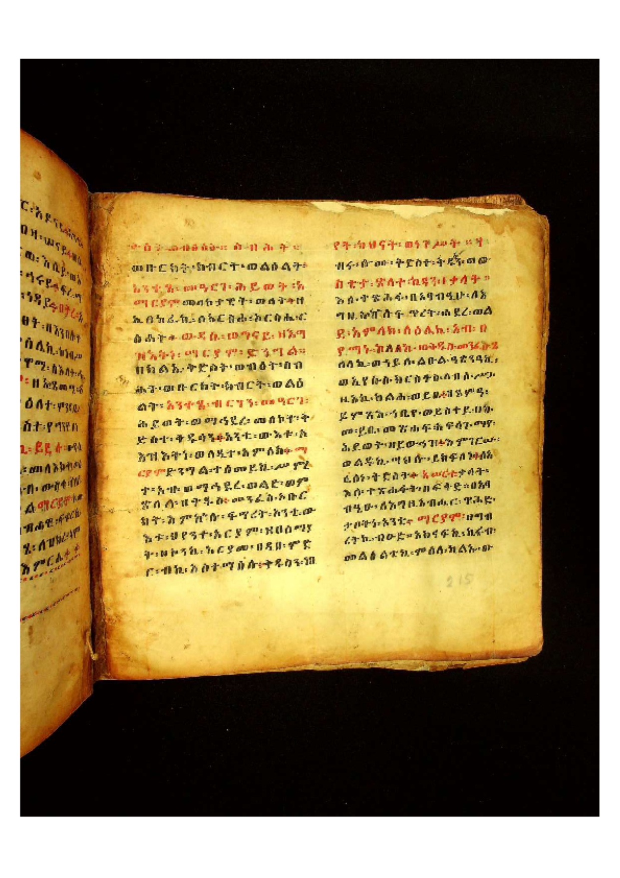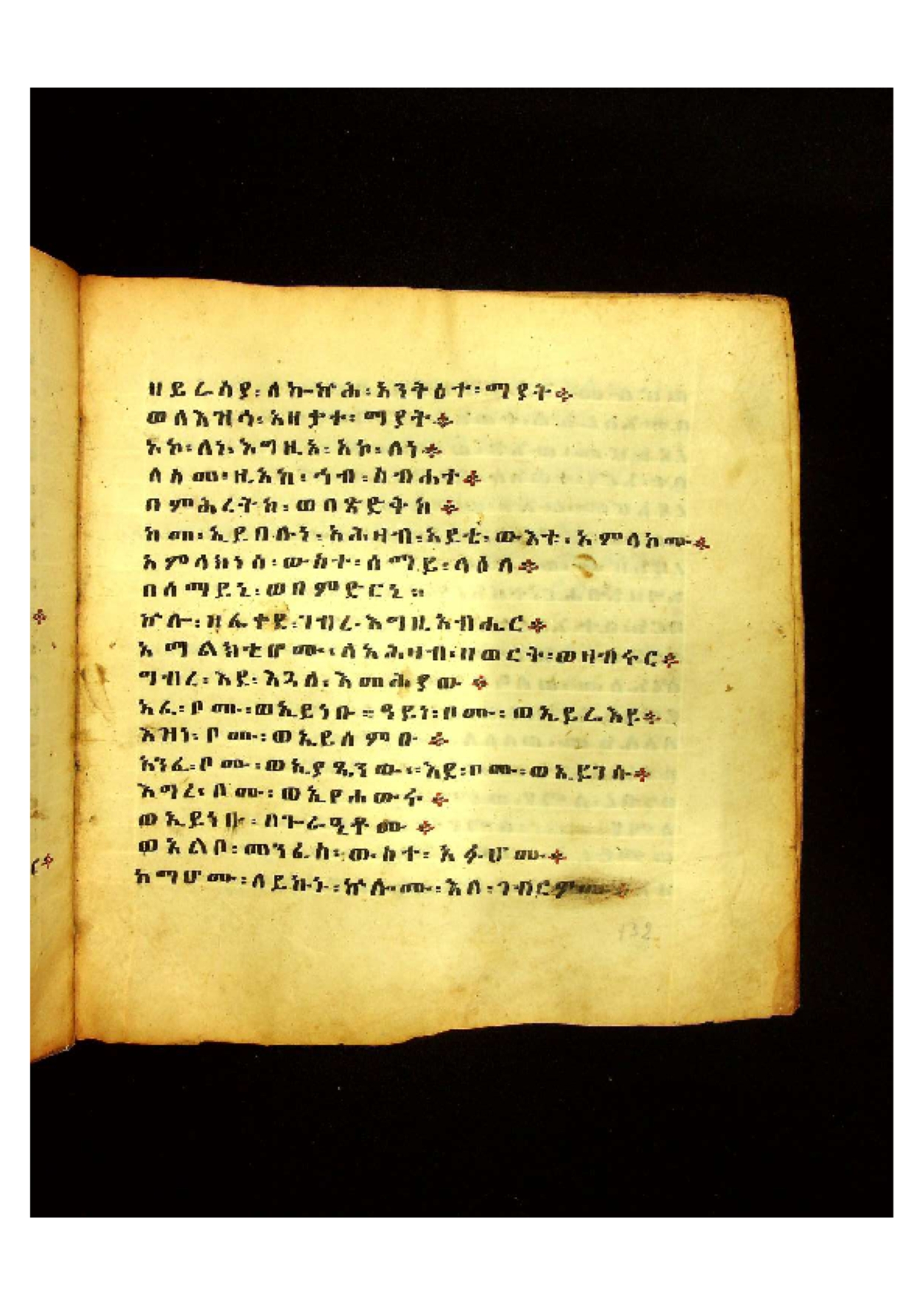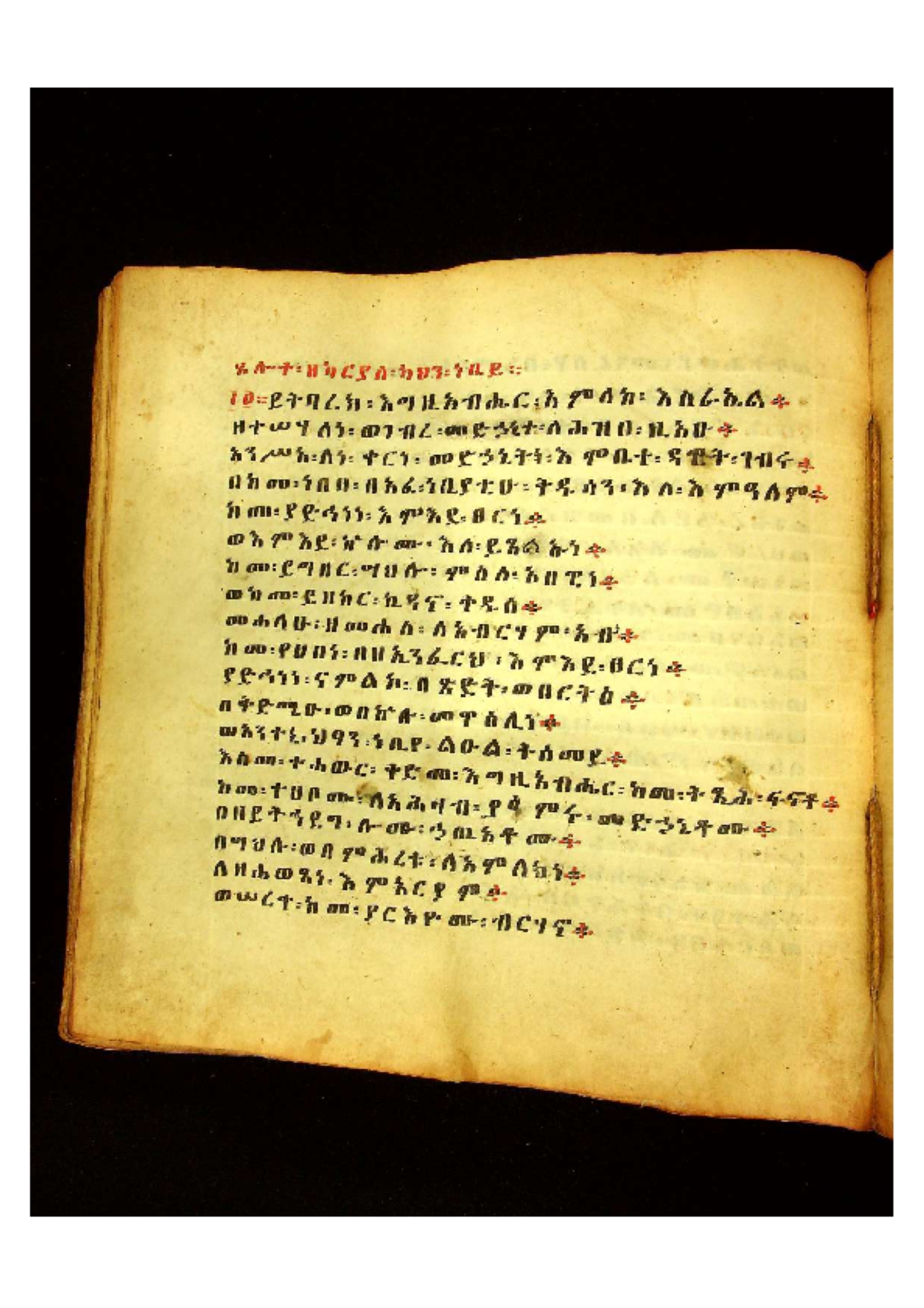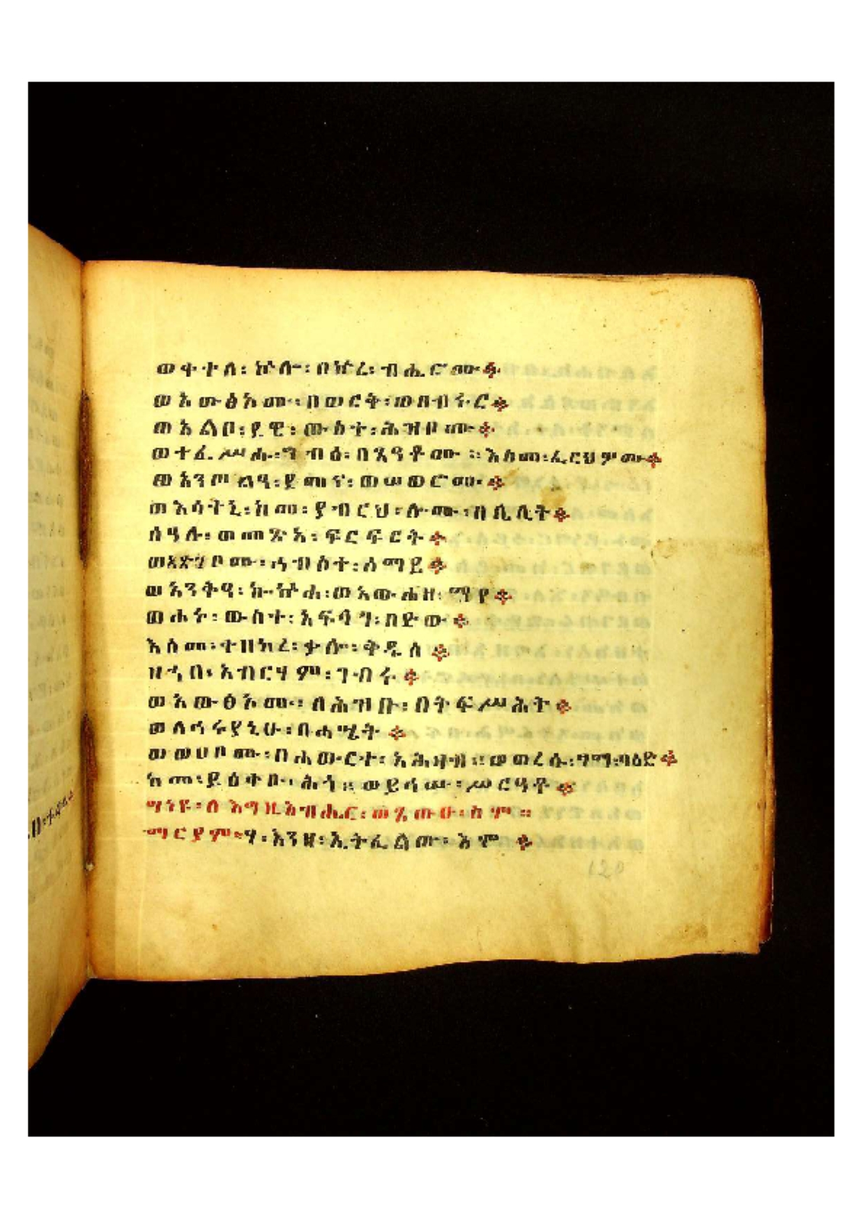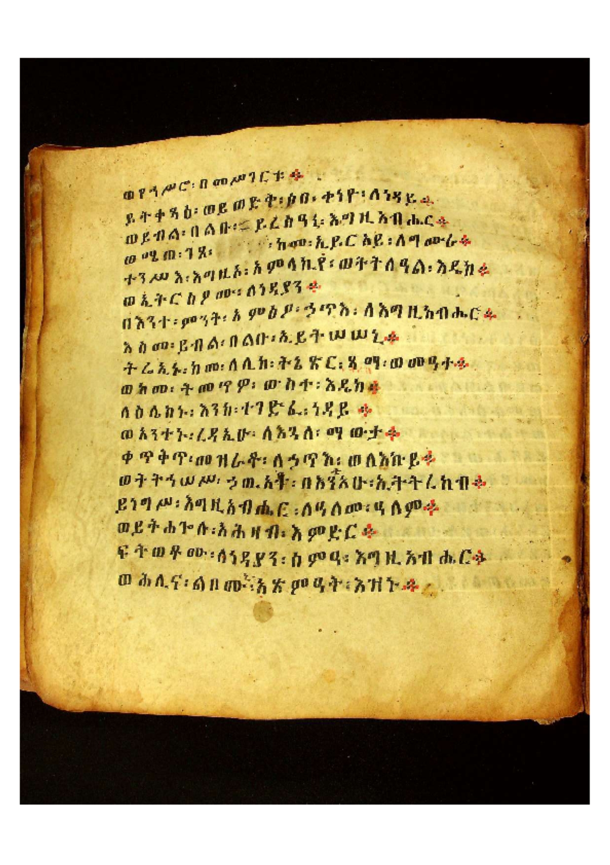1. F. 2r: donation note written vertically in the outer margin, in black ink: “alla famiglia Bruschettini, Pussy […] Battaglia dell’Amba Aradam il 16 febbraio 1936 XIV”. The note, written in Italian and partly illegible, indicates the Bruschettini family as the receiver of the book and mentions the Battle of Amba Aradam, which took place on 16 February 1936. 2. F. 5r: note written in Italian in the outer upper margin, in red pencil: “Amba Aradam 16/2/XIV ore 17.30 P. Paloboni (?)”. This note also mentions the Battle of Amba Aradam, together with an individual whose name is partially unclear (P. Paloboni?). 3. F. 173v: supplication note written in small script in a mediocre hand, at the end of the “Psalms of David”: ዕቀበኒ፡ እምዓይነ፡ ደዌ፡ ወሞት፡ ለገብርከ፡ ደቅስዮስ፡, “protect me, your servant Däqsəyos, from the eye of infirmity and death”. The note mentions a certain Däqsəyos, indicated as “your servant” (possibly a later owner of the codex). 4. F. 173v: incipit of the Gəʿəz and Amharic prayer, perhaps a writing exercise. The note is written in an inaccurate calligraphy on the outer margin of the folio, next to the prayer. The entire text is የህፂ፡ ኖኅን፡ ከማየ[፡] አይኅ። እስራኤልን፡ ከፈርዖን፡ ዳዊትን፡ ከሳኦል፡ ከኢሎፍሊ። ኤ. 5. F. 190v: donation note, written in black ink in a mediocre hand. Text: ዝመጽሐፍ፡ ዘደብተራ፡ ኪሮስ፡ ዘወሀቦ፡ ለታቦተ፡ ሚካኤል፡ ኢትርስዑኒ፡ በአቡነ፡ ዘበሰማያት፡ ዘአቡየ፡ ገብረ፡ ማርያም፡ ወለእምየ፡ ወለተ፡ ሩፋኤል፡, “This book belongs to däbtära Kiros, who donated it to the tabot of [the church of St] Michael. Do not forget me for our Father who is in heaven. [It also belongs] to my father Gäbrä Maryam and my mother Wälättä Rufaʾel”. 6. F. 199v: writings executed in an inaccurate hand, perhaps the same of note 4. The note includes pen trials (ፈቲነ፡ ብርዕ፡ ዘፈረና፡ etc.), reproduces the explicit of the “Song of the songs” (ስብሐታተኪ፡ ማርያም፡ ከመ፡ እንተ፡ ሕልቀት፡ etc.) and the incipit of the “Praise of Mary” (ውዳሴ፡ ዘሰኑይ፡ ፈቀደ፡ እግዚእ፡ etc., partly rubricated). The writings also mention Däqsəyos, indicated as “your servant” (possibly a later owner of the codex) 7. F. 220ra–va: Genealogic note written on two columns. The note illustrates the family tree of King Yoḥannǝs I, who reigned from 1667 to 1682. The text is acephalous. Incipit: [ወለ]ደ፡ እምሐና፡ ብእሲቱ፡ አሦተ፡ ቅዱሳንሃ፡ ወአሦተ፡ ቅዱሳንኒ፡ እምነ፡ ጳውሊ፡ ብእሲሃ፡ ወለደቶሙ፡ ለአቤተኁን፡ ማእምሮ፡ ወለዘሥላሴ፡ ወአቤተኁን፡ ማእምሮኒ፡ ወለደ፡ አቃርዮስ፡ ወአቃርዮስኒ፡ ወለደ፡ እመቤት፡ እኅተ፡ ክርስቶስሃ፡. The text is published and translated in Proverbio D.V., 2000, ‘Inventario sommario dei manoscritti arabi, ebraici, etiopici – con notizia dei turchi – conservati presso la Biblioteca della Badia di Grottaferrata’. Atti della Accademia nazionale dei Lincei, Memorie, Classe di scienze morali, storiche e filologiche, serie IX, 12 (2000), 468–570 (here pp. 496–97, Appendice III). 8. F. 220va–b: Protective prayer against snakes, written on two columns. Incipit: በስመ፡ አብ፡ … ጸሎት፡ በእንተ፡ ዓርዌ፡ ምድር። ሶበ፡ በጽሐ፡ መልእክት፡ ሐሰውከ፡ በል፡ ፫ጊዜ፡ አኂዘከ፡ ዘፈረ፡ ልብሰ፡ ለእመ፡ ሀሎ፡ ርሑቀ፡ አስትዮ፡. The prayer is probably written in the same hand of note 7. 9. F. 220vb: Unidentified magic prayer containing asmat-names. Incipit: በስመ፡ አብ፡ … ኦላዘላህም፡ አህጉረ፡ ቀዳ[.]፡ ፍሖም፡ ሊስ፡ አፍሊስ፡ ምልክዮስ፡ ዘ[..]ማኤል፡ በዝንቱ፡ አስማቲከ፡ [.]ጽ[..] ኃይለ፡ በረድ፡ ወነፋስ፡ ከማሁ፡. |
