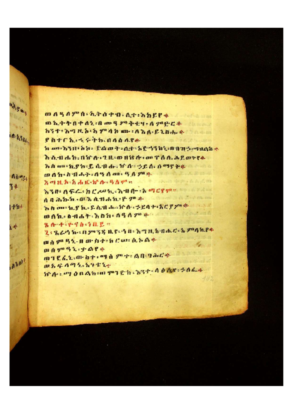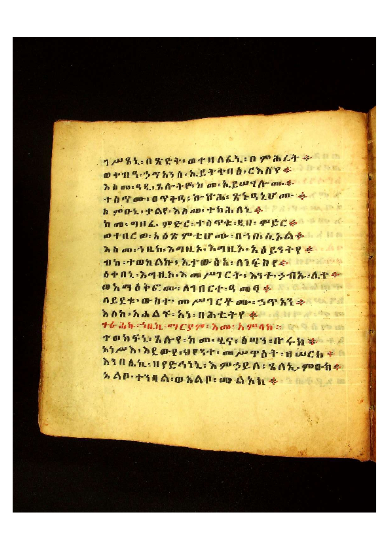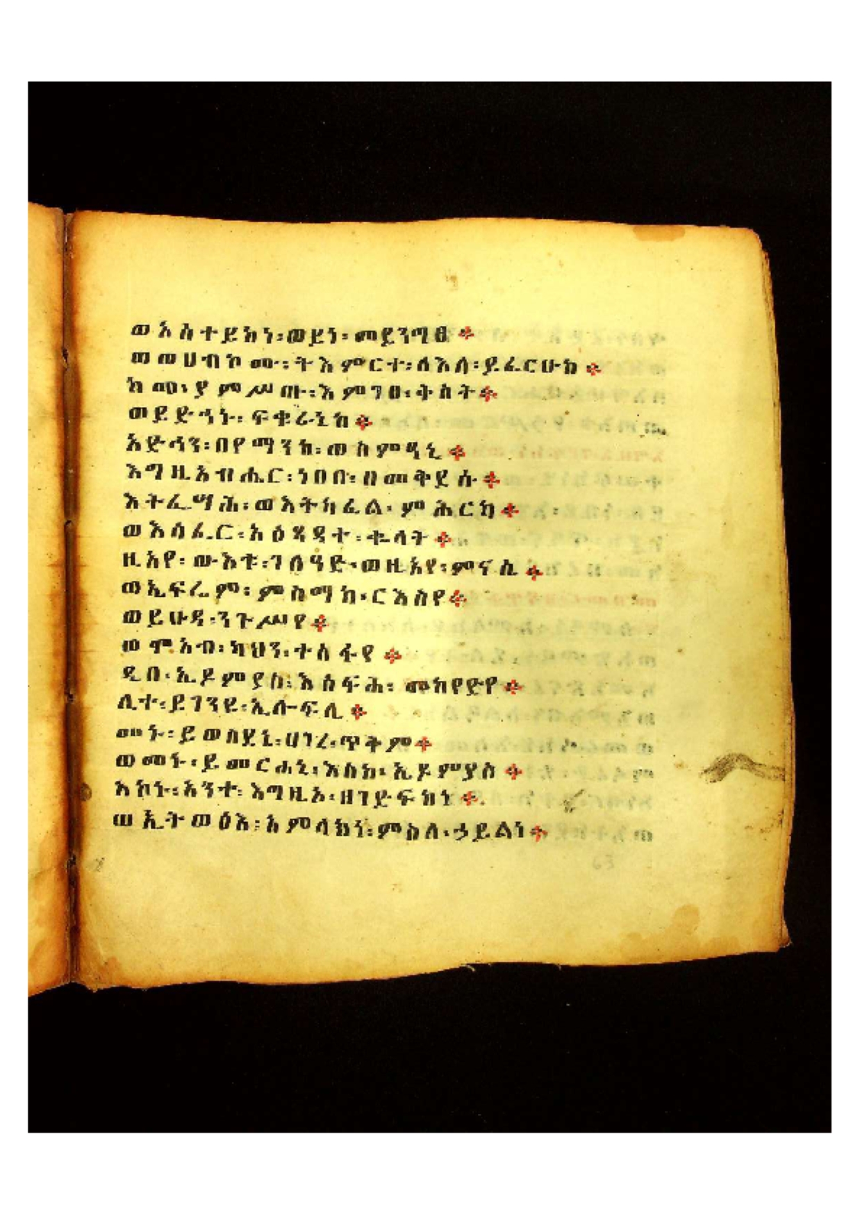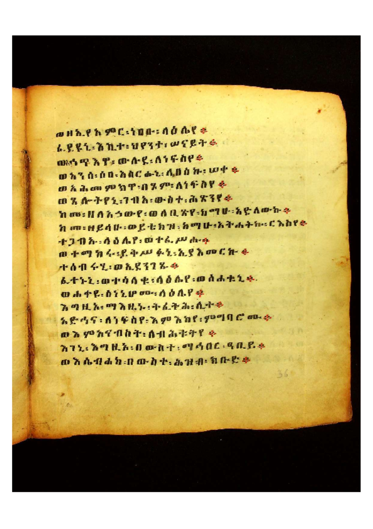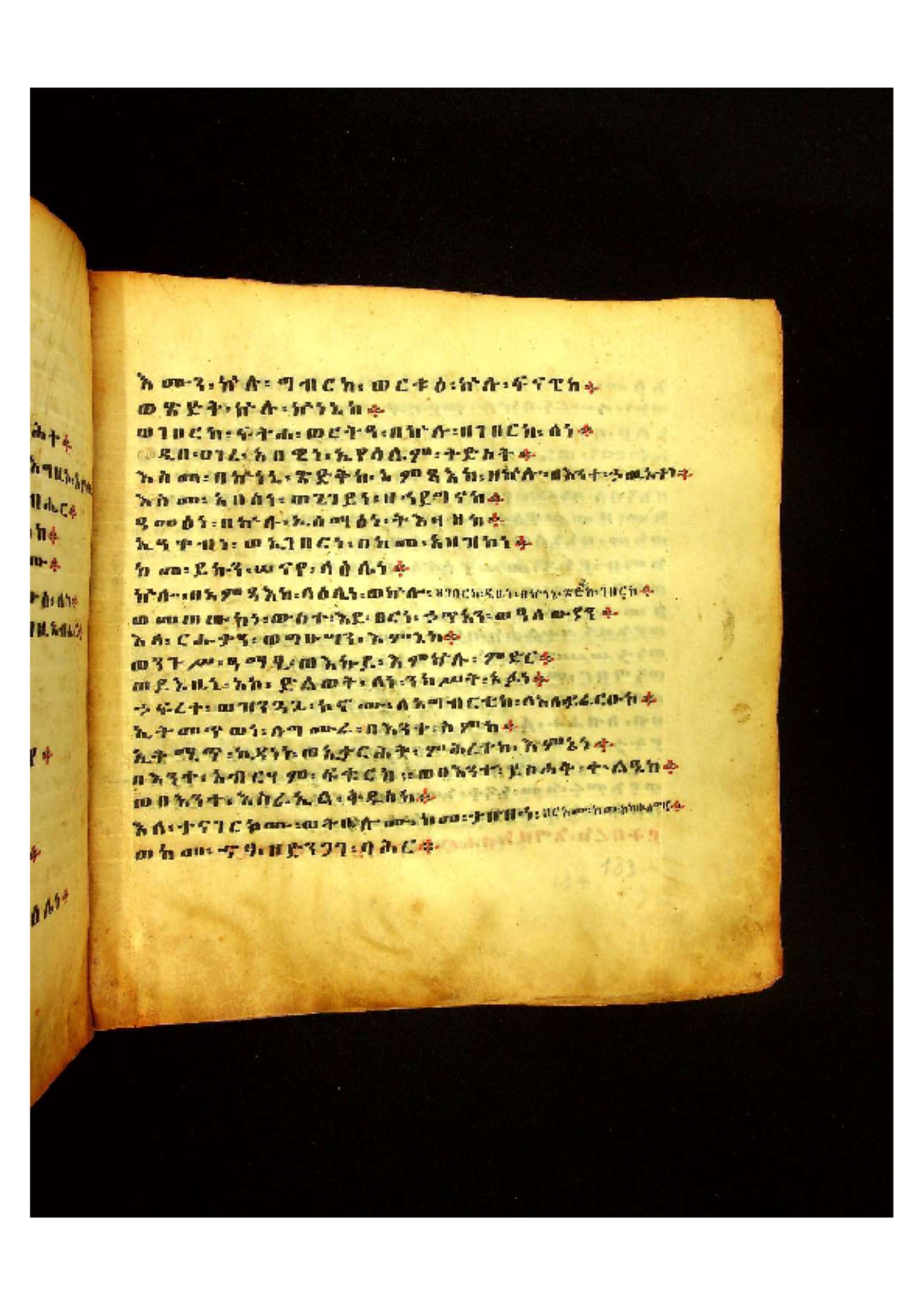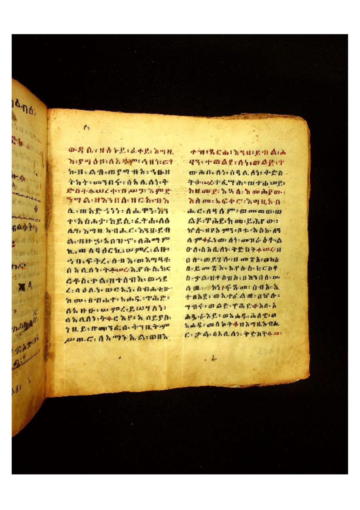 1. F. 2r: donation note written vertically in the outer margin, in black ink: “alla famiglia Bruschettini, Pussy […] Battaglia dell’Amba Aradam il 16 febbraio 1936 XIV”. The note, written in Italian and partly illegible, indicates the Bruschettini family as the receiver of the book and mentions the Battle of Amba Aradam, which took place on 16 February 1936. 2. F. 5r: note written in Italian in the outer upper margin, in red pencil: “Amba Aradam 16/2/XIV ore 17.30 P. Paloboni (?)”. This note also mentions the Battle of Amba Aradam, together with an individual whose name is partially unclear (P. Paloboni?). 3. F. 173v: supplication note written in small script in a mediocre hand, at the end of the “Psalms of David”: ዕቀበኒ፡ እምዓይነ፡ ደዌ፡ ወሞት፡ ለገብርከ፡ ደቅስዮስ፡, “protect me, your servant Däqsəyos, from the eye of infirmity and death”. The note mentions a certain Däqsəyos, indicated as “your servant” (possibly a later owner of the codex). 4. F. 173v: incipit of the Gəʿəz and Amharic prayer, perhaps a writing exercise. The note is written in an inaccurate calligraphy on the outer margin of the folio, next to the prayer. The entire text is የህፂ፡ ኖኅን፡ ከማየ[፡] አይኅ። እስራኤልን፡ ከፈርዖን፡ ዳዊትን፡ ከሳኦል፡ ከኢሎፍሊ። ኤ. 5. F. 190v: donation note, written in black ink in a mediocre hand. Text: ዝመጽሐፍ፡ ዘደብተራ፡ ኪሮስ፡ ዘወሀቦ፡ ለታቦተ፡ ሚካኤል፡ ኢትርስዑኒ፡ በአቡነ፡ ዘበሰማያት፡ ዘአቡየ፡ ገብረ፡ ማርያም፡ ወለእምየ፡ ወለተ፡ ሩፋኤል፡, “This book belongs to däbtära Kiros, who donated it to the tabot of [the church of St] Michael. Do not forget me for our Father who is in heaven. [It also belongs] to my father Gäbrä Maryam and my mother Wälättä Rufaʾel”. 6. F. 199v: writings executed in an inaccurate hand, perhaps the same of note 4. The note includes pen trials (ፈቲነ፡ ብርዕ፡ ዘፈረና፡ etc.), reproduces the explicit of the “Song of the songs” (ስብሐታተኪ፡ ማርያም፡ ከመ፡ እንተ፡ ሕልቀት፡ etc.) and the incipit of the “Praise of Mary” (ውዳሴ፡ ዘሰኑይ፡ ፈቀደ፡ እግዚእ፡ etc., partly rubricated). The writings also mention Däqsəyos, indicated as “your servant” (possibly a later owner of the codex) 7. F. 220ra–va: Genealogic note written on two columns. The note illustrates the family tree of King Yoḥannǝs I, who reigned from 1667 to 1682. The text is acephalous. Incipit: [ወለ]ደ፡ እምሐና፡ ብእሲቱ፡ አሦተ፡ ቅዱሳንሃ፡ ወአሦተ፡ ቅዱሳንኒ፡ እምነ፡ ጳውሊ፡ ብእሲሃ፡ ወለደቶሙ፡ ለአቤተኁን፡ ማእምሮ፡ ወለዘሥላሴ፡ ወአቤተኁን፡ ማእምሮኒ፡ ወለደ፡ አቃርዮስ፡ ወአቃርዮስኒ፡ ወለደ፡ እመቤት፡ እኅተ፡ ክርስቶስሃ፡. The text is published and translated in Proverbio D.V., 2000, ‘Inventario sommario dei manoscritti arabi, ebraici, etiopici – con notizia dei turchi – conservati presso la Biblioteca della Badia di Grottaferrata’. Atti della Accademia nazionale dei Lincei, Memorie, Classe di scienze morali, storiche e filologiche, serie IX, 12 (2000), 468–570 (here pp. 496–97, Appendice III). 8. F. 220va–b: Protective prayer against snakes, written on two columns. Incipit: በስመ፡ አብ፡ … ጸሎት፡ በእንተ፡ ዓርዌ፡ ምድር። ሶበ፡ በጽሐ፡ መልእክት፡ ሐሰውከ፡ በል፡ ፫ጊዜ፡ አኂዘከ፡ ዘፈረ፡ ልብሰ፡ ለእመ፡ ሀሎ፡ ርሑቀ፡ አስትዮ፡. The prayer is probably written in the same hand of note 7. 9. F. 220vb: Unidentified magic prayer containing asmat-names. Incipit: በስመ፡ አብ፡ … ኦላዘላህም፡ አህጉረ፡ ቀዳ[.]፡ ፍሖም፡ ሊስ፡ አፍሊስ፡ ምልክዮስ፡ ዘ[..]ማኤል፡ በዝንቱ፡ አስማቲከ፡ [.]ጽ[..] ኃይለ፡ በረድ፡ ወነፋስ፡ ከማሁ፡. |