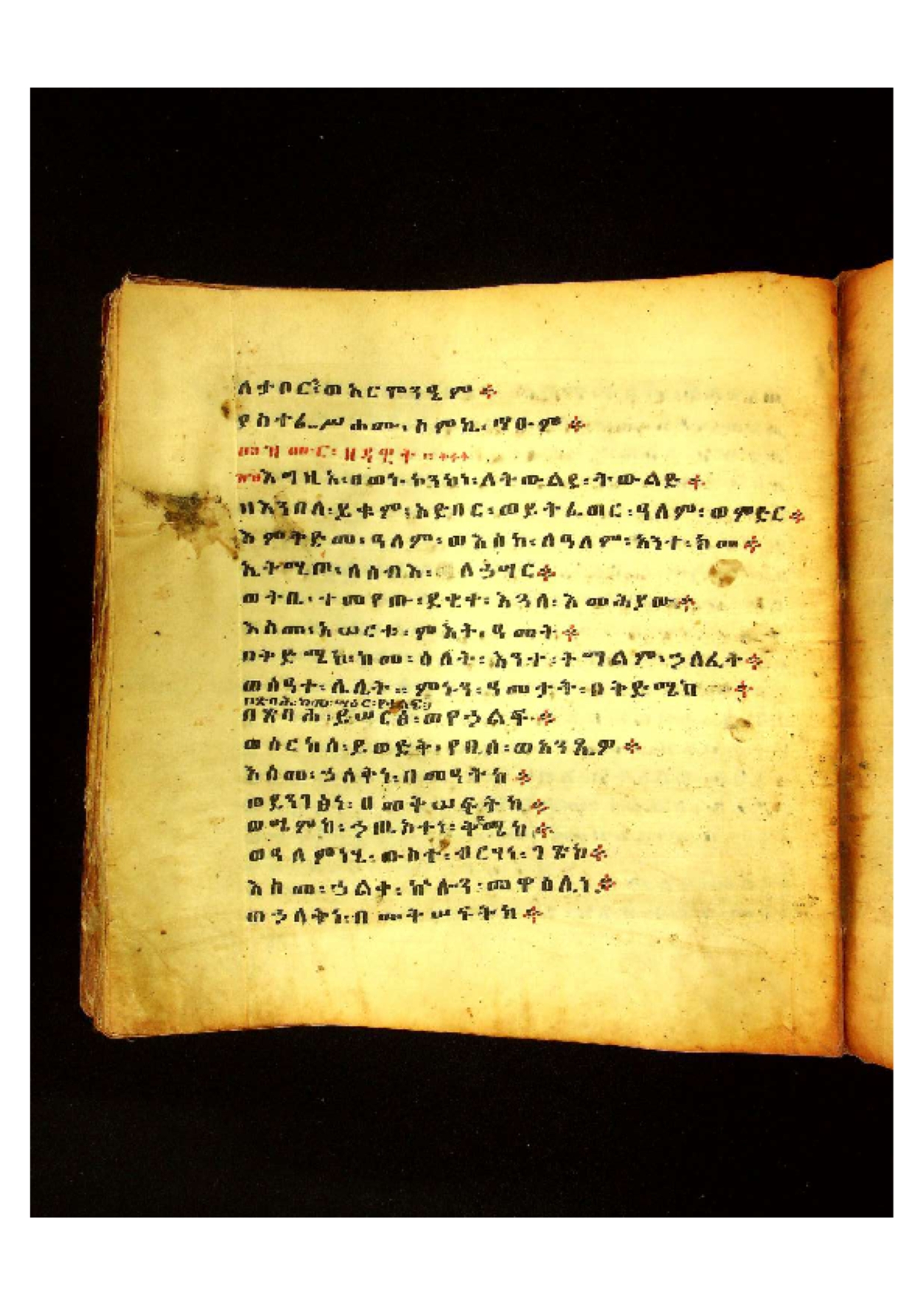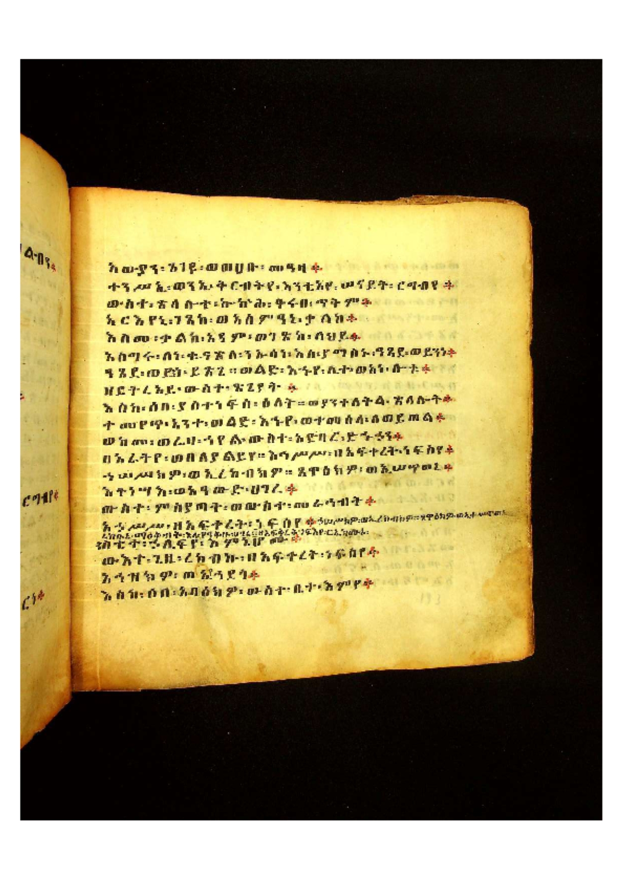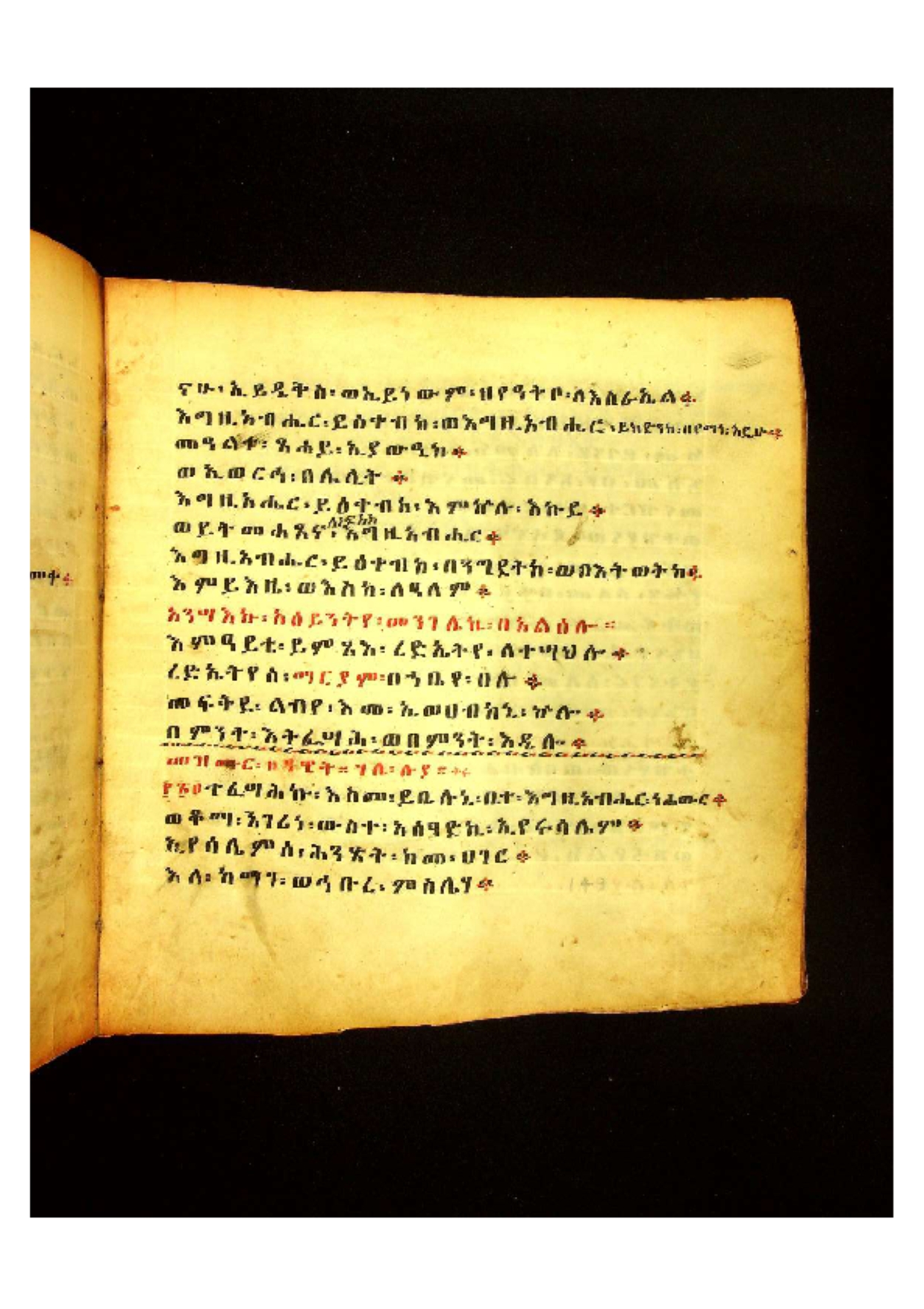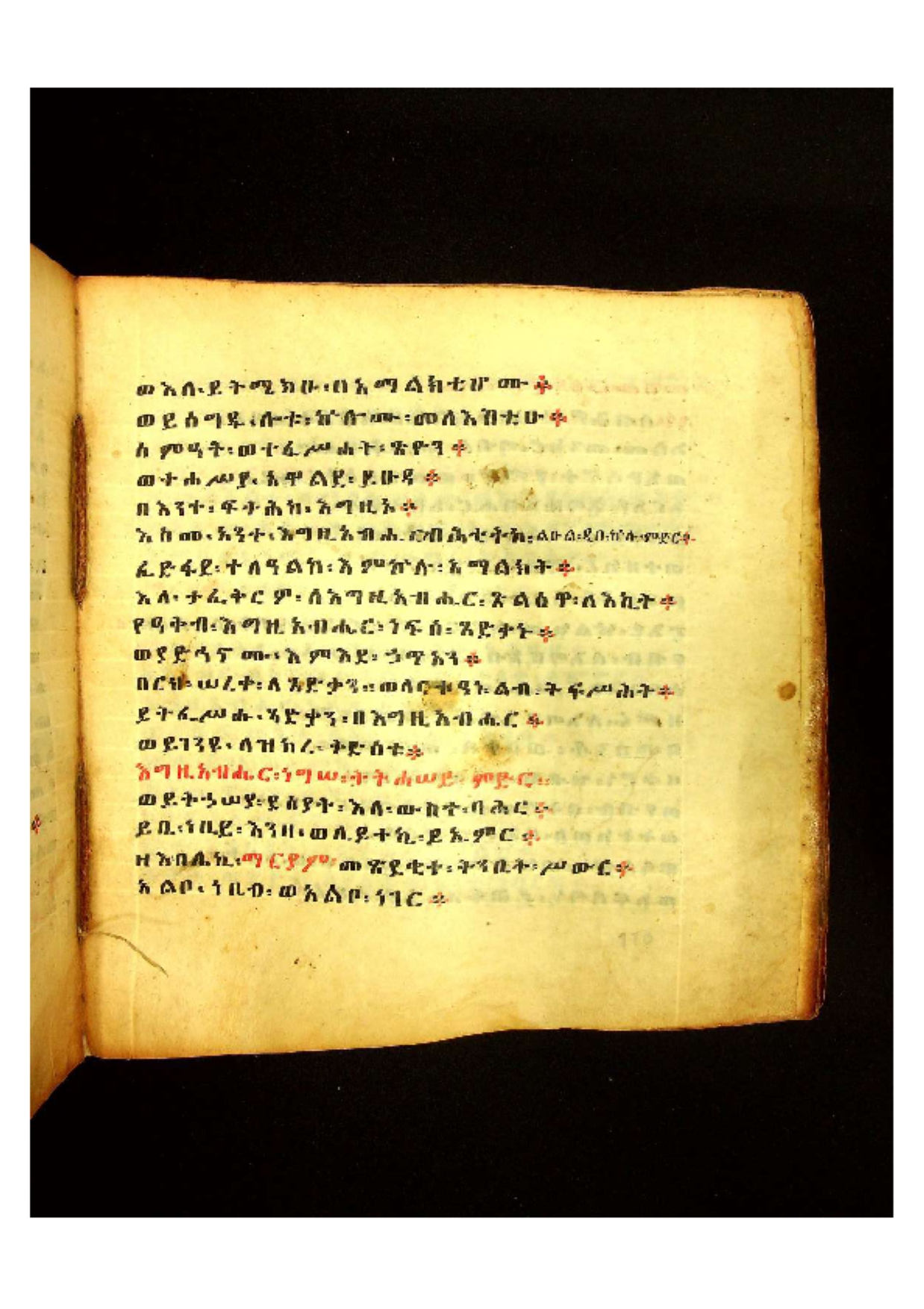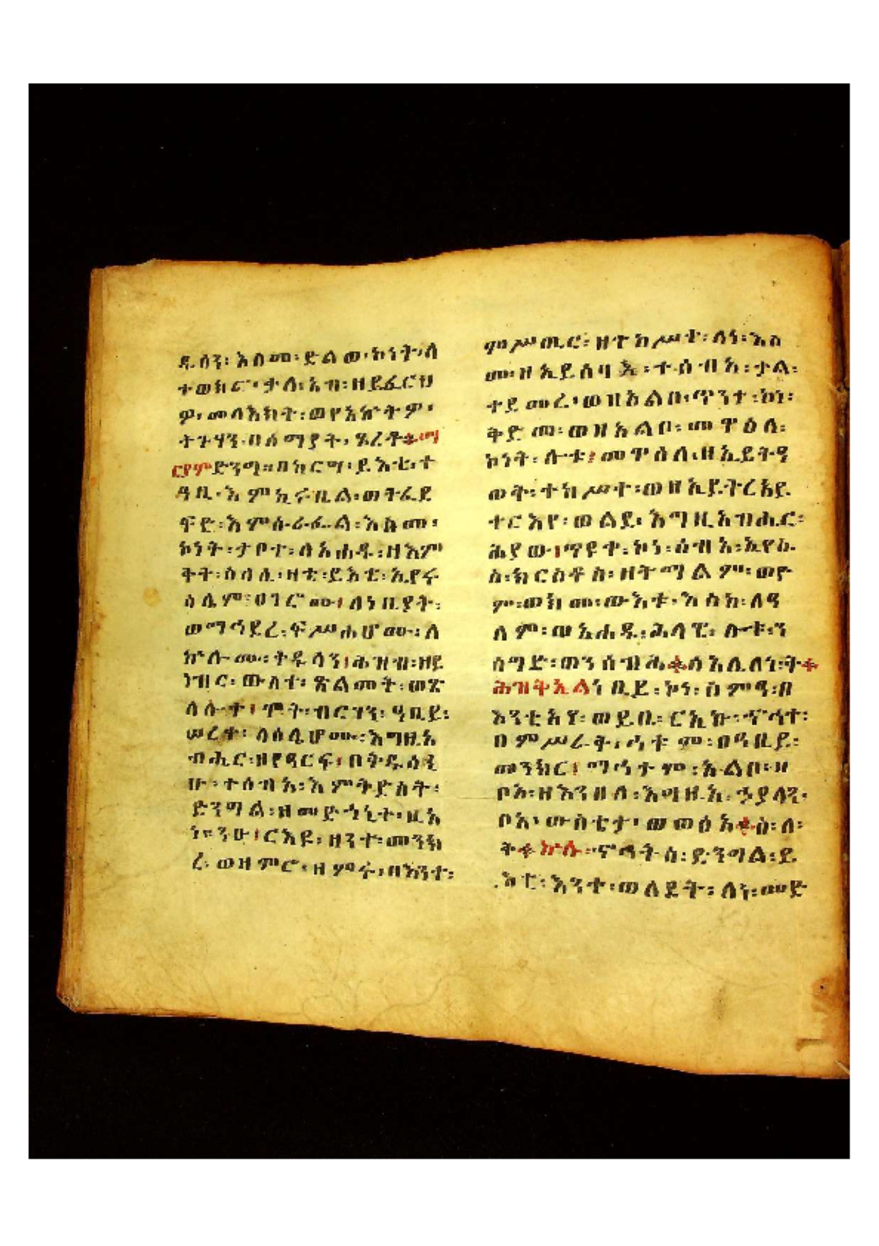 1. F. 2r: donation note written vertically in the outer margin, in black ink: “alla famiglia Bruschettini, Pussy […] Battaglia dell’Amba Aradam il 16 febbraio 1936 XIV”. The note, written in Italian and partly illegible, indicates the Bruschettini family as the receiver of the book and mentions the Battle of Amba Aradam, which took place on 16 February 1936. 2. F. 5r: note written in Italian in the outer upper margin, in red pencil: “Amba Aradam 16/2/XIV ore 17.30 P. Paloboni (?)”. This note also mentions the Battle of Amba Aradam, together with an individual whose name is partially unclear (P. Paloboni?). 3. F. 173v: supplication note written in small script in a mediocre hand, at the end of the “Psalms of David”: ዕቀበኒ፡ እምዓይነ፡ ደዌ፡ ወሞት፡ ለገብርከ፡ ደቅስዮስ፡, “protect me, your servant Däqsəyos, from the eye of infirmity and death”. The note mentions a certain Däqsəyos, indicated as “your servant” (possibly a later owner of the codex). 4. F. 173v: incipit of the Gəʿəz and Amharic prayer, perhaps a writing exercise. The note is written in an inaccurate calligraphy on the outer margin of the folio, next to the prayer. The entire text is የህፂ፡ ኖኅን፡ ከማየ[፡] አይኅ። እስራኤልን፡ ከፈርዖን፡ ዳዊትን፡ ከሳኦል፡ ከኢሎፍሊ። ኤ. 5. F. 190v: donation note, written in black ink in a mediocre hand. Text: ዝመጽሐፍ፡ ዘደብተራ፡ ኪሮስ፡ ዘወሀቦ፡ ለታቦተ፡ ሚካኤል፡ ኢትርስዑኒ፡ በአቡነ፡ ዘበሰማያት፡ ዘአቡየ፡ ገብረ፡ ማርያም፡ ወለእምየ፡ ወለተ፡ ሩፋኤል፡, “This book belongs to däbtära Kiros, who donated it to the tabot of [the church of St] Michael. Do not forget me for our Father who is in heaven. [It also belongs] to my father Gäbrä Maryam and my mother Wälättä Rufaʾel”. 6. F. 199v: writings executed in an inaccurate hand, perhaps the same of note 4. The note includes pen trials (ፈቲነ፡ ብርዕ፡ ዘፈረና፡ etc.), reproduces the explicit of the “Song of the songs” (ስብሐታተኪ፡ ማርያም፡ ከመ፡ እንተ፡ ሕልቀት፡ etc.) and the incipit of the “Praise of Mary” (ውዳሴ፡ ዘሰኑይ፡ ፈቀደ፡ እግዚእ፡ etc., partly rubricated). The writings also mention Däqsəyos, indicated as “your servant” (possibly a later owner of the codex) 7. F. 220ra–va: Genealogic note written on two columns. The note illustrates the family tree of King Yoḥannǝs I, who reigned from 1667 to 1682. The text is acephalous. Incipit: [ወለ]ደ፡ እምሐና፡ ብእሲቱ፡ አሦተ፡ ቅዱሳንሃ፡ ወአሦተ፡ ቅዱሳንኒ፡ እምነ፡ ጳውሊ፡ ብእሲሃ፡ ወለደቶሙ፡ ለአቤተኁን፡ ማእምሮ፡ ወለዘሥላሴ፡ ወአቤተኁን፡ ማእምሮኒ፡ ወለደ፡ አቃርዮስ፡ ወአቃርዮስኒ፡ ወለደ፡ እመቤት፡ እኅተ፡ ክርስቶስሃ፡. The text is published and translated in Proverbio D.V., 2000, ‘Inventario sommario dei manoscritti arabi, ebraici, etiopici – con notizia dei turchi – conservati presso la Biblioteca della Badia di Grottaferrata’. Atti della Accademia nazionale dei Lincei, Memorie, Classe di scienze morali, storiche e filologiche, serie IX, 12 (2000), 468–570 (here pp. 496–97, Appendice III). 8. F. 220va–b: Protective prayer against snakes, written on two columns. Incipit: በስመ፡ አብ፡ … ጸሎት፡ በእንተ፡ ዓርዌ፡ ምድር። ሶበ፡ በጽሐ፡ መልእክት፡ ሐሰውከ፡ በል፡ ፫ጊዜ፡ አኂዘከ፡ ዘፈረ፡ ልብሰ፡ ለእመ፡ ሀሎ፡ ርሑቀ፡ አስትዮ፡. The prayer is probably written in the same hand of note 7. 9. F. 220vb: Unidentified magic prayer containing asmat-names. Incipit: በስመ፡ አብ፡ … ኦላዘላህም፡ አህጉረ፡ ቀዳ[.]፡ ፍሖም፡ ሊስ፡ አፍሊስ፡ ምልክዮስ፡ ዘ[..]ማኤል፡ በዝንቱ፡ አስማቲከ፡ [.]ጽ[..] ኃይለ፡ በረድ፡ ወነፋስ፡ ከማሁ፡. |