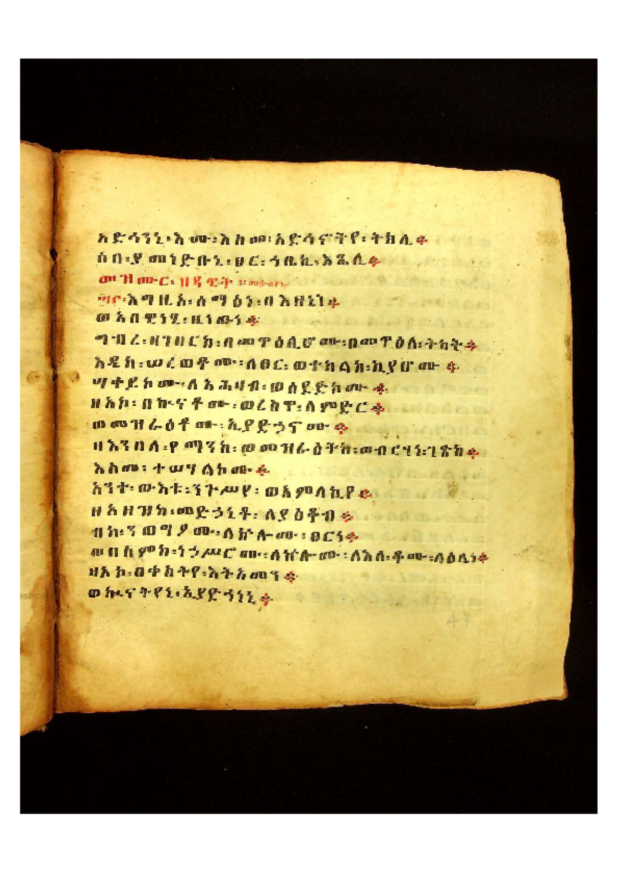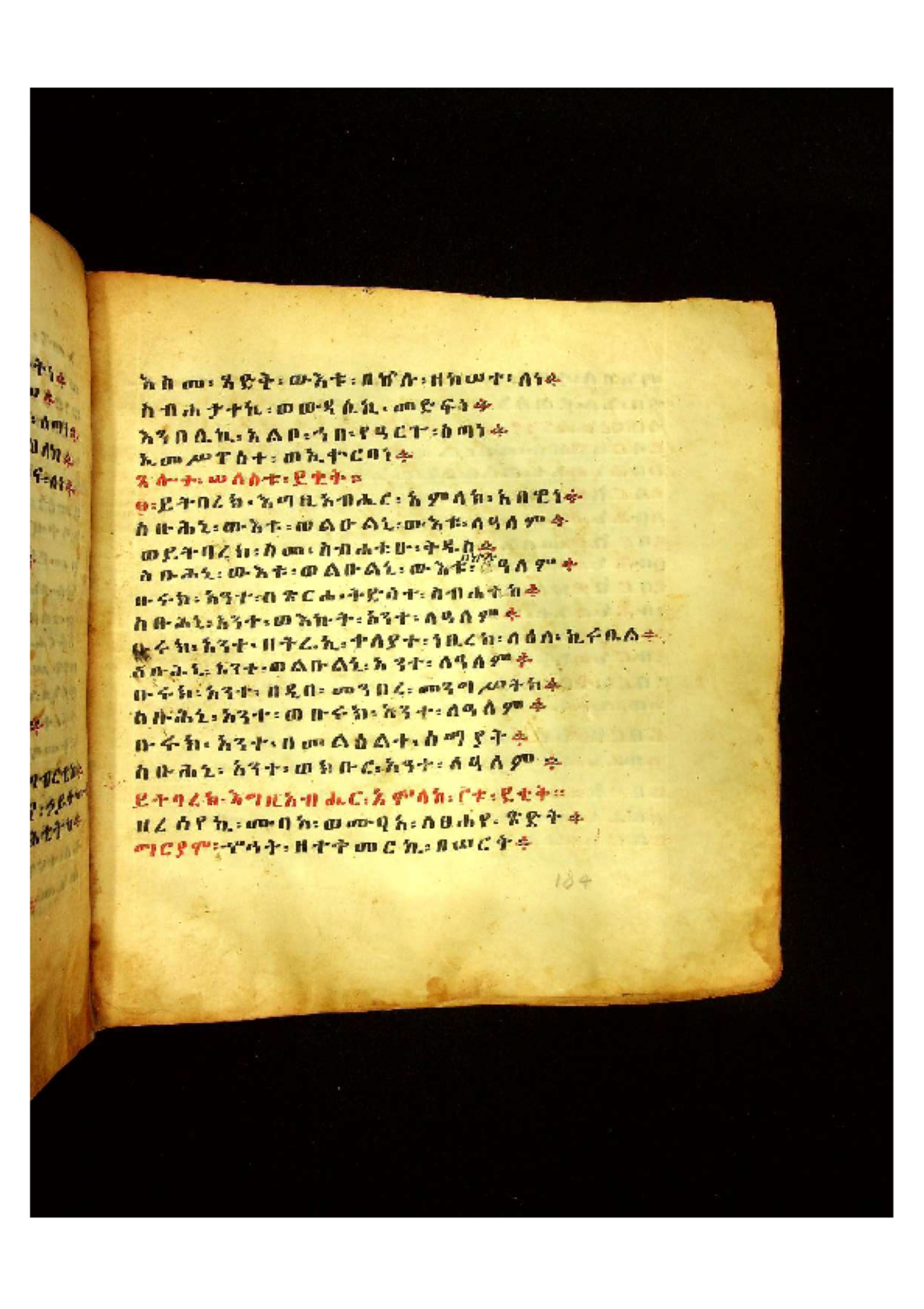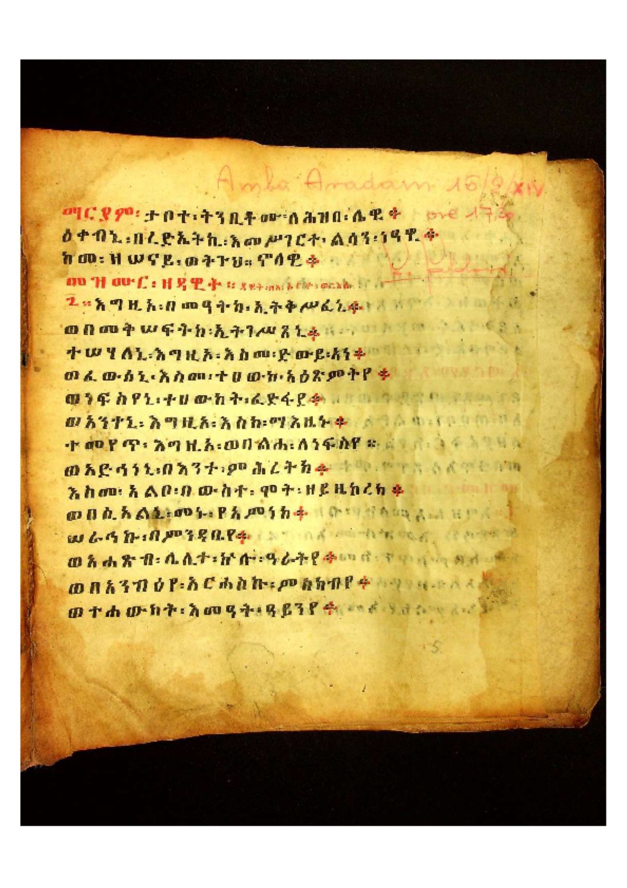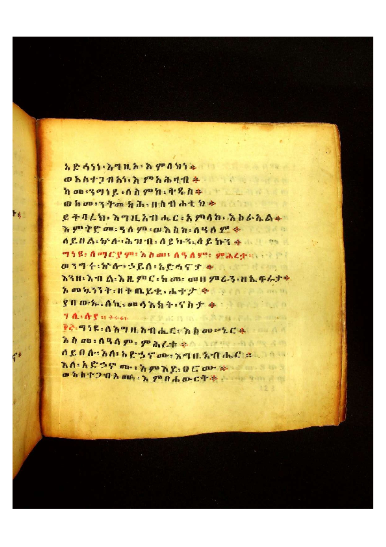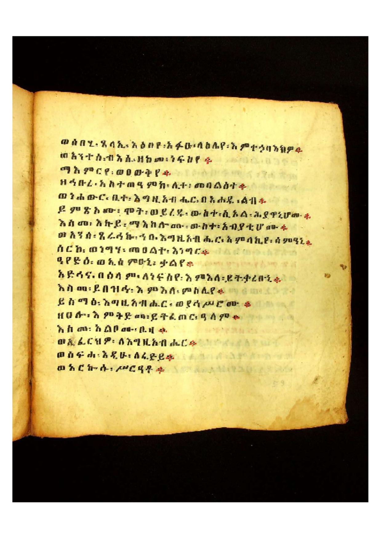 1. F. 2r: donation note written vertically in the outer margin, in black ink: “alla famiglia Bruschettini, Pussy […] Battaglia dell’Amba Aradam il 16 febbraio 1936 XIV”. The note, written in Italian and partly illegible, indicates the Bruschettini family as the receiver of the book and mentions the Battle of Amba Aradam, which took place on 16 February 1936. 2. F. 5r: note written in Italian in the outer upper margin, in red pencil: “Amba Aradam 16/2/XIV ore 17.30 P. Paloboni (?)”. This note also mentions the Battle of Amba Aradam, together with an individual whose name is partially unclear (P. Paloboni?). 3. F. 173v: supplication note written in small script in a mediocre hand, at the end of the “Psalms of David”: ዕቀበኒ፡ እምዓይነ፡ ደዌ፡ ወሞት፡ ለገብርከ፡ ደቅስዮስ፡, “protect me, your servant Däqsəyos, from the eye of infirmity and death”. The note mentions a certain Däqsəyos, indicated as “your servant” (possibly a later owner of the codex). 4. F. 173v: incipit of the Gəʿəz and Amharic prayer, perhaps a writing exercise. The note is written in an inaccurate calligraphy on the outer margin of the folio, next to the prayer. The entire text is የህፂ፡ ኖኅን፡ ከማየ[፡] አይኅ። እስራኤልን፡ ከፈርዖን፡ ዳዊትን፡ ከሳኦል፡ ከኢሎፍሊ። ኤ. 5. F. 190v: donation note, written in black ink in a mediocre hand. Text: ዝመጽሐፍ፡ ዘደብተራ፡ ኪሮስ፡ ዘወሀቦ፡ ለታቦተ፡ ሚካኤል፡ ኢትርስዑኒ፡ በአቡነ፡ ዘበሰማያት፡ ዘአቡየ፡ ገብረ፡ ማርያም፡ ወለእምየ፡ ወለተ፡ ሩፋኤል፡, “This book belongs to däbtära Kiros, who donated it to the tabot of [the church of St] Michael. Do not forget me for our Father who is in heaven. [It also belongs] to my father Gäbrä Maryam and my mother Wälättä Rufaʾel”. 6. F. 199v: writings executed in an inaccurate hand, perhaps the same of note 4. The note includes pen trials (ፈቲነ፡ ብርዕ፡ ዘፈረና፡ etc.), reproduces the explicit of the “Song of the songs” (ስብሐታተኪ፡ ማርያም፡ ከመ፡ እንተ፡ ሕልቀት፡ etc.) and the incipit of the “Praise of Mary” (ውዳሴ፡ ዘሰኑይ፡ ፈቀደ፡ እግዚእ፡ etc., partly rubricated). The writings also mention Däqsəyos, indicated as “your servant” (possibly a later owner of the codex) 7. F. 220ra–va: Genealogic note written on two columns. The note illustrates the family tree of King Yoḥannǝs I, who reigned from 1667 to 1682. The text is acephalous. Incipit: [ወለ]ደ፡ እምሐና፡ ብእሲቱ፡ አሦተ፡ ቅዱሳንሃ፡ ወአሦተ፡ ቅዱሳንኒ፡ እምነ፡ ጳውሊ፡ ብእሲሃ፡ ወለደቶሙ፡ ለአቤተኁን፡ ማእምሮ፡ ወለዘሥላሴ፡ ወአቤተኁን፡ ማእምሮኒ፡ ወለደ፡ አቃርዮስ፡ ወአቃርዮስኒ፡ ወለደ፡ እመቤት፡ እኅተ፡ ክርስቶስሃ፡. The text is published and translated in Proverbio D.V., 2000, ‘Inventario sommario dei manoscritti arabi, ebraici, etiopici – con notizia dei turchi – conservati presso la Biblioteca della Badia di Grottaferrata’. Atti della Accademia nazionale dei Lincei, Memorie, Classe di scienze morali, storiche e filologiche, serie IX, 12 (2000), 468–570 (here pp. 496–97, Appendice III). 8. F. 220va–b: Protective prayer against snakes, written on two columns. Incipit: በስመ፡ አብ፡ … ጸሎት፡ በእንተ፡ ዓርዌ፡ ምድር። ሶበ፡ በጽሐ፡ መልእክት፡ ሐሰውከ፡ በል፡ ፫ጊዜ፡ አኂዘከ፡ ዘፈረ፡ ልብሰ፡ ለእመ፡ ሀሎ፡ ርሑቀ፡ አስትዮ፡. The prayer is probably written in the same hand of note 7. 9. F. 220vb: Unidentified magic prayer containing asmat-names. Incipit: በስመ፡ አብ፡ … ኦላዘላህም፡ አህጉረ፡ ቀዳ[.]፡ ፍሖም፡ ሊስ፡ አፍሊስ፡ ምልክዮስ፡ ዘ[..]ማኤል፡ በዝንቱ፡ አስማቲከ፡ [.]ጽ[..] ኃይለ፡ በረድ፡ ወነፋስ፡ ከማሁ፡. |