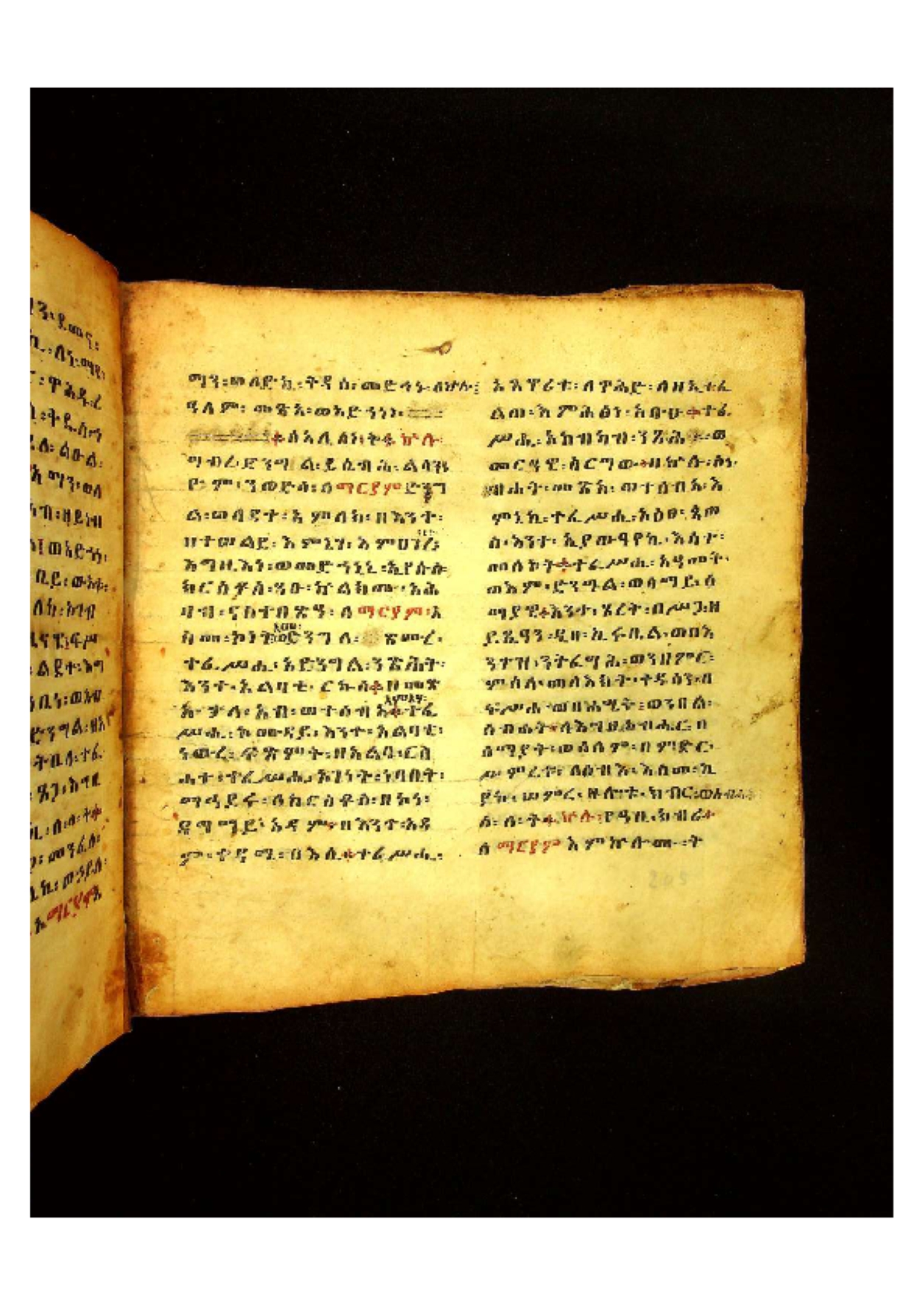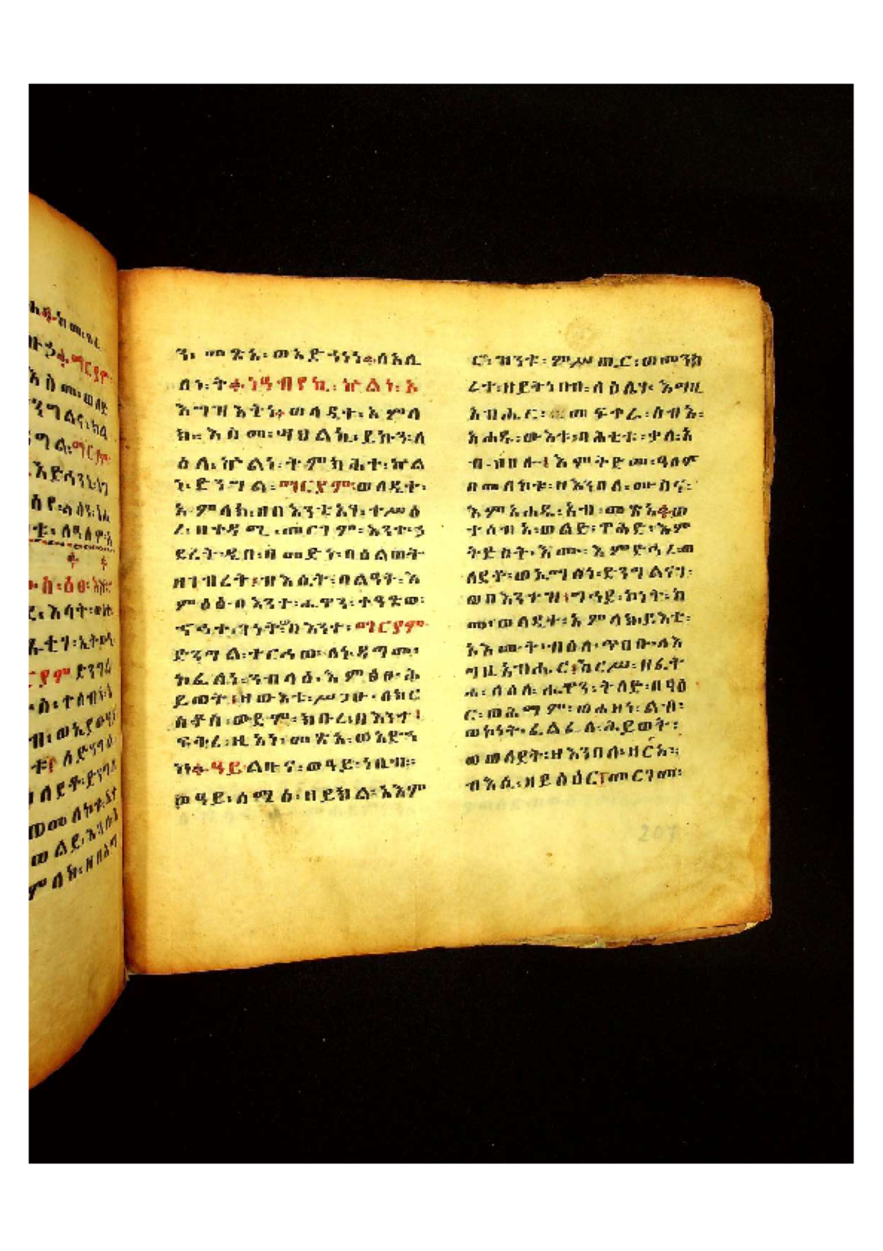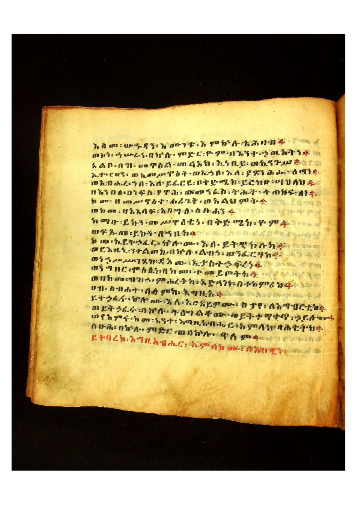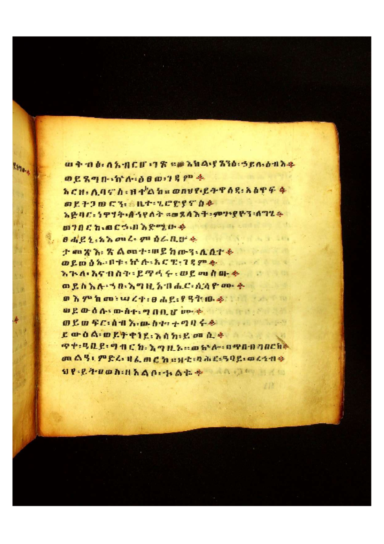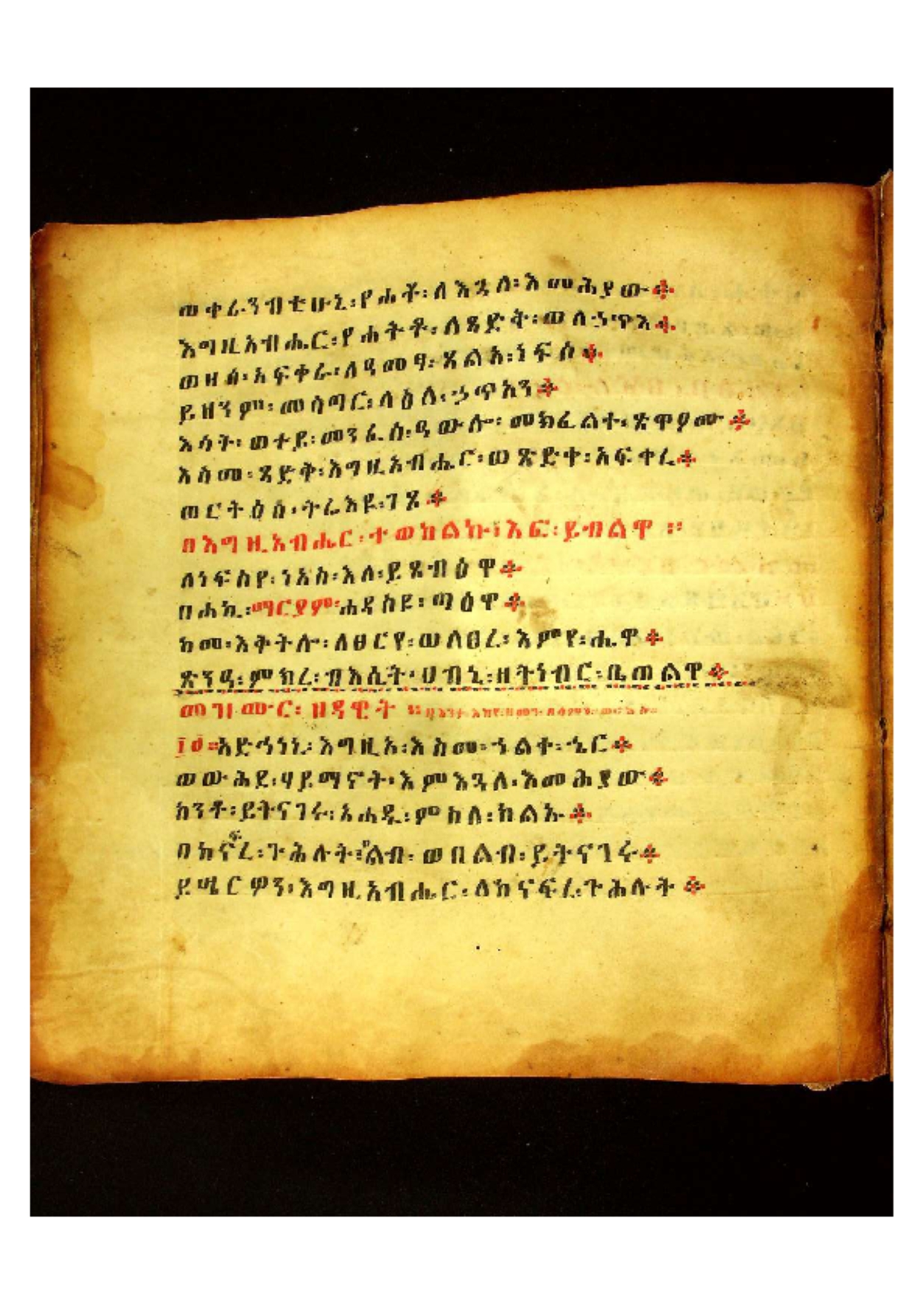 1. F. 2r: donation note written vertically in the outer margin, in black ink: “alla famiglia Bruschettini, Pussy […] Battaglia dell’Amba Aradam il 16 febbraio 1936 XIV”. The note, written in Italian and partly illegible, indicates the Bruschettini family as the receiver of the book and mentions the Battle of Amba Aradam, which took place on 16 February 1936. 2. F. 5r: note written in Italian in the outer upper margin, in red pencil: “Amba Aradam 16/2/XIV ore 17.30 P. Paloboni (?)”. This note also mentions the Battle of Amba Aradam, together with an individual whose name is partially unclear (P. Paloboni?). 3. F. 173v: supplication note written in small script in a mediocre hand, at the end of the “Psalms of David”: ዕቀበኒ፡ እምዓይነ፡ ደዌ፡ ወሞት፡ ለገብርከ፡ ደቅስዮስ፡, “protect me, your servant Däqsəyos, from the eye of infirmity and death”. The note mentions a certain Däqsəyos, indicated as “your servant” (possibly a later owner of the codex). 4. F. 173v: incipit of the Gəʿəz and Amharic prayer, perhaps a writing exercise. The note is written in an inaccurate calligraphy on the outer margin of the folio, next to the prayer. The entire text is የህፂ፡ ኖኅን፡ ከማየ[፡] አይኅ። እስራኤልን፡ ከፈርዖን፡ ዳዊትን፡ ከሳኦል፡ ከኢሎፍሊ። ኤ. 5. F. 190v: donation note, written in black ink in a mediocre hand. Text: ዝመጽሐፍ፡ ዘደብተራ፡ ኪሮስ፡ ዘወሀቦ፡ ለታቦተ፡ ሚካኤል፡ ኢትርስዑኒ፡ በአቡነ፡ ዘበሰማያት፡ ዘአቡየ፡ ገብረ፡ ማርያም፡ ወለእምየ፡ ወለተ፡ ሩፋኤል፡, “This book belongs to däbtära Kiros, who donated it to the tabot of [the church of St] Michael. Do not forget me for our Father who is in heaven. [It also belongs] to my father Gäbrä Maryam and my mother Wälättä Rufaʾel”. 6. F. 199v: writings executed in an inaccurate hand, perhaps the same of note 4. The note includes pen trials (ፈቲነ፡ ብርዕ፡ ዘፈረና፡ etc.), reproduces the explicit of the “Song of the songs” (ስብሐታተኪ፡ ማርያም፡ ከመ፡ እንተ፡ ሕልቀት፡ etc.) and the incipit of the “Praise of Mary” (ውዳሴ፡ ዘሰኑይ፡ ፈቀደ፡ እግዚእ፡ etc., partly rubricated). The writings also mention Däqsəyos, indicated as “your servant” (possibly a later owner of the codex) 7. F. 220ra–va: Genealogic note written on two columns. The note illustrates the family tree of King Yoḥannǝs I, who reigned from 1667 to 1682. The text is acephalous. Incipit: [ወለ]ደ፡ እምሐና፡ ብእሲቱ፡ አሦተ፡ ቅዱሳንሃ፡ ወአሦተ፡ ቅዱሳንኒ፡ እምነ፡ ጳውሊ፡ ብእሲሃ፡ ወለደቶሙ፡ ለአቤተኁን፡ ማእምሮ፡ ወለዘሥላሴ፡ ወአቤተኁን፡ ማእምሮኒ፡ ወለደ፡ አቃርዮስ፡ ወአቃርዮስኒ፡ ወለደ፡ እመቤት፡ እኅተ፡ ክርስቶስሃ፡. The text is published and translated in Proverbio D.V., 2000, ‘Inventario sommario dei manoscritti arabi, ebraici, etiopici – con notizia dei turchi – conservati presso la Biblioteca della Badia di Grottaferrata’. Atti della Accademia nazionale dei Lincei, Memorie, Classe di scienze morali, storiche e filologiche, serie IX, 12 (2000), 468–570 (here pp. 496–97, Appendice III). 8. F. 220va–b: Protective prayer against snakes, written on two columns. Incipit: በስመ፡ አብ፡ … ጸሎት፡ በእንተ፡ ዓርዌ፡ ምድር። ሶበ፡ በጽሐ፡ መልእክት፡ ሐሰውከ፡ በል፡ ፫ጊዜ፡ አኂዘከ፡ ዘፈረ፡ ልብሰ፡ ለእመ፡ ሀሎ፡ ርሑቀ፡ አስትዮ፡. The prayer is probably written in the same hand of note 7. 9. F. 220vb: Unidentified magic prayer containing asmat-names. Incipit: በስመ፡ አብ፡ … ኦላዘላህም፡ አህጉረ፡ ቀዳ[.]፡ ፍሖም፡ ሊስ፡ አፍሊስ፡ ምልክዮስ፡ ዘ[..]ማኤል፡ በዝንቱ፡ አስማቲከ፡ [.]ጽ[..] ኃይለ፡ በረድ፡ ወነፋስ፡ ከማሁ፡. |
