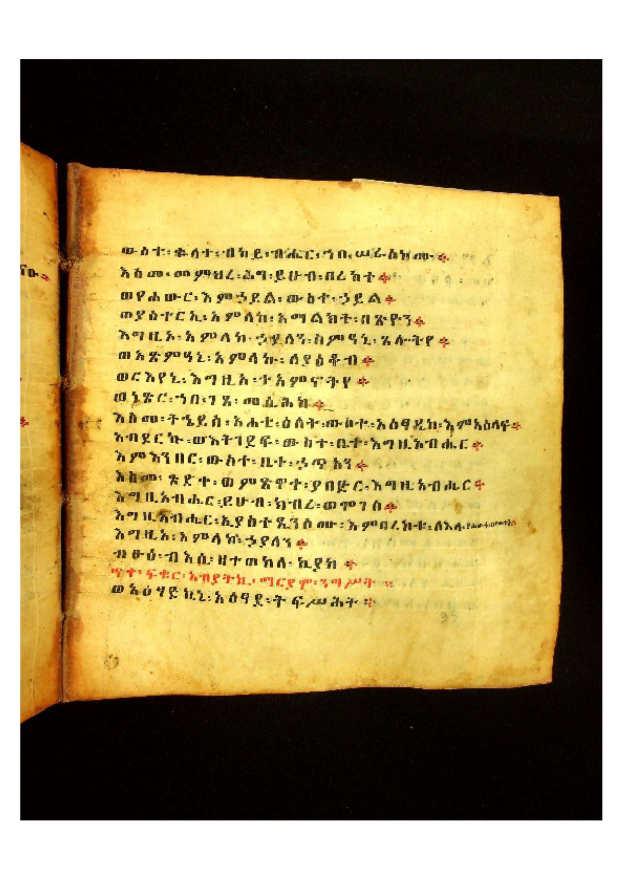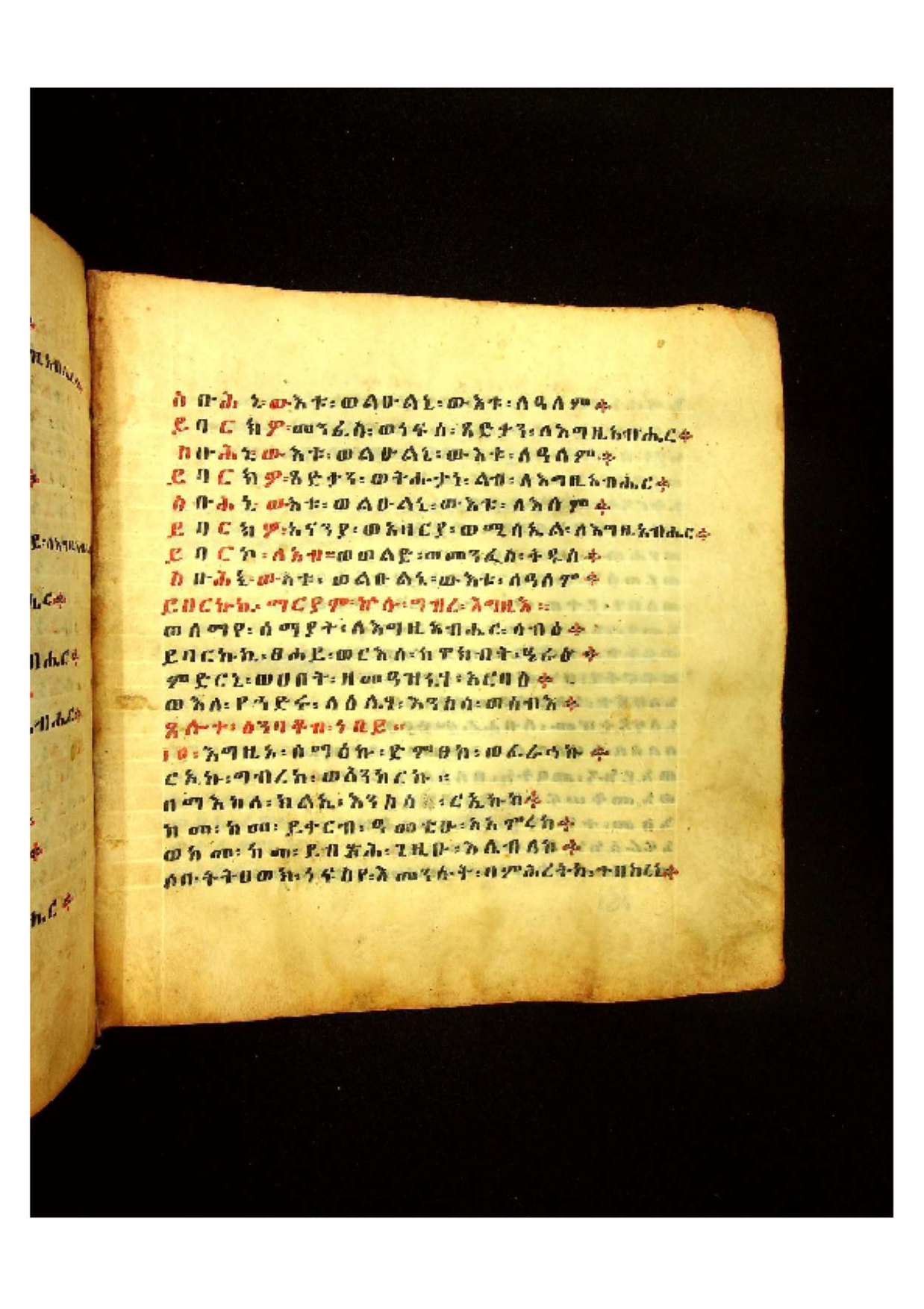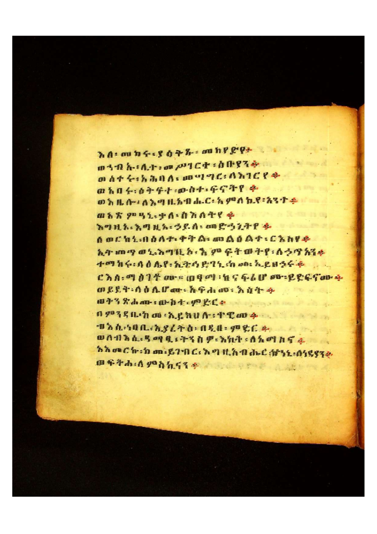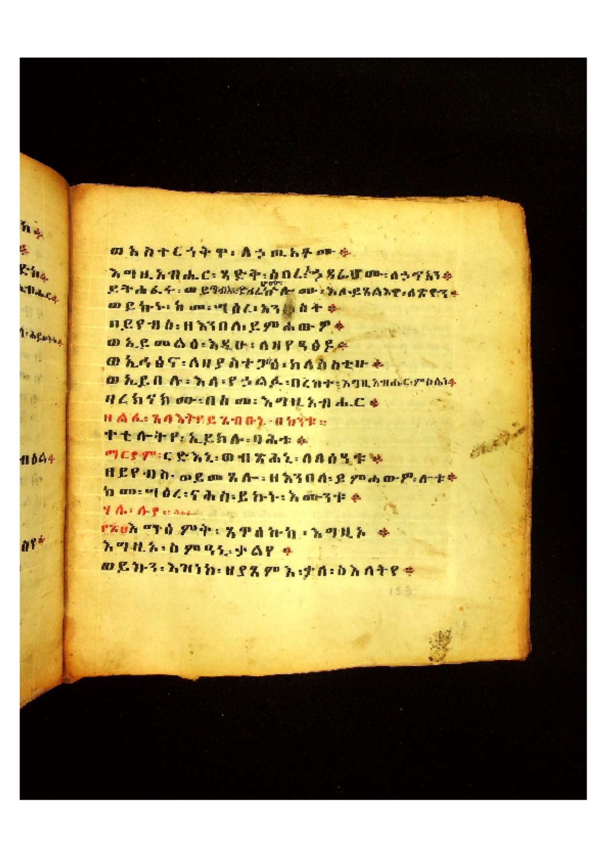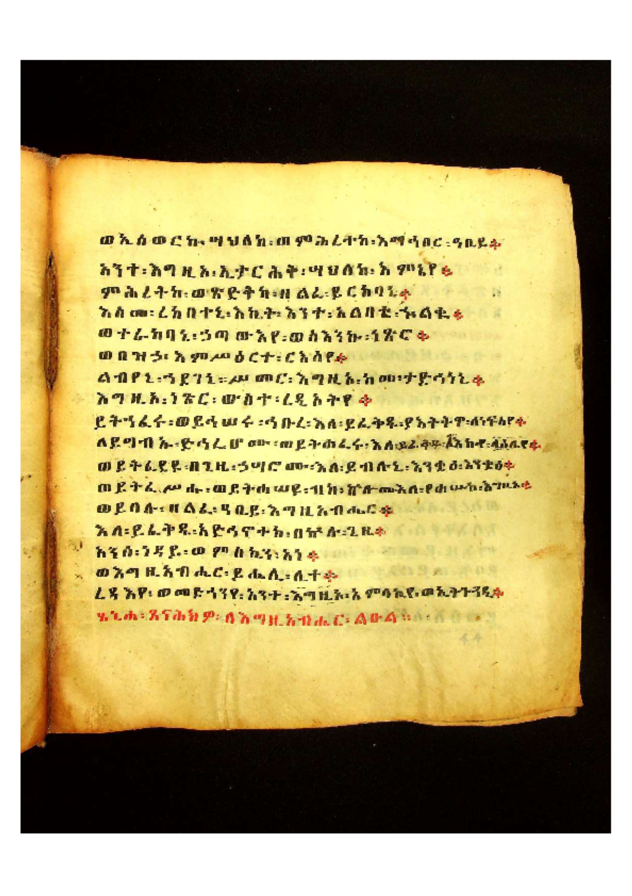1. F. 2r: donation note written vertically in the outer margin, in black ink: “alla famiglia Bruschettini, Pussy […] Battaglia dell’Amba Aradam il 16 febbraio 1936 XIV”. The note, written in Italian and partly illegible, indicates the Bruschettini family as the receiver of the book and mentions the Battle of Amba Aradam, which took place on 16 February 1936. 2. F. 5r: note written in Italian in the outer upper margin, in red pencil: “Amba Aradam 16/2/XIV ore 17.30 P. Paloboni (?)”. This note also mentions the Battle of Amba Aradam, together with an individual whose name is partially unclear (P. Paloboni?). 3. F. 173v: supplication note written in small script in a mediocre hand, at the end of the “Psalms of David”: ዕቀበኒ፡ እምዓይነ፡ ደዌ፡ ወሞት፡ ለገብርከ፡ ደቅስዮስ፡, “protect me, your servant Däqsəyos, from the eye of infirmity and death”. The note mentions a certain Däqsəyos, indicated as “your servant” (possibly a later owner of the codex). 4. F. 173v: incipit of the Gəʿəz and Amharic prayer, perhaps a writing exercise. The note is written in an inaccurate calligraphy on the outer margin of the folio, next to the prayer. The entire text is የህፂ፡ ኖኅን፡ ከማየ[፡] አይኅ። እስራኤልን፡ ከፈርዖን፡ ዳዊትን፡ ከሳኦል፡ ከኢሎፍሊ። ኤ. 5. F. 190v: donation note, written in black ink in a mediocre hand. Text: ዝመጽሐፍ፡ ዘደብተራ፡ ኪሮስ፡ ዘወሀቦ፡ ለታቦተ፡ ሚካኤል፡ ኢትርስዑኒ፡ በአቡነ፡ ዘበሰማያት፡ ዘአቡየ፡ ገብረ፡ ማርያም፡ ወለእምየ፡ ወለተ፡ ሩፋኤል፡, “This book belongs to däbtära Kiros, who donated it to the tabot of [the church of St] Michael. Do not forget me for our Father who is in heaven. [It also belongs] to my father Gäbrä Maryam and my mother Wälättä Rufaʾel”. 6. F. 199v: writings executed in an inaccurate hand, perhaps the same of note 4. The note includes pen trials (ፈቲነ፡ ብርዕ፡ ዘፈረና፡ etc.), reproduces the explicit of the “Song of the songs” (ስብሐታተኪ፡ ማርያም፡ ከመ፡ እንተ፡ ሕልቀት፡ etc.) and the incipit of the “Praise of Mary” (ውዳሴ፡ ዘሰኑይ፡ ፈቀደ፡ እግዚእ፡ etc., partly rubricated). The writings also mention Däqsəyos, indicated as “your servant” (possibly a later owner of the codex) 7. F. 220ra–va: Genealogic note written on two columns. The note illustrates the family tree of King Yoḥannǝs I, who reigned from 1667 to 1682. The text is acephalous. Incipit: [ወለ]ደ፡ እምሐና፡ ብእሲቱ፡ አሦተ፡ ቅዱሳንሃ፡ ወአሦተ፡ ቅዱሳንኒ፡ እምነ፡ ጳውሊ፡ ብእሲሃ፡ ወለደቶሙ፡ ለአቤተኁን፡ ማእምሮ፡ ወለዘሥላሴ፡ ወአቤተኁን፡ ማእምሮኒ፡ ወለደ፡ አቃርዮስ፡ ወአቃርዮስኒ፡ ወለደ፡ እመቤት፡ እኅተ፡ ክርስቶስሃ፡. The text is published and translated in Proverbio D.V., 2000, ‘Inventario sommario dei manoscritti arabi, ebraici, etiopici – con notizia dei turchi – conservati presso la Biblioteca della Badia di Grottaferrata’. Atti della Accademia nazionale dei Lincei, Memorie, Classe di scienze morali, storiche e filologiche, serie IX, 12 (2000), 468–570 (here pp. 496–97, Appendice III). 8. F. 220va–b: Protective prayer against snakes, written on two columns. Incipit: በስመ፡ አብ፡ … ጸሎት፡ በእንተ፡ ዓርዌ፡ ምድር። ሶበ፡ በጽሐ፡ መልእክት፡ ሐሰውከ፡ በል፡ ፫ጊዜ፡ አኂዘከ፡ ዘፈረ፡ ልብሰ፡ ለእመ፡ ሀሎ፡ ርሑቀ፡ አስትዮ፡. The prayer is probably written in the same hand of note 7. 9. F. 220vb: Unidentified magic prayer containing asmat-names. Incipit: በስመ፡ አብ፡ … ኦላዘላህም፡ አህጉረ፡ ቀዳ[.]፡ ፍሖም፡ ሊስ፡ አፍሊስ፡ ምልክዮስ፡ ዘ[..]ማኤል፡ በዝንቱ፡ አስማቲከ፡ [.]ጽ[..] ኃይለ፡ በረድ፡ ወነፋስ፡ ከማሁ፡. |