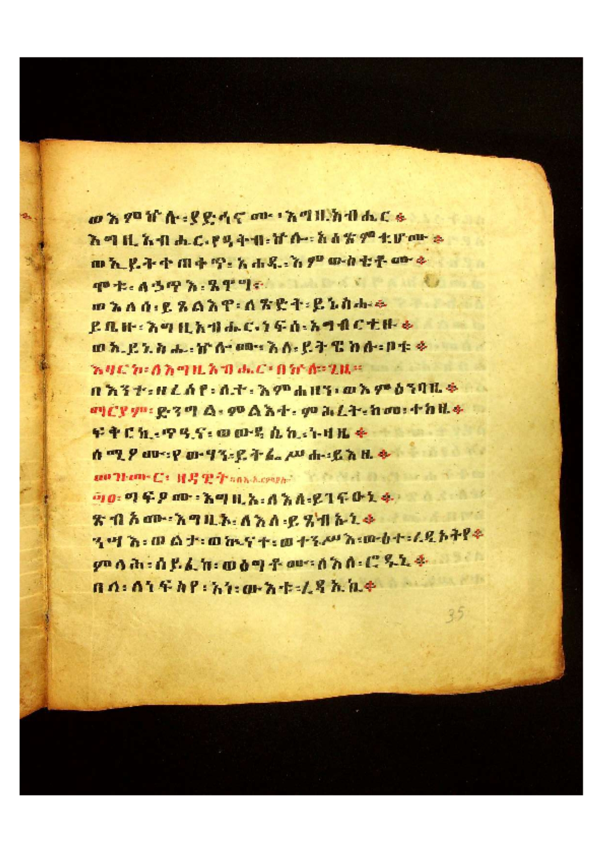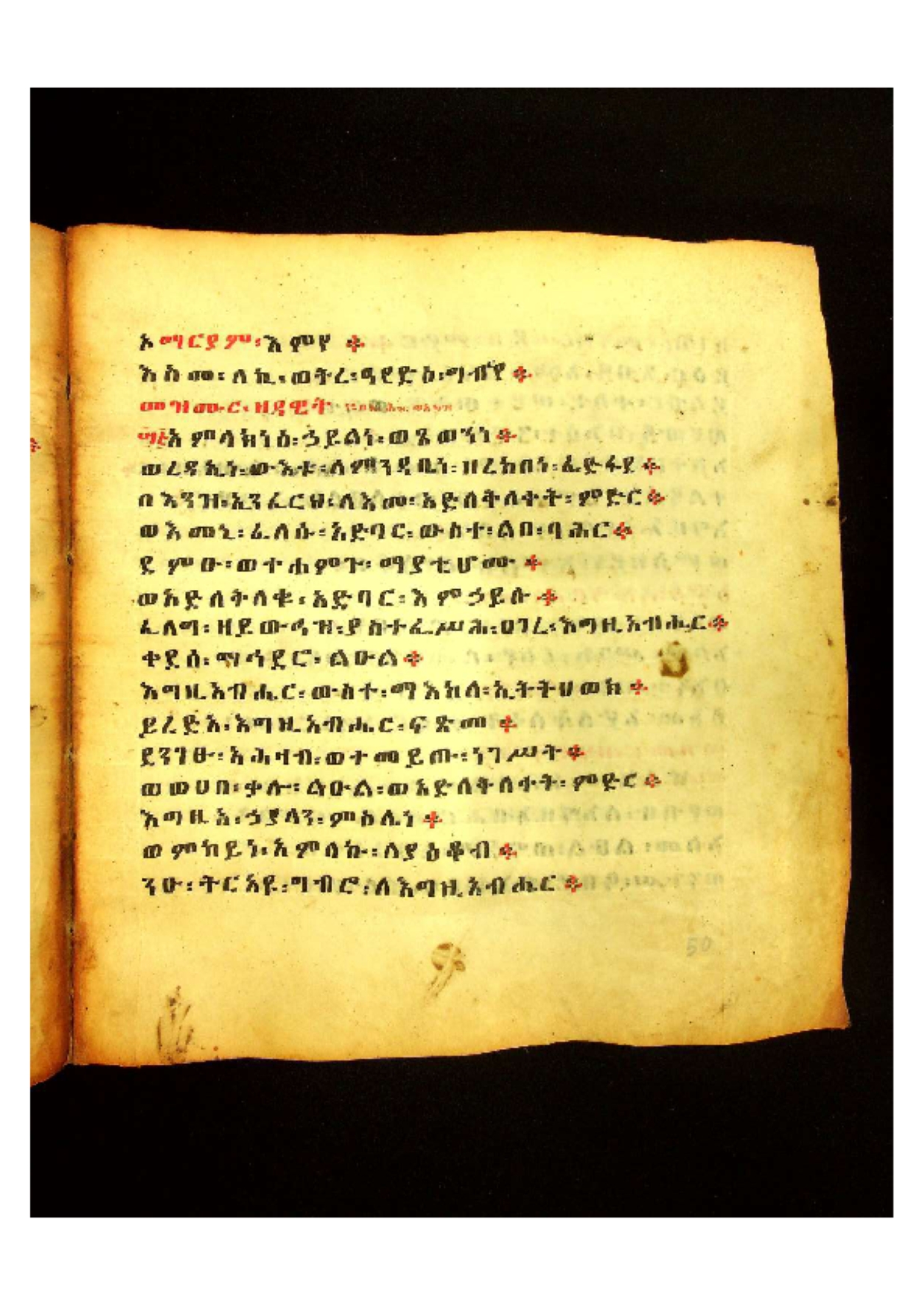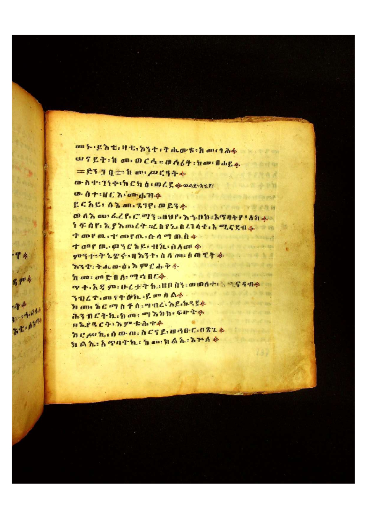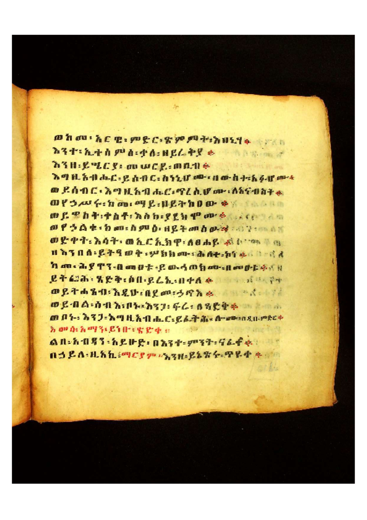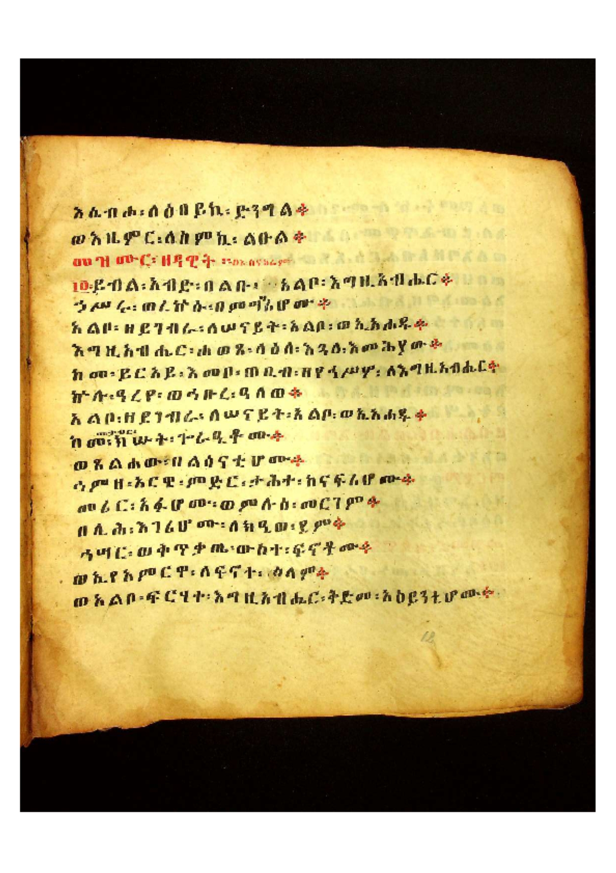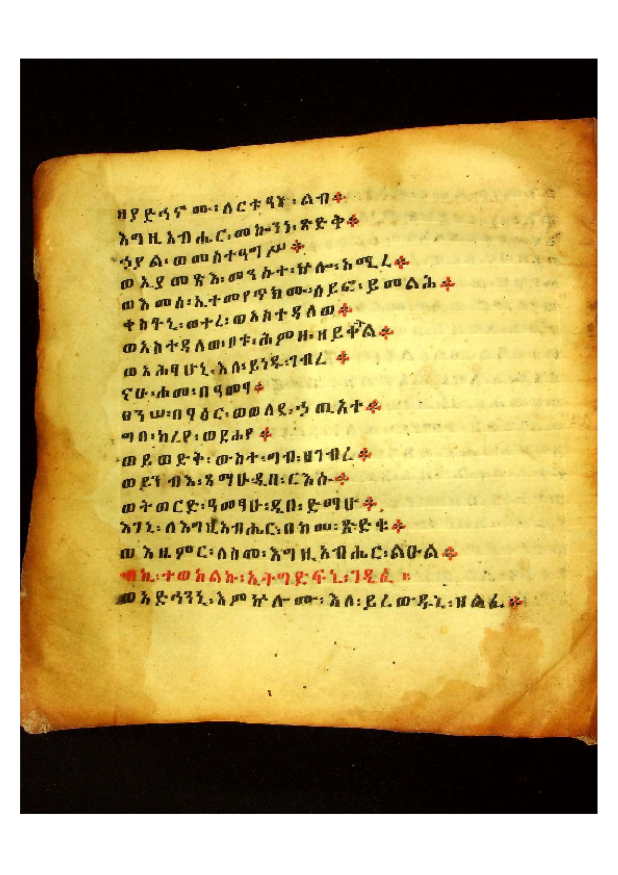 1. F. 2r: donation note written vertically in the outer margin, in black ink: “alla famiglia Bruschettini, Pussy […] Battaglia dell’Amba Aradam il 16 febbraio 1936 XIV”. The note, written in Italian and partly illegible, indicates the Bruschettini family as the receiver of the book and mentions the Battle of Amba Aradam, which took place on 16 February 1936. 2. F. 5r: note written in Italian in the outer upper margin, in red pencil: “Amba Aradam 16/2/XIV ore 17.30 P. Paloboni (?)”. This note also mentions the Battle of Amba Aradam, together with an individual whose name is partially unclear (P. Paloboni?). 3. F. 173v: supplication note written in small script in a mediocre hand, at the end of the “Psalms of David”: ዕቀበኒ፡ እምዓይነ፡ ደዌ፡ ወሞት፡ ለገብርከ፡ ደቅስዮስ፡, “protect me, your servant Däqsəyos, from the eye of infirmity and death”. The note mentions a certain Däqsəyos, indicated as “your servant” (possibly a later owner of the codex). 4. F. 173v: incipit of the Gəʿəz and Amharic prayer, perhaps a writing exercise. The note is written in an inaccurate calligraphy on the outer margin of the folio, next to the prayer. The entire text is የህፂ፡ ኖኅን፡ ከማየ[፡] አይኅ። እስራኤልን፡ ከፈርዖን፡ ዳዊትን፡ ከሳኦል፡ ከኢሎፍሊ። ኤ. 5. F. 190v: donation note, written in black ink in a mediocre hand. Text: ዝመጽሐፍ፡ ዘደብተራ፡ ኪሮስ፡ ዘወሀቦ፡ ለታቦተ፡ ሚካኤል፡ ኢትርስዑኒ፡ በአቡነ፡ ዘበሰማያት፡ ዘአቡየ፡ ገብረ፡ ማርያም፡ ወለእምየ፡ ወለተ፡ ሩፋኤል፡, “This book belongs to däbtära Kiros, who donated it to the tabot of [the church of St] Michael. Do not forget me for our Father who is in heaven. [It also belongs] to my father Gäbrä Maryam and my mother Wälättä Rufaʾel”. 6. F. 199v: writings executed in an inaccurate hand, perhaps the same of note 4. The note includes pen trials (ፈቲነ፡ ብርዕ፡ ዘፈረና፡ etc.), reproduces the explicit of the “Song of the songs” (ስብሐታተኪ፡ ማርያም፡ ከመ፡ እንተ፡ ሕልቀት፡ etc.) and the incipit of the “Praise of Mary” (ውዳሴ፡ ዘሰኑይ፡ ፈቀደ፡ እግዚእ፡ etc., partly rubricated). The writings also mention Däqsəyos, indicated as “your servant” (possibly a later owner of the codex) 7. F. 220ra–va: Genealogic note written on two columns. The note illustrates the family tree of King Yoḥannǝs I, who reigned from 1667 to 1682. The text is acephalous. Incipit: [ወለ]ደ፡ እምሐና፡ ብእሲቱ፡ አሦተ፡ ቅዱሳንሃ፡ ወአሦተ፡ ቅዱሳንኒ፡ እምነ፡ ጳውሊ፡ ብእሲሃ፡ ወለደቶሙ፡ ለአቤተኁን፡ ማእምሮ፡ ወለዘሥላሴ፡ ወአቤተኁን፡ ማእምሮኒ፡ ወለደ፡ አቃርዮስ፡ ወአቃርዮስኒ፡ ወለደ፡ እመቤት፡ እኅተ፡ ክርስቶስሃ፡. The text is published and translated in Proverbio D.V., 2000, ‘Inventario sommario dei manoscritti arabi, ebraici, etiopici – con notizia dei turchi – conservati presso la Biblioteca della Badia di Grottaferrata’. Atti della Accademia nazionale dei Lincei, Memorie, Classe di scienze morali, storiche e filologiche, serie IX, 12 (2000), 468–570 (here pp. 496–97, Appendice III). 8. F. 220va–b: Protective prayer against snakes, written on two columns. Incipit: በስመ፡ አብ፡ … ጸሎት፡ በእንተ፡ ዓርዌ፡ ምድር። ሶበ፡ በጽሐ፡ መልእክት፡ ሐሰውከ፡ በል፡ ፫ጊዜ፡ አኂዘከ፡ ዘፈረ፡ ልብሰ፡ ለእመ፡ ሀሎ፡ ርሑቀ፡ አስትዮ፡. The prayer is probably written in the same hand of note 7. 9. F. 220vb: Unidentified magic prayer containing asmat-names. Incipit: በስመ፡ አብ፡ … ኦላዘላህም፡ አህጉረ፡ ቀዳ[.]፡ ፍሖም፡ ሊስ፡ አፍሊስ፡ ምልክዮስ፡ ዘ[..]ማኤል፡ በዝንቱ፡ አስማቲከ፡ [.]ጽ[..] ኃይለ፡ በረድ፡ ወነፋስ፡ ከማሁ፡. |