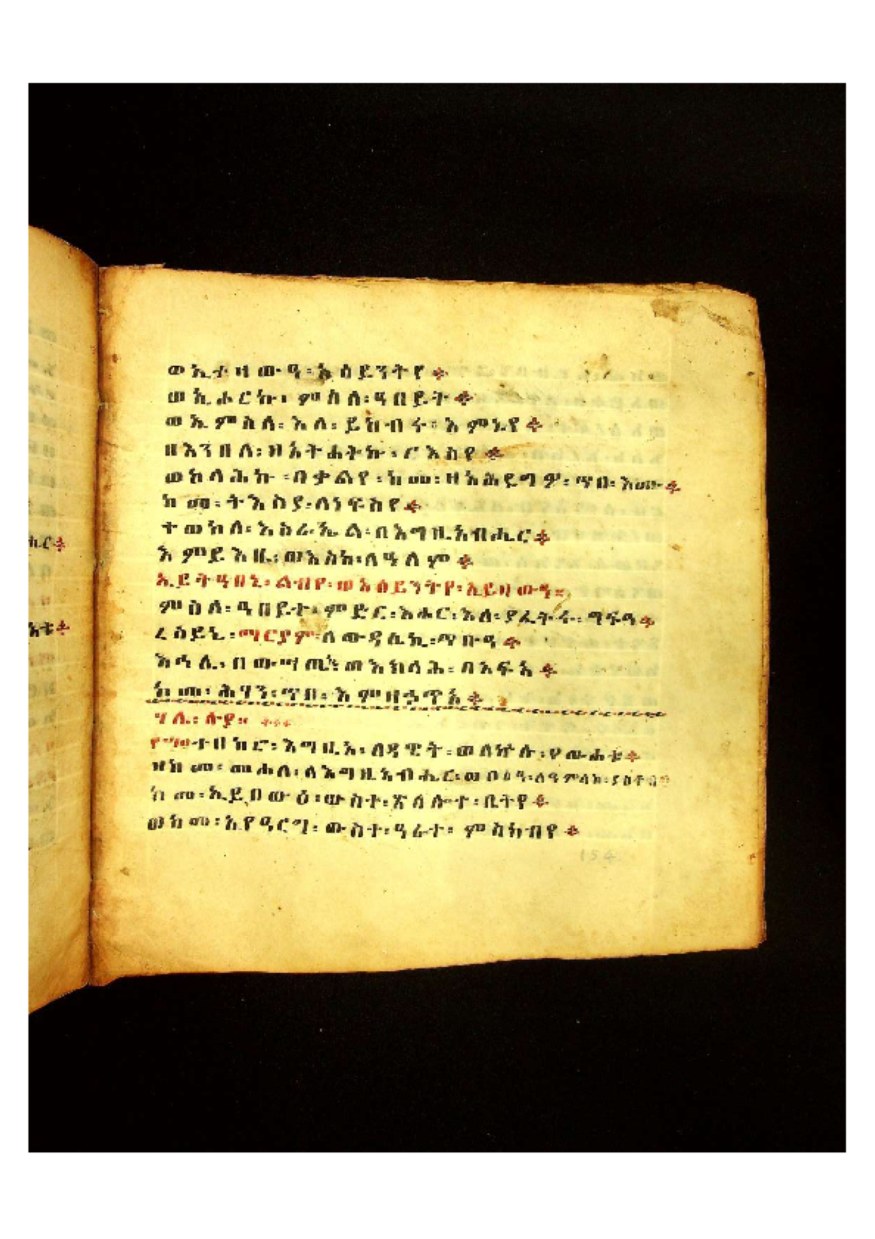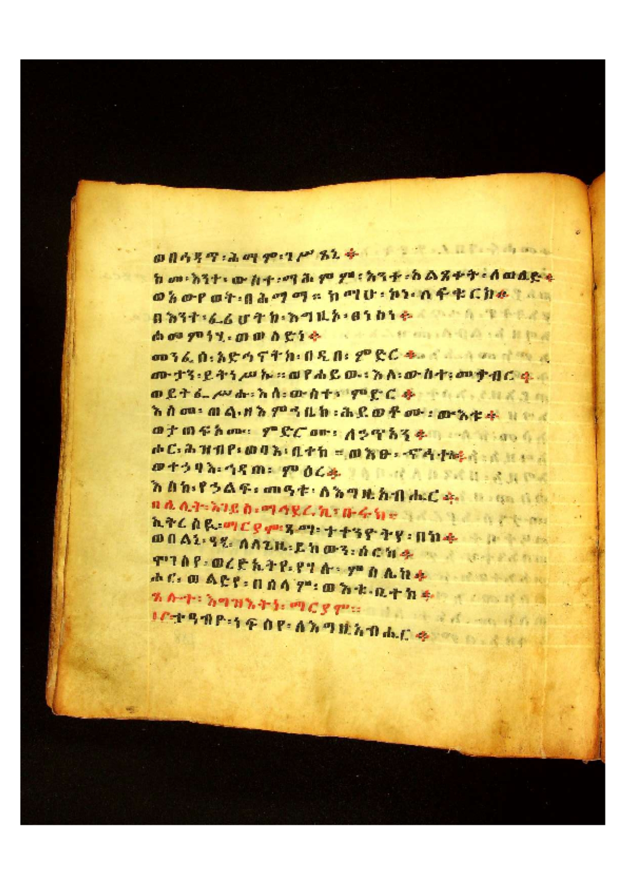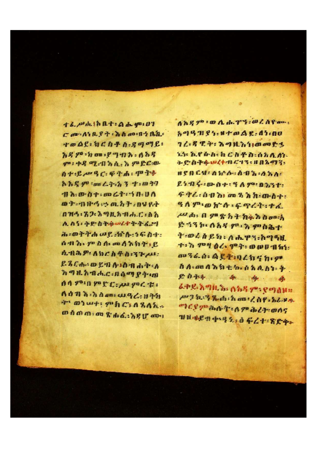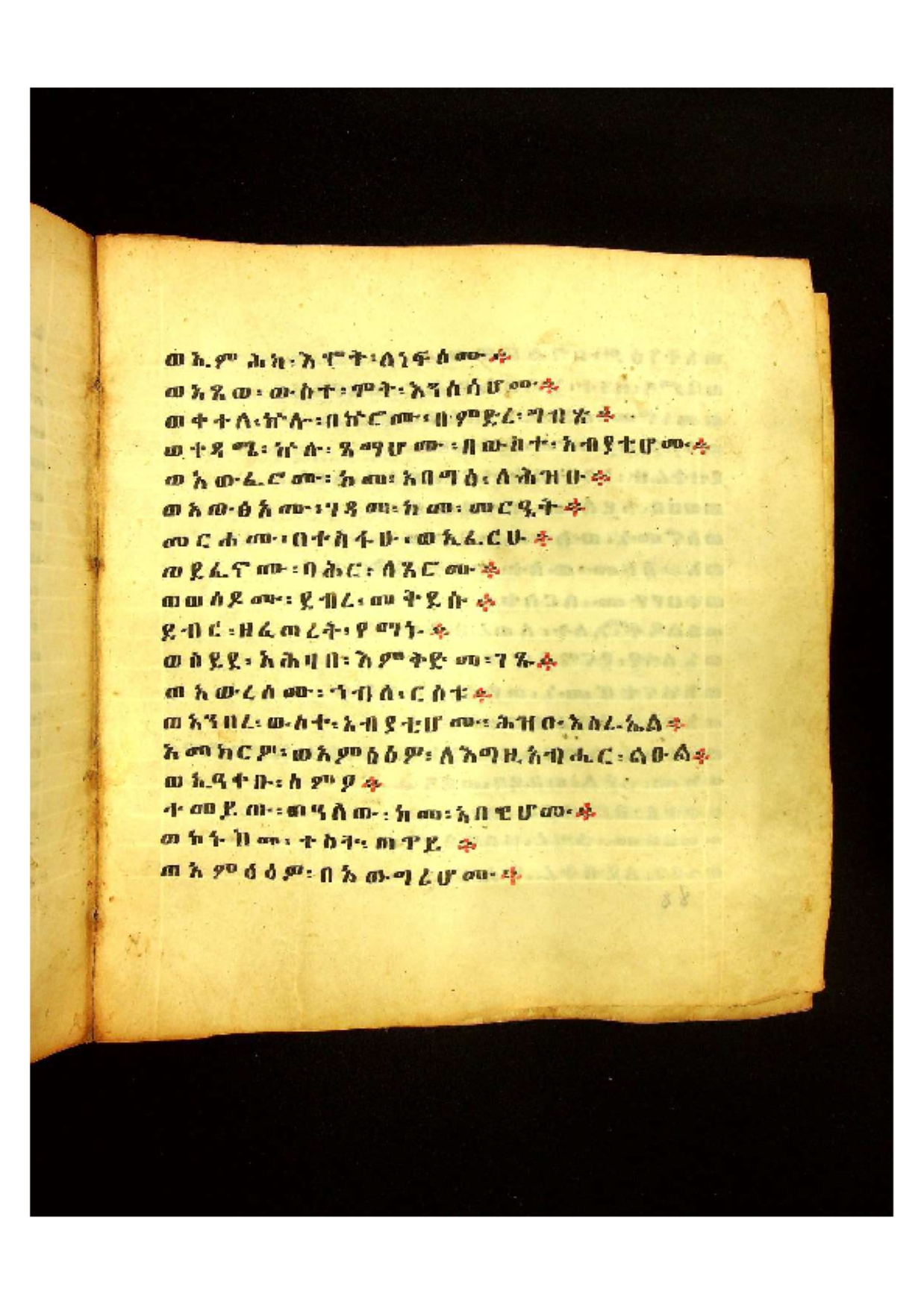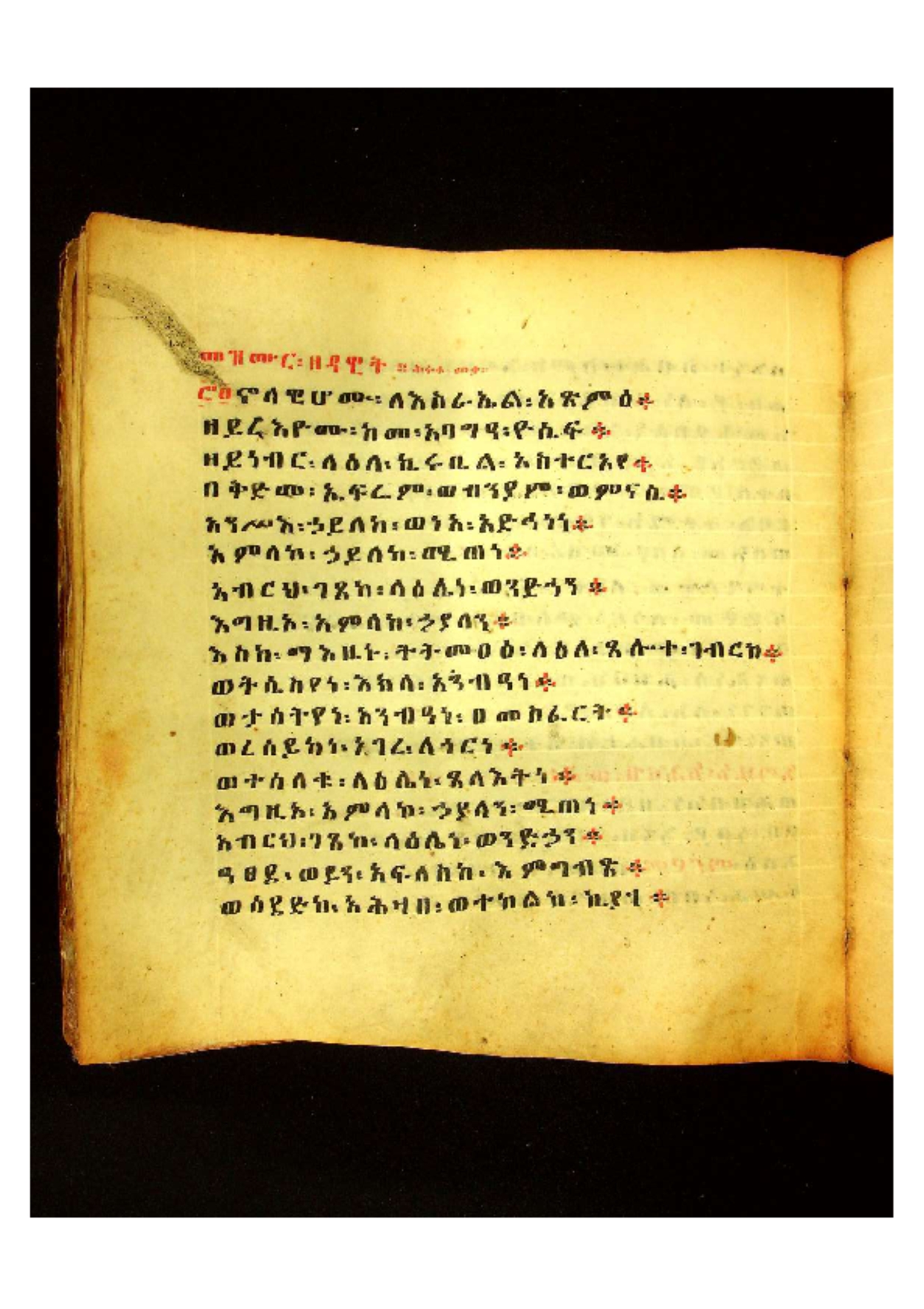 1. F. 2r: donation note written vertically in the outer margin, in black ink: “alla famiglia Bruschettini, Pussy […] Battaglia dell’Amba Aradam il 16 febbraio 1936 XIV”. The note, written in Italian and partly illegible, indicates the Bruschettini family as the receiver of the book and mentions the Battle of Amba Aradam, which took place on 16 February 1936. 2. F. 5r: note written in Italian in the outer upper margin, in red pencil: “Amba Aradam 16/2/XIV ore 17.30 P. Paloboni (?)”. This note also mentions the Battle of Amba Aradam, together with an individual whose name is partially unclear (P. Paloboni?). 3. F. 173v: supplication note written in small script in a mediocre hand, at the end of the “Psalms of David”: ዕቀበኒ፡ እምዓይነ፡ ደዌ፡ ወሞት፡ ለገብርከ፡ ደቅስዮስ፡, “protect me, your servant Däqsəyos, from the eye of infirmity and death”. The note mentions a certain Däqsəyos, indicated as “your servant” (possibly a later owner of the codex). 4. F. 173v: incipit of the Gəʿəz and Amharic prayer, perhaps a writing exercise. The note is written in an inaccurate calligraphy on the outer margin of the folio, next to the prayer. The entire text is የህፂ፡ ኖኅን፡ ከማየ[፡] አይኅ። እስራኤልን፡ ከፈርዖን፡ ዳዊትን፡ ከሳኦል፡ ከኢሎፍሊ። ኤ. 5. F. 190v: donation note, written in black ink in a mediocre hand. Text: ዝመጽሐፍ፡ ዘደብተራ፡ ኪሮስ፡ ዘወሀቦ፡ ለታቦተ፡ ሚካኤል፡ ኢትርስዑኒ፡ በአቡነ፡ ዘበሰማያት፡ ዘአቡየ፡ ገብረ፡ ማርያም፡ ወለእምየ፡ ወለተ፡ ሩፋኤል፡, “This book belongs to däbtära Kiros, who donated it to the tabot of [the church of St] Michael. Do not forget me for our Father who is in heaven. [It also belongs] to my father Gäbrä Maryam and my mother Wälättä Rufaʾel”. 6. F. 199v: writings executed in an inaccurate hand, perhaps the same of note 4. The note includes pen trials (ፈቲነ፡ ብርዕ፡ ዘፈረና፡ etc.), reproduces the explicit of the “Song of the songs” (ስብሐታተኪ፡ ማርያም፡ ከመ፡ እንተ፡ ሕልቀት፡ etc.) and the incipit of the “Praise of Mary” (ውዳሴ፡ ዘሰኑይ፡ ፈቀደ፡ እግዚእ፡ etc., partly rubricated). The writings also mention Däqsəyos, indicated as “your servant” (possibly a later owner of the codex) 7. F. 220ra–va: Genealogic note written on two columns. The note illustrates the family tree of King Yoḥannǝs I, who reigned from 1667 to 1682. The text is acephalous. Incipit: [ወለ]ደ፡ እምሐና፡ ብእሲቱ፡ አሦተ፡ ቅዱሳንሃ፡ ወአሦተ፡ ቅዱሳንኒ፡ እምነ፡ ጳውሊ፡ ብእሲሃ፡ ወለደቶሙ፡ ለአቤተኁን፡ ማእምሮ፡ ወለዘሥላሴ፡ ወአቤተኁን፡ ማእምሮኒ፡ ወለደ፡ አቃርዮስ፡ ወአቃርዮስኒ፡ ወለደ፡ እመቤት፡ እኅተ፡ ክርስቶስሃ፡. The text is published and translated in Proverbio D.V., 2000, ‘Inventario sommario dei manoscritti arabi, ebraici, etiopici – con notizia dei turchi – conservati presso la Biblioteca della Badia di Grottaferrata’. Atti della Accademia nazionale dei Lincei, Memorie, Classe di scienze morali, storiche e filologiche, serie IX, 12 (2000), 468–570 (here pp. 496–97, Appendice III). 8. F. 220va–b: Protective prayer against snakes, written on two columns. Incipit: በስመ፡ አብ፡ … ጸሎት፡ በእንተ፡ ዓርዌ፡ ምድር። ሶበ፡ በጽሐ፡ መልእክት፡ ሐሰውከ፡ በል፡ ፫ጊዜ፡ አኂዘከ፡ ዘፈረ፡ ልብሰ፡ ለእመ፡ ሀሎ፡ ርሑቀ፡ አስትዮ፡. The prayer is probably written in the same hand of note 7. 9. F. 220vb: Unidentified magic prayer containing asmat-names. Incipit: በስመ፡ አብ፡ … ኦላዘላህም፡ አህጉረ፡ ቀዳ[.]፡ ፍሖም፡ ሊስ፡ አፍሊስ፡ ምልክዮስ፡ ዘ[..]ማኤል፡ በዝንቱ፡ አስማቲከ፡ [.]ጽ[..] ኃይለ፡ በረድ፡ ወነፋስ፡ ከማሁ፡. |