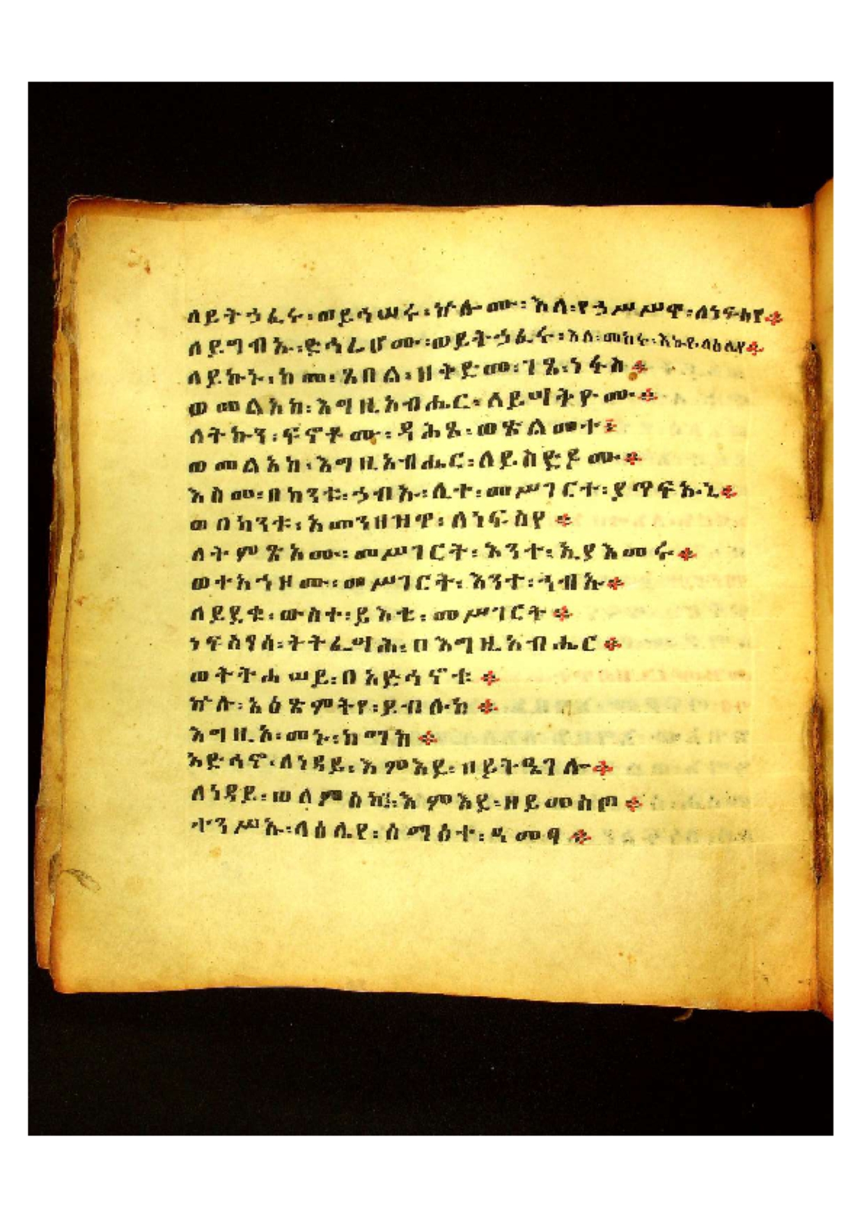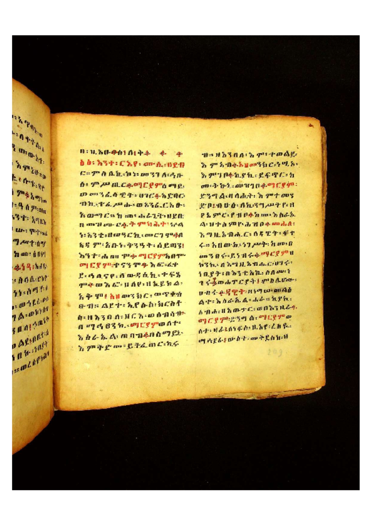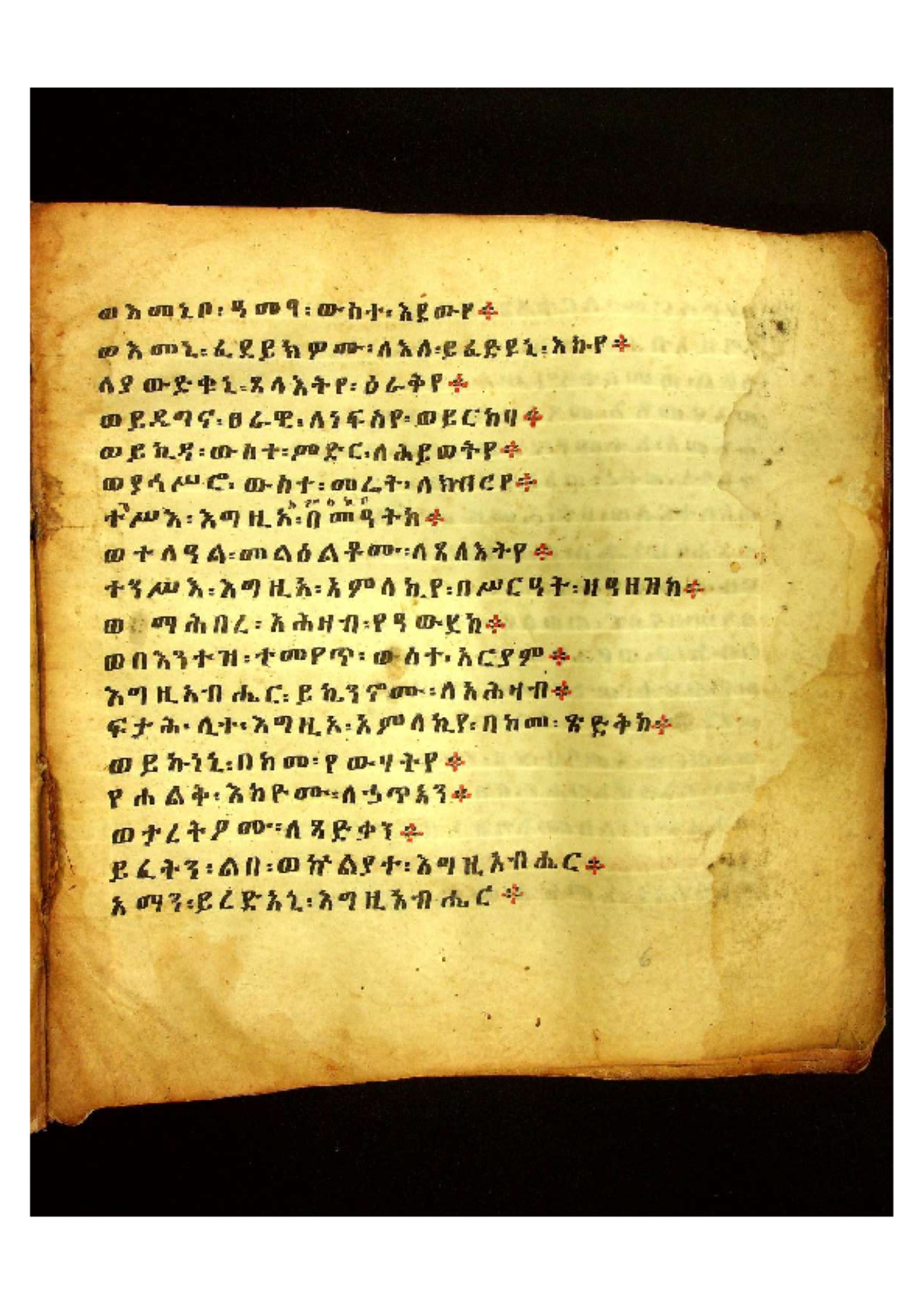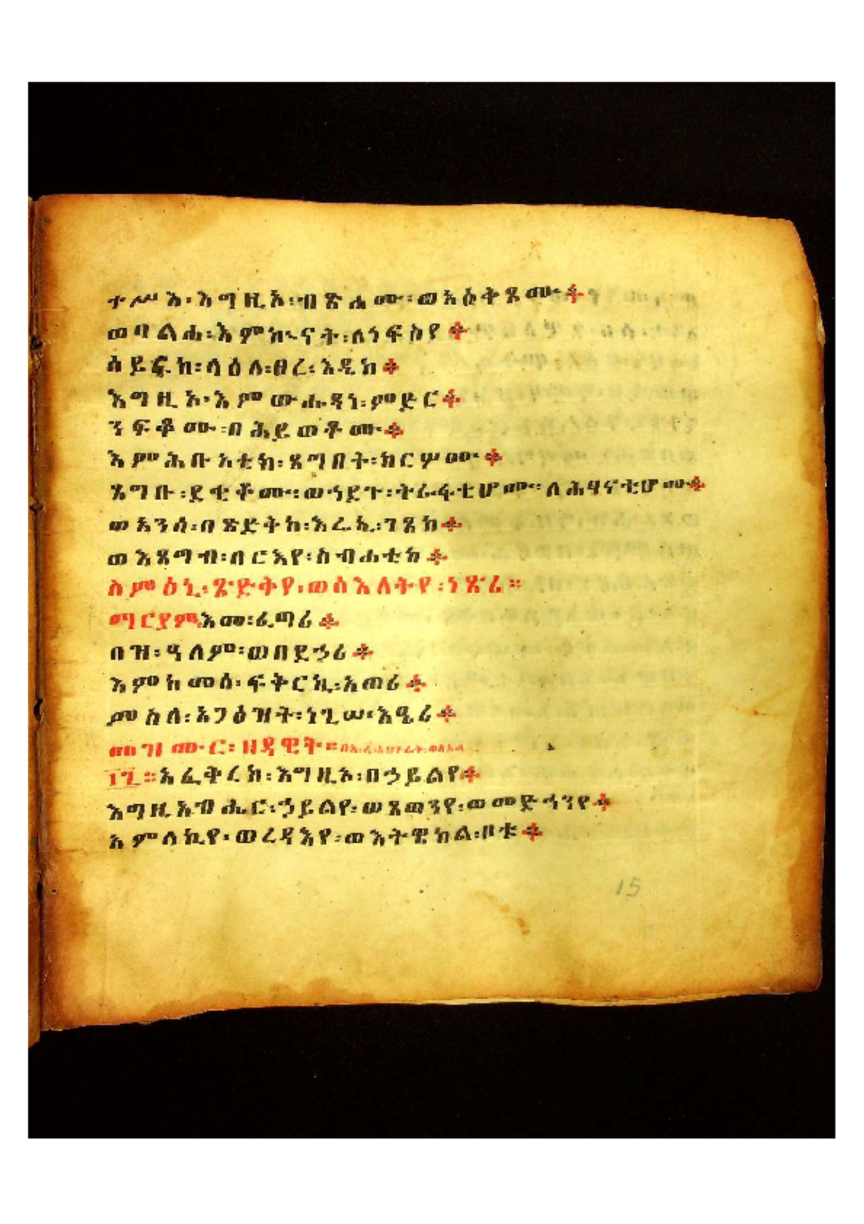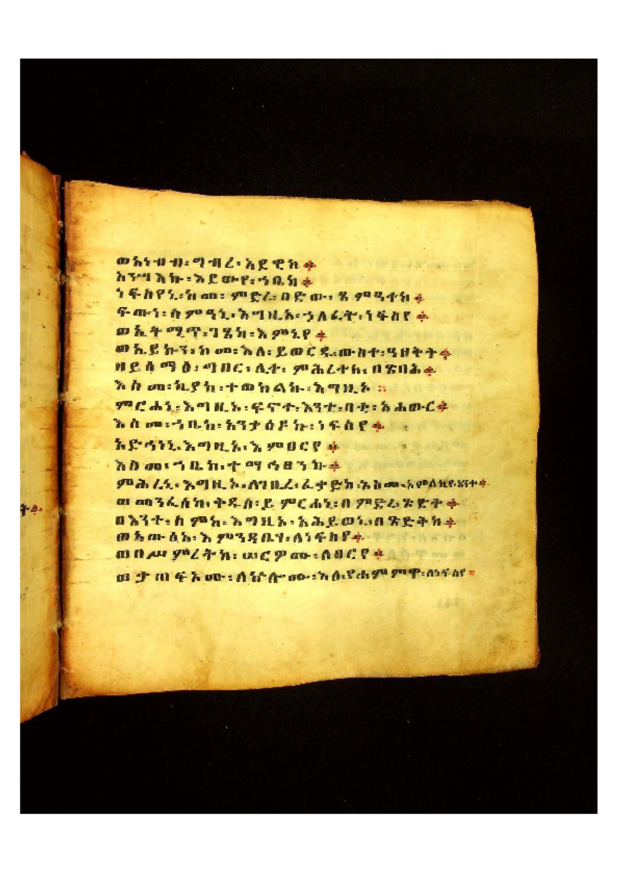 1. F. 2r: donation note written vertically in the outer margin, in black ink: “alla famiglia Bruschettini, Pussy […] Battaglia dell’Amba Aradam il 16 febbraio 1936 XIV”. The note, written in Italian and partly illegible, indicates the Bruschettini family as the receiver of the book and mentions the Battle of Amba Aradam, which took place on 16 February 1936. 2. F. 5r: note written in Italian in the outer upper margin, in red pencil: “Amba Aradam 16/2/XIV ore 17.30 P. Paloboni (?)”. This note also mentions the Battle of Amba Aradam, together with an individual whose name is partially unclear (P. Paloboni?). 3. F. 173v: supplication note written in small script in a mediocre hand, at the end of the “Psalms of David”: ዕቀበኒ፡ እምዓይነ፡ ደዌ፡ ወሞት፡ ለገብርከ፡ ደቅስዮስ፡, “protect me, your servant Däqsəyos, from the eye of infirmity and death”. The note mentions a certain Däqsəyos, indicated as “your servant” (possibly a later owner of the codex). 4. F. 173v: incipit of the Gəʿəz and Amharic prayer, perhaps a writing exercise. The note is written in an inaccurate calligraphy on the outer margin of the folio, next to the prayer. The entire text is የህፂ፡ ኖኅን፡ ከማየ[፡] አይኅ። እስራኤልን፡ ከፈርዖን፡ ዳዊትን፡ ከሳኦል፡ ከኢሎፍሊ። ኤ. 5. F. 190v: donation note, written in black ink in a mediocre hand. Text: ዝመጽሐፍ፡ ዘደብተራ፡ ኪሮስ፡ ዘወሀቦ፡ ለታቦተ፡ ሚካኤል፡ ኢትርስዑኒ፡ በአቡነ፡ ዘበሰማያት፡ ዘአቡየ፡ ገብረ፡ ማርያም፡ ወለእምየ፡ ወለተ፡ ሩፋኤል፡, “This book belongs to däbtära Kiros, who donated it to the tabot of [the church of St] Michael. Do not forget me for our Father who is in heaven. [It also belongs] to my father Gäbrä Maryam and my mother Wälättä Rufaʾel”. 6. F. 199v: writings executed in an inaccurate hand, perhaps the same of note 4. The note includes pen trials (ፈቲነ፡ ብርዕ፡ ዘፈረና፡ etc.), reproduces the explicit of the “Song of the songs” (ስብሐታተኪ፡ ማርያም፡ ከመ፡ እንተ፡ ሕልቀት፡ etc.) and the incipit of the “Praise of Mary” (ውዳሴ፡ ዘሰኑይ፡ ፈቀደ፡ እግዚእ፡ etc., partly rubricated). The writings also mention Däqsəyos, indicated as “your servant” (possibly a later owner of the codex) 7. F. 220ra–va: Genealogic note written on two columns. The note illustrates the family tree of King Yoḥannǝs I, who reigned from 1667 to 1682. The text is acephalous. Incipit: [ወለ]ደ፡ እምሐና፡ ብእሲቱ፡ አሦተ፡ ቅዱሳንሃ፡ ወአሦተ፡ ቅዱሳንኒ፡ እምነ፡ ጳውሊ፡ ብእሲሃ፡ ወለደቶሙ፡ ለአቤተኁን፡ ማእምሮ፡ ወለዘሥላሴ፡ ወአቤተኁን፡ ማእምሮኒ፡ ወለደ፡ አቃርዮስ፡ ወአቃርዮስኒ፡ ወለደ፡ እመቤት፡ እኅተ፡ ክርስቶስሃ፡. The text is published and translated in Proverbio D.V., 2000, ‘Inventario sommario dei manoscritti arabi, ebraici, etiopici – con notizia dei turchi – conservati presso la Biblioteca della Badia di Grottaferrata’. Atti della Accademia nazionale dei Lincei, Memorie, Classe di scienze morali, storiche e filologiche, serie IX, 12 (2000), 468–570 (here pp. 496–97, Appendice III). 8. F. 220va–b: Protective prayer against snakes, written on two columns. Incipit: በስመ፡ አብ፡ … ጸሎት፡ በእንተ፡ ዓርዌ፡ ምድር። ሶበ፡ በጽሐ፡ መልእክት፡ ሐሰውከ፡ በል፡ ፫ጊዜ፡ አኂዘከ፡ ዘፈረ፡ ልብሰ፡ ለእመ፡ ሀሎ፡ ርሑቀ፡ አስትዮ፡. The prayer is probably written in the same hand of note 7. 9. F. 220vb: Unidentified magic prayer containing asmat-names. Incipit: በስመ፡ አብ፡ … ኦላዘላህም፡ አህጉረ፡ ቀዳ[.]፡ ፍሖም፡ ሊስ፡ አፍሊስ፡ ምልክዮስ፡ ዘ[..]ማኤል፡ በዝንቱ፡ አስማቲከ፡ [.]ጽ[..] ኃይለ፡ በረድ፡ ወነፋስ፡ ከማሁ፡. |