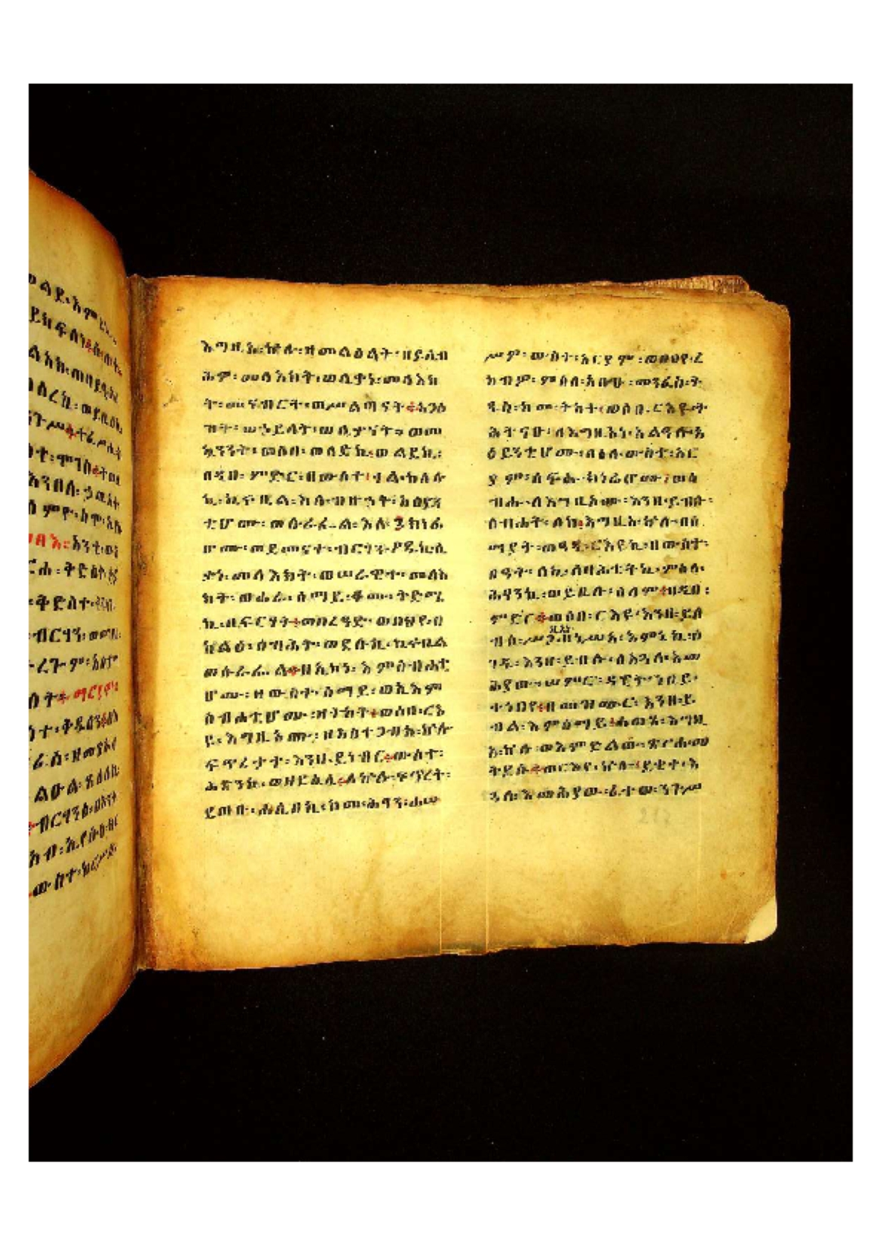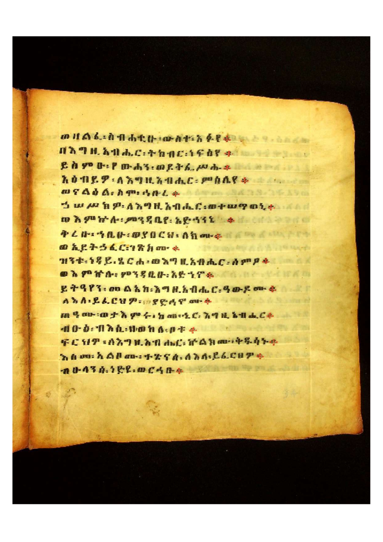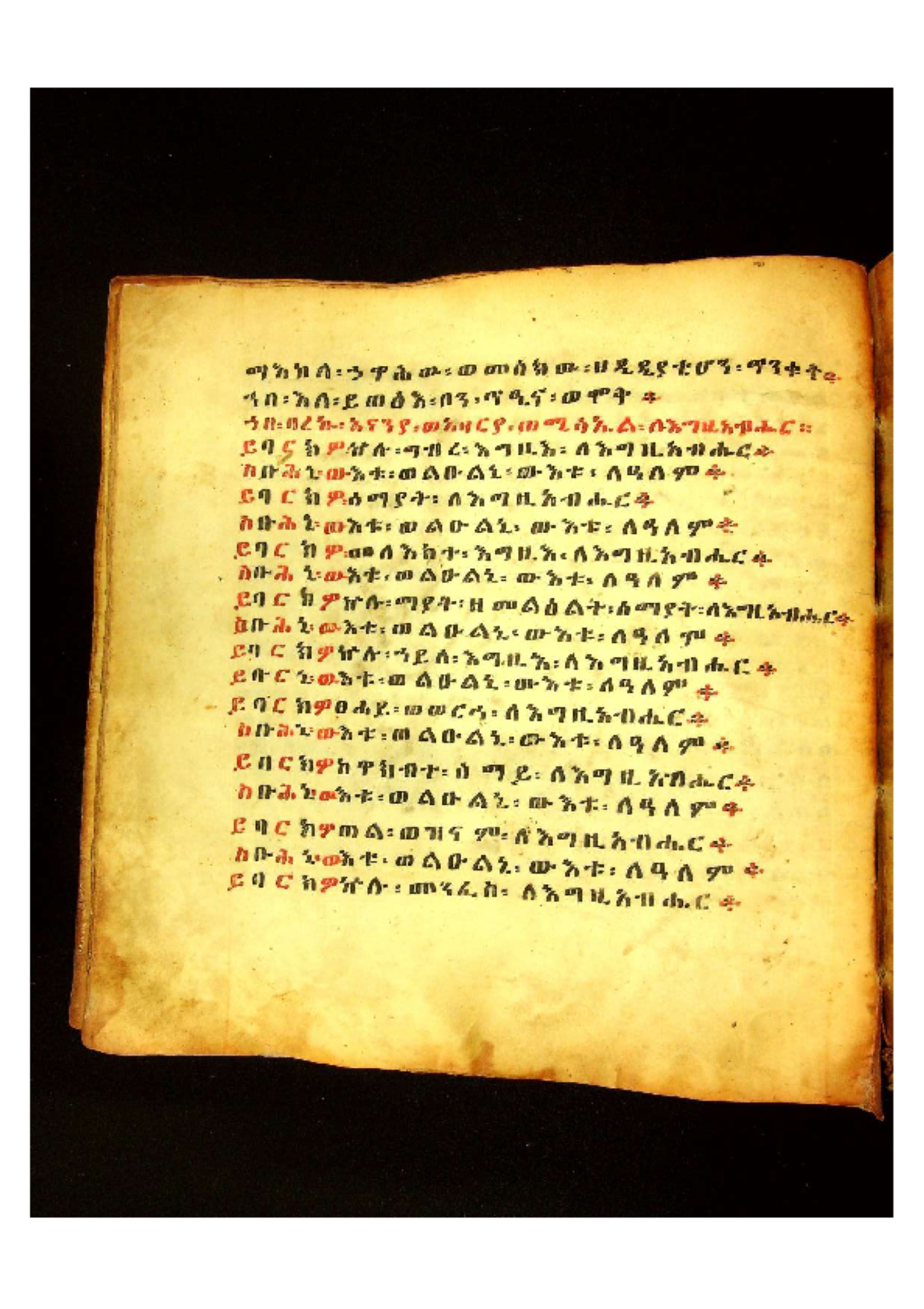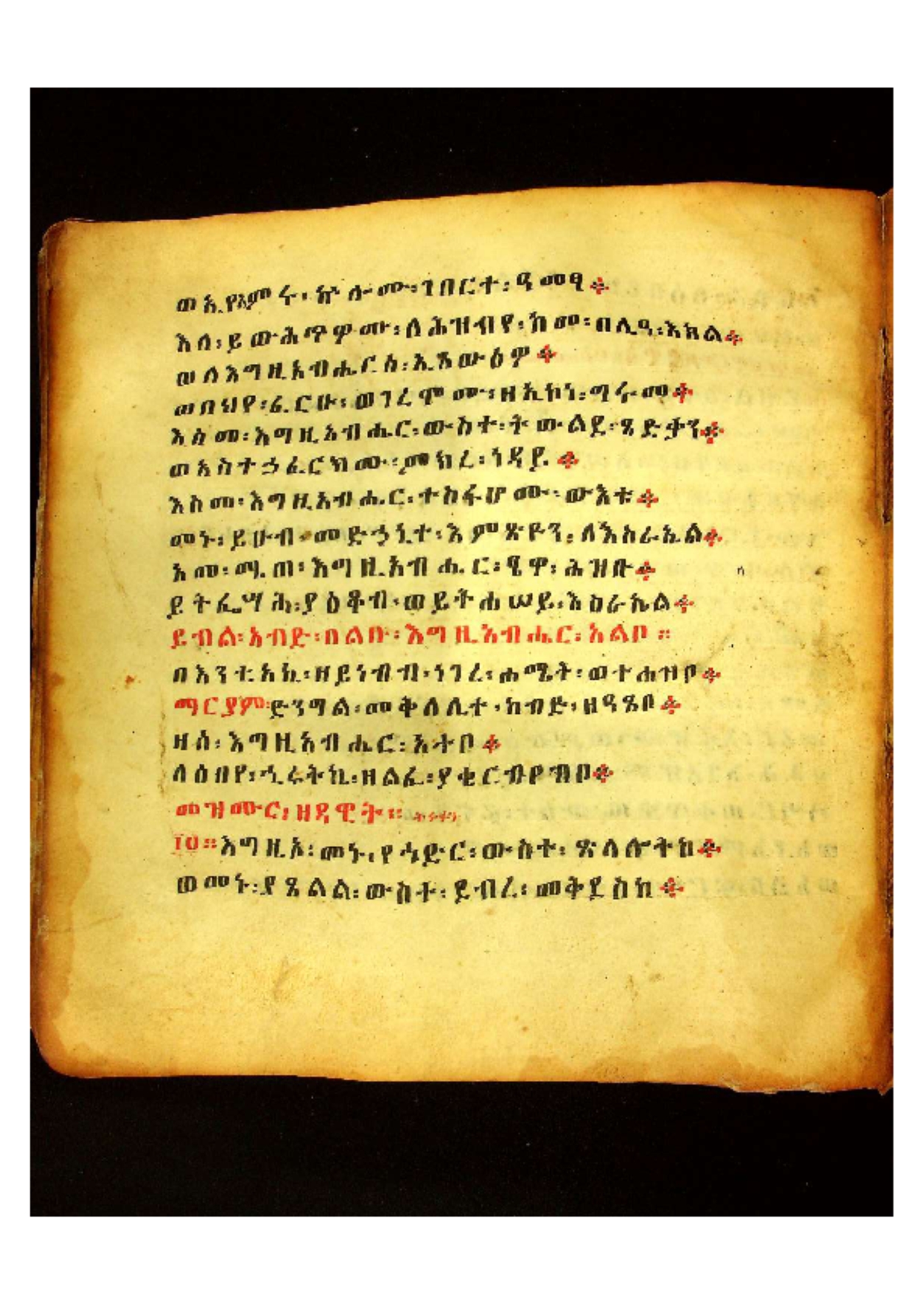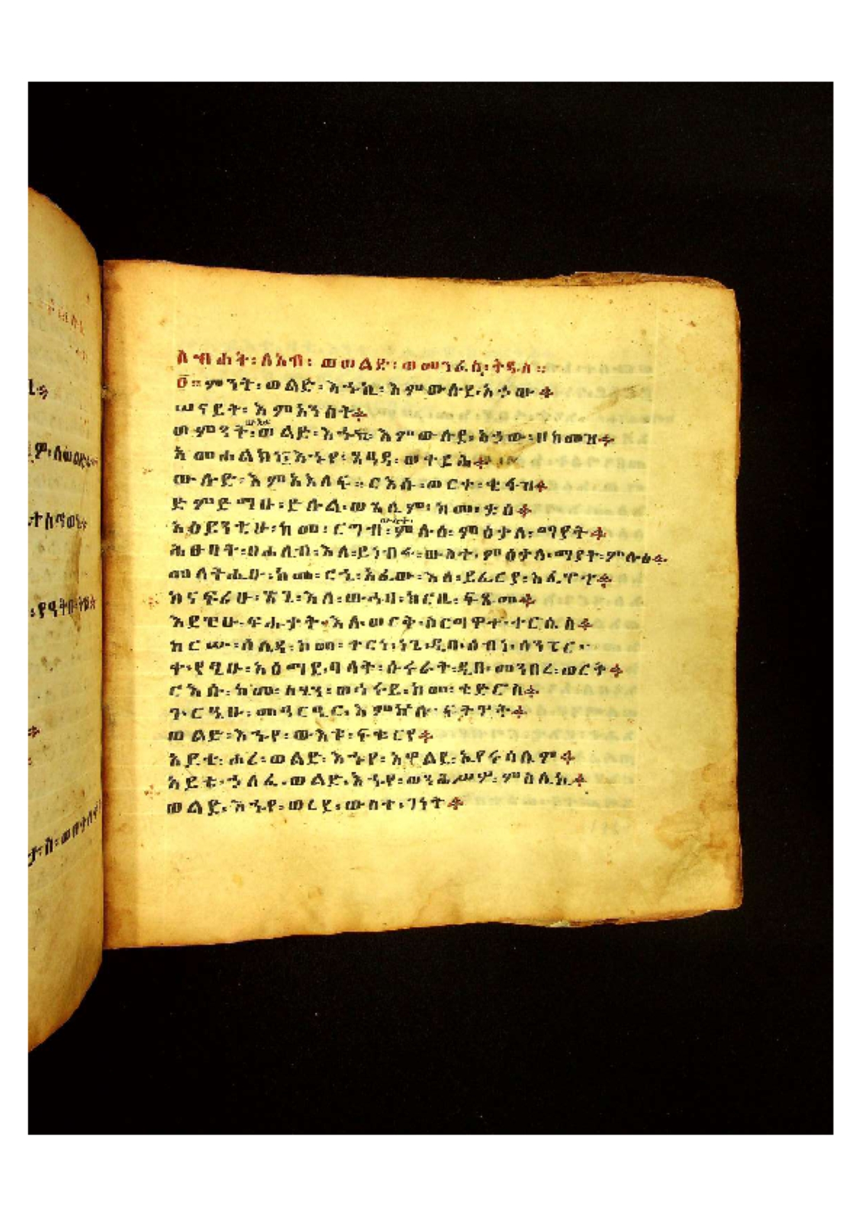 1. F. 2r: donation note written vertically in the outer margin, in black ink: “alla famiglia Bruschettini, Pussy […] Battaglia dell’Amba Aradam il 16 febbraio 1936 XIV”. The note, written in Italian and partly illegible, indicates the Bruschettini family as the receiver of the book and mentions the Battle of Amba Aradam, which took place on 16 February 1936. 2. F. 5r: note written in Italian in the outer upper margin, in red pencil: “Amba Aradam 16/2/XIV ore 17.30 P. Paloboni (?)”. This note also mentions the Battle of Amba Aradam, together with an individual whose name is partially unclear (P. Paloboni?). 3. F. 173v: supplication note written in small script in a mediocre hand, at the end of the “Psalms of David”: ዕቀበኒ፡ እምዓይነ፡ ደዌ፡ ወሞት፡ ለገብርከ፡ ደቅስዮስ፡, “protect me, your servant Däqsəyos, from the eye of infirmity and death”. The note mentions a certain Däqsəyos, indicated as “your servant” (possibly a later owner of the codex). 4. F. 173v: incipit of the Gəʿəz and Amharic prayer, perhaps a writing exercise. The note is written in an inaccurate calligraphy on the outer margin of the folio, next to the prayer. The entire text is የህፂ፡ ኖኅን፡ ከማየ[፡] አይኅ። እስራኤልን፡ ከፈርዖን፡ ዳዊትን፡ ከሳኦል፡ ከኢሎፍሊ። ኤ. 5. F. 190v: donation note, written in black ink in a mediocre hand. Text: ዝመጽሐፍ፡ ዘደብተራ፡ ኪሮስ፡ ዘወሀቦ፡ ለታቦተ፡ ሚካኤል፡ ኢትርስዑኒ፡ በአቡነ፡ ዘበሰማያት፡ ዘአቡየ፡ ገብረ፡ ማርያም፡ ወለእምየ፡ ወለተ፡ ሩፋኤል፡, “This book belongs to däbtära Kiros, who donated it to the tabot of [the church of St] Michael. Do not forget me for our Father who is in heaven. [It also belongs] to my father Gäbrä Maryam and my mother Wälättä Rufaʾel”. 6. F. 199v: writings executed in an inaccurate hand, perhaps the same of note 4. The note includes pen trials (ፈቲነ፡ ብርዕ፡ ዘፈረና፡ etc.), reproduces the explicit of the “Song of the songs” (ስብሐታተኪ፡ ማርያም፡ ከመ፡ እንተ፡ ሕልቀት፡ etc.) and the incipit of the “Praise of Mary” (ውዳሴ፡ ዘሰኑይ፡ ፈቀደ፡ እግዚእ፡ etc., partly rubricated). The writings also mention Däqsəyos, indicated as “your servant” (possibly a later owner of the codex) 7. F. 220ra–va: Genealogic note written on two columns. The note illustrates the family tree of King Yoḥannǝs I, who reigned from 1667 to 1682. The text is acephalous. Incipit: [ወለ]ደ፡ እምሐና፡ ብእሲቱ፡ አሦተ፡ ቅዱሳንሃ፡ ወአሦተ፡ ቅዱሳንኒ፡ እምነ፡ ጳውሊ፡ ብእሲሃ፡ ወለደቶሙ፡ ለአቤተኁን፡ ማእምሮ፡ ወለዘሥላሴ፡ ወአቤተኁን፡ ማእምሮኒ፡ ወለደ፡ አቃርዮስ፡ ወአቃርዮስኒ፡ ወለደ፡ እመቤት፡ እኅተ፡ ክርስቶስሃ፡. The text is published and translated in Proverbio D.V., 2000, ‘Inventario sommario dei manoscritti arabi, ebraici, etiopici – con notizia dei turchi – conservati presso la Biblioteca della Badia di Grottaferrata’. Atti della Accademia nazionale dei Lincei, Memorie, Classe di scienze morali, storiche e filologiche, serie IX, 12 (2000), 468–570 (here pp. 496–97, Appendice III). 8. F. 220va–b: Protective prayer against snakes, written on two columns. Incipit: በስመ፡ አብ፡ … ጸሎት፡ በእንተ፡ ዓርዌ፡ ምድር። ሶበ፡ በጽሐ፡ መልእክት፡ ሐሰውከ፡ በል፡ ፫ጊዜ፡ አኂዘከ፡ ዘፈረ፡ ልብሰ፡ ለእመ፡ ሀሎ፡ ርሑቀ፡ አስትዮ፡. The prayer is probably written in the same hand of note 7. 9. F. 220vb: Unidentified magic prayer containing asmat-names. Incipit: በስመ፡ አብ፡ … ኦላዘላህም፡ አህጉረ፡ ቀዳ[.]፡ ፍሖም፡ ሊስ፡ አፍሊስ፡ ምልክዮስ፡ ዘ[..]ማኤል፡ በዝንቱ፡ አስማቲከ፡ [.]ጽ[..] ኃይለ፡ በረድ፡ ወነፋስ፡ ከማሁ፡. |
