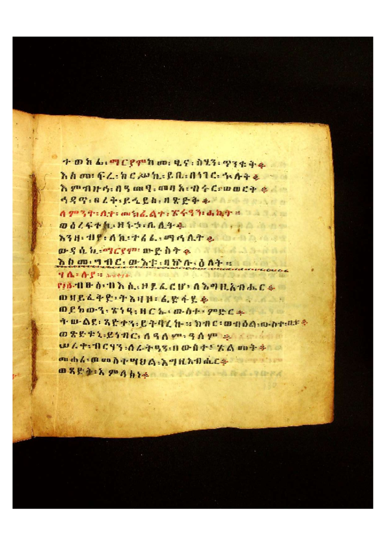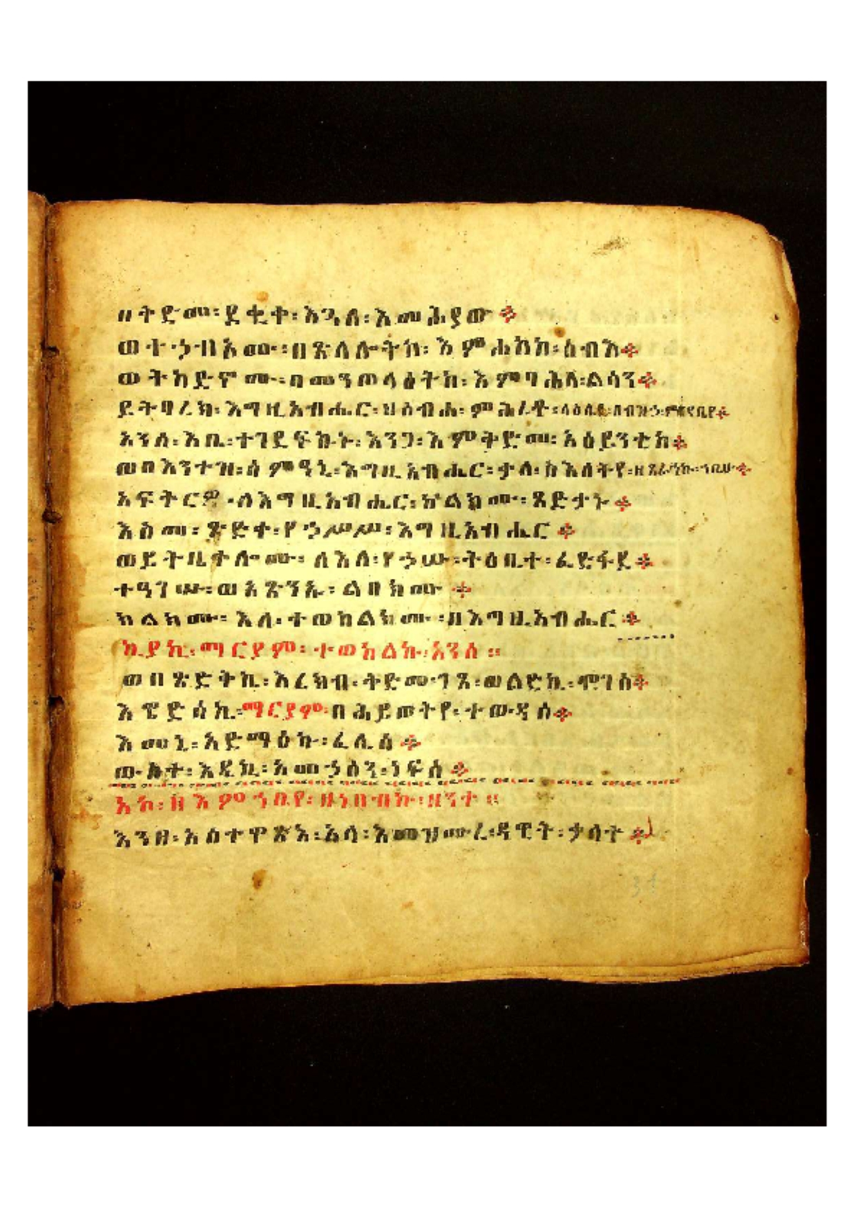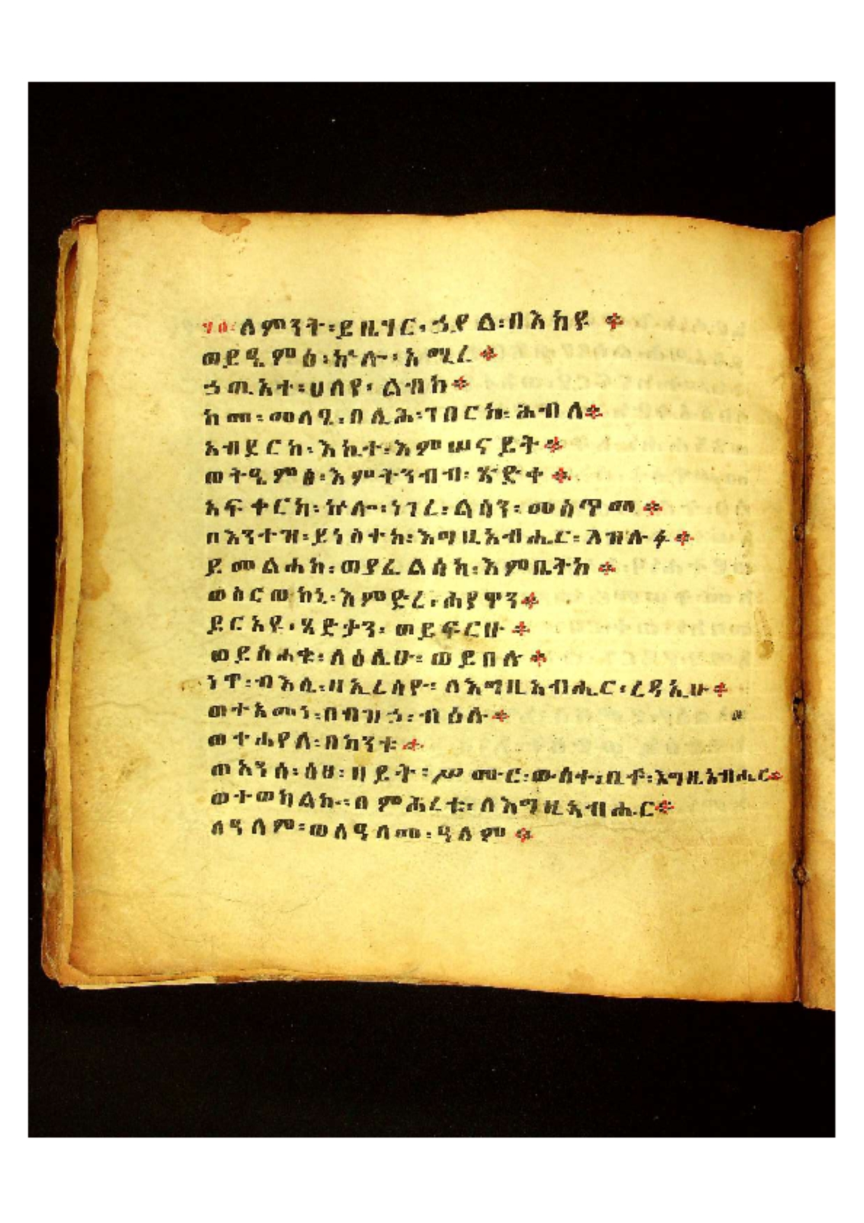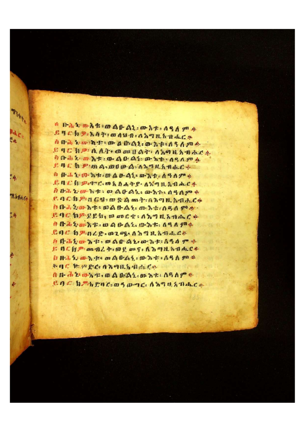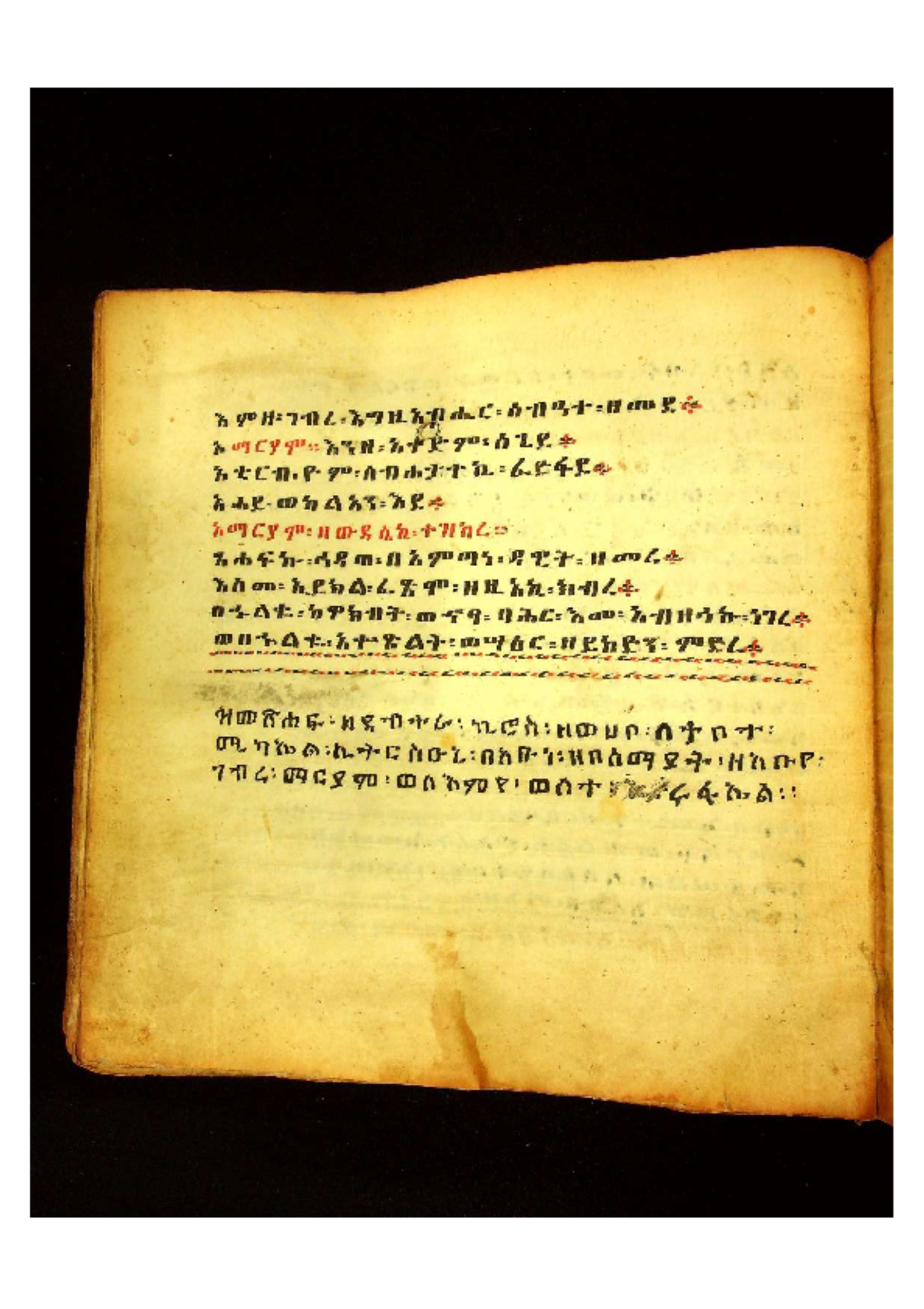 1. F. 2r: donation note written vertically in the outer margin, in black ink: “alla famiglia Bruschettini, Pussy […] Battaglia dell’Amba Aradam il 16 febbraio 1936 XIV”. The note, written in Italian and partly illegible, indicates the Bruschettini family as the receiver of the book and mentions the Battle of Amba Aradam, which took place on 16 February 1936. 2. F. 5r: note written in Italian in the outer upper margin, in red pencil: “Amba Aradam 16/2/XIV ore 17.30 P. Paloboni (?)”. This note also mentions the Battle of Amba Aradam, together with an individual whose name is partially unclear (P. Paloboni?). 3. F. 173v: supplication note written in small script in a mediocre hand, at the end of the “Psalms of David”: ዕቀበኒ፡ እምዓይነ፡ ደዌ፡ ወሞት፡ ለገብርከ፡ ደቅስዮስ፡, “protect me, your servant Däqsəyos, from the eye of infirmity and death”. The note mentions a certain Däqsəyos, indicated as “your servant” (possibly a later owner of the codex). 4. F. 173v: incipit of the Gəʿəz and Amharic prayer, perhaps a writing exercise. The note is written in an inaccurate calligraphy on the outer margin of the folio, next to the prayer. The entire text is የህፂ፡ ኖኅን፡ ከማየ[፡] አይኅ። እስራኤልን፡ ከፈርዖን፡ ዳዊትን፡ ከሳኦል፡ ከኢሎፍሊ። ኤ. 5. F. 190v: donation note, written in black ink in a mediocre hand. Text: ዝመጽሐፍ፡ ዘደብተራ፡ ኪሮስ፡ ዘወሀቦ፡ ለታቦተ፡ ሚካኤል፡ ኢትርስዑኒ፡ በአቡነ፡ ዘበሰማያት፡ ዘአቡየ፡ ገብረ፡ ማርያም፡ ወለእምየ፡ ወለተ፡ ሩፋኤል፡, “This book belongs to däbtära Kiros, who donated it to the tabot of [the church of St] Michael. Do not forget me for our Father who is in heaven. [It also belongs] to my father Gäbrä Maryam and my mother Wälättä Rufaʾel”. 6. F. 199v: writings executed in an inaccurate hand, perhaps the same of note 4. The note includes pen trials (ፈቲነ፡ ብርዕ፡ ዘፈረና፡ etc.), reproduces the explicit of the “Song of the songs” (ስብሐታተኪ፡ ማርያም፡ ከመ፡ እንተ፡ ሕልቀት፡ etc.) and the incipit of the “Praise of Mary” (ውዳሴ፡ ዘሰኑይ፡ ፈቀደ፡ እግዚእ፡ etc., partly rubricated). The writings also mention Däqsəyos, indicated as “your servant” (possibly a later owner of the codex) 7. F. 220ra–va: Genealogic note written on two columns. The note illustrates the family tree of King Yoḥannǝs I, who reigned from 1667 to 1682. The text is acephalous. Incipit: [ወለ]ደ፡ እምሐና፡ ብእሲቱ፡ አሦተ፡ ቅዱሳንሃ፡ ወአሦተ፡ ቅዱሳንኒ፡ እምነ፡ ጳውሊ፡ ብእሲሃ፡ ወለደቶሙ፡ ለአቤተኁን፡ ማእምሮ፡ ወለዘሥላሴ፡ ወአቤተኁን፡ ማእምሮኒ፡ ወለደ፡ አቃርዮስ፡ ወአቃርዮስኒ፡ ወለደ፡ እመቤት፡ እኅተ፡ ክርስቶስሃ፡. The text is published and translated in Proverbio D.V., 2000, ‘Inventario sommario dei manoscritti arabi, ebraici, etiopici – con notizia dei turchi – conservati presso la Biblioteca della Badia di Grottaferrata’. Atti della Accademia nazionale dei Lincei, Memorie, Classe di scienze morali, storiche e filologiche, serie IX, 12 (2000), 468–570 (here pp. 496–97, Appendice III). 8. F. 220va–b: Protective prayer against snakes, written on two columns. Incipit: በስመ፡ አብ፡ … ጸሎት፡ በእንተ፡ ዓርዌ፡ ምድር። ሶበ፡ በጽሐ፡ መልእክት፡ ሐሰውከ፡ በል፡ ፫ጊዜ፡ አኂዘከ፡ ዘፈረ፡ ልብሰ፡ ለእመ፡ ሀሎ፡ ርሑቀ፡ አስትዮ፡. The prayer is probably written in the same hand of note 7. 9. F. 220vb: Unidentified magic prayer containing asmat-names. Incipit: በስመ፡ አብ፡ … ኦላዘላህም፡ አህጉረ፡ ቀዳ[.]፡ ፍሖም፡ ሊስ፡ አፍሊስ፡ ምልክዮስ፡ ዘ[..]ማኤል፡ በዝንቱ፡ አስማቲከ፡ [.]ጽ[..] ኃይለ፡ በረድ፡ ወነፋስ፡ ከማሁ፡. |