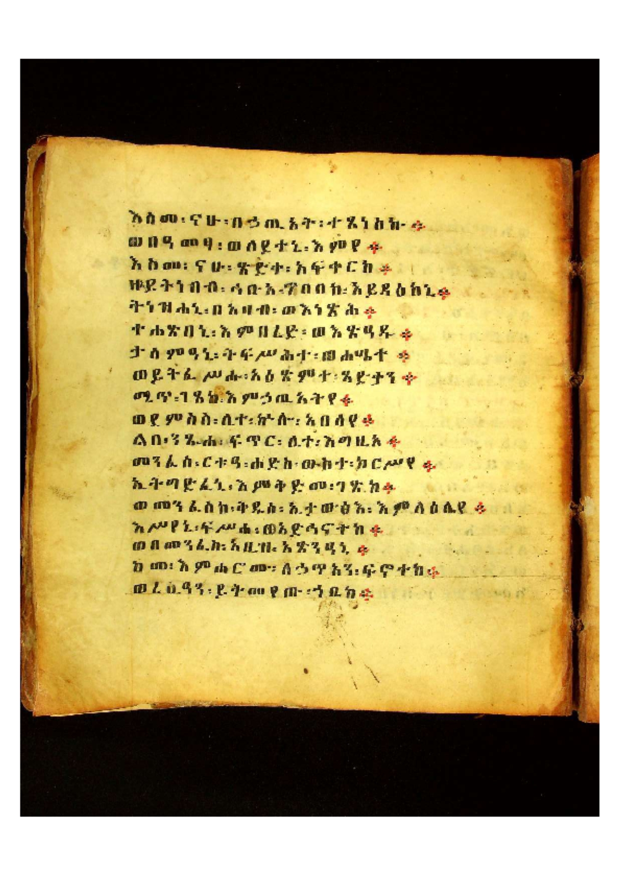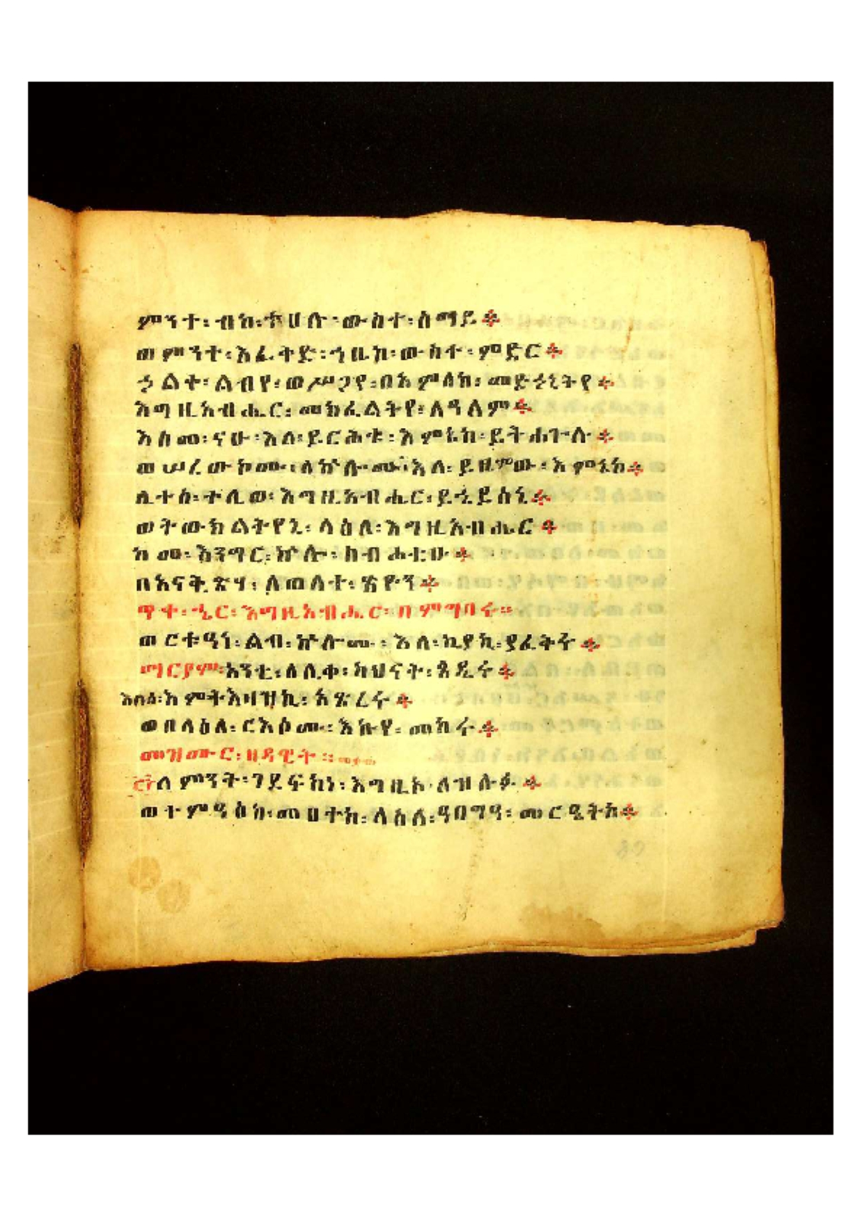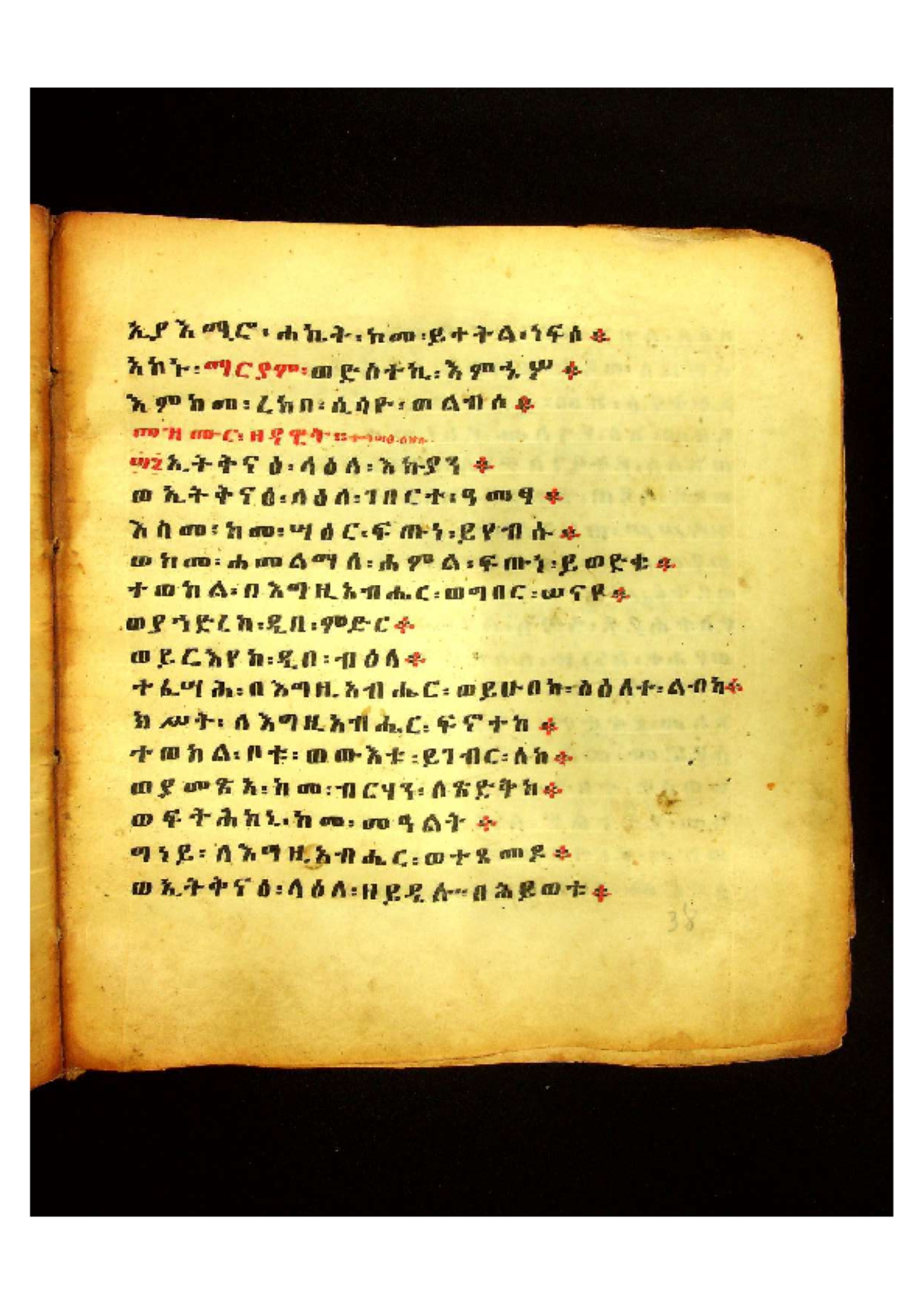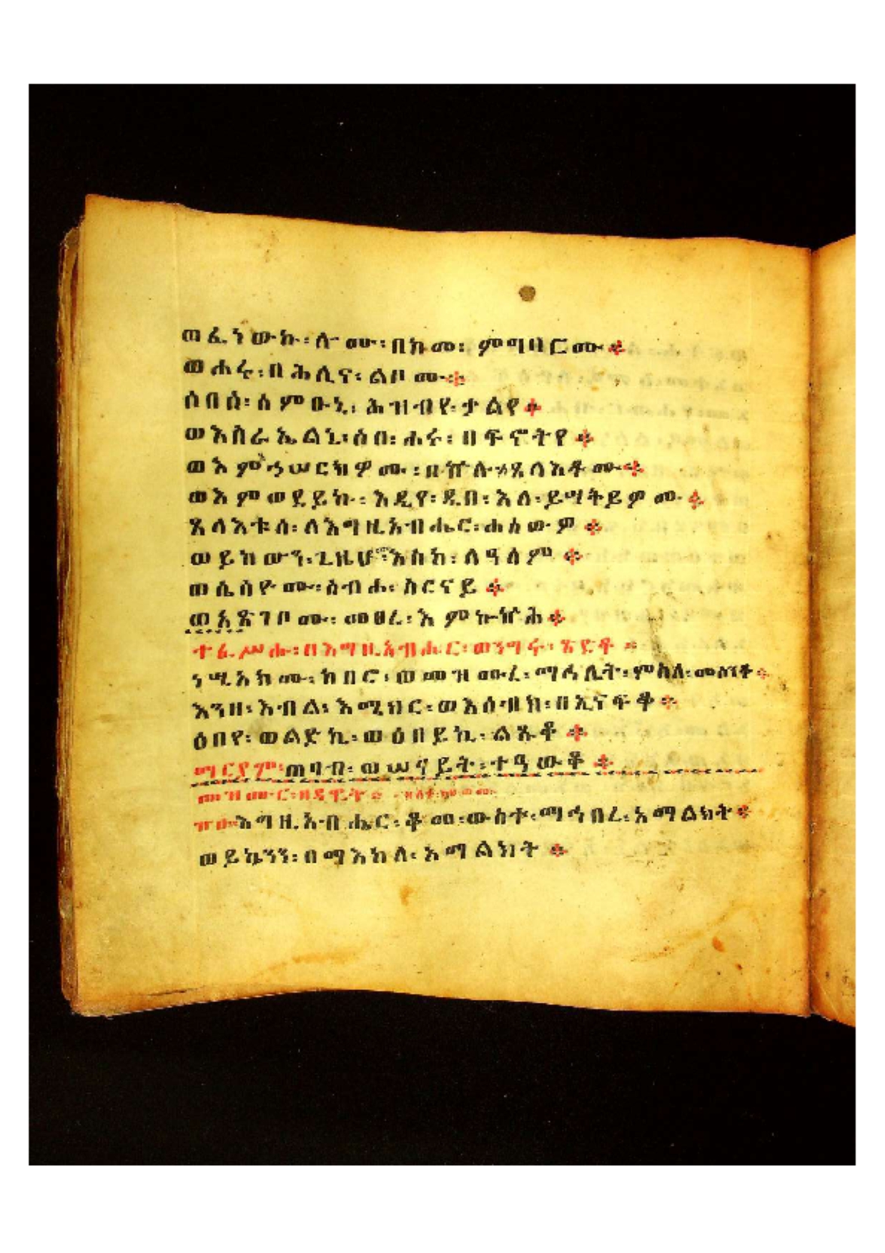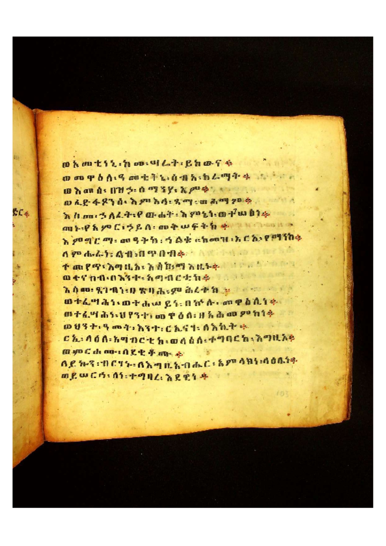 1. F. 2r: donation note written vertically in the outer margin, in black ink: “alla famiglia Bruschettini, Pussy […] Battaglia dell’Amba Aradam il 16 febbraio 1936 XIV”. The note, written in Italian and partly illegible, indicates the Bruschettini family as the receiver of the book and mentions the Battle of Amba Aradam, which took place on 16 February 1936. 2. F. 5r: note written in Italian in the outer upper margin, in red pencil: “Amba Aradam 16/2/XIV ore 17.30 P. Paloboni (?)”. This note also mentions the Battle of Amba Aradam, together with an individual whose name is partially unclear (P. Paloboni?). 3. F. 173v: supplication note written in small script in a mediocre hand, at the end of the “Psalms of David”: ዕቀበኒ፡ እምዓይነ፡ ደዌ፡ ወሞት፡ ለገብርከ፡ ደቅስዮስ፡, “protect me, your servant Däqsəyos, from the eye of infirmity and death”. The note mentions a certain Däqsəyos, indicated as “your servant” (possibly a later owner of the codex). 4. F. 173v: incipit of the Gəʿəz and Amharic prayer, perhaps a writing exercise. The note is written in an inaccurate calligraphy on the outer margin of the folio, next to the prayer. The entire text is የህፂ፡ ኖኅን፡ ከማየ[፡] አይኅ። እስራኤልን፡ ከፈርዖን፡ ዳዊትን፡ ከሳኦል፡ ከኢሎፍሊ። ኤ. 5. F. 190v: donation note, written in black ink in a mediocre hand. Text: ዝመጽሐፍ፡ ዘደብተራ፡ ኪሮስ፡ ዘወሀቦ፡ ለታቦተ፡ ሚካኤል፡ ኢትርስዑኒ፡ በአቡነ፡ ዘበሰማያት፡ ዘአቡየ፡ ገብረ፡ ማርያም፡ ወለእምየ፡ ወለተ፡ ሩፋኤል፡, “This book belongs to däbtära Kiros, who donated it to the tabot of [the church of St] Michael. Do not forget me for our Father who is in heaven. [It also belongs] to my father Gäbrä Maryam and my mother Wälättä Rufaʾel”. 6. F. 199v: writings executed in an inaccurate hand, perhaps the same of note 4. The note includes pen trials (ፈቲነ፡ ብርዕ፡ ዘፈረና፡ etc.), reproduces the explicit of the “Song of the songs” (ስብሐታተኪ፡ ማርያም፡ ከመ፡ እንተ፡ ሕልቀት፡ etc.) and the incipit of the “Praise of Mary” (ውዳሴ፡ ዘሰኑይ፡ ፈቀደ፡ እግዚእ፡ etc., partly rubricated). The writings also mention Däqsəyos, indicated as “your servant” (possibly a later owner of the codex) 7. F. 220ra–va: Genealogic note written on two columns. The note illustrates the family tree of King Yoḥannǝs I, who reigned from 1667 to 1682. The text is acephalous. Incipit: [ወለ]ደ፡ እምሐና፡ ብእሲቱ፡ አሦተ፡ ቅዱሳንሃ፡ ወአሦተ፡ ቅዱሳንኒ፡ እምነ፡ ጳውሊ፡ ብእሲሃ፡ ወለደቶሙ፡ ለአቤተኁን፡ ማእምሮ፡ ወለዘሥላሴ፡ ወአቤተኁን፡ ማእምሮኒ፡ ወለደ፡ አቃርዮስ፡ ወአቃርዮስኒ፡ ወለደ፡ እመቤት፡ እኅተ፡ ክርስቶስሃ፡. The text is published and translated in Proverbio D.V., 2000, ‘Inventario sommario dei manoscritti arabi, ebraici, etiopici – con notizia dei turchi – conservati presso la Biblioteca della Badia di Grottaferrata’. Atti della Accademia nazionale dei Lincei, Memorie, Classe di scienze morali, storiche e filologiche, serie IX, 12 (2000), 468–570 (here pp. 496–97, Appendice III). 8. F. 220va–b: Protective prayer against snakes, written on two columns. Incipit: በስመ፡ አብ፡ … ጸሎት፡ በእንተ፡ ዓርዌ፡ ምድር። ሶበ፡ በጽሐ፡ መልእክት፡ ሐሰውከ፡ በል፡ ፫ጊዜ፡ አኂዘከ፡ ዘፈረ፡ ልብሰ፡ ለእመ፡ ሀሎ፡ ርሑቀ፡ አስትዮ፡. The prayer is probably written in the same hand of note 7. 9. F. 220vb: Unidentified magic prayer containing asmat-names. Incipit: በስመ፡ አብ፡ … ኦላዘላህም፡ አህጉረ፡ ቀዳ[.]፡ ፍሖም፡ ሊስ፡ አፍሊስ፡ ምልክዮስ፡ ዘ[..]ማኤል፡ በዝንቱ፡ አስማቲከ፡ [.]ጽ[..] ኃይለ፡ በረድ፡ ወነፋስ፡ ከማሁ፡. |