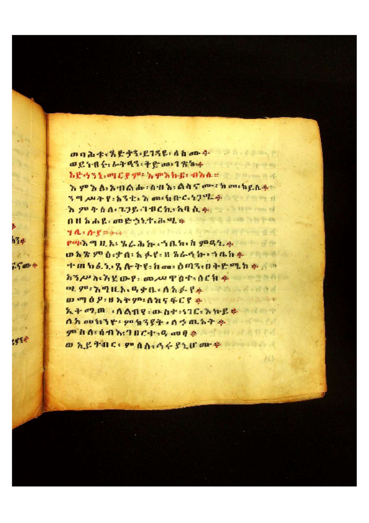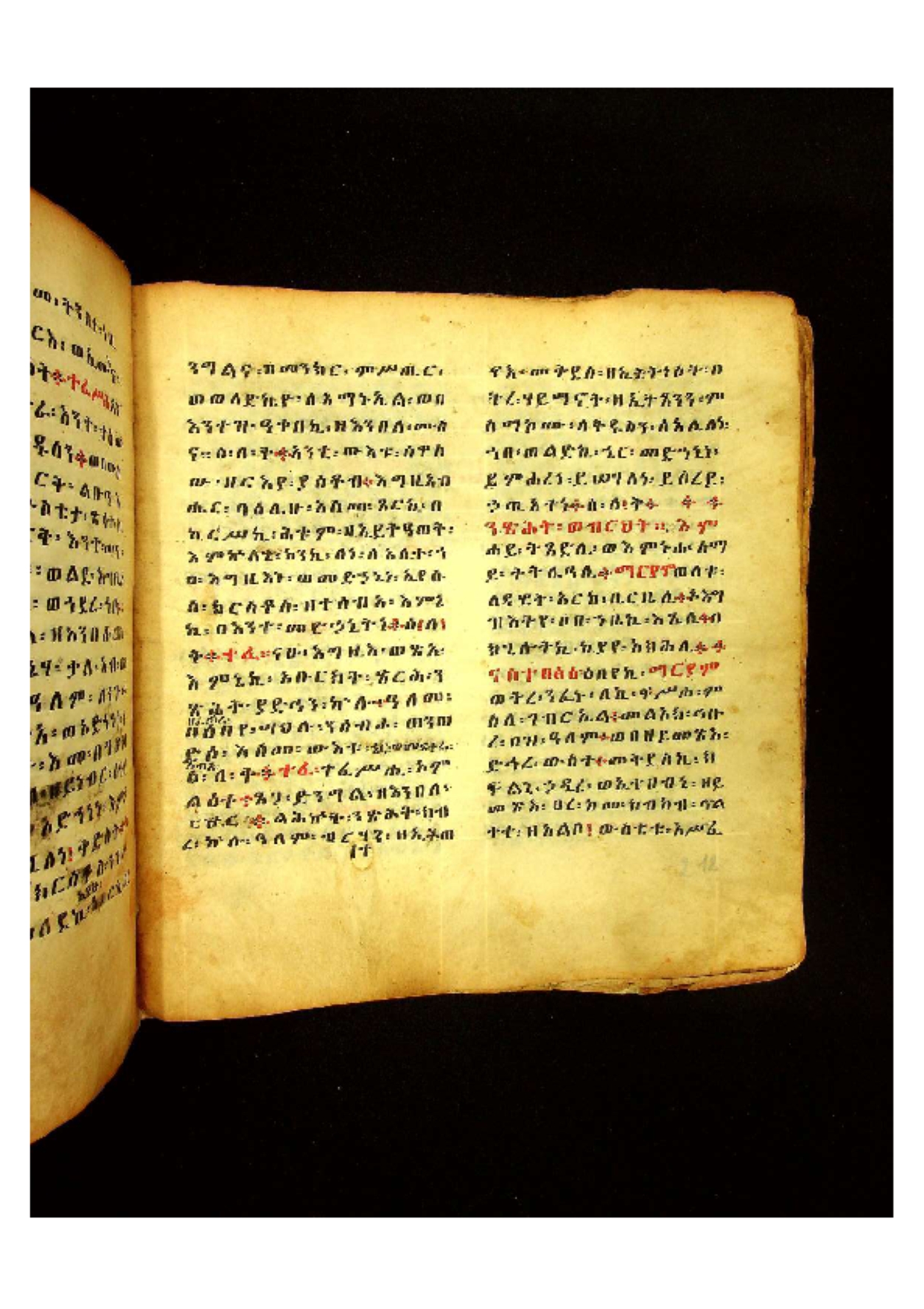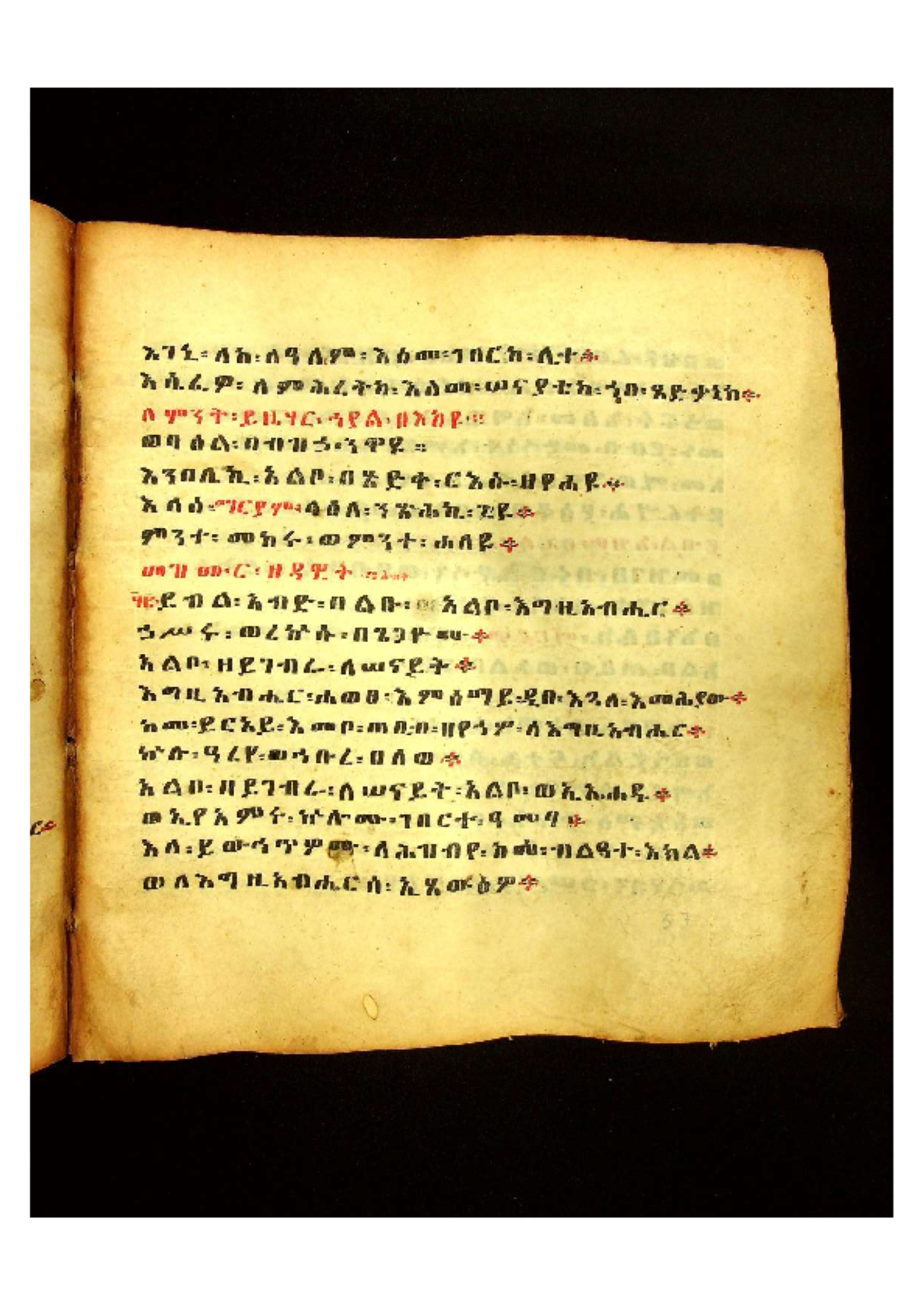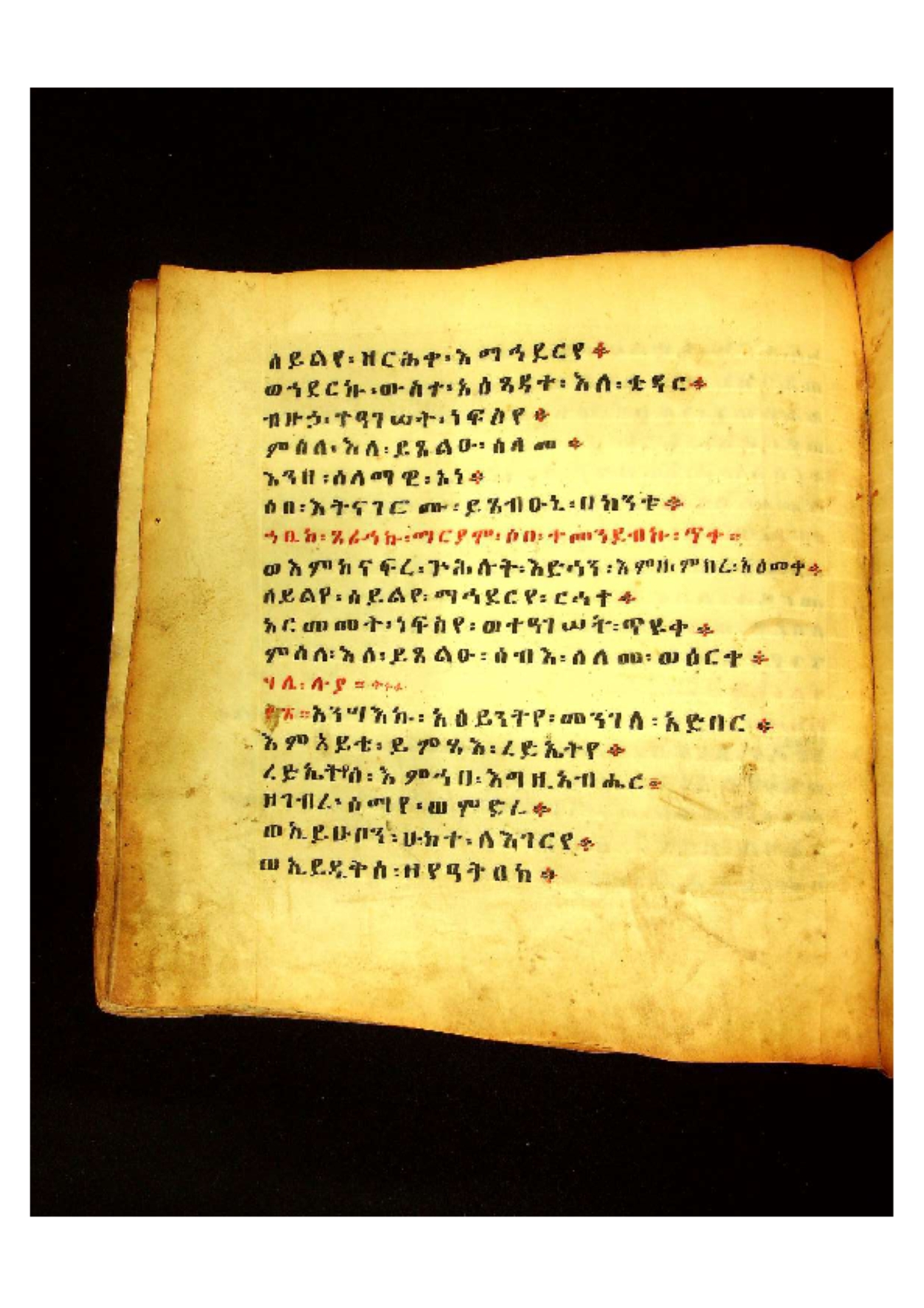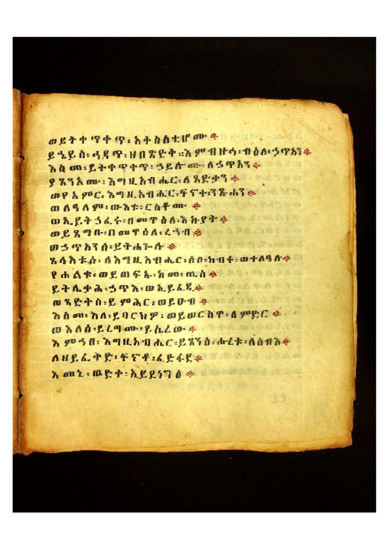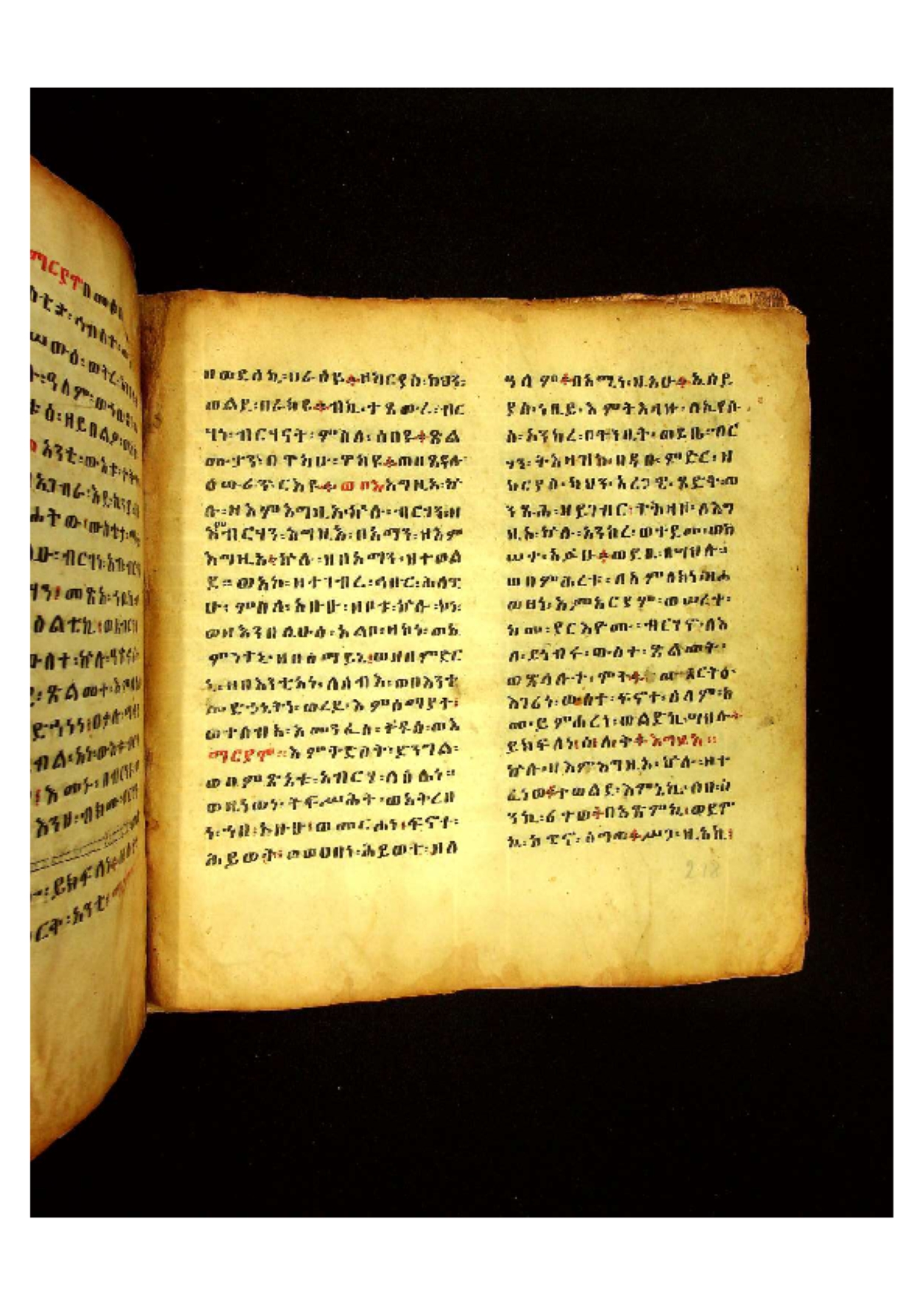 1. F. 2r: donation note written vertically in the outer margin, in black ink: “alla famiglia Bruschettini, Pussy […] Battaglia dell’Amba Aradam il 16 febbraio 1936 XIV”. The note, written in Italian and partly illegible, indicates the Bruschettini family as the receiver of the book and mentions the Battle of Amba Aradam, which took place on 16 February 1936. 2. F. 5r: note written in Italian in the outer upper margin, in red pencil: “Amba Aradam 16/2/XIV ore 17.30 P. Paloboni (?)”. This note also mentions the Battle of Amba Aradam, together with an individual whose name is partially unclear (P. Paloboni?). 3. F. 173v: supplication note written in small script in a mediocre hand, at the end of the “Psalms of David”: ዕቀበኒ፡ እምዓይነ፡ ደዌ፡ ወሞት፡ ለገብርከ፡ ደቅስዮስ፡, “protect me, your servant Däqsəyos, from the eye of infirmity and death”. The note mentions a certain Däqsəyos, indicated as “your servant” (possibly a later owner of the codex). 4. F. 173v: incipit of the Gəʿəz and Amharic prayer, perhaps a writing exercise. The note is written in an inaccurate calligraphy on the outer margin of the folio, next to the prayer. The entire text is የህፂ፡ ኖኅን፡ ከማየ[፡] አይኅ። እስራኤልን፡ ከፈርዖን፡ ዳዊትን፡ ከሳኦል፡ ከኢሎፍሊ። ኤ. 5. F. 190v: donation note, written in black ink in a mediocre hand. Text: ዝመጽሐፍ፡ ዘደብተራ፡ ኪሮስ፡ ዘወሀቦ፡ ለታቦተ፡ ሚካኤል፡ ኢትርስዑኒ፡ በአቡነ፡ ዘበሰማያት፡ ዘአቡየ፡ ገብረ፡ ማርያም፡ ወለእምየ፡ ወለተ፡ ሩፋኤል፡, “This book belongs to däbtära Kiros, who donated it to the tabot of [the church of St] Michael. Do not forget me for our Father who is in heaven. [It also belongs] to my father Gäbrä Maryam and my mother Wälättä Rufaʾel”. 6. F. 199v: writings executed in an inaccurate hand, perhaps the same of note 4. The note includes pen trials (ፈቲነ፡ ብርዕ፡ ዘፈረና፡ etc.), reproduces the explicit of the “Song of the songs” (ስብሐታተኪ፡ ማርያም፡ ከመ፡ እንተ፡ ሕልቀት፡ etc.) and the incipit of the “Praise of Mary” (ውዳሴ፡ ዘሰኑይ፡ ፈቀደ፡ እግዚእ፡ etc., partly rubricated). The writings also mention Däqsəyos, indicated as “your servant” (possibly a later owner of the codex) 7. F. 220ra–va: Genealogic note written on two columns. The note illustrates the family tree of King Yoḥannǝs I, who reigned from 1667 to 1682. The text is acephalous. Incipit: [ወለ]ደ፡ እምሐና፡ ብእሲቱ፡ አሦተ፡ ቅዱሳንሃ፡ ወአሦተ፡ ቅዱሳንኒ፡ እምነ፡ ጳውሊ፡ ብእሲሃ፡ ወለደቶሙ፡ ለአቤተኁን፡ ማእምሮ፡ ወለዘሥላሴ፡ ወአቤተኁን፡ ማእምሮኒ፡ ወለደ፡ አቃርዮስ፡ ወአቃርዮስኒ፡ ወለደ፡ እመቤት፡ እኅተ፡ ክርስቶስሃ፡. The text is published and translated in Proverbio D.V., 2000, ‘Inventario sommario dei manoscritti arabi, ebraici, etiopici – con notizia dei turchi – conservati presso la Biblioteca della Badia di Grottaferrata’. Atti della Accademia nazionale dei Lincei, Memorie, Classe di scienze morali, storiche e filologiche, serie IX, 12 (2000), 468–570 (here pp. 496–97, Appendice III). 8. F. 220va–b: Protective prayer against snakes, written on two columns. Incipit: በስመ፡ አብ፡ … ጸሎት፡ በእንተ፡ ዓርዌ፡ ምድር። ሶበ፡ በጽሐ፡ መልእክት፡ ሐሰውከ፡ በል፡ ፫ጊዜ፡ አኂዘከ፡ ዘፈረ፡ ልብሰ፡ ለእመ፡ ሀሎ፡ ርሑቀ፡ አስትዮ፡. The prayer is probably written in the same hand of note 7. 9. F. 220vb: Unidentified magic prayer containing asmat-names. Incipit: በስመ፡ አብ፡ … ኦላዘላህም፡ አህጉረ፡ ቀዳ[.]፡ ፍሖም፡ ሊስ፡ አፍሊስ፡ ምልክዮስ፡ ዘ[..]ማኤል፡ በዝንቱ፡ አስማቲከ፡ [.]ጽ[..] ኃይለ፡ በረድ፡ ወነፋስ፡ ከማሁ፡. |