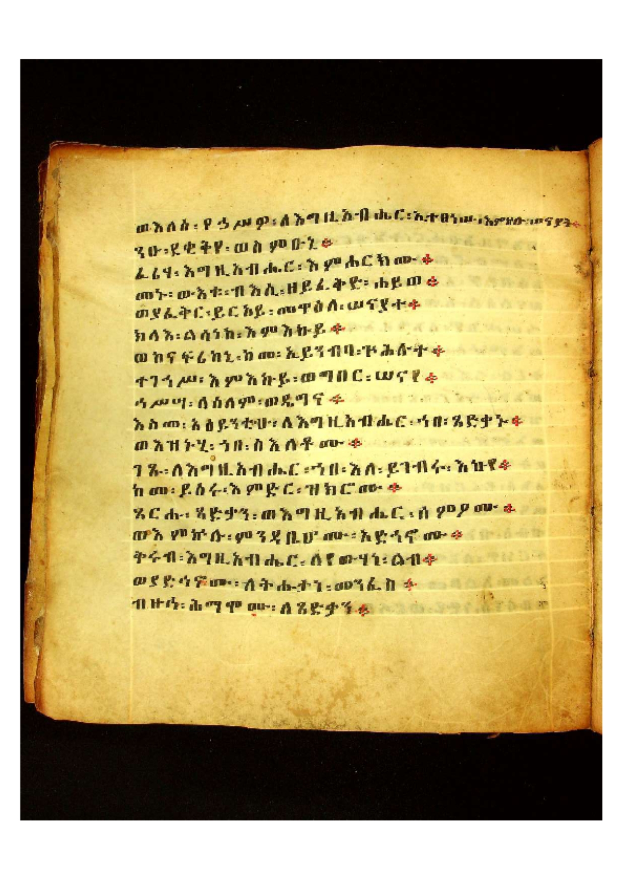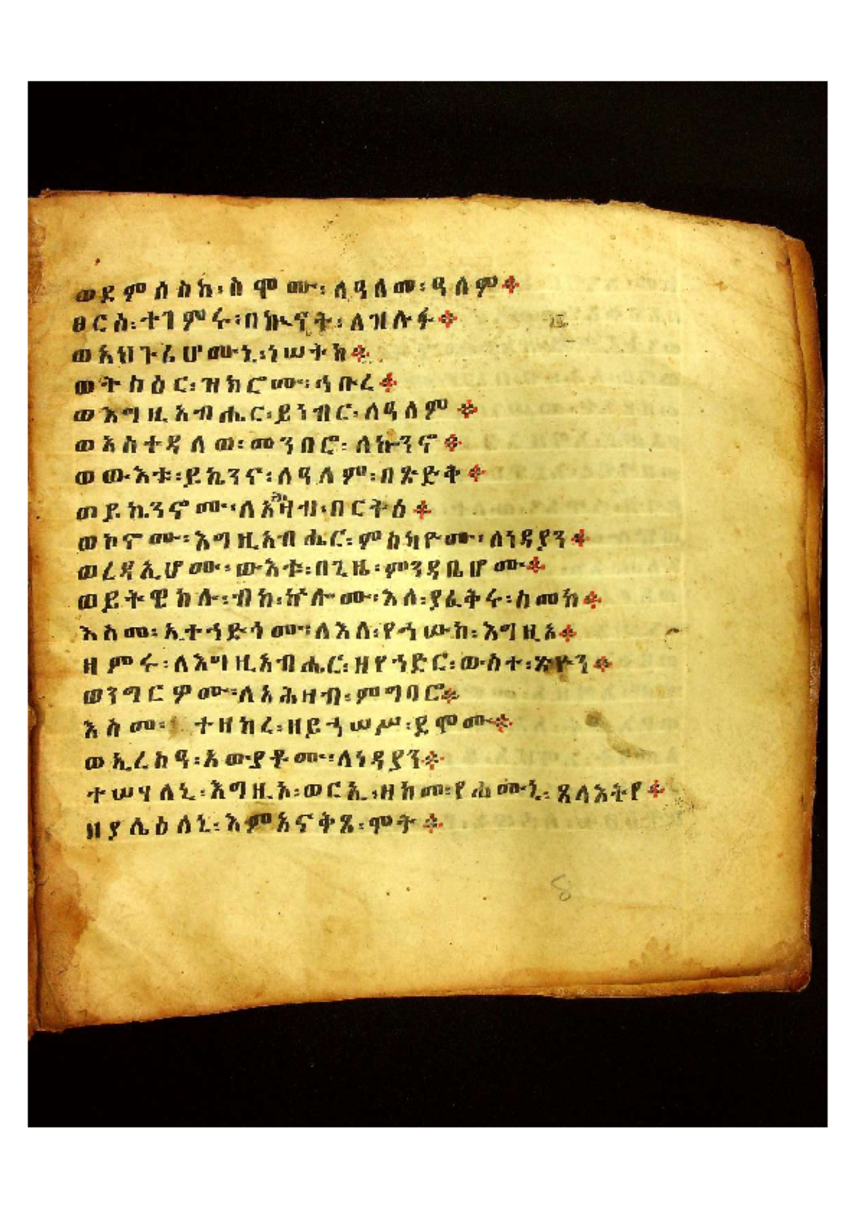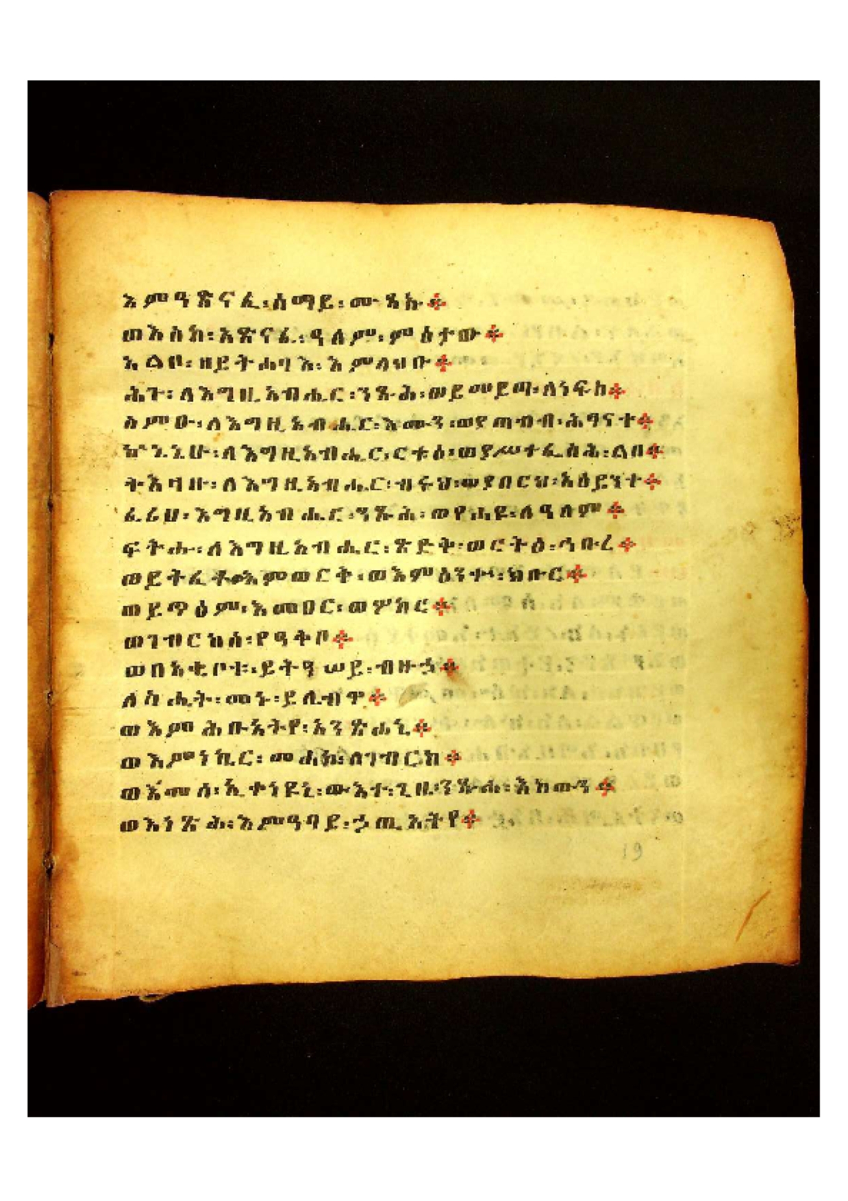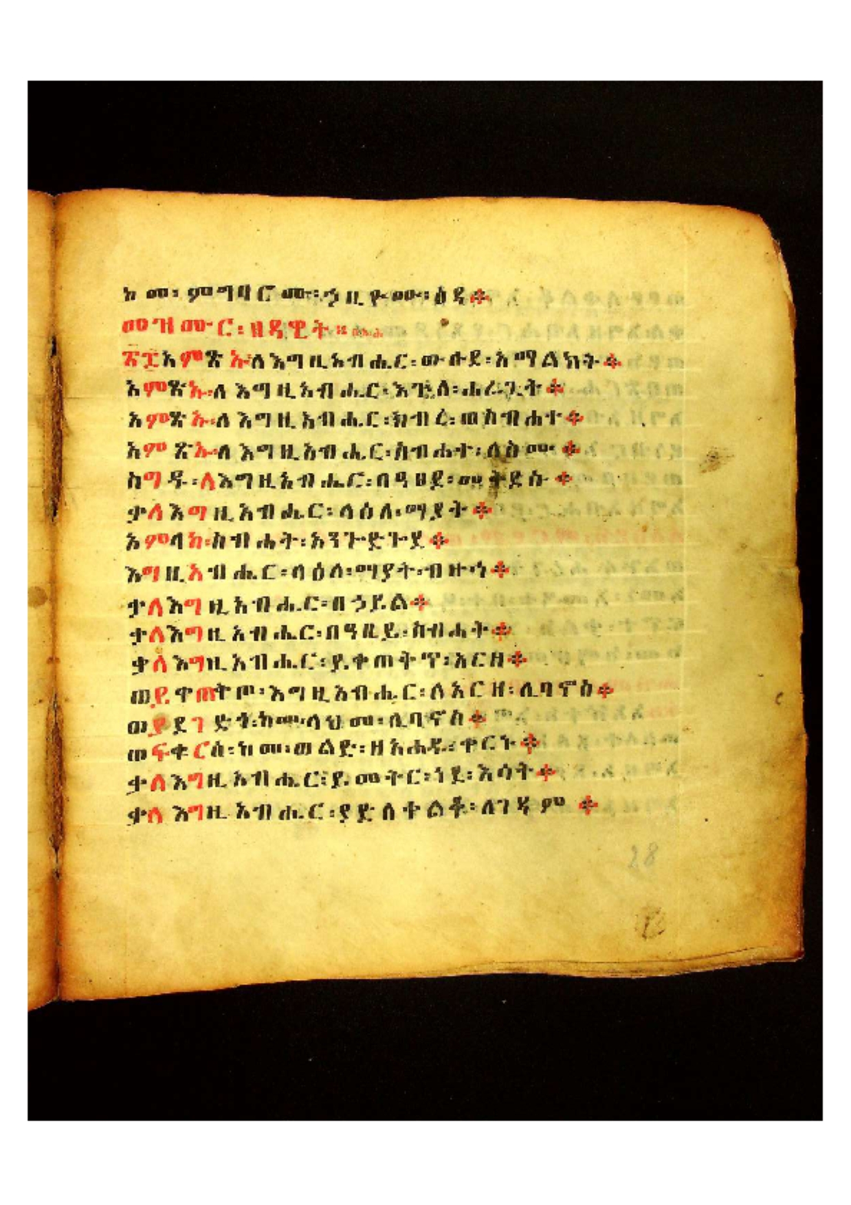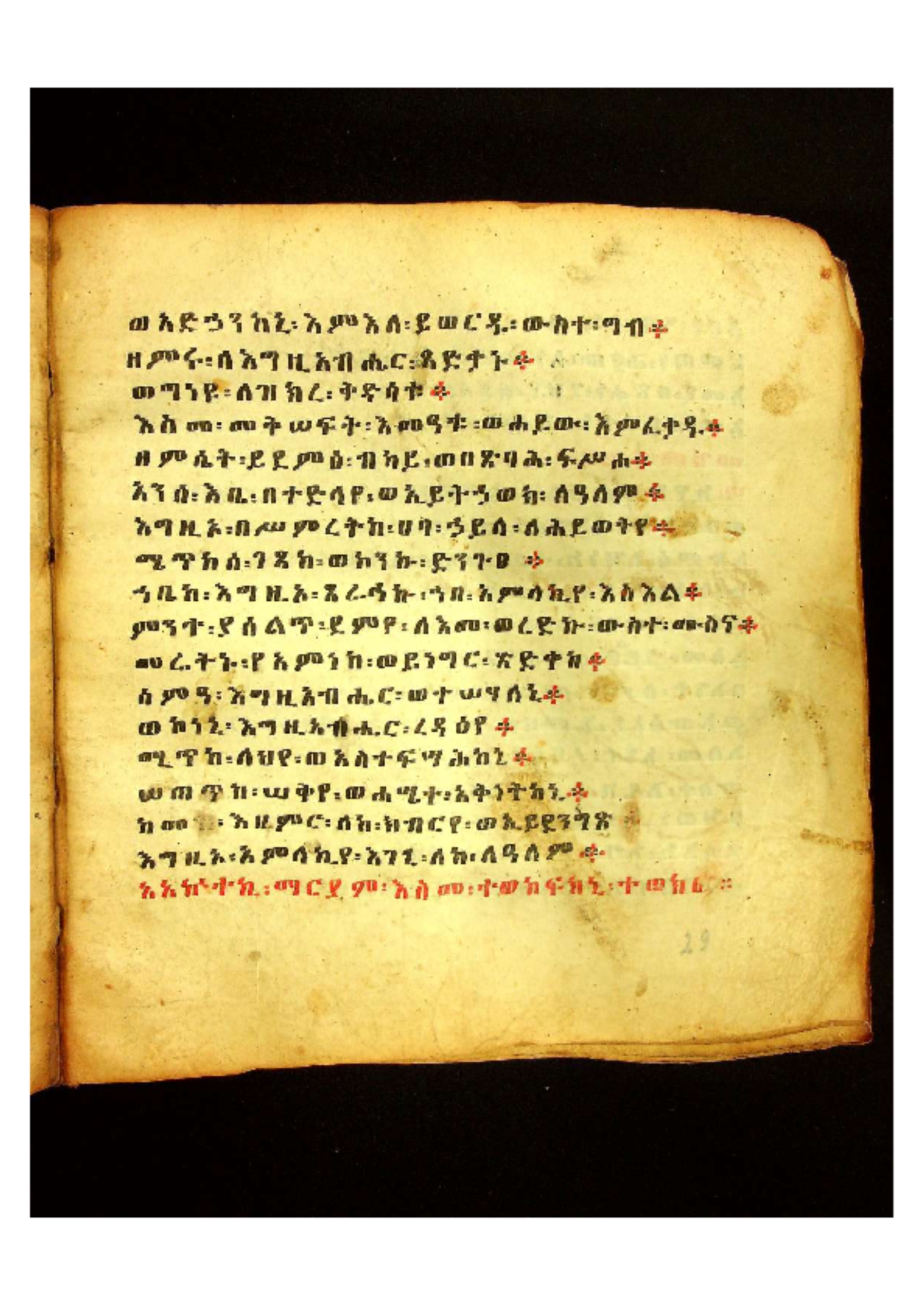 1. F. 2r: donation note written vertically in the outer margin, in black ink: “alla famiglia Bruschettini, Pussy […] Battaglia dell’Amba Aradam il 16 febbraio 1936 XIV”. The note, written in Italian and partly illegible, indicates the Bruschettini family as the receiver of the book and mentions the Battle of Amba Aradam, which took place on 16 February 1936. 2. F. 5r: note written in Italian in the outer upper margin, in red pencil: “Amba Aradam 16/2/XIV ore 17.30 P. Paloboni (?)”. This note also mentions the Battle of Amba Aradam, together with an individual whose name is partially unclear (P. Paloboni?). 3. F. 173v: supplication note written in small script in a mediocre hand, at the end of the “Psalms of David”: ዕቀበኒ፡ እምዓይነ፡ ደዌ፡ ወሞት፡ ለገብርከ፡ ደቅስዮስ፡, “protect me, your servant Däqsəyos, from the eye of infirmity and death”. The note mentions a certain Däqsəyos, indicated as “your servant” (possibly a later owner of the codex). 4. F. 173v: incipit of the Gəʿəz and Amharic prayer, perhaps a writing exercise. The note is written in an inaccurate calligraphy on the outer margin of the folio, next to the prayer. The entire text is የህፂ፡ ኖኅን፡ ከማየ[፡] አይኅ። እስራኤልን፡ ከፈርዖን፡ ዳዊትን፡ ከሳኦል፡ ከኢሎፍሊ። ኤ. 5. F. 190v: donation note, written in black ink in a mediocre hand. Text: ዝመጽሐፍ፡ ዘደብተራ፡ ኪሮስ፡ ዘወሀቦ፡ ለታቦተ፡ ሚካኤል፡ ኢትርስዑኒ፡ በአቡነ፡ ዘበሰማያት፡ ዘአቡየ፡ ገብረ፡ ማርያም፡ ወለእምየ፡ ወለተ፡ ሩፋኤል፡, “This book belongs to däbtära Kiros, who donated it to the tabot of [the church of St] Michael. Do not forget me for our Father who is in heaven. [It also belongs] to my father Gäbrä Maryam and my mother Wälättä Rufaʾel”. 6. F. 199v: writings executed in an inaccurate hand, perhaps the same of note 4. The note includes pen trials (ፈቲነ፡ ብርዕ፡ ዘፈረና፡ etc.), reproduces the explicit of the “Song of the songs” (ስብሐታተኪ፡ ማርያም፡ ከመ፡ እንተ፡ ሕልቀት፡ etc.) and the incipit of the “Praise of Mary” (ውዳሴ፡ ዘሰኑይ፡ ፈቀደ፡ እግዚእ፡ etc., partly rubricated). The writings also mention Däqsəyos, indicated as “your servant” (possibly a later owner of the codex) 7. F. 220ra–va: Genealogic note written on two columns. The note illustrates the family tree of King Yoḥannǝs I, who reigned from 1667 to 1682. The text is acephalous. Incipit: [ወለ]ደ፡ እምሐና፡ ብእሲቱ፡ አሦተ፡ ቅዱሳንሃ፡ ወአሦተ፡ ቅዱሳንኒ፡ እምነ፡ ጳውሊ፡ ብእሲሃ፡ ወለደቶሙ፡ ለአቤተኁን፡ ማእምሮ፡ ወለዘሥላሴ፡ ወአቤተኁን፡ ማእምሮኒ፡ ወለደ፡ አቃርዮስ፡ ወአቃርዮስኒ፡ ወለደ፡ እመቤት፡ እኅተ፡ ክርስቶስሃ፡. The text is published and translated in Proverbio D.V., 2000, ‘Inventario sommario dei manoscritti arabi, ebraici, etiopici – con notizia dei turchi – conservati presso la Biblioteca della Badia di Grottaferrata’. Atti della Accademia nazionale dei Lincei, Memorie, Classe di scienze morali, storiche e filologiche, serie IX, 12 (2000), 468–570 (here pp. 496–97, Appendice III). 8. F. 220va–b: Protective prayer against snakes, written on two columns. Incipit: በስመ፡ አብ፡ … ጸሎት፡ በእንተ፡ ዓርዌ፡ ምድር። ሶበ፡ በጽሐ፡ መልእክት፡ ሐሰውከ፡ በል፡ ፫ጊዜ፡ አኂዘከ፡ ዘፈረ፡ ልብሰ፡ ለእመ፡ ሀሎ፡ ርሑቀ፡ አስትዮ፡. The prayer is probably written in the same hand of note 7. 9. F. 220vb: Unidentified magic prayer containing asmat-names. Incipit: በስመ፡ አብ፡ … ኦላዘላህም፡ አህጉረ፡ ቀዳ[.]፡ ፍሖም፡ ሊስ፡ አፍሊስ፡ ምልክዮስ፡ ዘ[..]ማኤል፡ በዝንቱ፡ አስማቲከ፡ [.]ጽ[..] ኃይለ፡ በረድ፡ ወነፋስ፡ ከማሁ፡. |