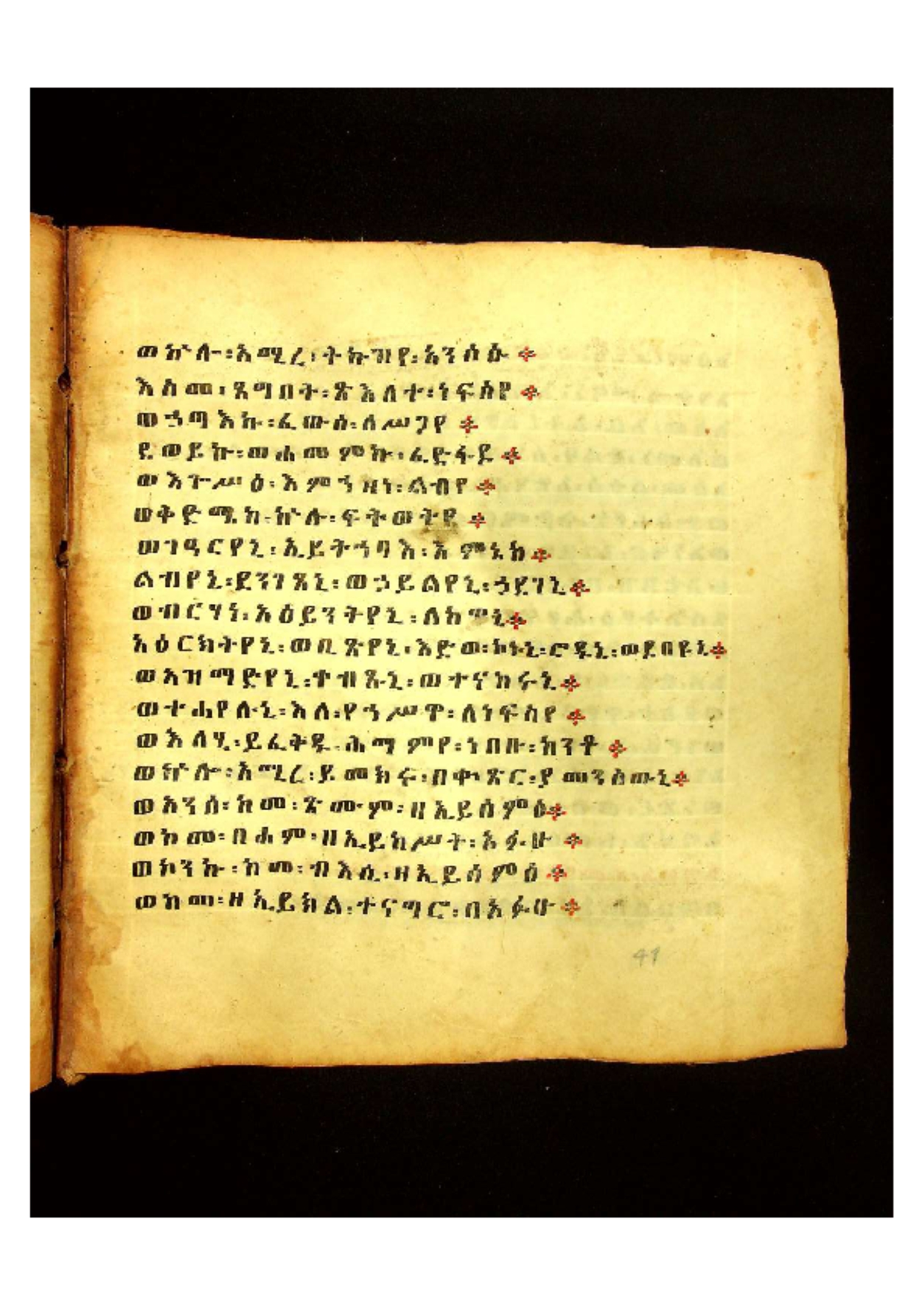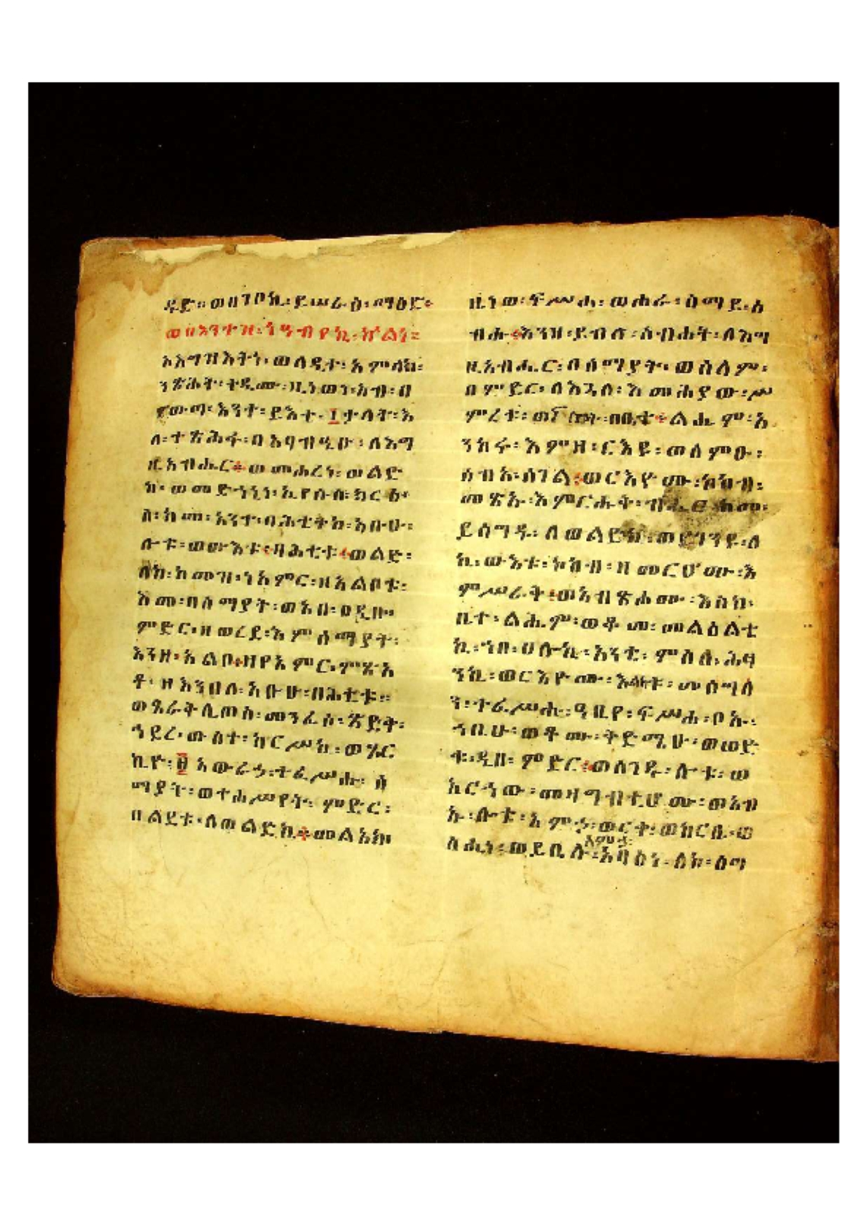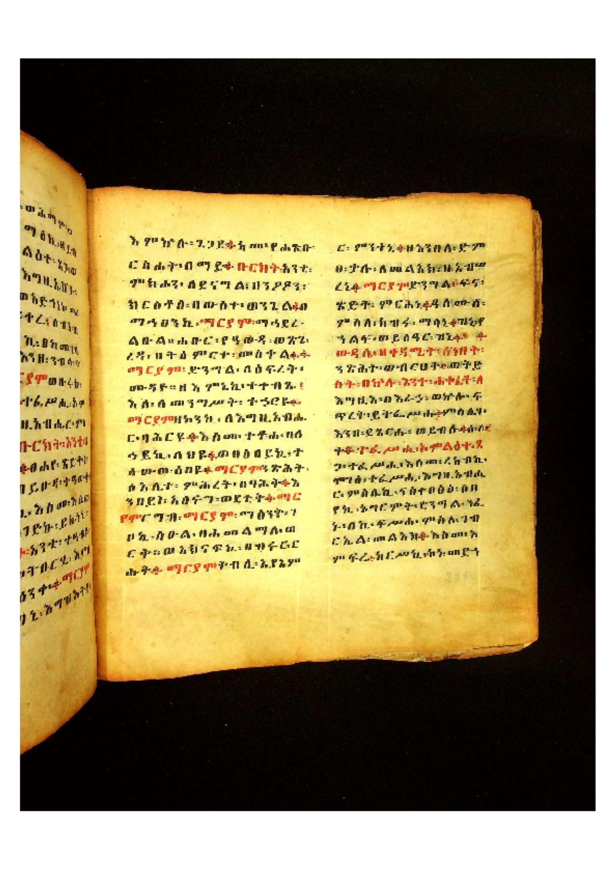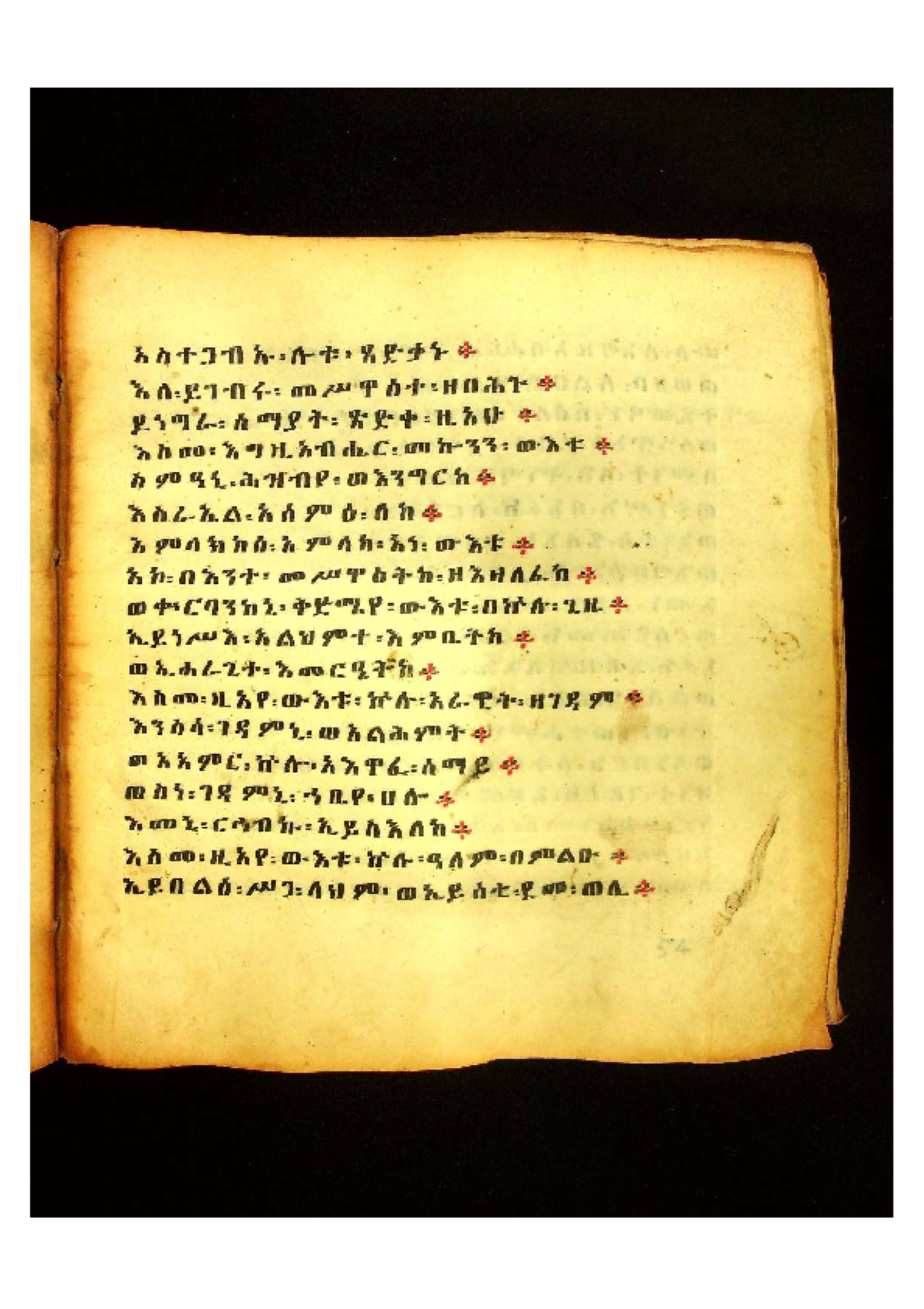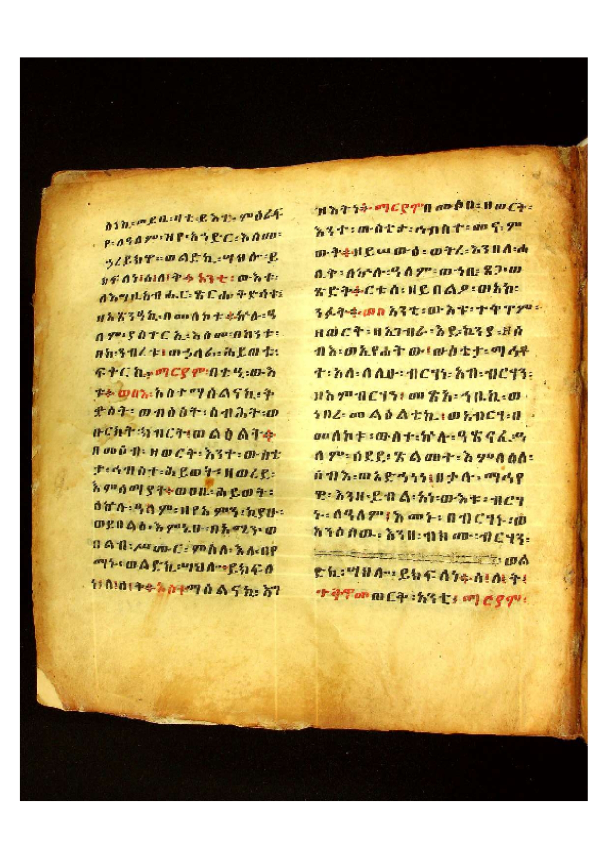 1. F. 2r: donation note written vertically in the outer margin, in black ink: “alla famiglia Bruschettini, Pussy […] Battaglia dell’Amba Aradam il 16 febbraio 1936 XIV”. The note, written in Italian and partly illegible, indicates the Bruschettini family as the receiver of the book and mentions the Battle of Amba Aradam, which took place on 16 February 1936. 2. F. 5r: note written in Italian in the outer upper margin, in red pencil: “Amba Aradam 16/2/XIV ore 17.30 P. Paloboni (?)”. This note also mentions the Battle of Amba Aradam, together with an individual whose name is partially unclear (P. Paloboni?). 3. F. 173v: supplication note written in small script in a mediocre hand, at the end of the “Psalms of David”: ዕቀበኒ፡ እምዓይነ፡ ደዌ፡ ወሞት፡ ለገብርከ፡ ደቅስዮስ፡, “protect me, your servant Däqsəyos, from the eye of infirmity and death”. The note mentions a certain Däqsəyos, indicated as “your servant” (possibly a later owner of the codex). 4. F. 173v: incipit of the Gəʿəz and Amharic prayer, perhaps a writing exercise. The note is written in an inaccurate calligraphy on the outer margin of the folio, next to the prayer. The entire text is የህፂ፡ ኖኅን፡ ከማየ[፡] አይኅ። እስራኤልን፡ ከፈርዖን፡ ዳዊትን፡ ከሳኦል፡ ከኢሎፍሊ። ኤ. 5. F. 190v: donation note, written in black ink in a mediocre hand. Text: ዝመጽሐፍ፡ ዘደብተራ፡ ኪሮስ፡ ዘወሀቦ፡ ለታቦተ፡ ሚካኤል፡ ኢትርስዑኒ፡ በአቡነ፡ ዘበሰማያት፡ ዘአቡየ፡ ገብረ፡ ማርያም፡ ወለእምየ፡ ወለተ፡ ሩፋኤል፡, “This book belongs to däbtära Kiros, who donated it to the tabot of [the church of St] Michael. Do not forget me for our Father who is in heaven. [It also belongs] to my father Gäbrä Maryam and my mother Wälättä Rufaʾel”. 6. F. 199v: writings executed in an inaccurate hand, perhaps the same of note 4. The note includes pen trials (ፈቲነ፡ ብርዕ፡ ዘፈረና፡ etc.), reproduces the explicit of the “Song of the songs” (ስብሐታተኪ፡ ማርያም፡ ከመ፡ እንተ፡ ሕልቀት፡ etc.) and the incipit of the “Praise of Mary” (ውዳሴ፡ ዘሰኑይ፡ ፈቀደ፡ እግዚእ፡ etc., partly rubricated). The writings also mention Däqsəyos, indicated as “your servant” (possibly a later owner of the codex) 7. F. 220ra–va: Genealogic note written on two columns. The note illustrates the family tree of King Yoḥannǝs I, who reigned from 1667 to 1682. The text is acephalous. Incipit: [ወለ]ደ፡ እምሐና፡ ብእሲቱ፡ አሦተ፡ ቅዱሳንሃ፡ ወአሦተ፡ ቅዱሳንኒ፡ እምነ፡ ጳውሊ፡ ብእሲሃ፡ ወለደቶሙ፡ ለአቤተኁን፡ ማእምሮ፡ ወለዘሥላሴ፡ ወአቤተኁን፡ ማእምሮኒ፡ ወለደ፡ አቃርዮስ፡ ወአቃርዮስኒ፡ ወለደ፡ እመቤት፡ እኅተ፡ ክርስቶስሃ፡. The text is published and translated in Proverbio D.V., 2000, ‘Inventario sommario dei manoscritti arabi, ebraici, etiopici – con notizia dei turchi – conservati presso la Biblioteca della Badia di Grottaferrata’. Atti della Accademia nazionale dei Lincei, Memorie, Classe di scienze morali, storiche e filologiche, serie IX, 12 (2000), 468–570 (here pp. 496–97, Appendice III). 8. F. 220va–b: Protective prayer against snakes, written on two columns. Incipit: በስመ፡ አብ፡ … ጸሎት፡ በእንተ፡ ዓርዌ፡ ምድር። ሶበ፡ በጽሐ፡ መልእክት፡ ሐሰውከ፡ በል፡ ፫ጊዜ፡ አኂዘከ፡ ዘፈረ፡ ልብሰ፡ ለእመ፡ ሀሎ፡ ርሑቀ፡ አስትዮ፡. The prayer is probably written in the same hand of note 7. 9. F. 220vb: Unidentified magic prayer containing asmat-names. Incipit: በስመ፡ አብ፡ … ኦላዘላህም፡ አህጉረ፡ ቀዳ[.]፡ ፍሖም፡ ሊስ፡ አፍሊስ፡ ምልክዮስ፡ ዘ[..]ማኤል፡ በዝንቱ፡ አስማቲከ፡ [.]ጽ[..] ኃይለ፡ በረድ፡ ወነፋስ፡ ከማሁ፡. |