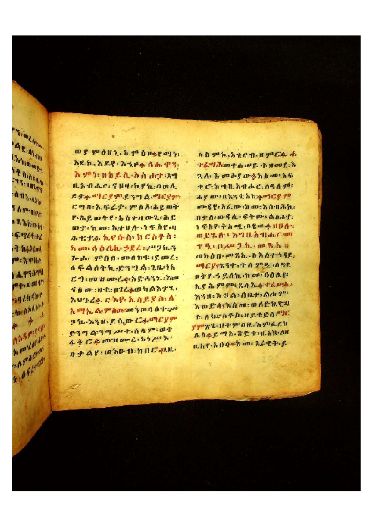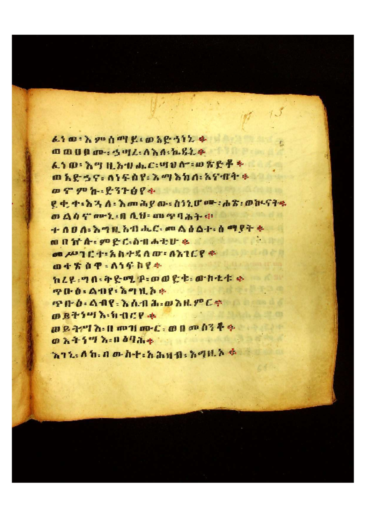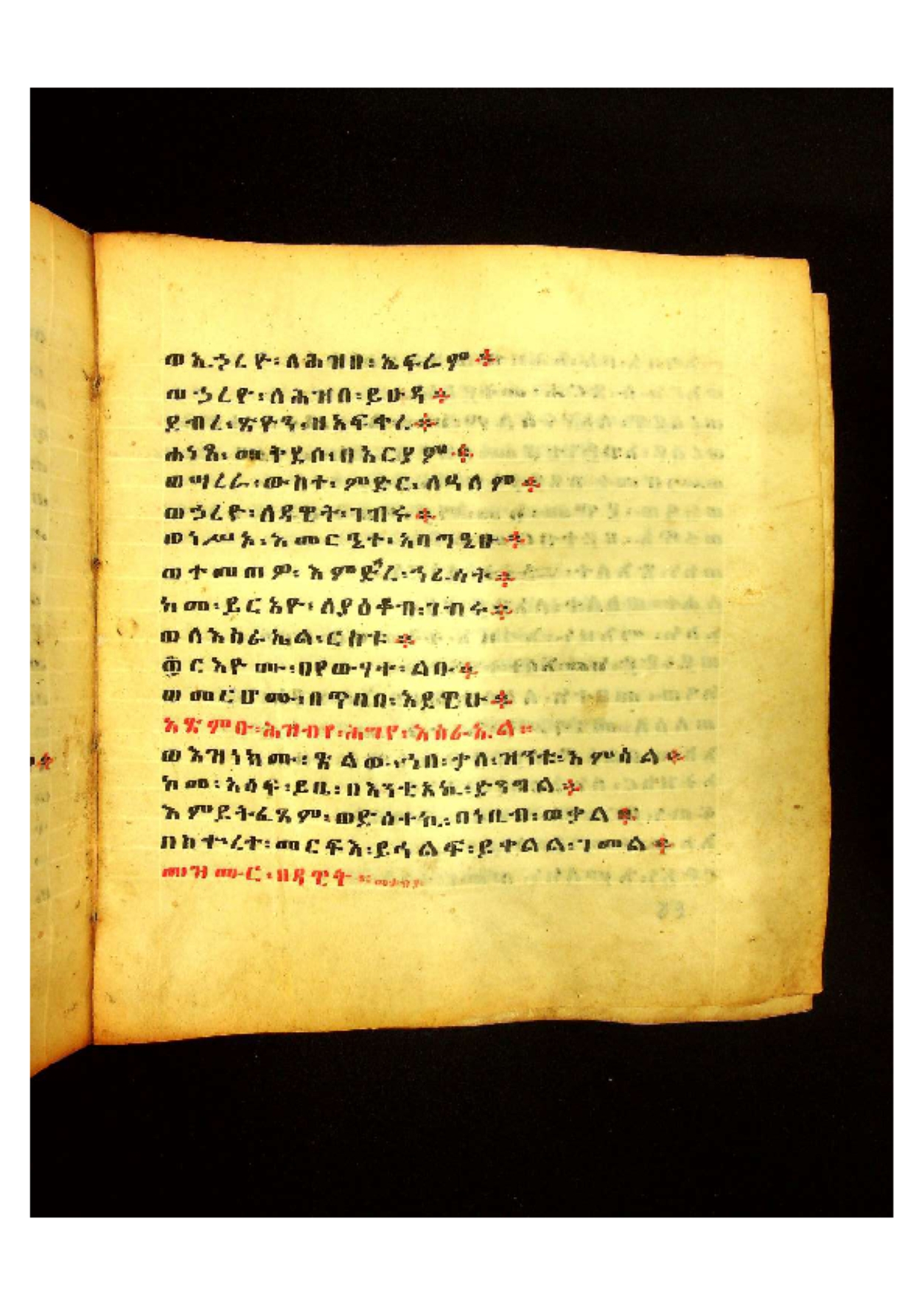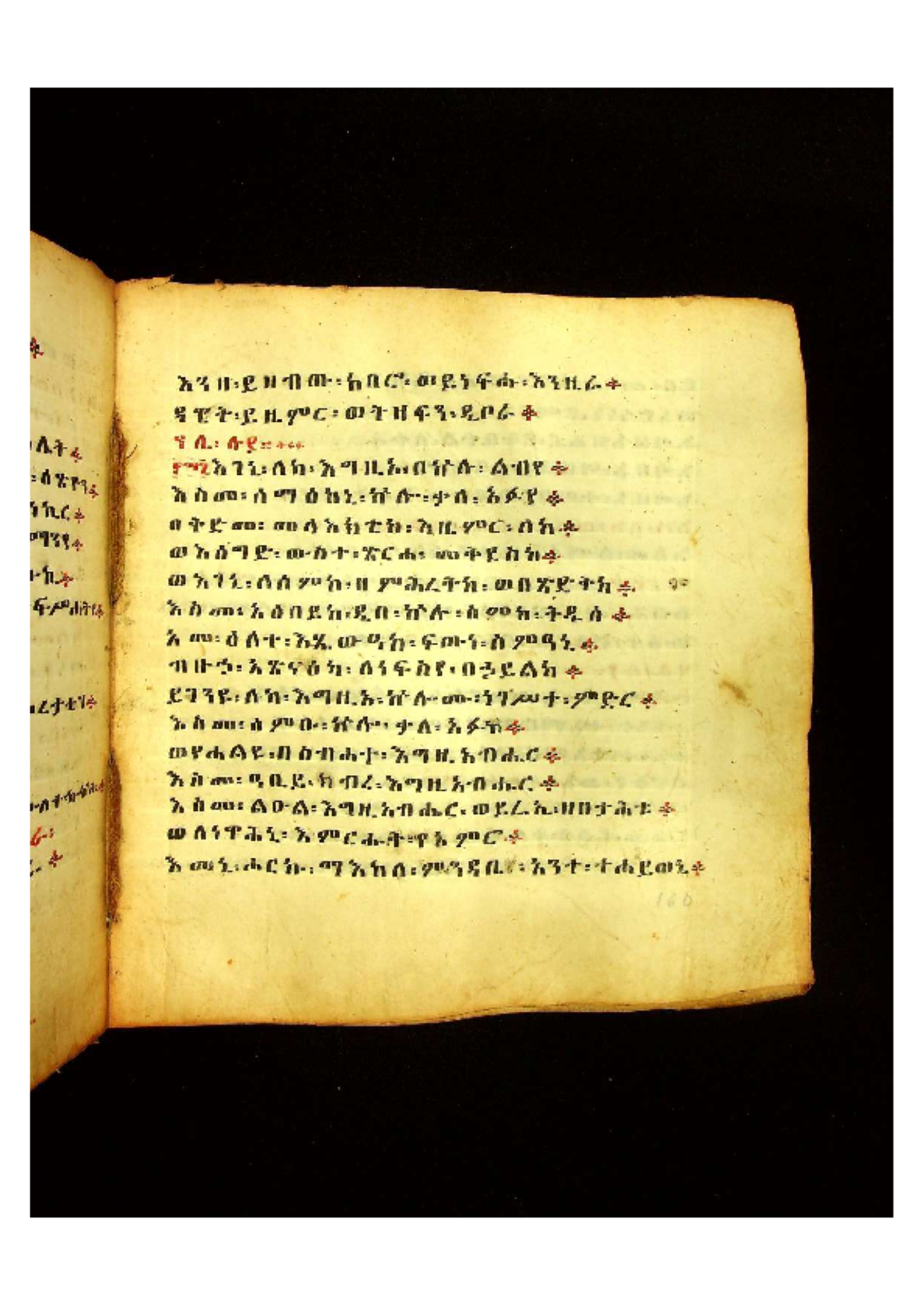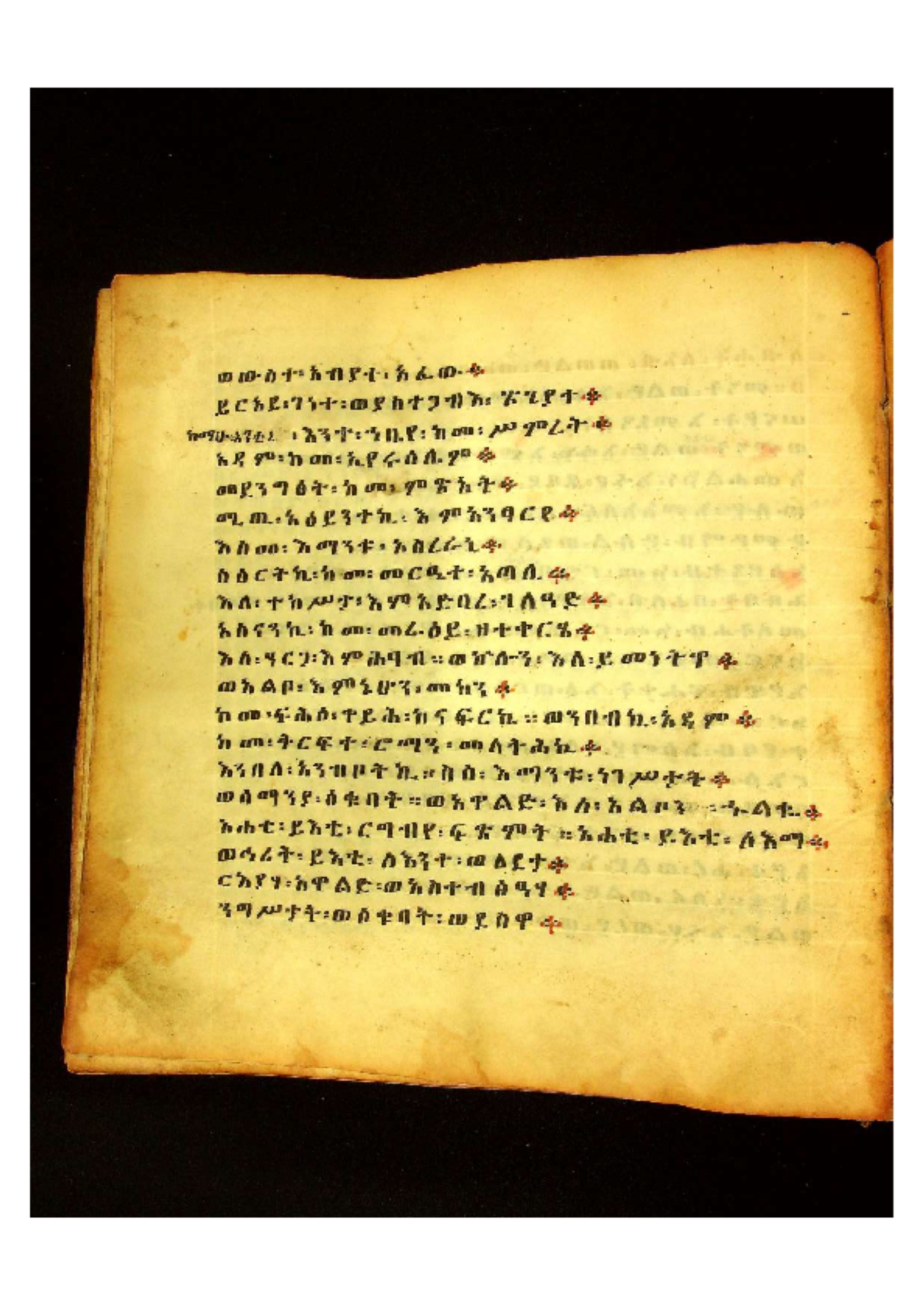 1. F. 2r: donation note written vertically in the outer margin, in black ink: “alla famiglia Bruschettini, Pussy […] Battaglia dell’Amba Aradam il 16 febbraio 1936 XIV”. The note, written in Italian and partly illegible, indicates the Bruschettini family as the receiver of the book and mentions the Battle of Amba Aradam, which took place on 16 February 1936. 2. F. 5r: note written in Italian in the outer upper margin, in red pencil: “Amba Aradam 16/2/XIV ore 17.30 P. Paloboni (?)”. This note also mentions the Battle of Amba Aradam, together with an individual whose name is partially unclear (P. Paloboni?). 3. F. 173v: supplication note written in small script in a mediocre hand, at the end of the “Psalms of David”: ዕቀበኒ፡ እምዓይነ፡ ደዌ፡ ወሞት፡ ለገብርከ፡ ደቅስዮስ፡, “protect me, your servant Däqsəyos, from the eye of infirmity and death”. The note mentions a certain Däqsəyos, indicated as “your servant” (possibly a later owner of the codex). 4. F. 173v: incipit of the Gəʿəz and Amharic prayer, perhaps a writing exercise. The note is written in an inaccurate calligraphy on the outer margin of the folio, next to the prayer. The entire text is የህፂ፡ ኖኅን፡ ከማየ[፡] አይኅ። እስራኤልን፡ ከፈርዖን፡ ዳዊትን፡ ከሳኦል፡ ከኢሎፍሊ። ኤ. 5. F. 190v: donation note, written in black ink in a mediocre hand. Text: ዝመጽሐፍ፡ ዘደብተራ፡ ኪሮስ፡ ዘወሀቦ፡ ለታቦተ፡ ሚካኤል፡ ኢትርስዑኒ፡ በአቡነ፡ ዘበሰማያት፡ ዘአቡየ፡ ገብረ፡ ማርያም፡ ወለእምየ፡ ወለተ፡ ሩፋኤል፡, “This book belongs to däbtära Kiros, who donated it to the tabot of [the church of St] Michael. Do not forget me for our Father who is in heaven. [It also belongs] to my father Gäbrä Maryam and my mother Wälättä Rufaʾel”. 6. F. 199v: writings executed in an inaccurate hand, perhaps the same of note 4. The note includes pen trials (ፈቲነ፡ ብርዕ፡ ዘፈረና፡ etc.), reproduces the explicit of the “Song of the songs” (ስብሐታተኪ፡ ማርያም፡ ከመ፡ እንተ፡ ሕልቀት፡ etc.) and the incipit of the “Praise of Mary” (ውዳሴ፡ ዘሰኑይ፡ ፈቀደ፡ እግዚእ፡ etc., partly rubricated). The writings also mention Däqsəyos, indicated as “your servant” (possibly a later owner of the codex) 7. F. 220ra–va: Genealogic note written on two columns. The note illustrates the family tree of King Yoḥannǝs I, who reigned from 1667 to 1682. The text is acephalous. Incipit: [ወለ]ደ፡ እምሐና፡ ብእሲቱ፡ አሦተ፡ ቅዱሳንሃ፡ ወአሦተ፡ ቅዱሳንኒ፡ እምነ፡ ጳውሊ፡ ብእሲሃ፡ ወለደቶሙ፡ ለአቤተኁን፡ ማእምሮ፡ ወለዘሥላሴ፡ ወአቤተኁን፡ ማእምሮኒ፡ ወለደ፡ አቃርዮስ፡ ወአቃርዮስኒ፡ ወለደ፡ እመቤት፡ እኅተ፡ ክርስቶስሃ፡. The text is published and translated in Proverbio D.V., 2000, ‘Inventario sommario dei manoscritti arabi, ebraici, etiopici – con notizia dei turchi – conservati presso la Biblioteca della Badia di Grottaferrata’. Atti della Accademia nazionale dei Lincei, Memorie, Classe di scienze morali, storiche e filologiche, serie IX, 12 (2000), 468–570 (here pp. 496–97, Appendice III). 8. F. 220va–b: Protective prayer against snakes, written on two columns. Incipit: በስመ፡ አብ፡ … ጸሎት፡ በእንተ፡ ዓርዌ፡ ምድር። ሶበ፡ በጽሐ፡ መልእክት፡ ሐሰውከ፡ በል፡ ፫ጊዜ፡ አኂዘከ፡ ዘፈረ፡ ልብሰ፡ ለእመ፡ ሀሎ፡ ርሑቀ፡ አስትዮ፡. The prayer is probably written in the same hand of note 7. 9. F. 220vb: Unidentified magic prayer containing asmat-names. Incipit: በስመ፡ አብ፡ … ኦላዘላህም፡ አህጉረ፡ ቀዳ[.]፡ ፍሖም፡ ሊስ፡ አፍሊስ፡ ምልክዮስ፡ ዘ[..]ማኤል፡ በዝንቱ፡ አስማቲከ፡ [.]ጽ[..] ኃይለ፡ በረድ፡ ወነፋስ፡ ከማሁ፡. |