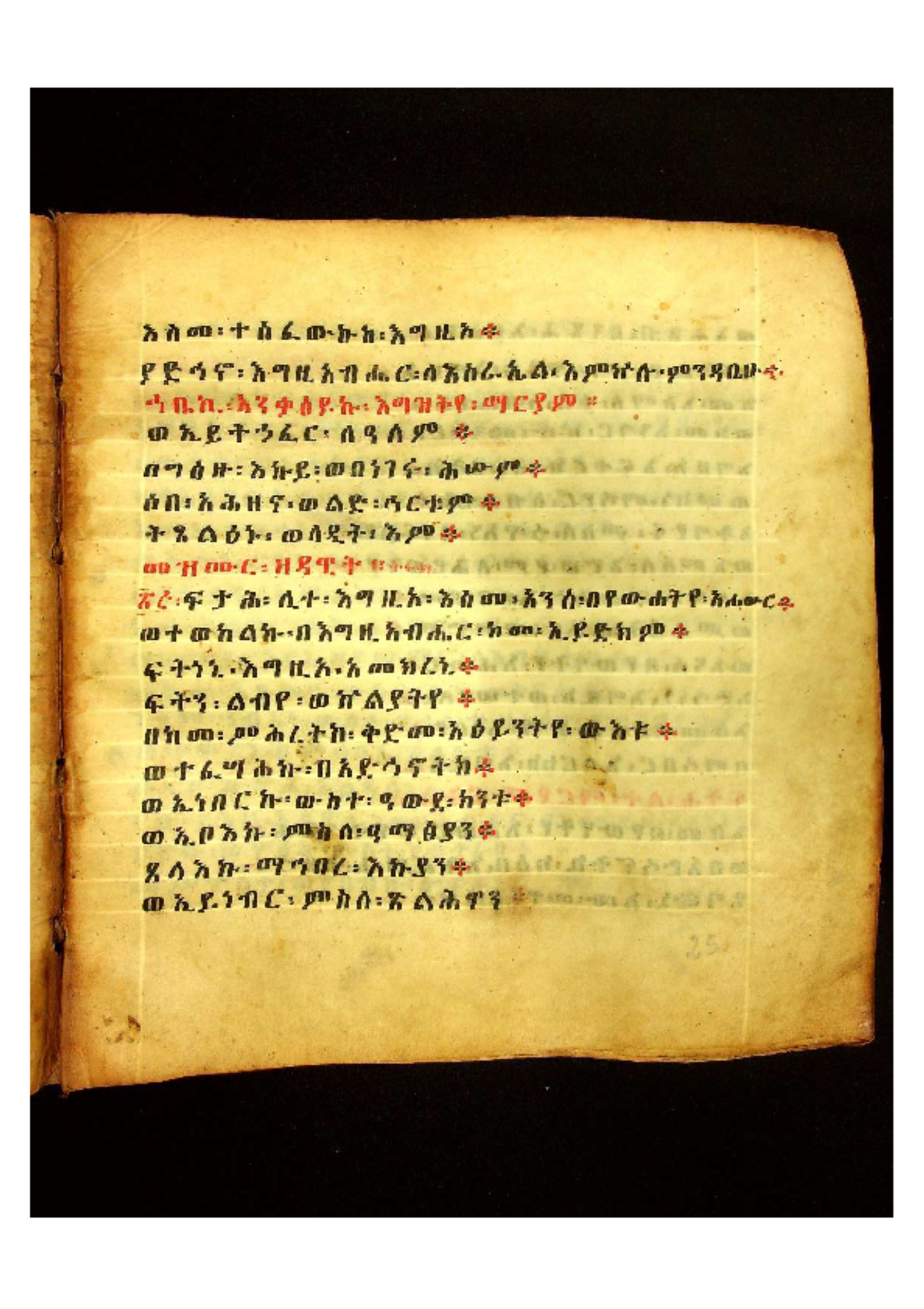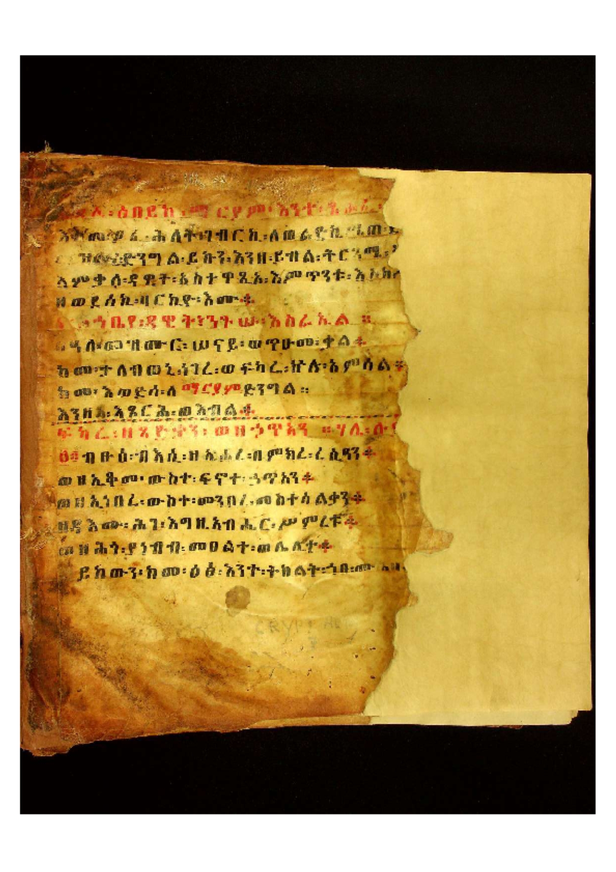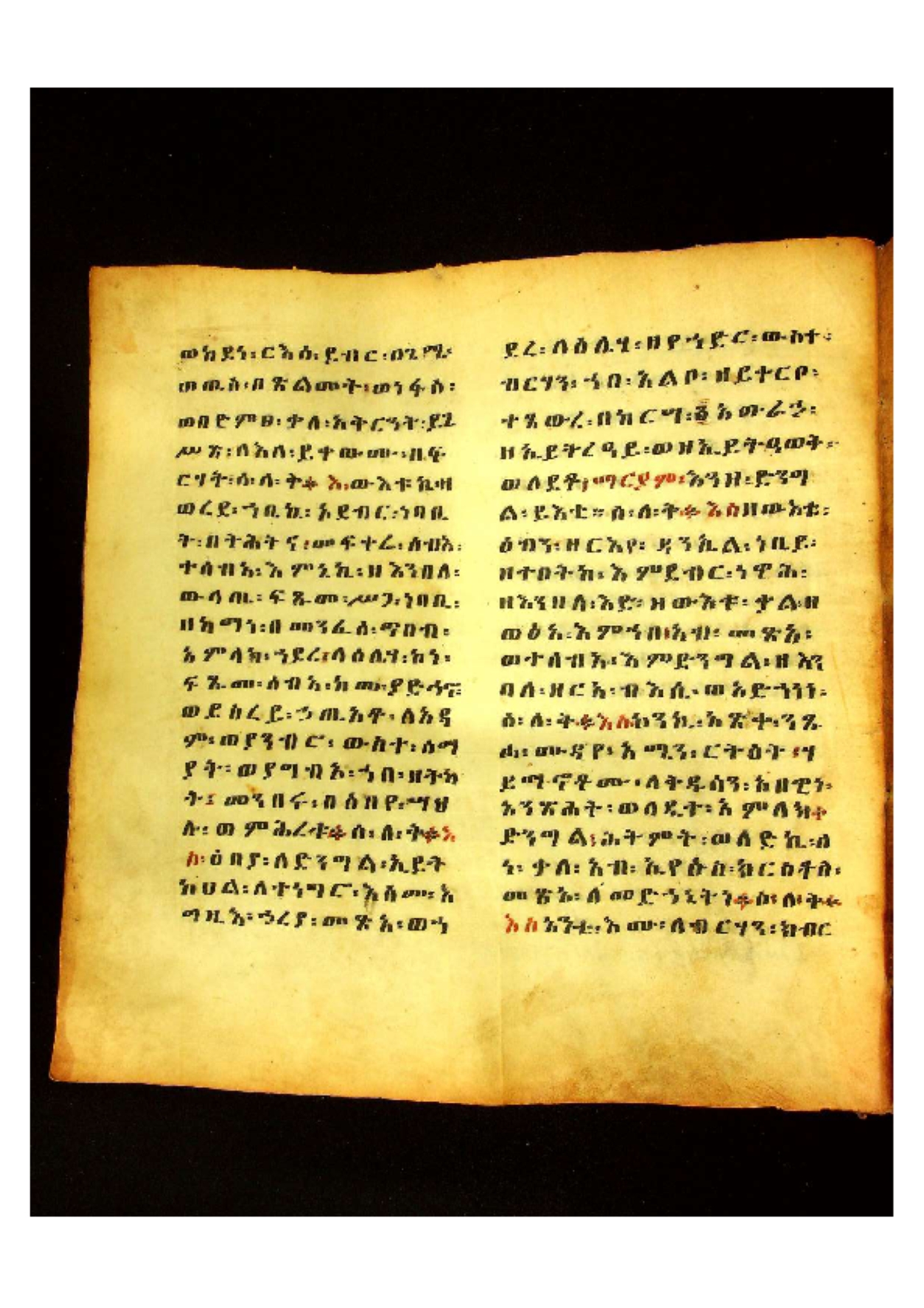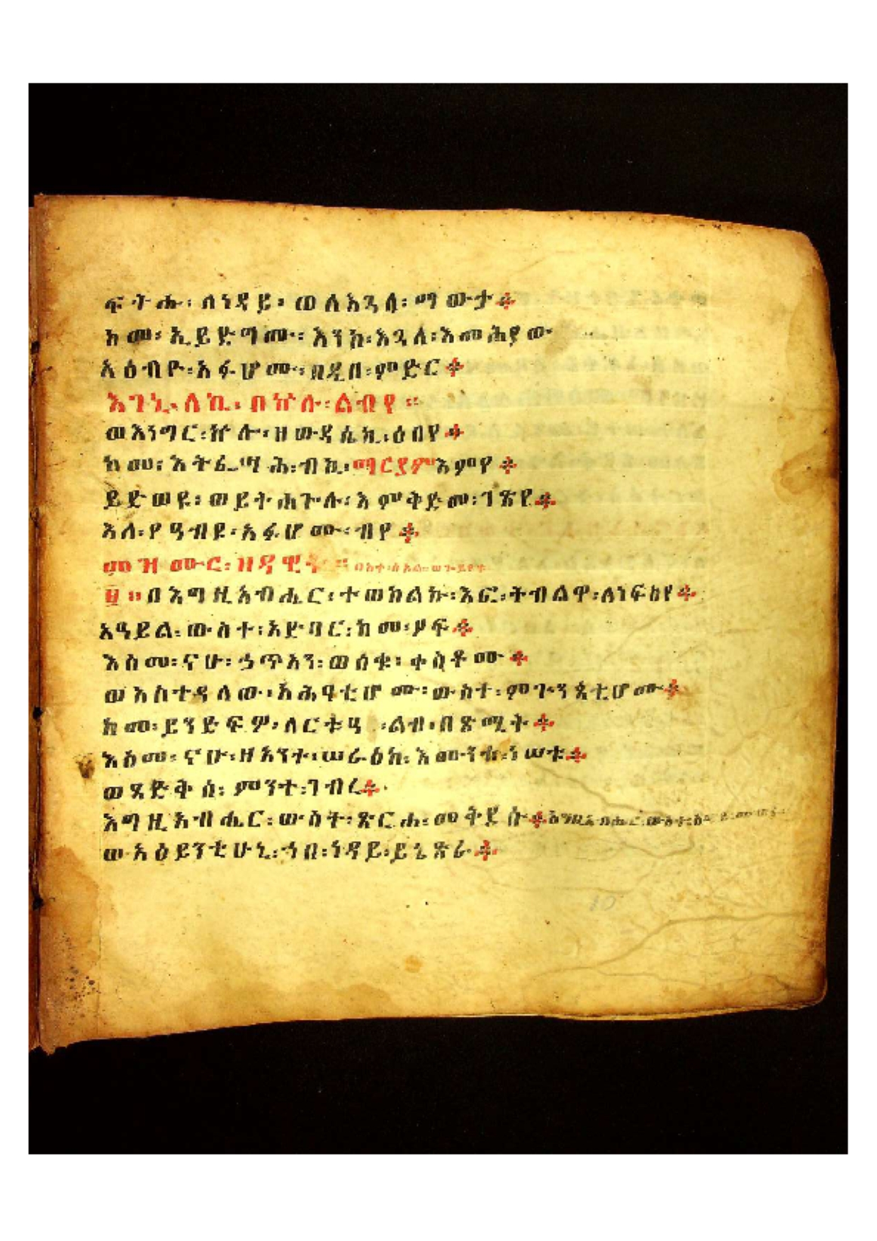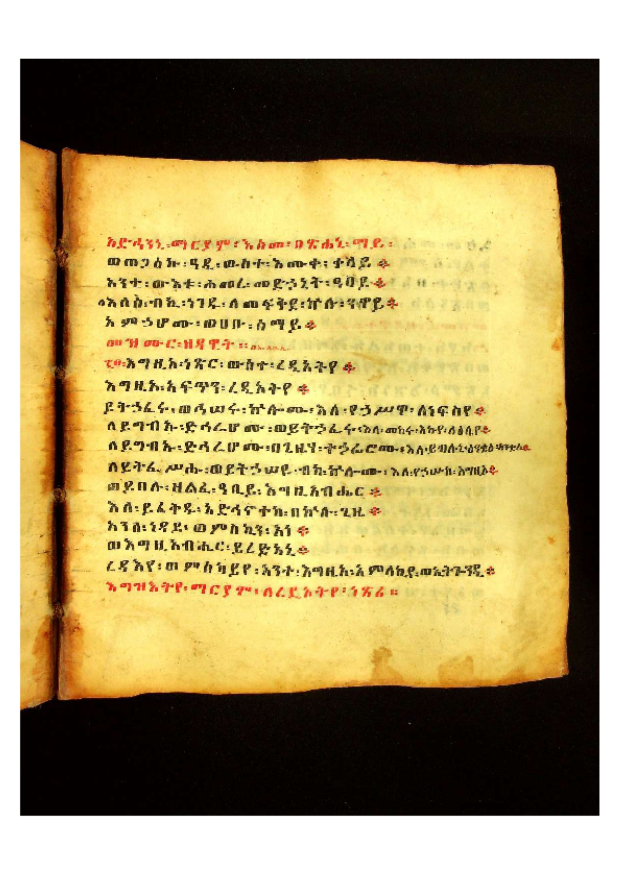 1. F. 2r: donation note written vertically in the outer margin, in black ink: “alla famiglia Bruschettini, Pussy […] Battaglia dell’Amba Aradam il 16 febbraio 1936 XIV”. The note, written in Italian and partly illegible, indicates the Bruschettini family as the receiver of the book and mentions the Battle of Amba Aradam, which took place on 16 February 1936. 2. F. 5r: note written in Italian in the outer upper margin, in red pencil: “Amba Aradam 16/2/XIV ore 17.30 P. Paloboni (?)”. This note also mentions the Battle of Amba Aradam, together with an individual whose name is partially unclear (P. Paloboni?). 3. F. 173v: supplication note written in small script in a mediocre hand, at the end of the “Psalms of David”: ዕቀበኒ፡ እምዓይነ፡ ደዌ፡ ወሞት፡ ለገብርከ፡ ደቅስዮስ፡, “protect me, your servant Däqsəyos, from the eye of infirmity and death”. The note mentions a certain Däqsəyos, indicated as “your servant” (possibly a later owner of the codex). 4. F. 173v: incipit of the Gəʿəz and Amharic prayer, perhaps a writing exercise. The note is written in an inaccurate calligraphy on the outer margin of the folio, next to the prayer. The entire text is የህፂ፡ ኖኅን፡ ከማየ[፡] አይኅ። እስራኤልን፡ ከፈርዖን፡ ዳዊትን፡ ከሳኦል፡ ከኢሎፍሊ። ኤ. 5. F. 190v: donation note, written in black ink in a mediocre hand. Text: ዝመጽሐፍ፡ ዘደብተራ፡ ኪሮስ፡ ዘወሀቦ፡ ለታቦተ፡ ሚካኤል፡ ኢትርስዑኒ፡ በአቡነ፡ ዘበሰማያት፡ ዘአቡየ፡ ገብረ፡ ማርያም፡ ወለእምየ፡ ወለተ፡ ሩፋኤል፡, “This book belongs to däbtära Kiros, who donated it to the tabot of [the church of St] Michael. Do not forget me for our Father who is in heaven. [It also belongs] to my father Gäbrä Maryam and my mother Wälättä Rufaʾel”. 6. F. 199v: writings executed in an inaccurate hand, perhaps the same of note 4. The note includes pen trials (ፈቲነ፡ ብርዕ፡ ዘፈረና፡ etc.), reproduces the explicit of the “Song of the songs” (ስብሐታተኪ፡ ማርያም፡ ከመ፡ እንተ፡ ሕልቀት፡ etc.) and the incipit of the “Praise of Mary” (ውዳሴ፡ ዘሰኑይ፡ ፈቀደ፡ እግዚእ፡ etc., partly rubricated). The writings also mention Däqsəyos, indicated as “your servant” (possibly a later owner of the codex) 7. F. 220ra–va: Genealogic note written on two columns. The note illustrates the family tree of King Yoḥannǝs I, who reigned from 1667 to 1682. The text is acephalous. Incipit: [ወለ]ደ፡ እምሐና፡ ብእሲቱ፡ አሦተ፡ ቅዱሳንሃ፡ ወአሦተ፡ ቅዱሳንኒ፡ እምነ፡ ጳውሊ፡ ብእሲሃ፡ ወለደቶሙ፡ ለአቤተኁን፡ ማእምሮ፡ ወለዘሥላሴ፡ ወአቤተኁን፡ ማእምሮኒ፡ ወለደ፡ አቃርዮስ፡ ወአቃርዮስኒ፡ ወለደ፡ እመቤት፡ እኅተ፡ ክርስቶስሃ፡. The text is published and translated in Proverbio D.V., 2000, ‘Inventario sommario dei manoscritti arabi, ebraici, etiopici – con notizia dei turchi – conservati presso la Biblioteca della Badia di Grottaferrata’. Atti della Accademia nazionale dei Lincei, Memorie, Classe di scienze morali, storiche e filologiche, serie IX, 12 (2000), 468–570 (here pp. 496–97, Appendice III). 8. F. 220va–b: Protective prayer against snakes, written on two columns. Incipit: በስመ፡ አብ፡ … ጸሎት፡ በእንተ፡ ዓርዌ፡ ምድር። ሶበ፡ በጽሐ፡ መልእክት፡ ሐሰውከ፡ በል፡ ፫ጊዜ፡ አኂዘከ፡ ዘፈረ፡ ልብሰ፡ ለእመ፡ ሀሎ፡ ርሑቀ፡ አስትዮ፡. The prayer is probably written in the same hand of note 7. 9. F. 220vb: Unidentified magic prayer containing asmat-names. Incipit: በስመ፡ አብ፡ … ኦላዘላህም፡ አህጉረ፡ ቀዳ[.]፡ ፍሖም፡ ሊስ፡ አፍሊስ፡ ምልክዮስ፡ ዘ[..]ማኤል፡ በዝንቱ፡ አስማቲከ፡ [.]ጽ[..] ኃይለ፡ በረድ፡ ወነፋስ፡ ከማሁ፡. |