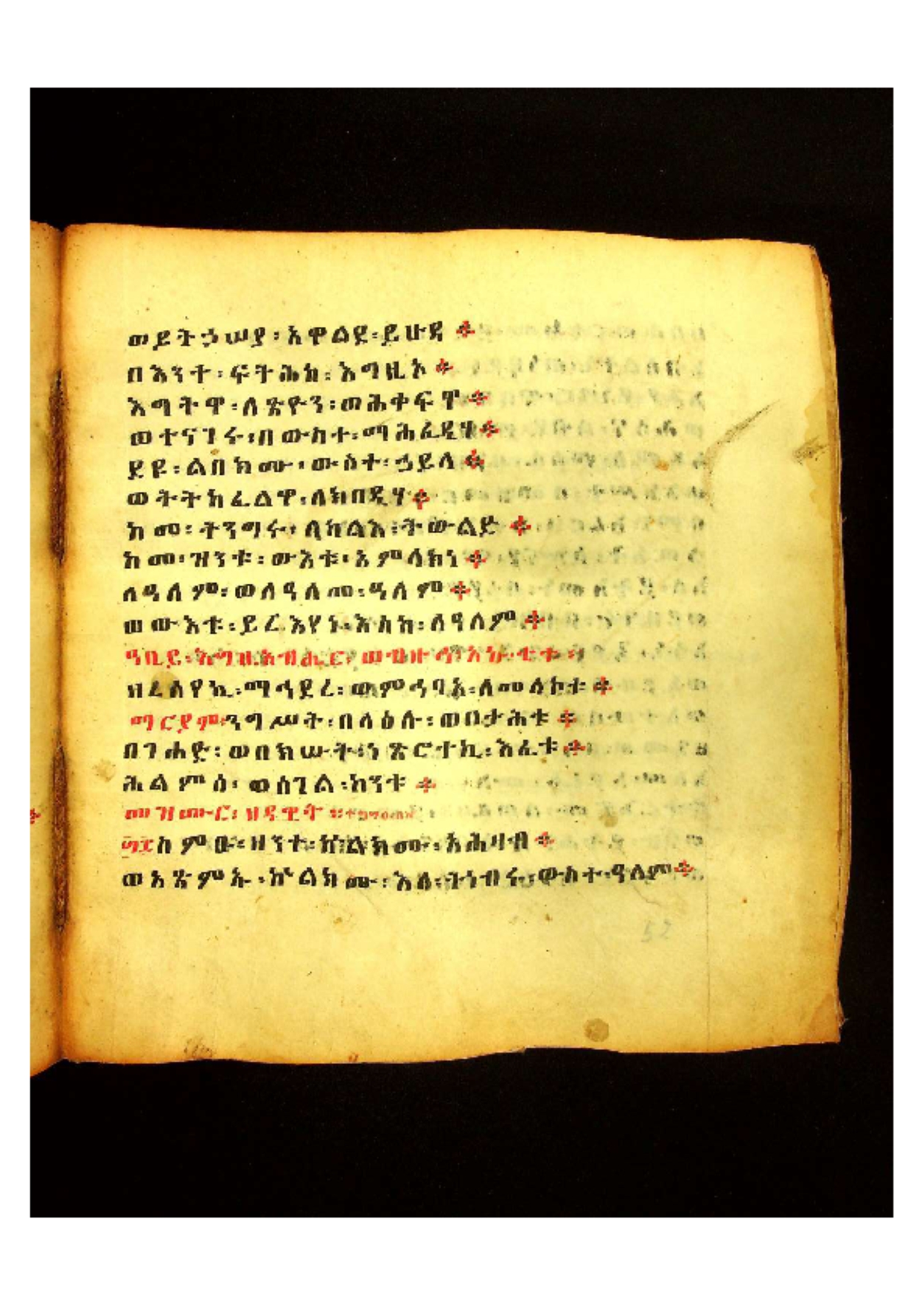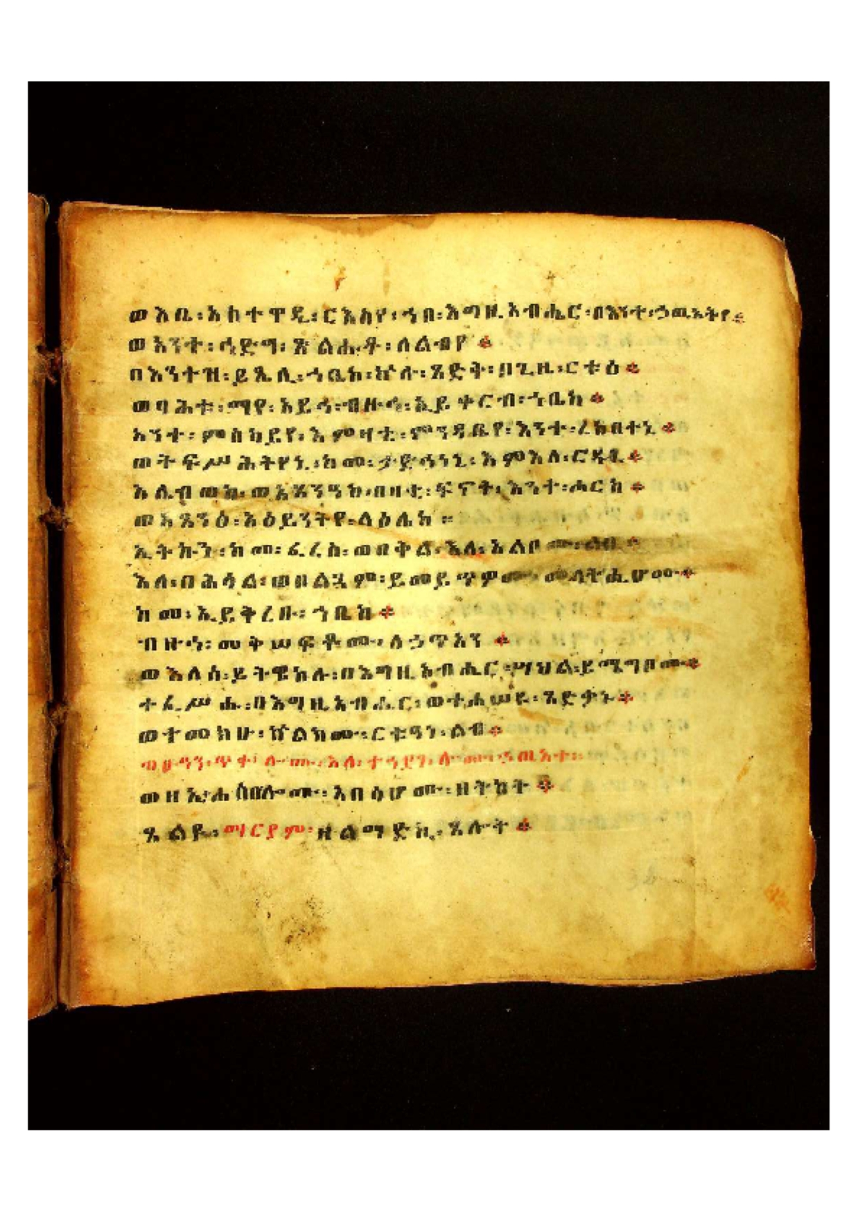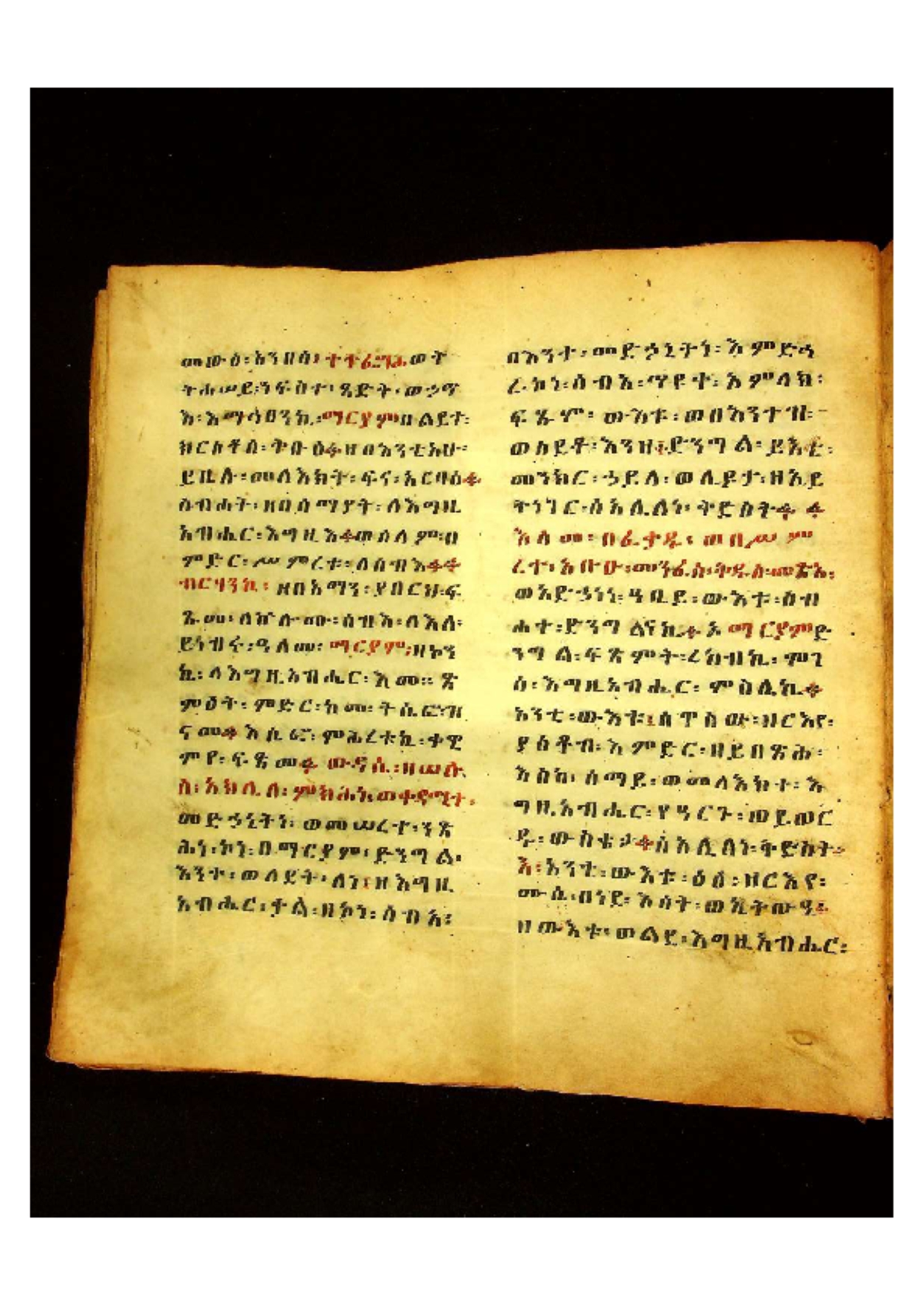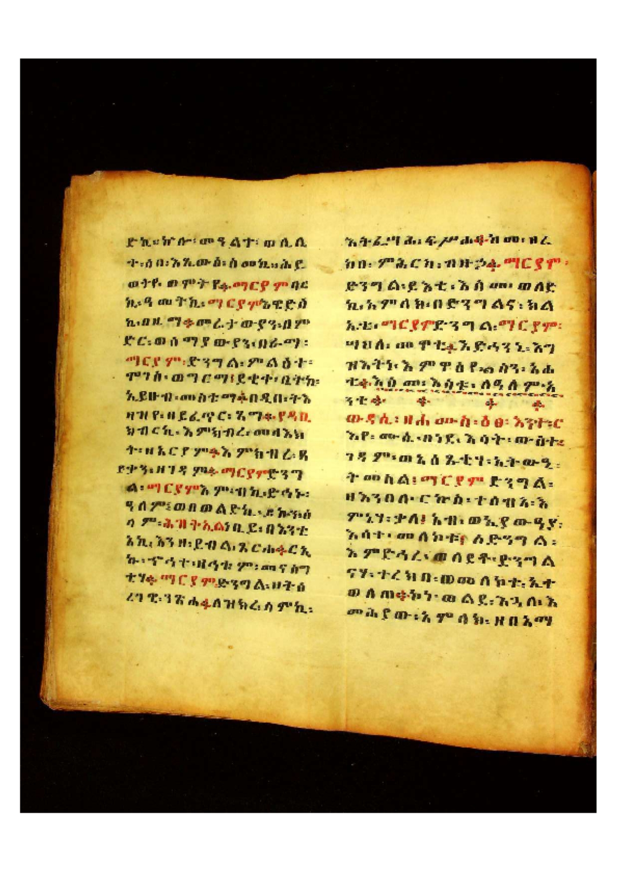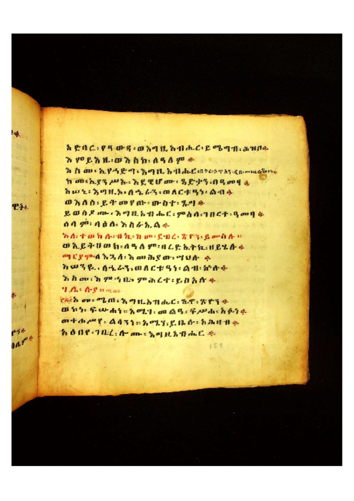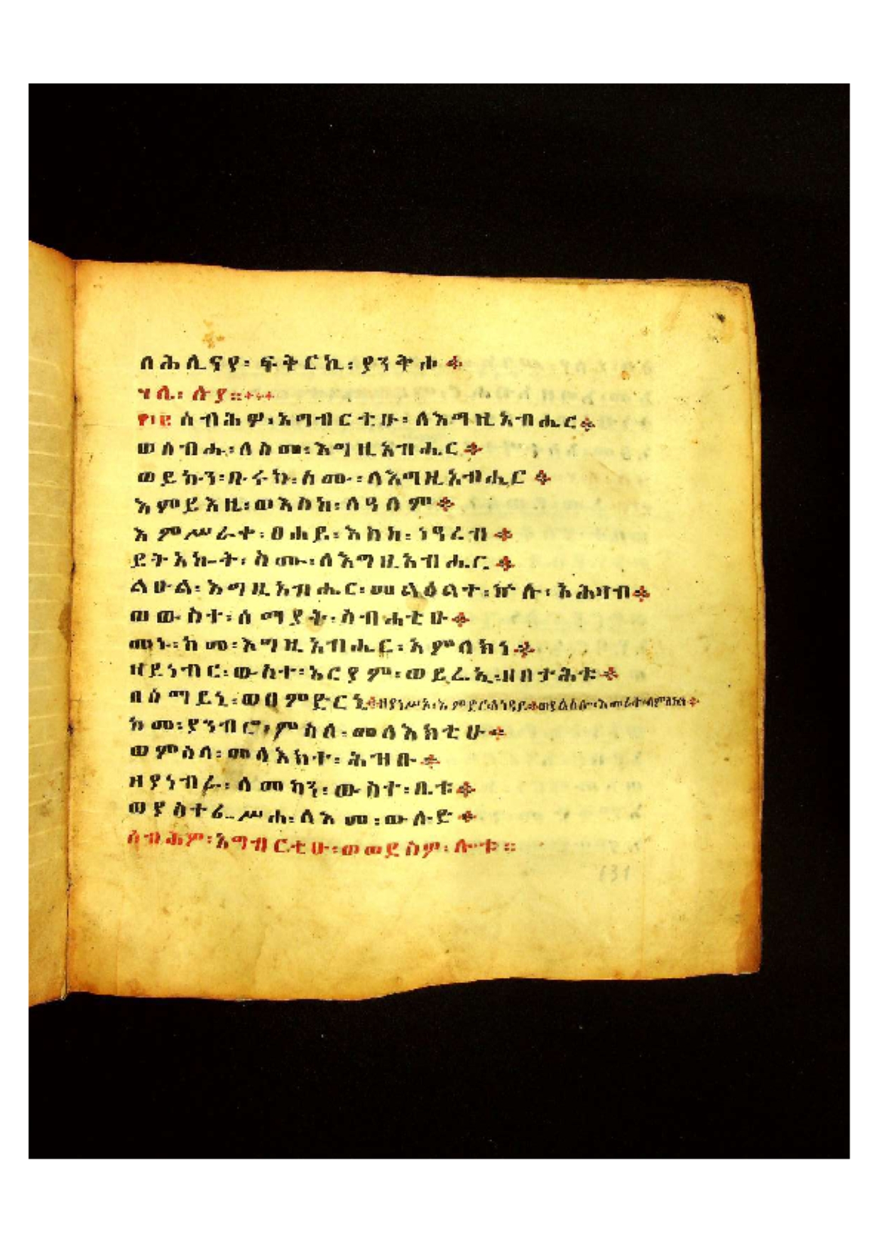 1. F. 2r: donation note written vertically in the outer margin, in black ink: “alla famiglia Bruschettini, Pussy […] Battaglia dell’Amba Aradam il 16 febbraio 1936 XIV”. The note, written in Italian and partly illegible, indicates the Bruschettini family as the receiver of the book and mentions the Battle of Amba Aradam, which took place on 16 February 1936. 2. F. 5r: note written in Italian in the outer upper margin, in red pencil: “Amba Aradam 16/2/XIV ore 17.30 P. Paloboni (?)”. This note also mentions the Battle of Amba Aradam, together with an individual whose name is partially unclear (P. Paloboni?). 3. F. 173v: supplication note written in small script in a mediocre hand, at the end of the “Psalms of David”: ዕቀበኒ፡ እምዓይነ፡ ደዌ፡ ወሞት፡ ለገብርከ፡ ደቅስዮስ፡, “protect me, your servant Däqsəyos, from the eye of infirmity and death”. The note mentions a certain Däqsəyos, indicated as “your servant” (possibly a later owner of the codex). 4. F. 173v: incipit of the Gəʿəz and Amharic prayer, perhaps a writing exercise. The note is written in an inaccurate calligraphy on the outer margin of the folio, next to the prayer. The entire text is የህፂ፡ ኖኅን፡ ከማየ[፡] አይኅ። እስራኤልን፡ ከፈርዖን፡ ዳዊትን፡ ከሳኦል፡ ከኢሎፍሊ። ኤ. 5. F. 190v: donation note, written in black ink in a mediocre hand. Text: ዝመጽሐፍ፡ ዘደብተራ፡ ኪሮስ፡ ዘወሀቦ፡ ለታቦተ፡ ሚካኤል፡ ኢትርስዑኒ፡ በአቡነ፡ ዘበሰማያት፡ ዘአቡየ፡ ገብረ፡ ማርያም፡ ወለእምየ፡ ወለተ፡ ሩፋኤል፡, “This book belongs to däbtära Kiros, who donated it to the tabot of [the church of St] Michael. Do not forget me for our Father who is in heaven. [It also belongs] to my father Gäbrä Maryam and my mother Wälättä Rufaʾel”. 6. F. 199v: writings executed in an inaccurate hand, perhaps the same of note 4. The note includes pen trials (ፈቲነ፡ ብርዕ፡ ዘፈረና፡ etc.), reproduces the explicit of the “Song of the songs” (ስብሐታተኪ፡ ማርያም፡ ከመ፡ እንተ፡ ሕልቀት፡ etc.) and the incipit of the “Praise of Mary” (ውዳሴ፡ ዘሰኑይ፡ ፈቀደ፡ እግዚእ፡ etc., partly rubricated). The writings also mention Däqsəyos, indicated as “your servant” (possibly a later owner of the codex) 7. F. 220ra–va: Genealogic note written on two columns. The note illustrates the family tree of King Yoḥannǝs I, who reigned from 1667 to 1682. The text is acephalous. Incipit: [ወለ]ደ፡ እምሐና፡ ብእሲቱ፡ አሦተ፡ ቅዱሳንሃ፡ ወአሦተ፡ ቅዱሳንኒ፡ እምነ፡ ጳውሊ፡ ብእሲሃ፡ ወለደቶሙ፡ ለአቤተኁን፡ ማእምሮ፡ ወለዘሥላሴ፡ ወአቤተኁን፡ ማእምሮኒ፡ ወለደ፡ አቃርዮስ፡ ወአቃርዮስኒ፡ ወለደ፡ እመቤት፡ እኅተ፡ ክርስቶስሃ፡. The text is published and translated in Proverbio D.V., 2000, ‘Inventario sommario dei manoscritti arabi, ebraici, etiopici – con notizia dei turchi – conservati presso la Biblioteca della Badia di Grottaferrata’. Atti della Accademia nazionale dei Lincei, Memorie, Classe di scienze morali, storiche e filologiche, serie IX, 12 (2000), 468–570 (here pp. 496–97, Appendice III). 8. F. 220va–b: Protective prayer against snakes, written on two columns. Incipit: በስመ፡ አብ፡ … ጸሎት፡ በእንተ፡ ዓርዌ፡ ምድር። ሶበ፡ በጽሐ፡ መልእክት፡ ሐሰውከ፡ በል፡ ፫ጊዜ፡ አኂዘከ፡ ዘፈረ፡ ልብሰ፡ ለእመ፡ ሀሎ፡ ርሑቀ፡ አስትዮ፡. The prayer is probably written in the same hand of note 7. 9. F. 220vb: Unidentified magic prayer containing asmat-names. Incipit: በስመ፡ አብ፡ … ኦላዘላህም፡ አህጉረ፡ ቀዳ[.]፡ ፍሖም፡ ሊስ፡ አፍሊስ፡ ምልክዮስ፡ ዘ[..]ማኤል፡ በዝንቱ፡ አስማቲከ፡ [.]ጽ[..] ኃይለ፡ በረድ፡ ወነፋስ፡ ከማሁ፡. |