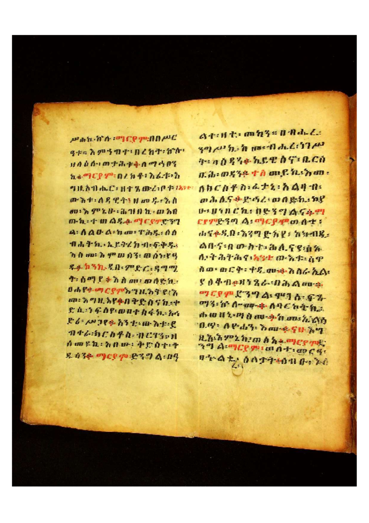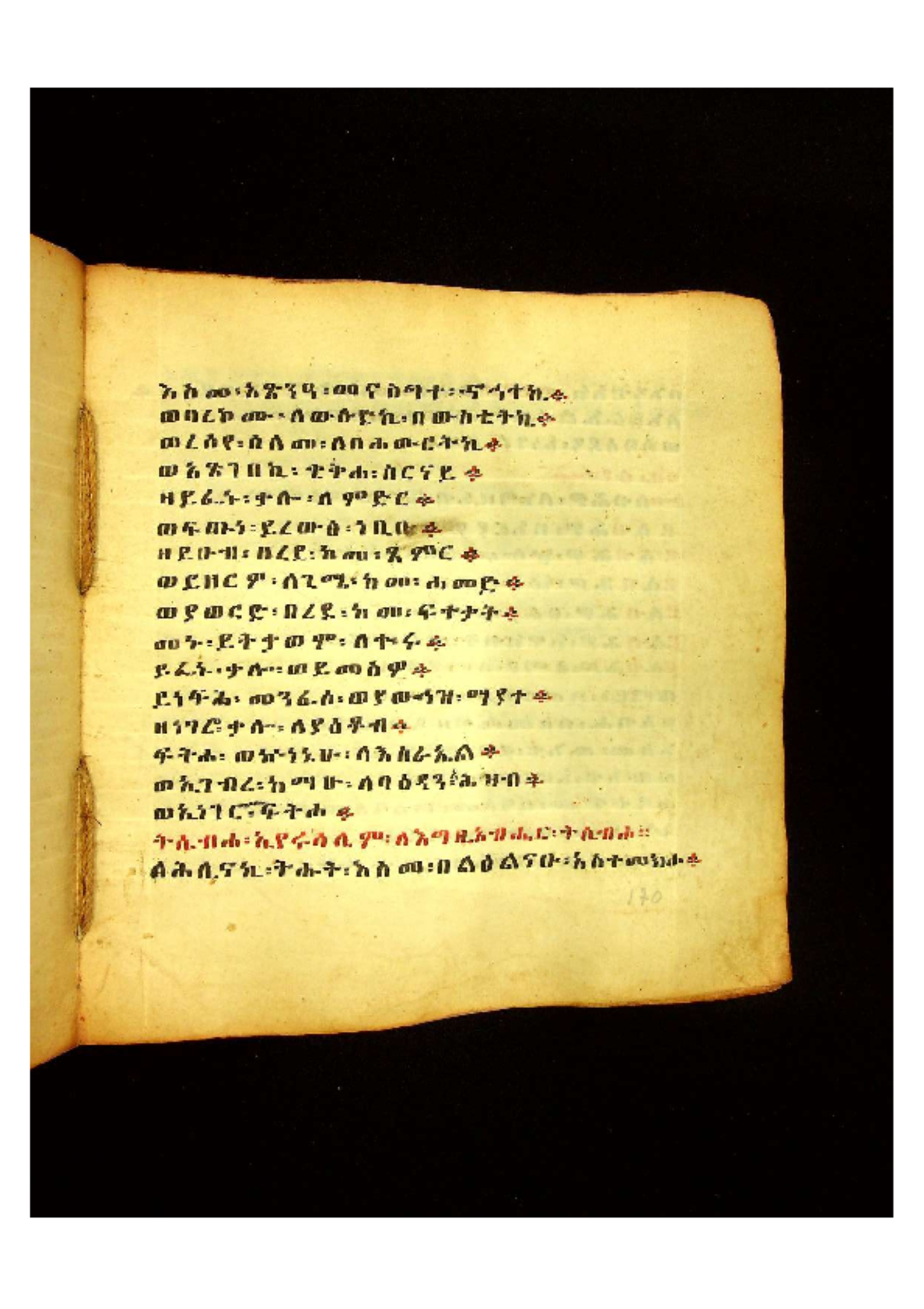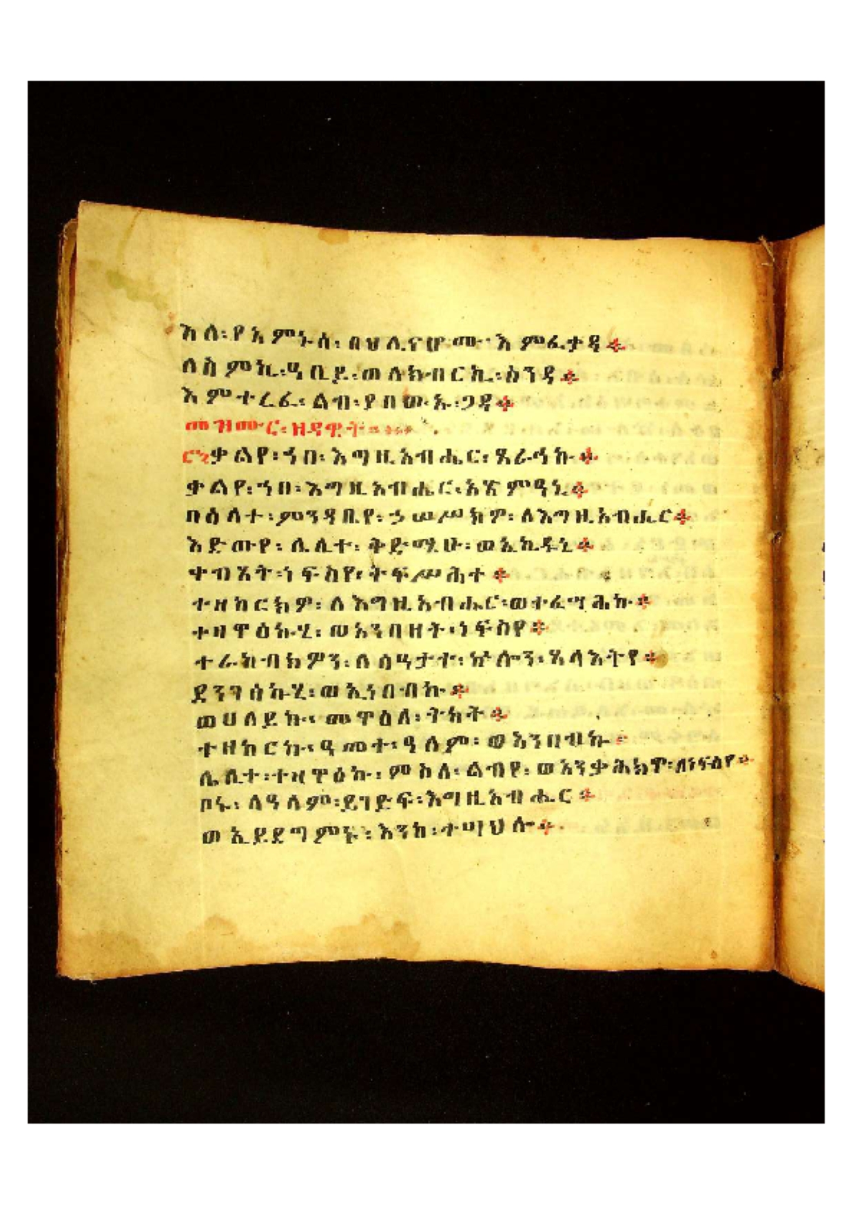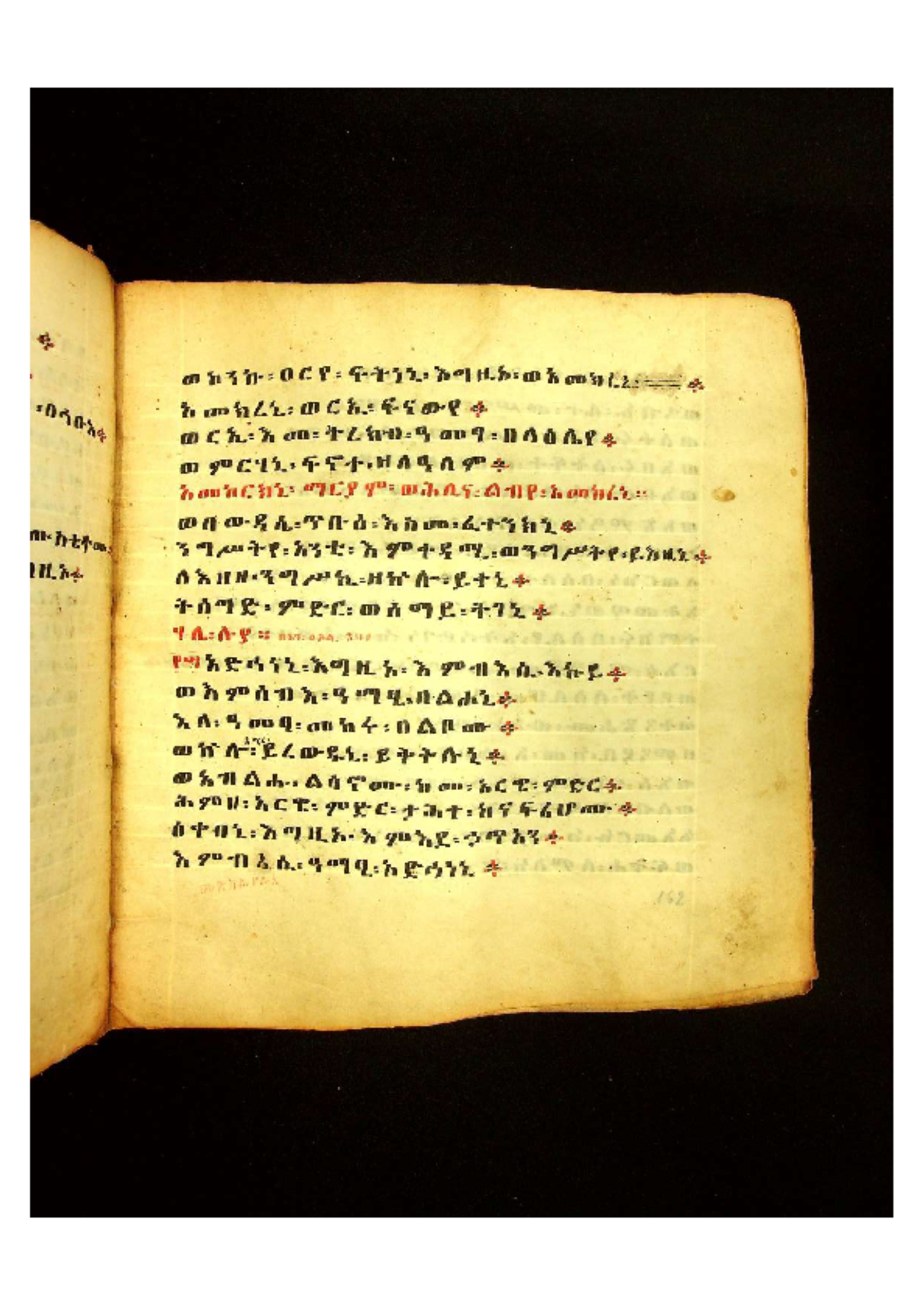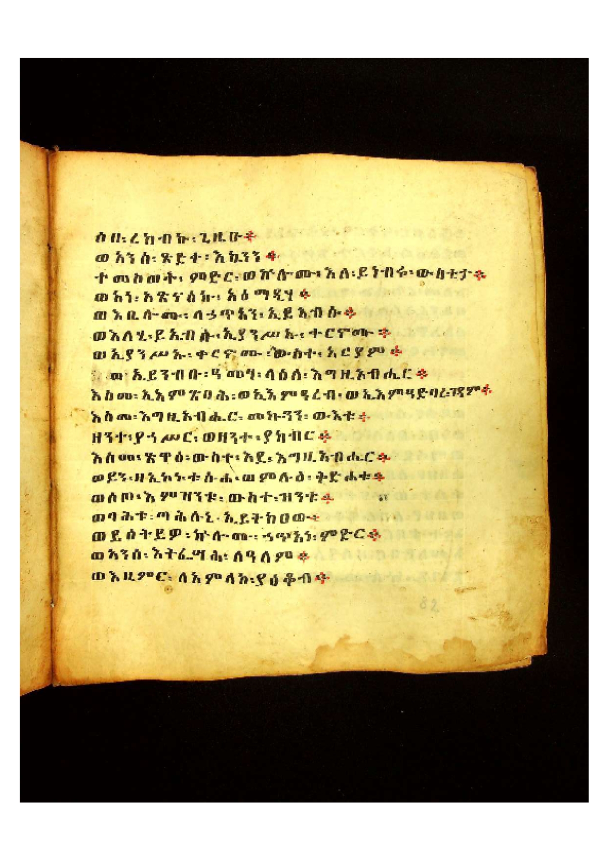 1. F. 2r: donation note written vertically in the outer margin, in black ink: “alla famiglia Bruschettini, Pussy […] Battaglia dell’Amba Aradam il 16 febbraio 1936 XIV”. The note, written in Italian and partly illegible, indicates the Bruschettini family as the receiver of the book and mentions the Battle of Amba Aradam, which took place on 16 February 1936. 2. F. 5r: note written in Italian in the outer upper margin, in red pencil: “Amba Aradam 16/2/XIV ore 17.30 P. Paloboni (?)”. This note also mentions the Battle of Amba Aradam, together with an individual whose name is partially unclear (P. Paloboni?). 3. F. 173v: supplication note written in small script in a mediocre hand, at the end of the “Psalms of David”: ዕቀበኒ፡ እምዓይነ፡ ደዌ፡ ወሞት፡ ለገብርከ፡ ደቅስዮስ፡, “protect me, your servant Däqsəyos, from the eye of infirmity and death”. The note mentions a certain Däqsəyos, indicated as “your servant” (possibly a later owner of the codex). 4. F. 173v: incipit of the Gəʿəz and Amharic prayer, perhaps a writing exercise. The note is written in an inaccurate calligraphy on the outer margin of the folio, next to the prayer. The entire text is የህፂ፡ ኖኅን፡ ከማየ[፡] አይኅ። እስራኤልን፡ ከፈርዖን፡ ዳዊትን፡ ከሳኦል፡ ከኢሎፍሊ። ኤ. 5. F. 190v: donation note, written in black ink in a mediocre hand. Text: ዝመጽሐፍ፡ ዘደብተራ፡ ኪሮስ፡ ዘወሀቦ፡ ለታቦተ፡ ሚካኤል፡ ኢትርስዑኒ፡ በአቡነ፡ ዘበሰማያት፡ ዘአቡየ፡ ገብረ፡ ማርያም፡ ወለእምየ፡ ወለተ፡ ሩፋኤል፡, “This book belongs to däbtära Kiros, who donated it to the tabot of [the church of St] Michael. Do not forget me for our Father who is in heaven. [It also belongs] to my father Gäbrä Maryam and my mother Wälättä Rufaʾel”. 6. F. 199v: writings executed in an inaccurate hand, perhaps the same of note 4. The note includes pen trials (ፈቲነ፡ ብርዕ፡ ዘፈረና፡ etc.), reproduces the explicit of the “Song of the songs” (ስብሐታተኪ፡ ማርያም፡ ከመ፡ እንተ፡ ሕልቀት፡ etc.) and the incipit of the “Praise of Mary” (ውዳሴ፡ ዘሰኑይ፡ ፈቀደ፡ እግዚእ፡ etc., partly rubricated). The writings also mention Däqsəyos, indicated as “your servant” (possibly a later owner of the codex) 7. F. 220ra–va: Genealogic note written on two columns. The note illustrates the family tree of King Yoḥannǝs I, who reigned from 1667 to 1682. The text is acephalous. Incipit: [ወለ]ደ፡ እምሐና፡ ብእሲቱ፡ አሦተ፡ ቅዱሳንሃ፡ ወአሦተ፡ ቅዱሳንኒ፡ እምነ፡ ጳውሊ፡ ብእሲሃ፡ ወለደቶሙ፡ ለአቤተኁን፡ ማእምሮ፡ ወለዘሥላሴ፡ ወአቤተኁን፡ ማእምሮኒ፡ ወለደ፡ አቃርዮስ፡ ወአቃርዮስኒ፡ ወለደ፡ እመቤት፡ እኅተ፡ ክርስቶስሃ፡. The text is published and translated in Proverbio D.V., 2000, ‘Inventario sommario dei manoscritti arabi, ebraici, etiopici – con notizia dei turchi – conservati presso la Biblioteca della Badia di Grottaferrata’. Atti della Accademia nazionale dei Lincei, Memorie, Classe di scienze morali, storiche e filologiche, serie IX, 12 (2000), 468–570 (here pp. 496–97, Appendice III). 8. F. 220va–b: Protective prayer against snakes, written on two columns. Incipit: በስመ፡ አብ፡ … ጸሎት፡ በእንተ፡ ዓርዌ፡ ምድር። ሶበ፡ በጽሐ፡ መልእክት፡ ሐሰውከ፡ በል፡ ፫ጊዜ፡ አኂዘከ፡ ዘፈረ፡ ልብሰ፡ ለእመ፡ ሀሎ፡ ርሑቀ፡ አስትዮ፡. The prayer is probably written in the same hand of note 7. 9. F. 220vb: Unidentified magic prayer containing asmat-names. Incipit: በስመ፡ አብ፡ … ኦላዘላህም፡ አህጉረ፡ ቀዳ[.]፡ ፍሖም፡ ሊስ፡ አፍሊስ፡ ምልክዮስ፡ ዘ[..]ማኤል፡ በዝንቱ፡ አስማቲከ፡ [.]ጽ[..] ኃይለ፡ በረድ፡ ወነፋስ፡ ከማሁ፡. |