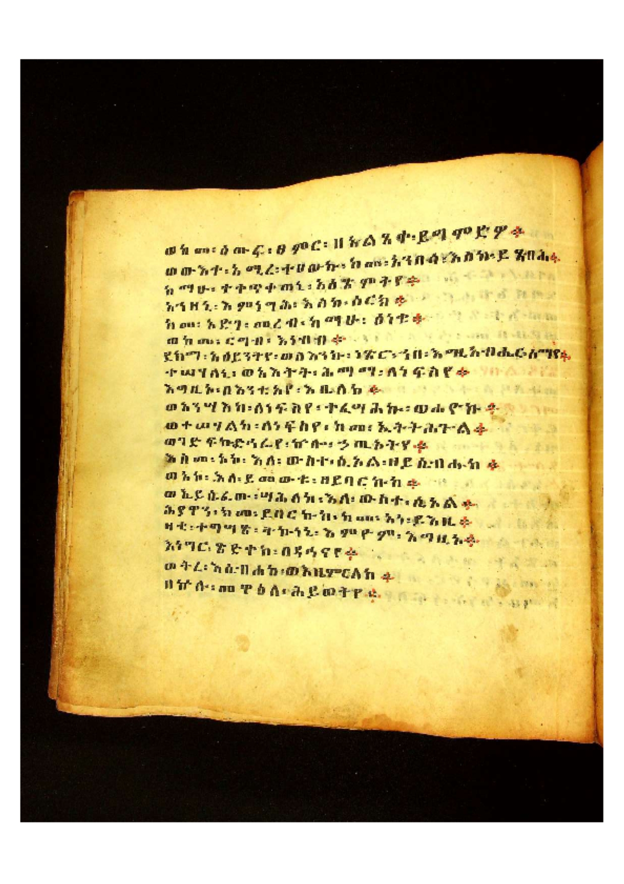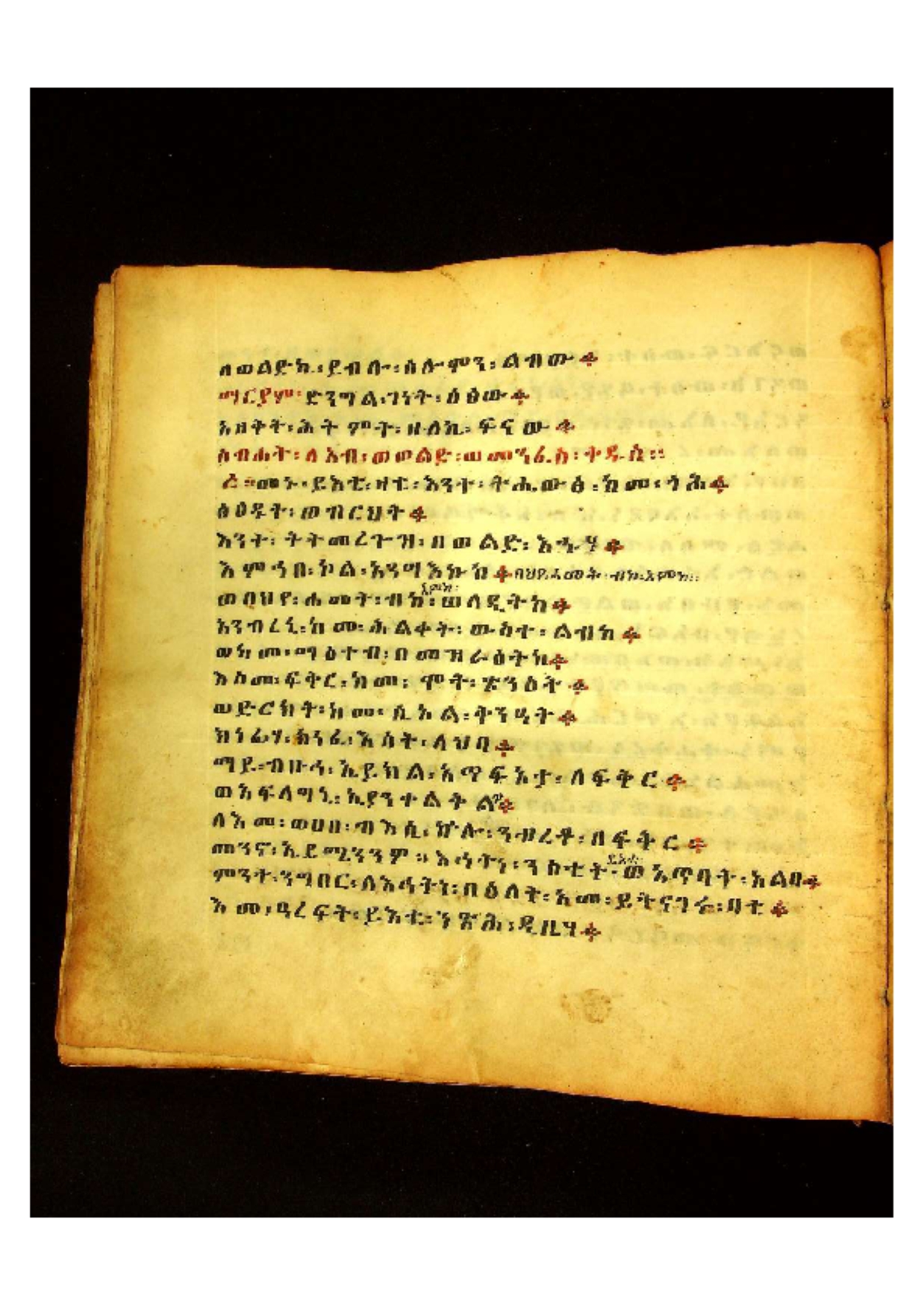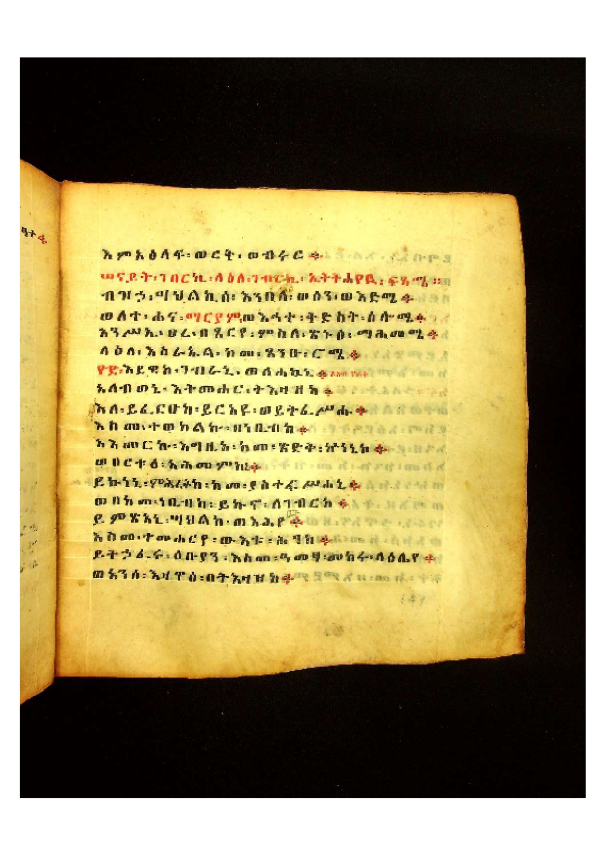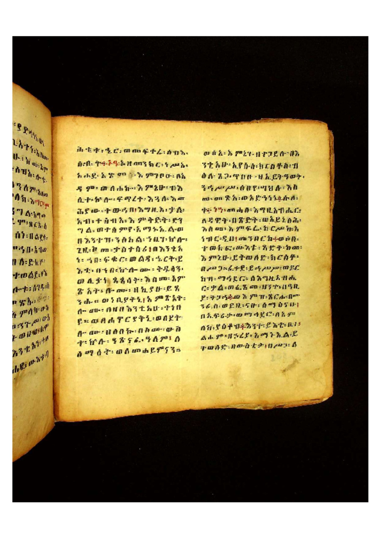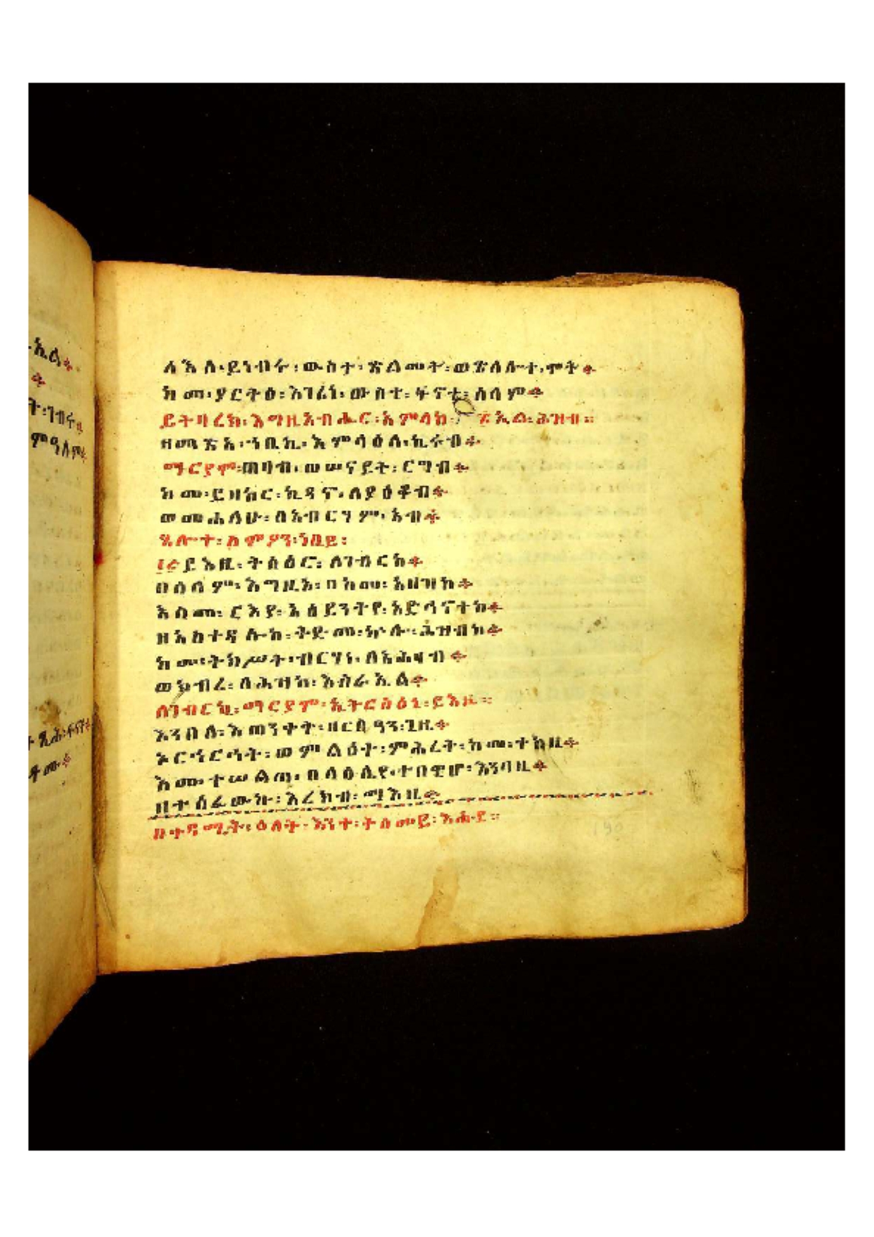 1. F. 2r: donation note written vertically in the outer margin, in black ink: “alla famiglia Bruschettini, Pussy […] Battaglia dell’Amba Aradam il 16 febbraio 1936 XIV”. The note, written in Italian and partly illegible, indicates the Bruschettini family as the receiver of the book and mentions the Battle of Amba Aradam, which took place on 16 February 1936. 2. F. 5r: note written in Italian in the outer upper margin, in red pencil: “Amba Aradam 16/2/XIV ore 17.30 P. Paloboni (?)”. This note also mentions the Battle of Amba Aradam, together with an individual whose name is partially unclear (P. Paloboni?). 3. F. 173v: supplication note written in small script in a mediocre hand, at the end of the “Psalms of David”: ዕቀበኒ፡ እምዓይነ፡ ደዌ፡ ወሞት፡ ለገብርከ፡ ደቅስዮስ፡, “protect me, your servant Däqsəyos, from the eye of infirmity and death”. The note mentions a certain Däqsəyos, indicated as “your servant” (possibly a later owner of the codex). 4. F. 173v: incipit of the Gəʿəz and Amharic prayer, perhaps a writing exercise. The note is written in an inaccurate calligraphy on the outer margin of the folio, next to the prayer. The entire text is የህፂ፡ ኖኅን፡ ከማየ[፡] አይኅ። እስራኤልን፡ ከፈርዖን፡ ዳዊትን፡ ከሳኦል፡ ከኢሎፍሊ። ኤ. 5. F. 190v: donation note, written in black ink in a mediocre hand. Text: ዝመጽሐፍ፡ ዘደብተራ፡ ኪሮስ፡ ዘወሀቦ፡ ለታቦተ፡ ሚካኤል፡ ኢትርስዑኒ፡ በአቡነ፡ ዘበሰማያት፡ ዘአቡየ፡ ገብረ፡ ማርያም፡ ወለእምየ፡ ወለተ፡ ሩፋኤል፡, “This book belongs to däbtära Kiros, who donated it to the tabot of [the church of St] Michael. Do not forget me for our Father who is in heaven. [It also belongs] to my father Gäbrä Maryam and my mother Wälättä Rufaʾel”. 6. F. 199v: writings executed in an inaccurate hand, perhaps the same of note 4. The note includes pen trials (ፈቲነ፡ ብርዕ፡ ዘፈረና፡ etc.), reproduces the explicit of the “Song of the songs” (ስብሐታተኪ፡ ማርያም፡ ከመ፡ እንተ፡ ሕልቀት፡ etc.) and the incipit of the “Praise of Mary” (ውዳሴ፡ ዘሰኑይ፡ ፈቀደ፡ እግዚእ፡ etc., partly rubricated). The writings also mention Däqsəyos, indicated as “your servant” (possibly a later owner of the codex) 7. F. 220ra–va: Genealogic note written on two columns. The note illustrates the family tree of King Yoḥannǝs I, who reigned from 1667 to 1682. The text is acephalous. Incipit: [ወለ]ደ፡ እምሐና፡ ብእሲቱ፡ አሦተ፡ ቅዱሳንሃ፡ ወአሦተ፡ ቅዱሳንኒ፡ እምነ፡ ጳውሊ፡ ብእሲሃ፡ ወለደቶሙ፡ ለአቤተኁን፡ ማእምሮ፡ ወለዘሥላሴ፡ ወአቤተኁን፡ ማእምሮኒ፡ ወለደ፡ አቃርዮስ፡ ወአቃርዮስኒ፡ ወለደ፡ እመቤት፡ እኅተ፡ ክርስቶስሃ፡. The text is published and translated in Proverbio D.V., 2000, ‘Inventario sommario dei manoscritti arabi, ebraici, etiopici – con notizia dei turchi – conservati presso la Biblioteca della Badia di Grottaferrata’. Atti della Accademia nazionale dei Lincei, Memorie, Classe di scienze morali, storiche e filologiche, serie IX, 12 (2000), 468–570 (here pp. 496–97, Appendice III). 8. F. 220va–b: Protective prayer against snakes, written on two columns. Incipit: በስመ፡ አብ፡ … ጸሎት፡ በእንተ፡ ዓርዌ፡ ምድር። ሶበ፡ በጽሐ፡ መልእክት፡ ሐሰውከ፡ በል፡ ፫ጊዜ፡ አኂዘከ፡ ዘፈረ፡ ልብሰ፡ ለእመ፡ ሀሎ፡ ርሑቀ፡ አስትዮ፡. The prayer is probably written in the same hand of note 7. 9. F. 220vb: Unidentified magic prayer containing asmat-names. Incipit: በስመ፡ አብ፡ … ኦላዘላህም፡ አህጉረ፡ ቀዳ[.]፡ ፍሖም፡ ሊስ፡ አፍሊስ፡ ምልክዮስ፡ ዘ[..]ማኤል፡ በዝንቱ፡ አስማቲከ፡ [.]ጽ[..] ኃይለ፡ በረድ፡ ወነፋስ፡ ከማሁ፡. |