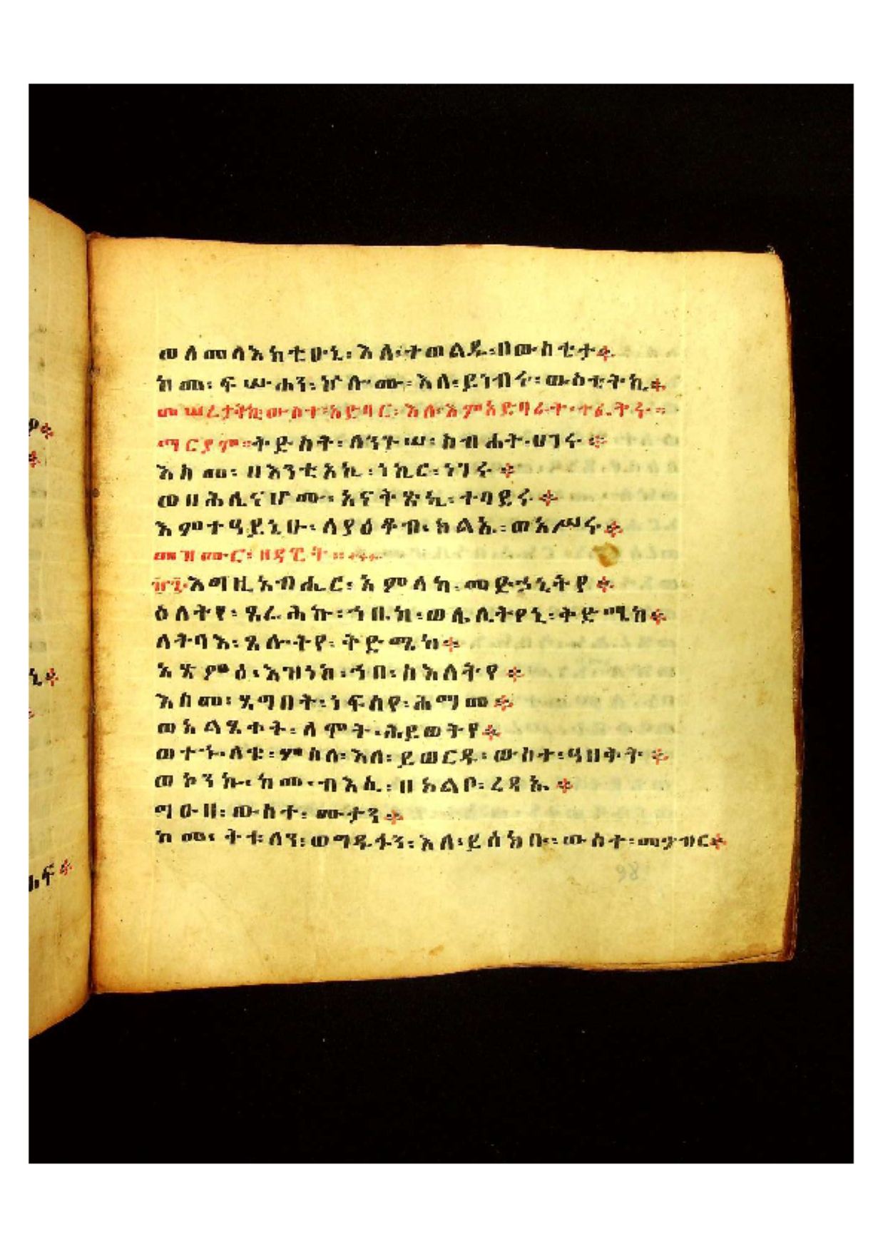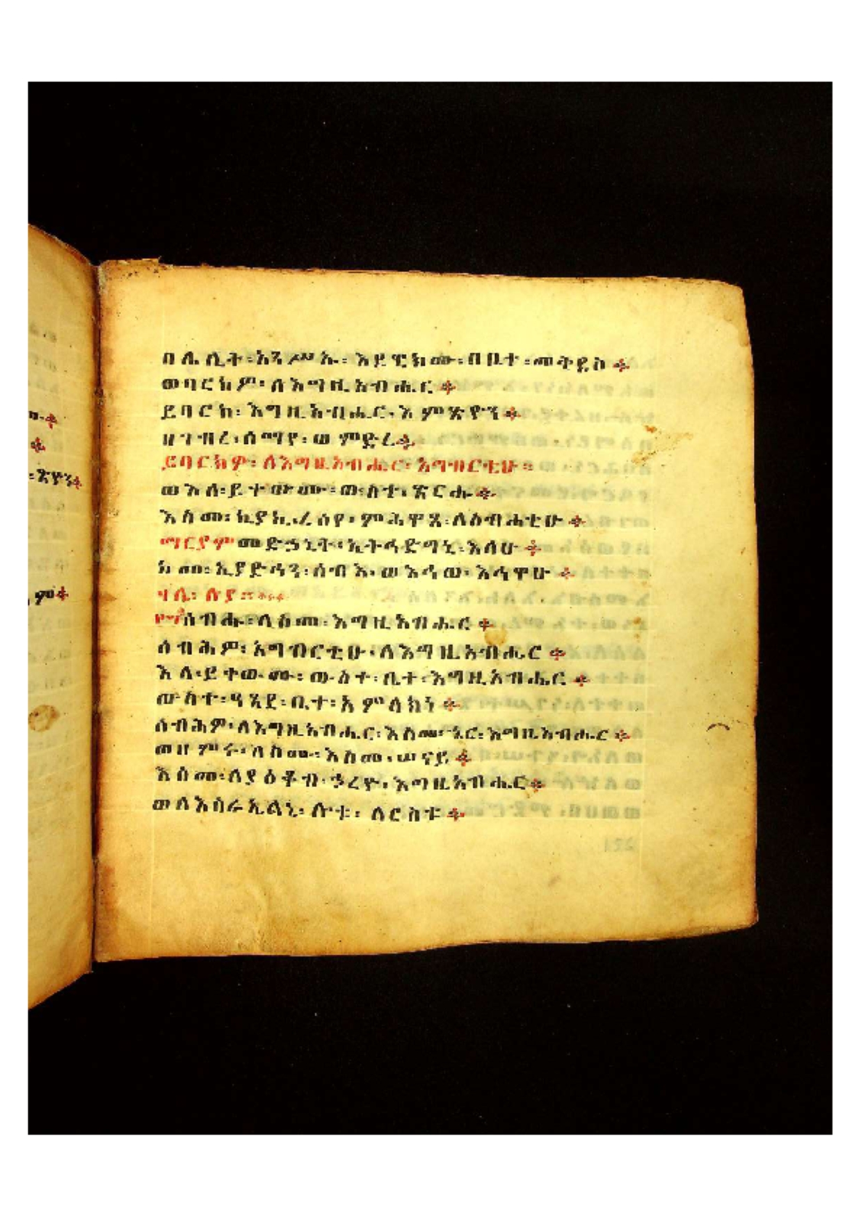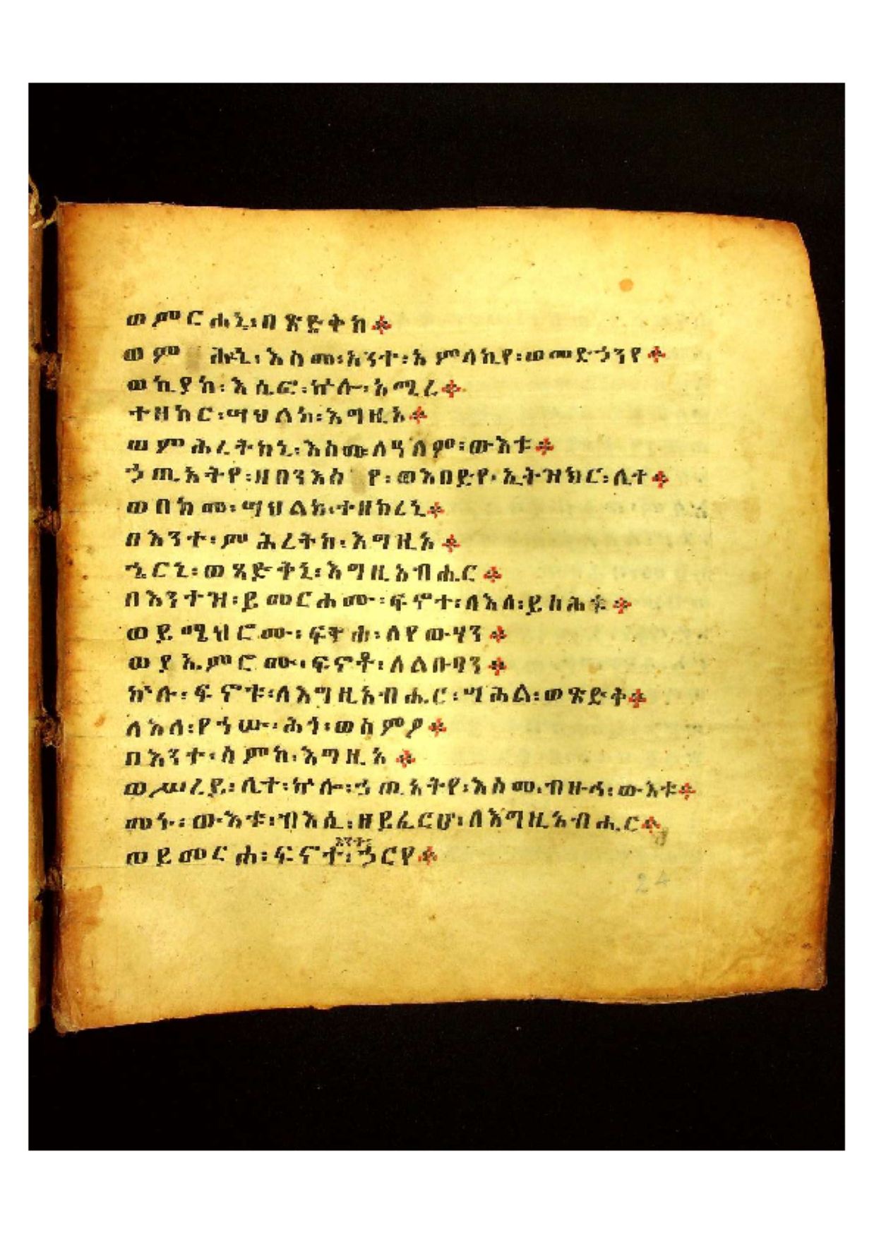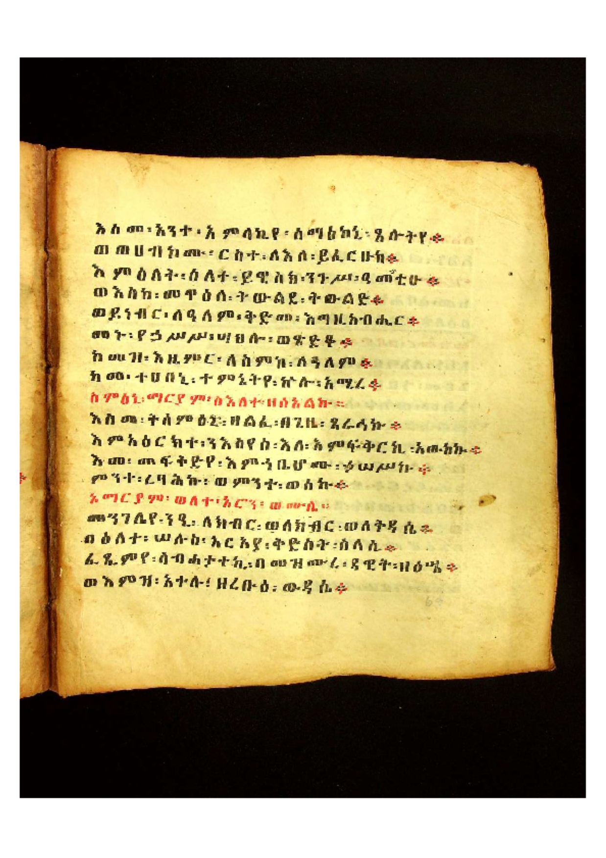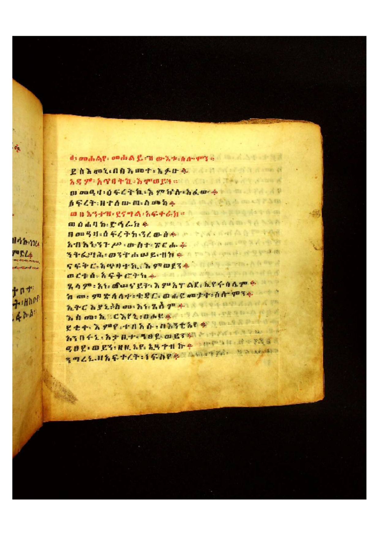 1. F. 2r: donation note written vertically in the outer margin, in black ink: “alla famiglia Bruschettini, Pussy […] Battaglia dell’Amba Aradam il 16 febbraio 1936 XIV”. The note, written in Italian and partly illegible, indicates the Bruschettini family as the receiver of the book and mentions the Battle of Amba Aradam, which took place on 16 February 1936. 2. F. 5r: note written in Italian in the outer upper margin, in red pencil: “Amba Aradam 16/2/XIV ore 17.30 P. Paloboni (?)”. This note also mentions the Battle of Amba Aradam, together with an individual whose name is partially unclear (P. Paloboni?). 3. F. 173v: supplication note written in small script in a mediocre hand, at the end of the “Psalms of David”: ዕቀበኒ፡ እምዓይነ፡ ደዌ፡ ወሞት፡ ለገብርከ፡ ደቅስዮስ፡, “protect me, your servant Däqsəyos, from the eye of infirmity and death”. The note mentions a certain Däqsəyos, indicated as “your servant” (possibly a later owner of the codex). 4. F. 173v: incipit of the Gəʿəz and Amharic prayer, perhaps a writing exercise. The note is written in an inaccurate calligraphy on the outer margin of the folio, next to the prayer. The entire text is የህፂ፡ ኖኅን፡ ከማየ[፡] አይኅ። እስራኤልን፡ ከፈርዖን፡ ዳዊትን፡ ከሳኦል፡ ከኢሎፍሊ። ኤ. 5. F. 190v: donation note, written in black ink in a mediocre hand. Text: ዝመጽሐፍ፡ ዘደብተራ፡ ኪሮስ፡ ዘወሀቦ፡ ለታቦተ፡ ሚካኤል፡ ኢትርስዑኒ፡ በአቡነ፡ ዘበሰማያት፡ ዘአቡየ፡ ገብረ፡ ማርያም፡ ወለእምየ፡ ወለተ፡ ሩፋኤል፡, “This book belongs to däbtära Kiros, who donated it to the tabot of [the church of St] Michael. Do not forget me for our Father who is in heaven. [It also belongs] to my father Gäbrä Maryam and my mother Wälättä Rufaʾel”. 6. F. 199v: writings executed in an inaccurate hand, perhaps the same of note 4. The note includes pen trials (ፈቲነ፡ ብርዕ፡ ዘፈረና፡ etc.), reproduces the explicit of the “Song of the songs” (ስብሐታተኪ፡ ማርያም፡ ከመ፡ እንተ፡ ሕልቀት፡ etc.) and the incipit of the “Praise of Mary” (ውዳሴ፡ ዘሰኑይ፡ ፈቀደ፡ እግዚእ፡ etc., partly rubricated). The writings also mention Däqsəyos, indicated as “your servant” (possibly a later owner of the codex) 7. F. 220ra–va: Genealogic note written on two columns. The note illustrates the family tree of King Yoḥannǝs I, who reigned from 1667 to 1682. The text is acephalous. Incipit: [ወለ]ደ፡ እምሐና፡ ብእሲቱ፡ አሦተ፡ ቅዱሳንሃ፡ ወአሦተ፡ ቅዱሳንኒ፡ እምነ፡ ጳውሊ፡ ብእሲሃ፡ ወለደቶሙ፡ ለአቤተኁን፡ ማእምሮ፡ ወለዘሥላሴ፡ ወአቤተኁን፡ ማእምሮኒ፡ ወለደ፡ አቃርዮስ፡ ወአቃርዮስኒ፡ ወለደ፡ እመቤት፡ እኅተ፡ ክርስቶስሃ፡. The text is published and translated in Proverbio D.V., 2000, ‘Inventario sommario dei manoscritti arabi, ebraici, etiopici – con notizia dei turchi – conservati presso la Biblioteca della Badia di Grottaferrata’. Atti della Accademia nazionale dei Lincei, Memorie, Classe di scienze morali, storiche e filologiche, serie IX, 12 (2000), 468–570 (here pp. 496–97, Appendice III). 8. F. 220va–b: Protective prayer against snakes, written on two columns. Incipit: በስመ፡ አብ፡ … ጸሎት፡ በእንተ፡ ዓርዌ፡ ምድር። ሶበ፡ በጽሐ፡ መልእክት፡ ሐሰውከ፡ በል፡ ፫ጊዜ፡ አኂዘከ፡ ዘፈረ፡ ልብሰ፡ ለእመ፡ ሀሎ፡ ርሑቀ፡ አስትዮ፡. The prayer is probably written in the same hand of note 7. 9. F. 220vb: Unidentified magic prayer containing asmat-names. Incipit: በስመ፡ አብ፡ … ኦላዘላህም፡ አህጉረ፡ ቀዳ[.]፡ ፍሖም፡ ሊስ፡ አፍሊስ፡ ምልክዮስ፡ ዘ[..]ማኤል፡ በዝንቱ፡ አስማቲከ፡ [.]ጽ[..] ኃይለ፡ በረድ፡ ወነፋስ፡ ከማሁ፡. |