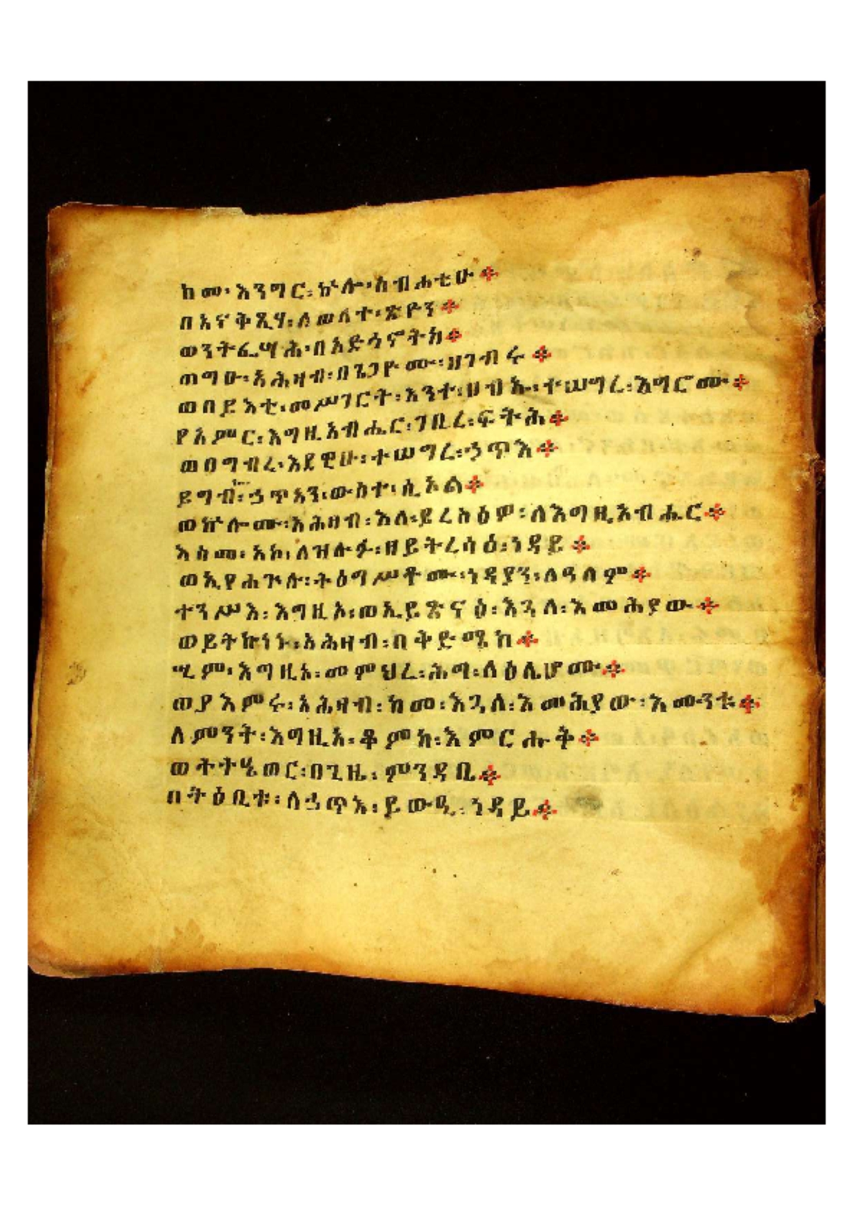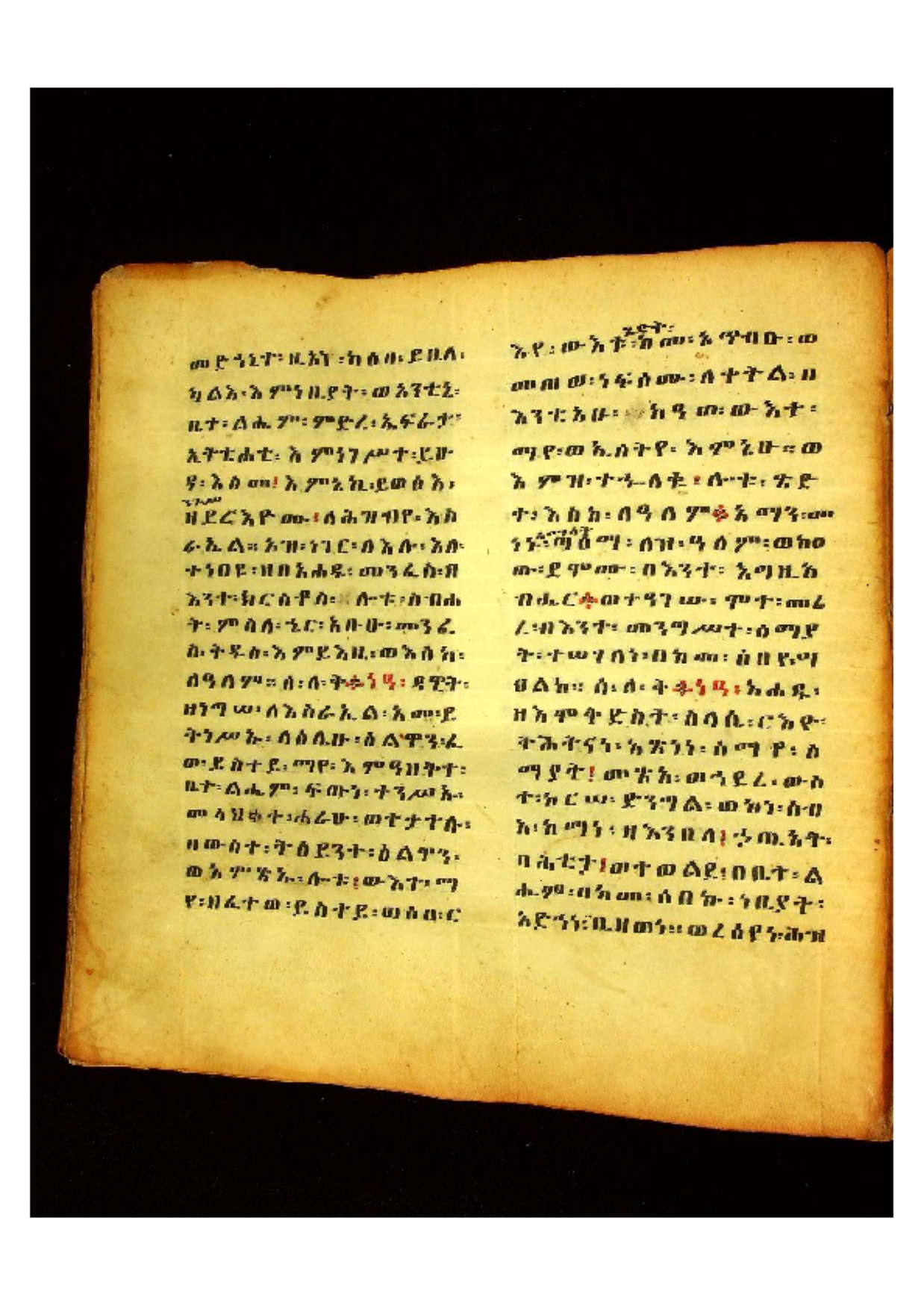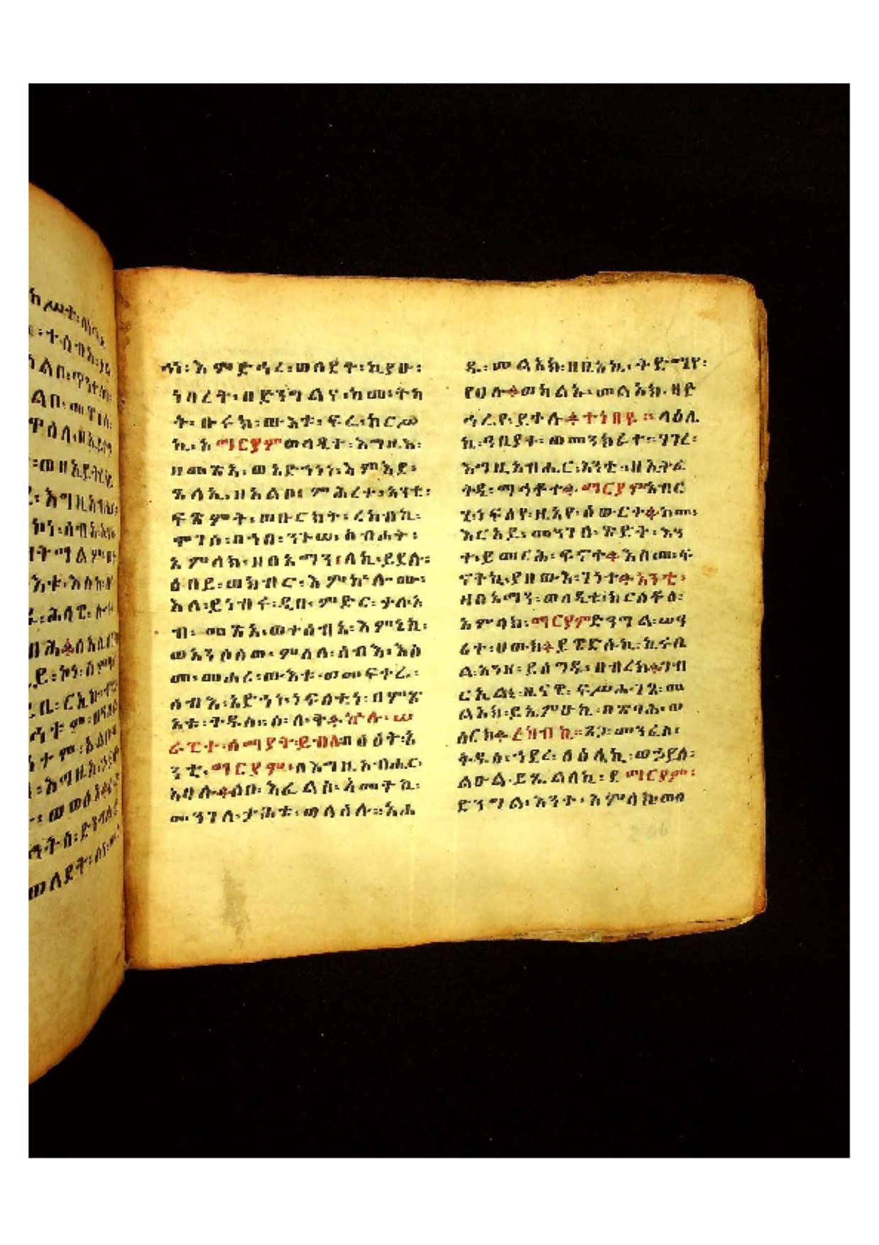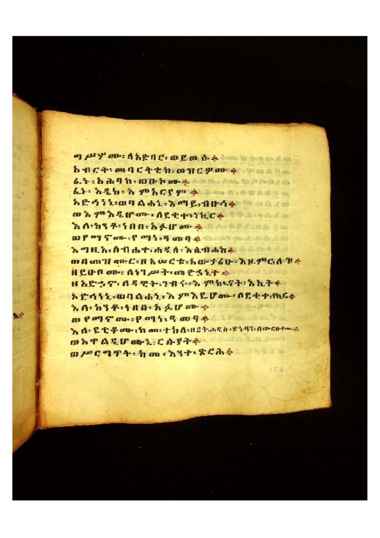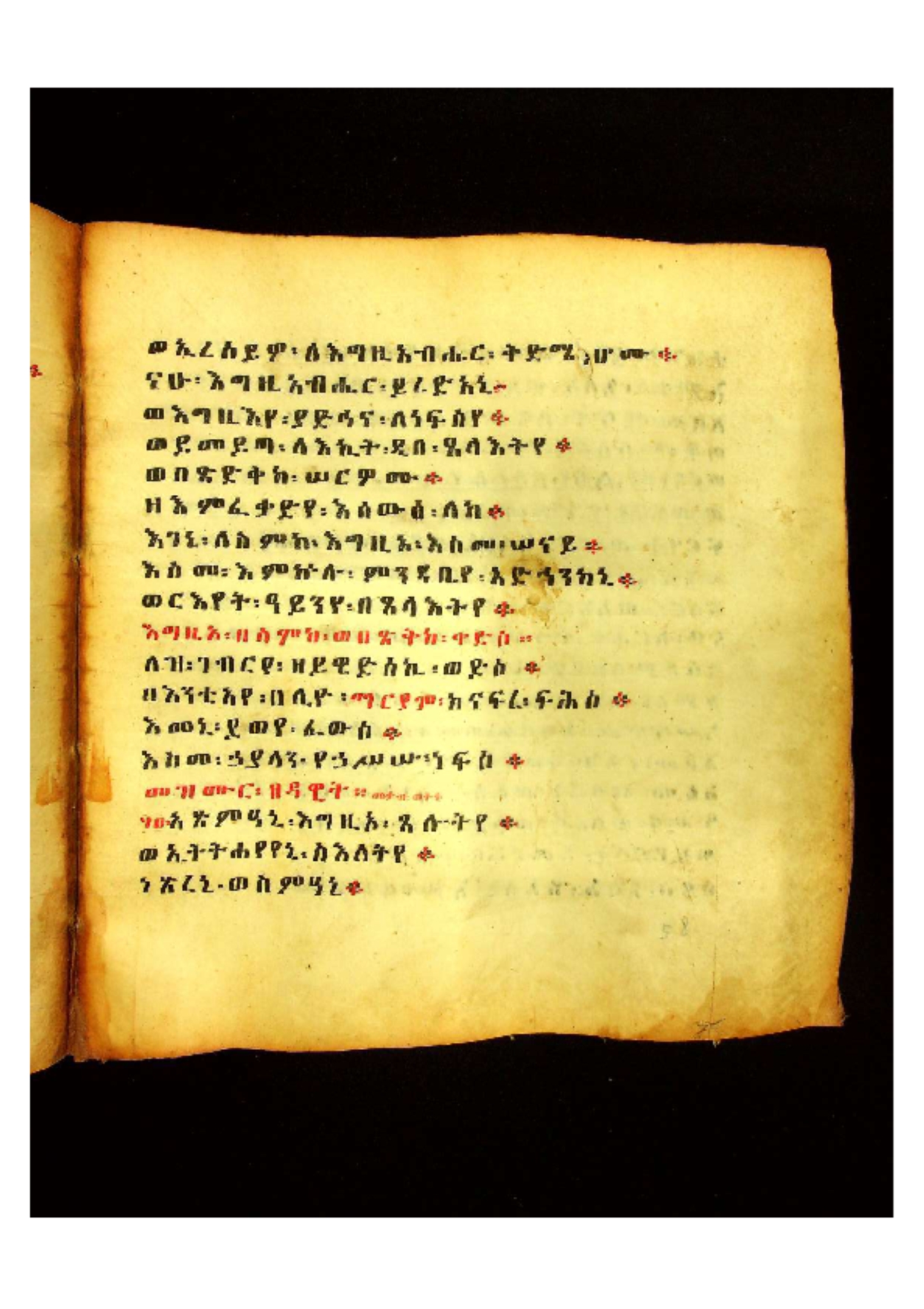 1. F. 2r: donation note written vertically in the outer margin, in black ink: “alla famiglia Bruschettini, Pussy […] Battaglia dell’Amba Aradam il 16 febbraio 1936 XIV”. The note, written in Italian and partly illegible, indicates the Bruschettini family as the receiver of the book and mentions the Battle of Amba Aradam, which took place on 16 February 1936. 2. F. 5r: note written in Italian in the outer upper margin, in red pencil: “Amba Aradam 16/2/XIV ore 17.30 P. Paloboni (?)”. This note also mentions the Battle of Amba Aradam, together with an individual whose name is partially unclear (P. Paloboni?). 3. F. 173v: supplication note written in small script in a mediocre hand, at the end of the “Psalms of David”: ዕቀበኒ፡ እምዓይነ፡ ደዌ፡ ወሞት፡ ለገብርከ፡ ደቅስዮስ፡, “protect me, your servant Däqsəyos, from the eye of infirmity and death”. The note mentions a certain Däqsəyos, indicated as “your servant” (possibly a later owner of the codex). 4. F. 173v: incipit of the Gəʿəz and Amharic prayer, perhaps a writing exercise. The note is written in an inaccurate calligraphy on the outer margin of the folio, next to the prayer. The entire text is የህፂ፡ ኖኅን፡ ከማየ[፡] አይኅ። እስራኤልን፡ ከፈርዖን፡ ዳዊትን፡ ከሳኦል፡ ከኢሎፍሊ። ኤ. 5. F. 190v: donation note, written in black ink in a mediocre hand. Text: ዝመጽሐፍ፡ ዘደብተራ፡ ኪሮስ፡ ዘወሀቦ፡ ለታቦተ፡ ሚካኤል፡ ኢትርስዑኒ፡ በአቡነ፡ ዘበሰማያት፡ ዘአቡየ፡ ገብረ፡ ማርያም፡ ወለእምየ፡ ወለተ፡ ሩፋኤል፡, “This book belongs to däbtära Kiros, who donated it to the tabot of [the church of St] Michael. Do not forget me for our Father who is in heaven. [It also belongs] to my father Gäbrä Maryam and my mother Wälättä Rufaʾel”. 6. F. 199v: writings executed in an inaccurate hand, perhaps the same of note 4. The note includes pen trials (ፈቲነ፡ ብርዕ፡ ዘፈረና፡ etc.), reproduces the explicit of the “Song of the songs” (ስብሐታተኪ፡ ማርያም፡ ከመ፡ እንተ፡ ሕልቀት፡ etc.) and the incipit of the “Praise of Mary” (ውዳሴ፡ ዘሰኑይ፡ ፈቀደ፡ እግዚእ፡ etc., partly rubricated). The writings also mention Däqsəyos, indicated as “your servant” (possibly a later owner of the codex) 7. F. 220ra–va: Genealogic note written on two columns. The note illustrates the family tree of King Yoḥannǝs I, who reigned from 1667 to 1682. The text is acephalous. Incipit: [ወለ]ደ፡ እምሐና፡ ብእሲቱ፡ አሦተ፡ ቅዱሳንሃ፡ ወአሦተ፡ ቅዱሳንኒ፡ እምነ፡ ጳውሊ፡ ብእሲሃ፡ ወለደቶሙ፡ ለአቤተኁን፡ ማእምሮ፡ ወለዘሥላሴ፡ ወአቤተኁን፡ ማእምሮኒ፡ ወለደ፡ አቃርዮስ፡ ወአቃርዮስኒ፡ ወለደ፡ እመቤት፡ እኅተ፡ ክርስቶስሃ፡. The text is published and translated in Proverbio D.V., 2000, ‘Inventario sommario dei manoscritti arabi, ebraici, etiopici – con notizia dei turchi – conservati presso la Biblioteca della Badia di Grottaferrata’. Atti della Accademia nazionale dei Lincei, Memorie, Classe di scienze morali, storiche e filologiche, serie IX, 12 (2000), 468–570 (here pp. 496–97, Appendice III). 8. F. 220va–b: Protective prayer against snakes, written on two columns. Incipit: በስመ፡ አብ፡ … ጸሎት፡ በእንተ፡ ዓርዌ፡ ምድር። ሶበ፡ በጽሐ፡ መልእክት፡ ሐሰውከ፡ በል፡ ፫ጊዜ፡ አኂዘከ፡ ዘፈረ፡ ልብሰ፡ ለእመ፡ ሀሎ፡ ርሑቀ፡ አስትዮ፡. The prayer is probably written in the same hand of note 7. 9. F. 220vb: Unidentified magic prayer containing asmat-names. Incipit: በስመ፡ አብ፡ … ኦላዘላህም፡ አህጉረ፡ ቀዳ[.]፡ ፍሖም፡ ሊስ፡ አፍሊስ፡ ምልክዮስ፡ ዘ[..]ማኤል፡ በዝንቱ፡ አስማቲከ፡ [.]ጽ[..] ኃይለ፡ በረድ፡ ወነፋስ፡ ከማሁ፡. |