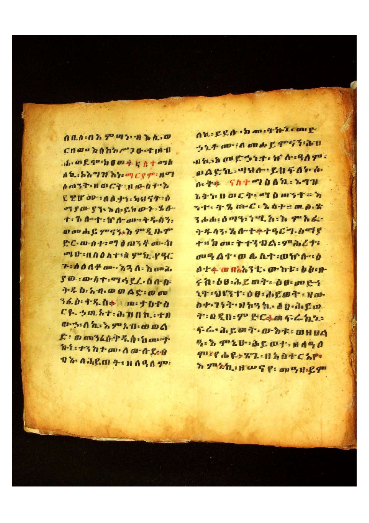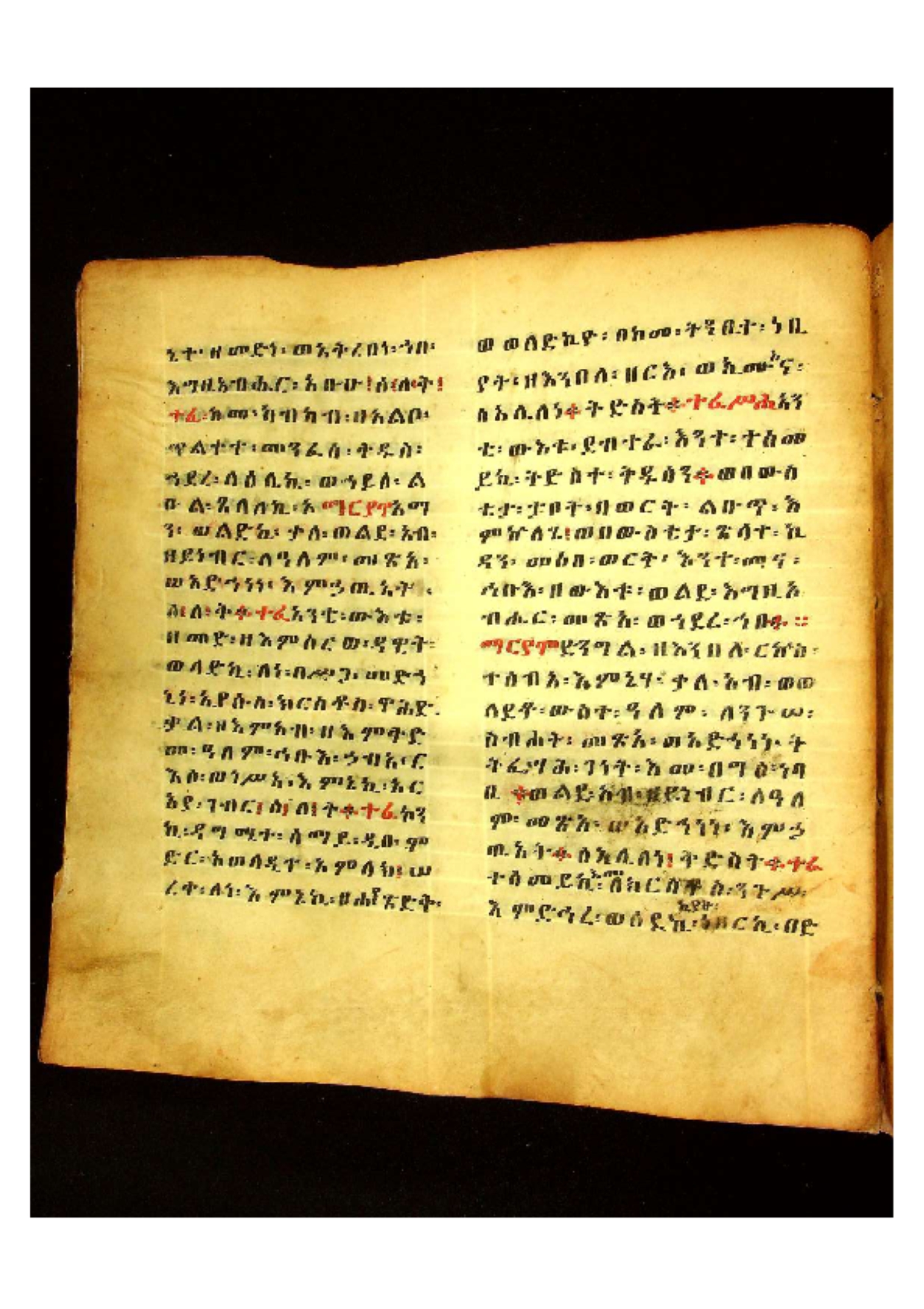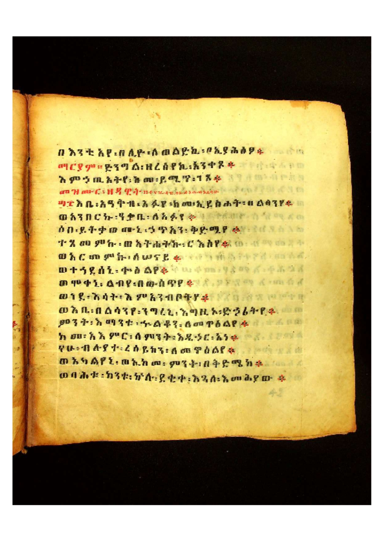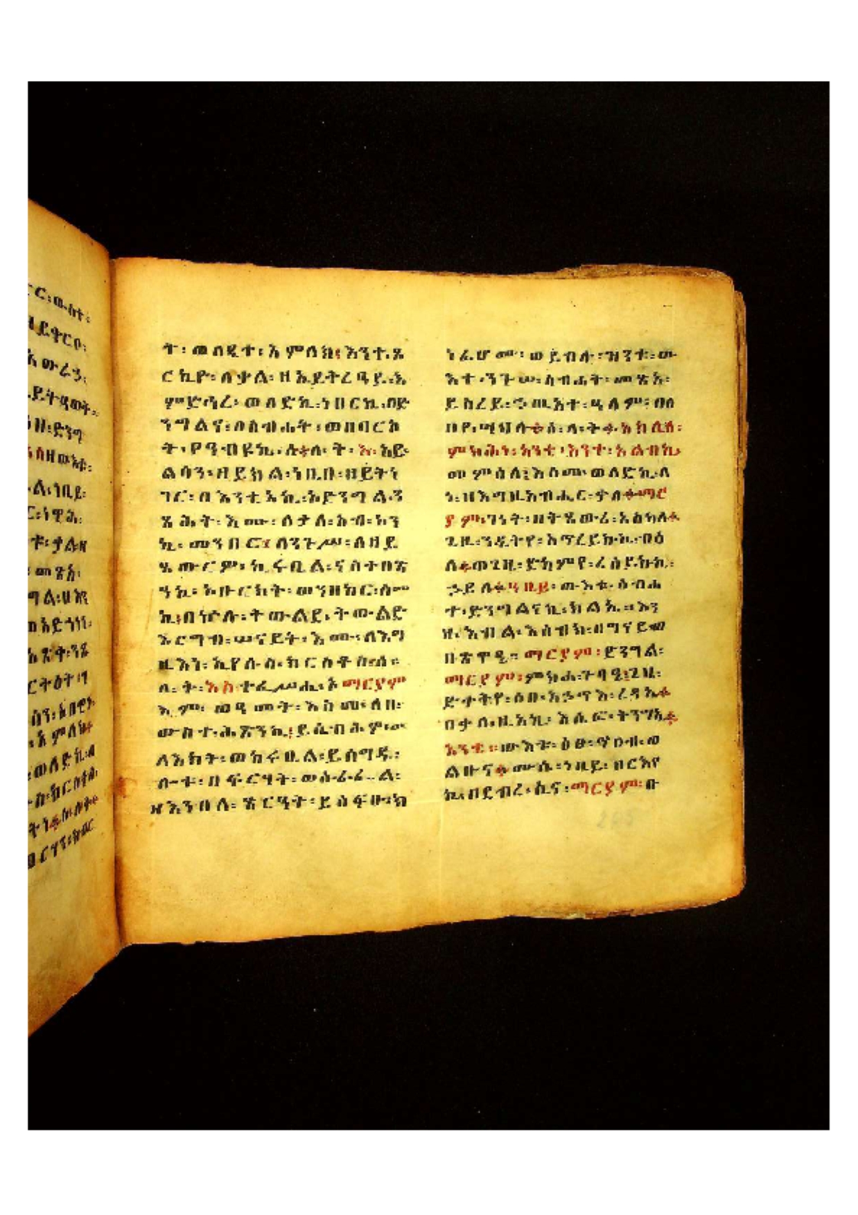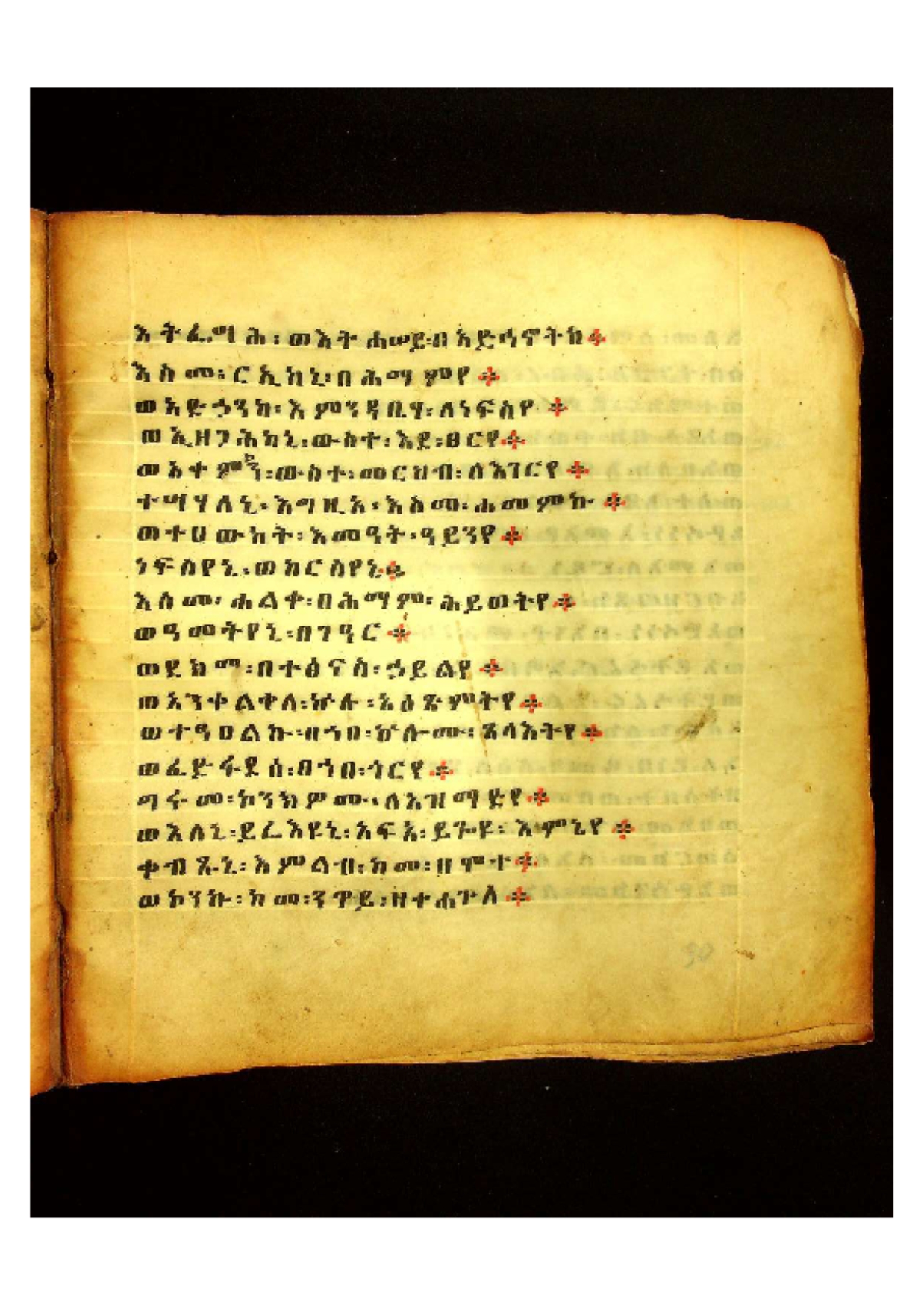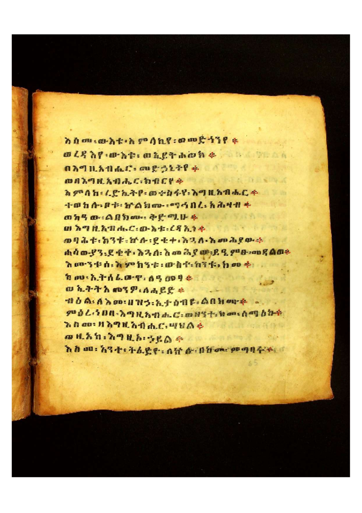 1. F. 2r: donation note written vertically in the outer margin, in black ink: “alla famiglia Bruschettini, Pussy […] Battaglia dell’Amba Aradam il 16 febbraio 1936 XIV”. The note, written in Italian and partly illegible, indicates the Bruschettini family as the receiver of the book and mentions the Battle of Amba Aradam, which took place on 16 February 1936. 2. F. 5r: note written in Italian in the outer upper margin, in red pencil: “Amba Aradam 16/2/XIV ore 17.30 P. Paloboni (?)”. This note also mentions the Battle of Amba Aradam, together with an individual whose name is partially unclear (P. Paloboni?). 3. F. 173v: supplication note written in small script in a mediocre hand, at the end of the “Psalms of David”: ዕቀበኒ፡ እምዓይነ፡ ደዌ፡ ወሞት፡ ለገብርከ፡ ደቅስዮስ፡, “protect me, your servant Däqsəyos, from the eye of infirmity and death”. The note mentions a certain Däqsəyos, indicated as “your servant” (possibly a later owner of the codex). 4. F. 173v: incipit of the Gəʿəz and Amharic prayer, perhaps a writing exercise. The note is written in an inaccurate calligraphy on the outer margin of the folio, next to the prayer. The entire text is የህፂ፡ ኖኅን፡ ከማየ[፡] አይኅ። እስራኤልን፡ ከፈርዖን፡ ዳዊትን፡ ከሳኦል፡ ከኢሎፍሊ። ኤ. 5. F. 190v: donation note, written in black ink in a mediocre hand. Text: ዝመጽሐፍ፡ ዘደብተራ፡ ኪሮስ፡ ዘወሀቦ፡ ለታቦተ፡ ሚካኤል፡ ኢትርስዑኒ፡ በአቡነ፡ ዘበሰማያት፡ ዘአቡየ፡ ገብረ፡ ማርያም፡ ወለእምየ፡ ወለተ፡ ሩፋኤል፡, “This book belongs to däbtära Kiros, who donated it to the tabot of [the church of St] Michael. Do not forget me for our Father who is in heaven. [It also belongs] to my father Gäbrä Maryam and my mother Wälättä Rufaʾel”. 6. F. 199v: writings executed in an inaccurate hand, perhaps the same of note 4. The note includes pen trials (ፈቲነ፡ ብርዕ፡ ዘፈረና፡ etc.), reproduces the explicit of the “Song of the songs” (ስብሐታተኪ፡ ማርያም፡ ከመ፡ እንተ፡ ሕልቀት፡ etc.) and the incipit of the “Praise of Mary” (ውዳሴ፡ ዘሰኑይ፡ ፈቀደ፡ እግዚእ፡ etc., partly rubricated). The writings also mention Däqsəyos, indicated as “your servant” (possibly a later owner of the codex) 7. F. 220ra–va: Genealogic note written on two columns. The note illustrates the family tree of King Yoḥannǝs I, who reigned from 1667 to 1682. The text is acephalous. Incipit: [ወለ]ደ፡ እምሐና፡ ብእሲቱ፡ አሦተ፡ ቅዱሳንሃ፡ ወአሦተ፡ ቅዱሳንኒ፡ እምነ፡ ጳውሊ፡ ብእሲሃ፡ ወለደቶሙ፡ ለአቤተኁን፡ ማእምሮ፡ ወለዘሥላሴ፡ ወአቤተኁን፡ ማእምሮኒ፡ ወለደ፡ አቃርዮስ፡ ወአቃርዮስኒ፡ ወለደ፡ እመቤት፡ እኅተ፡ ክርስቶስሃ፡. The text is published and translated in Proverbio D.V., 2000, ‘Inventario sommario dei manoscritti arabi, ebraici, etiopici – con notizia dei turchi – conservati presso la Biblioteca della Badia di Grottaferrata’. Atti della Accademia nazionale dei Lincei, Memorie, Classe di scienze morali, storiche e filologiche, serie IX, 12 (2000), 468–570 (here pp. 496–97, Appendice III). 8. F. 220va–b: Protective prayer against snakes, written on two columns. Incipit: በስመ፡ አብ፡ … ጸሎት፡ በእንተ፡ ዓርዌ፡ ምድር። ሶበ፡ በጽሐ፡ መልእክት፡ ሐሰውከ፡ በል፡ ፫ጊዜ፡ አኂዘከ፡ ዘፈረ፡ ልብሰ፡ ለእመ፡ ሀሎ፡ ርሑቀ፡ አስትዮ፡. The prayer is probably written in the same hand of note 7. 9. F. 220vb: Unidentified magic prayer containing asmat-names. Incipit: በስመ፡ አብ፡ … ኦላዘላህም፡ አህጉረ፡ ቀዳ[.]፡ ፍሖም፡ ሊስ፡ አፍሊስ፡ ምልክዮስ፡ ዘ[..]ማኤል፡ በዝንቱ፡ አስማቲከ፡ [.]ጽ[..] ኃይለ፡ በረድ፡ ወነፋስ፡ ከማሁ፡. |
