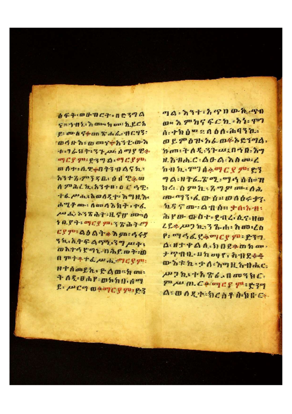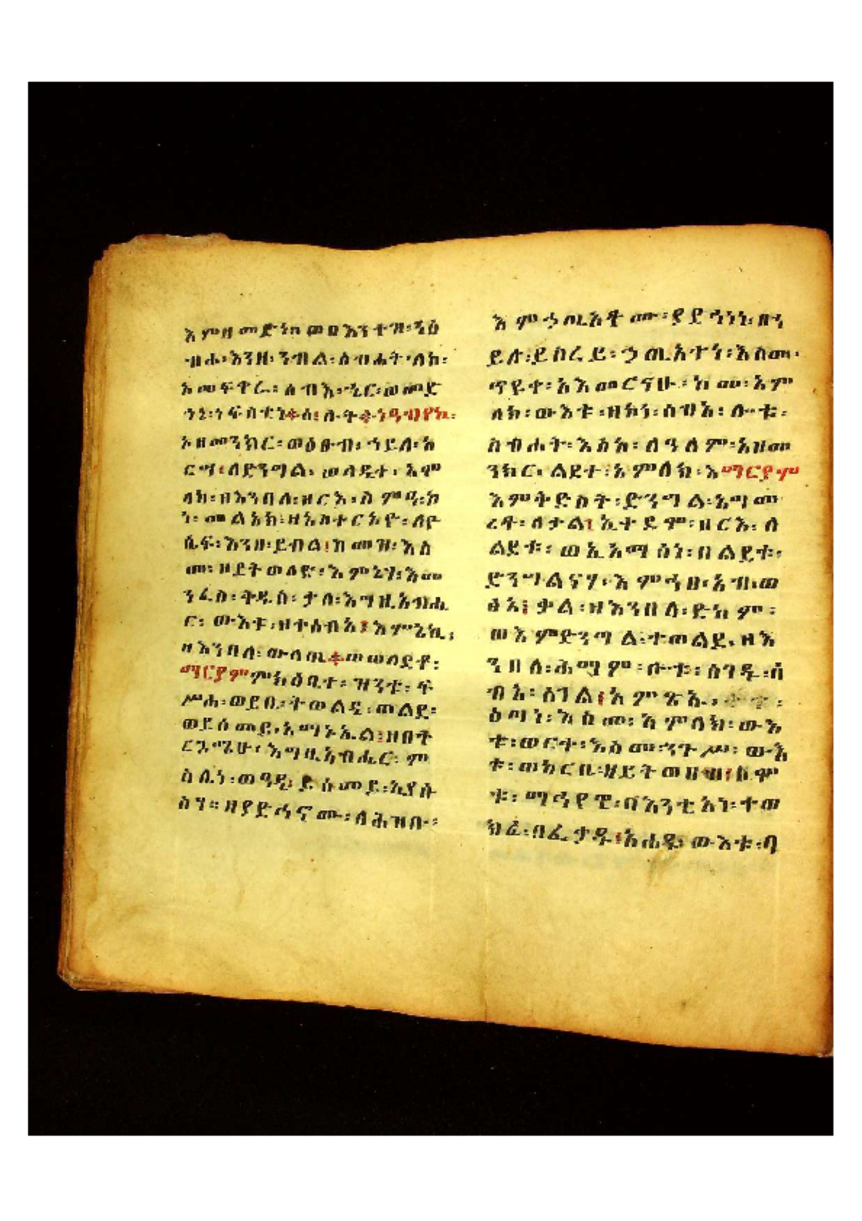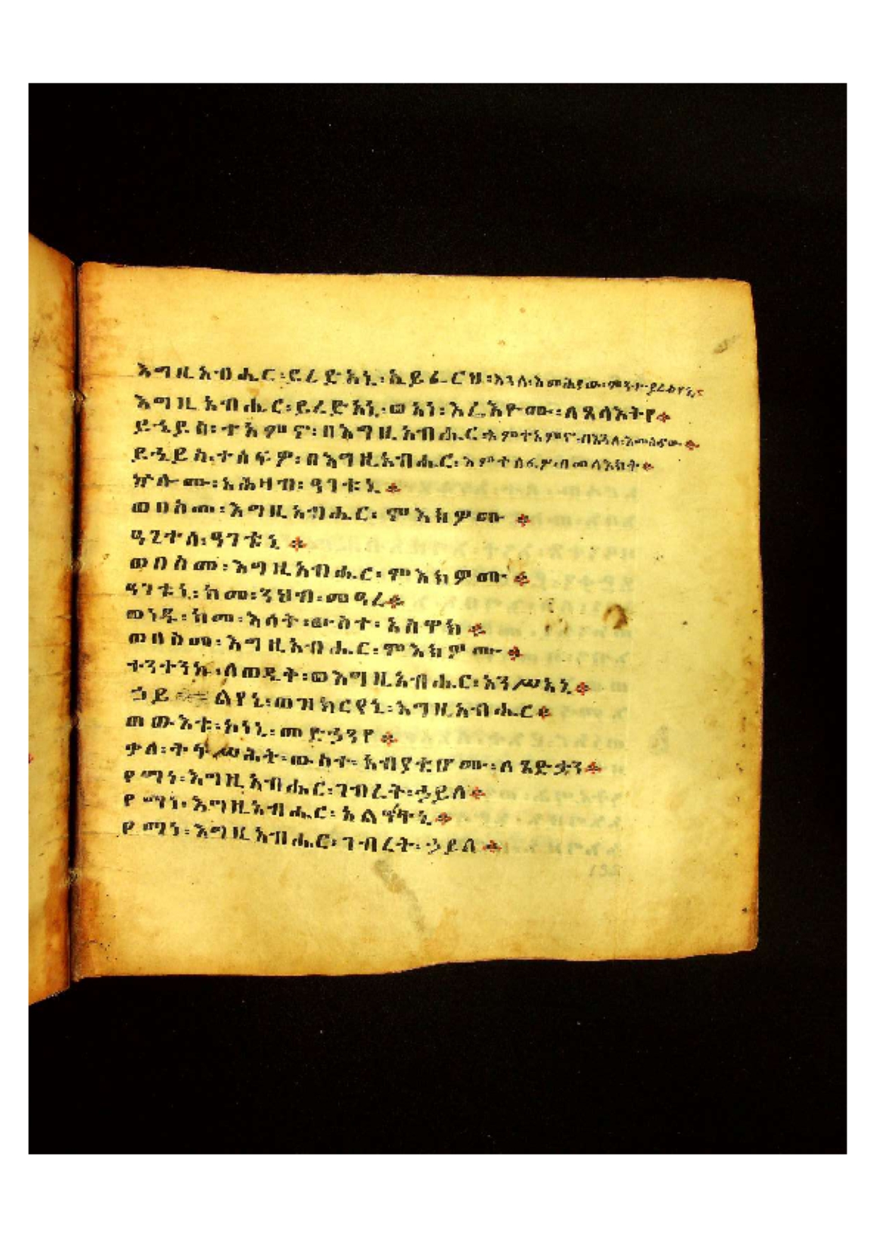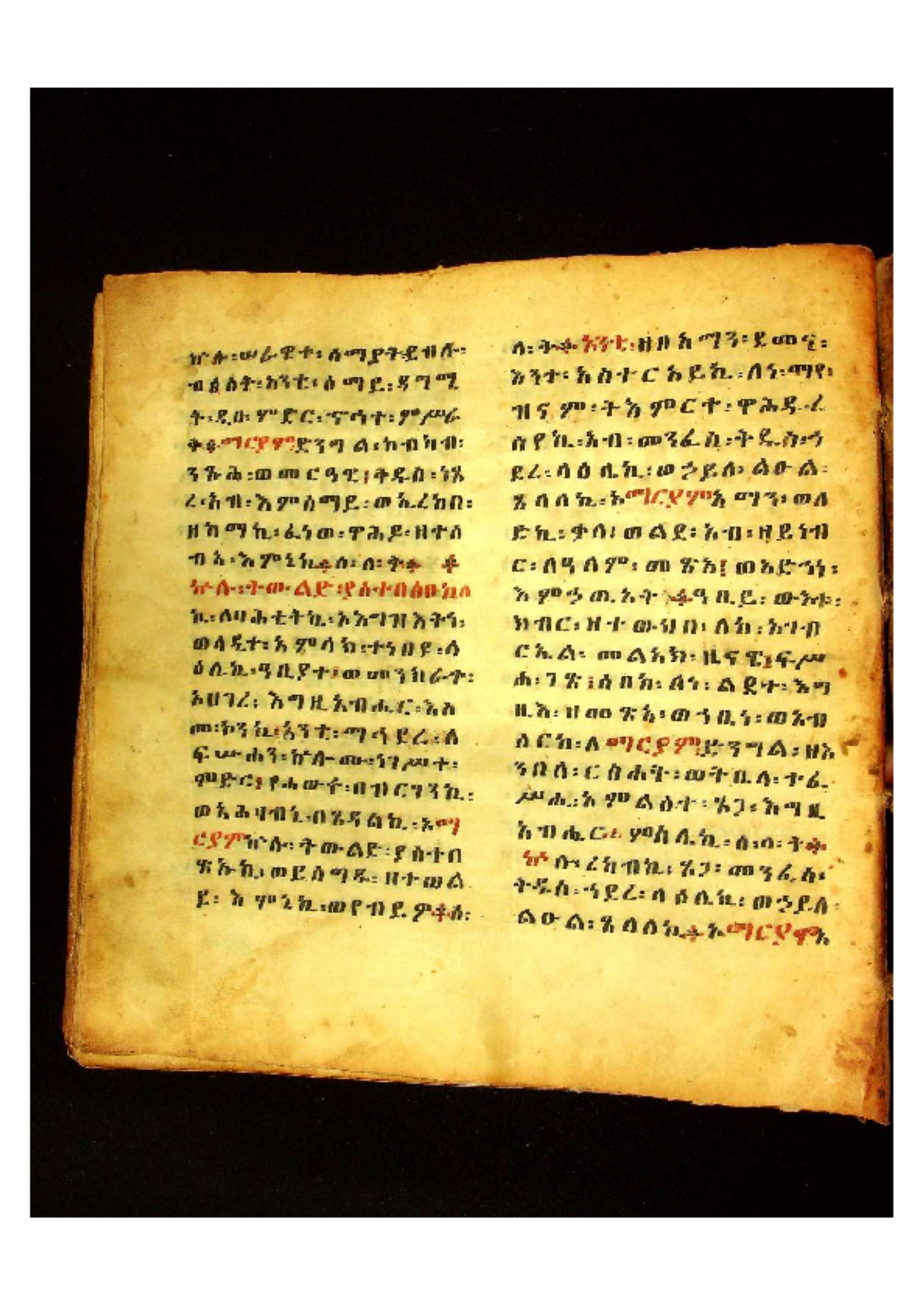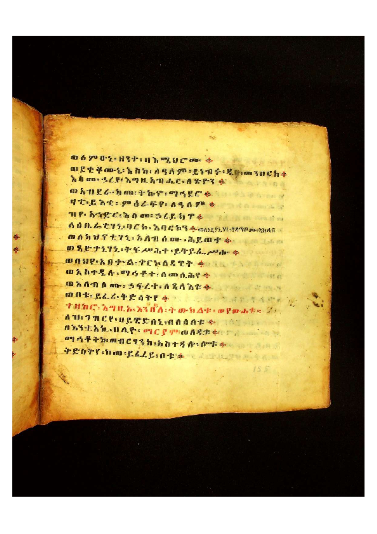 1. F. 2r: donation note written vertically in the outer margin, in black ink: “alla famiglia Bruschettini, Pussy […] Battaglia dell’Amba Aradam il 16 febbraio 1936 XIV”. The note, written in Italian and partly illegible, indicates the Bruschettini family as the receiver of the book and mentions the Battle of Amba Aradam, which took place on 16 February 1936. 2. F. 5r: note written in Italian in the outer upper margin, in red pencil: “Amba Aradam 16/2/XIV ore 17.30 P. Paloboni (?)”. This note also mentions the Battle of Amba Aradam, together with an individual whose name is partially unclear (P. Paloboni?). 3. F. 173v: supplication note written in small script in a mediocre hand, at the end of the “Psalms of David”: ዕቀበኒ፡ እምዓይነ፡ ደዌ፡ ወሞት፡ ለገብርከ፡ ደቅስዮስ፡, “protect me, your servant Däqsəyos, from the eye of infirmity and death”. The note mentions a certain Däqsəyos, indicated as “your servant” (possibly a later owner of the codex). 4. F. 173v: incipit of the Gəʿəz and Amharic prayer, perhaps a writing exercise. The note is written in an inaccurate calligraphy on the outer margin of the folio, next to the prayer. The entire text is የህፂ፡ ኖኅን፡ ከማየ[፡] አይኅ። እስራኤልን፡ ከፈርዖን፡ ዳዊትን፡ ከሳኦል፡ ከኢሎፍሊ። ኤ. 5. F. 190v: donation note, written in black ink in a mediocre hand. Text: ዝመጽሐፍ፡ ዘደብተራ፡ ኪሮስ፡ ዘወሀቦ፡ ለታቦተ፡ ሚካኤል፡ ኢትርስዑኒ፡ በአቡነ፡ ዘበሰማያት፡ ዘአቡየ፡ ገብረ፡ ማርያም፡ ወለእምየ፡ ወለተ፡ ሩፋኤል፡, “This book belongs to däbtära Kiros, who donated it to the tabot of [the church of St] Michael. Do not forget me for our Father who is in heaven. [It also belongs] to my father Gäbrä Maryam and my mother Wälättä Rufaʾel”. 6. F. 199v: writings executed in an inaccurate hand, perhaps the same of note 4. The note includes pen trials (ፈቲነ፡ ብርዕ፡ ዘፈረና፡ etc.), reproduces the explicit of the “Song of the songs” (ስብሐታተኪ፡ ማርያም፡ ከመ፡ እንተ፡ ሕልቀት፡ etc.) and the incipit of the “Praise of Mary” (ውዳሴ፡ ዘሰኑይ፡ ፈቀደ፡ እግዚእ፡ etc., partly rubricated). The writings also mention Däqsəyos, indicated as “your servant” (possibly a later owner of the codex) 7. F. 220ra–va: Genealogic note written on two columns. The note illustrates the family tree of King Yoḥannǝs I, who reigned from 1667 to 1682. The text is acephalous. Incipit: [ወለ]ደ፡ እምሐና፡ ብእሲቱ፡ አሦተ፡ ቅዱሳንሃ፡ ወአሦተ፡ ቅዱሳንኒ፡ እምነ፡ ጳውሊ፡ ብእሲሃ፡ ወለደቶሙ፡ ለአቤተኁን፡ ማእምሮ፡ ወለዘሥላሴ፡ ወአቤተኁን፡ ማእምሮኒ፡ ወለደ፡ አቃርዮስ፡ ወአቃርዮስኒ፡ ወለደ፡ እመቤት፡ እኅተ፡ ክርስቶስሃ፡. The text is published and translated in Proverbio D.V., 2000, ‘Inventario sommario dei manoscritti arabi, ebraici, etiopici – con notizia dei turchi – conservati presso la Biblioteca della Badia di Grottaferrata’. Atti della Accademia nazionale dei Lincei, Memorie, Classe di scienze morali, storiche e filologiche, serie IX, 12 (2000), 468–570 (here pp. 496–97, Appendice III). 8. F. 220va–b: Protective prayer against snakes, written on two columns. Incipit: በስመ፡ አብ፡ … ጸሎት፡ በእንተ፡ ዓርዌ፡ ምድር። ሶበ፡ በጽሐ፡ መልእክት፡ ሐሰውከ፡ በል፡ ፫ጊዜ፡ አኂዘከ፡ ዘፈረ፡ ልብሰ፡ ለእመ፡ ሀሎ፡ ርሑቀ፡ አስትዮ፡. The prayer is probably written in the same hand of note 7. 9. F. 220vb: Unidentified magic prayer containing asmat-names. Incipit: በስመ፡ አብ፡ … ኦላዘላህም፡ አህጉረ፡ ቀዳ[.]፡ ፍሖም፡ ሊስ፡ አፍሊስ፡ ምልክዮስ፡ ዘ[..]ማኤል፡ በዝንቱ፡ አስማቲከ፡ [.]ጽ[..] ኃይለ፡ በረድ፡ ወነፋስ፡ ከማሁ፡. |