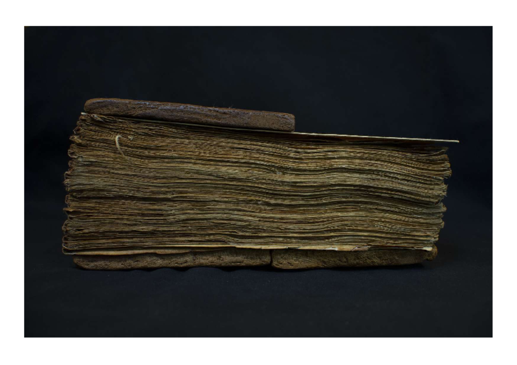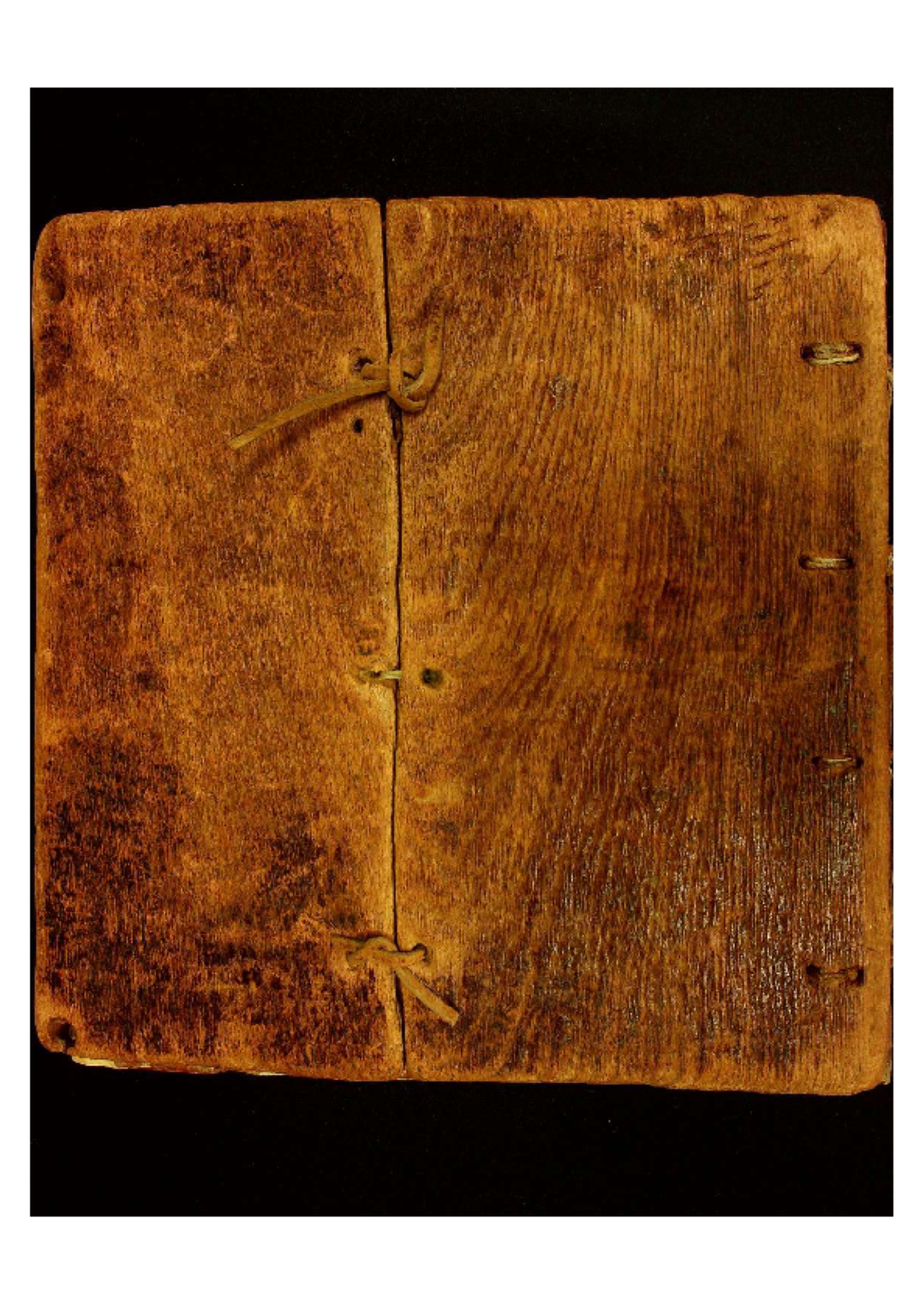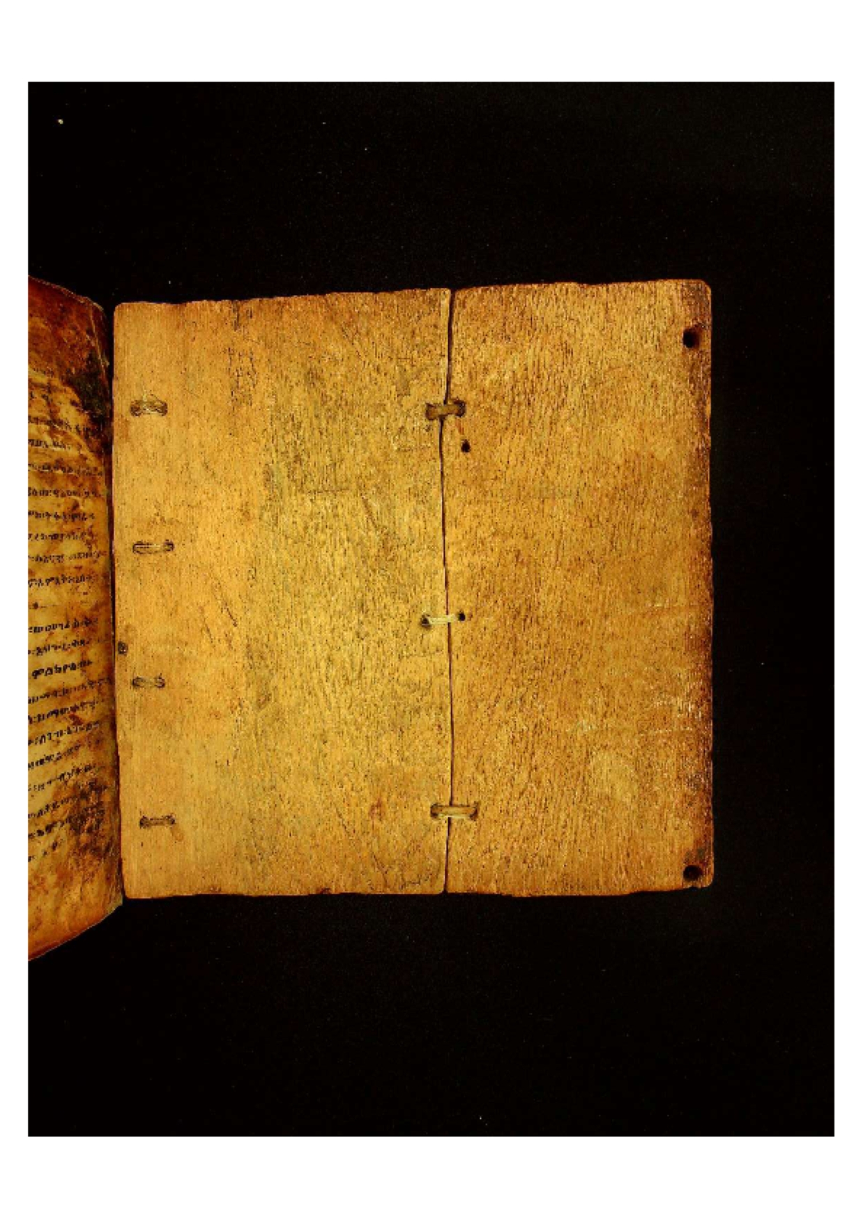 Two wooden boards covered. The spine is uncovered. Four sewing stations. |