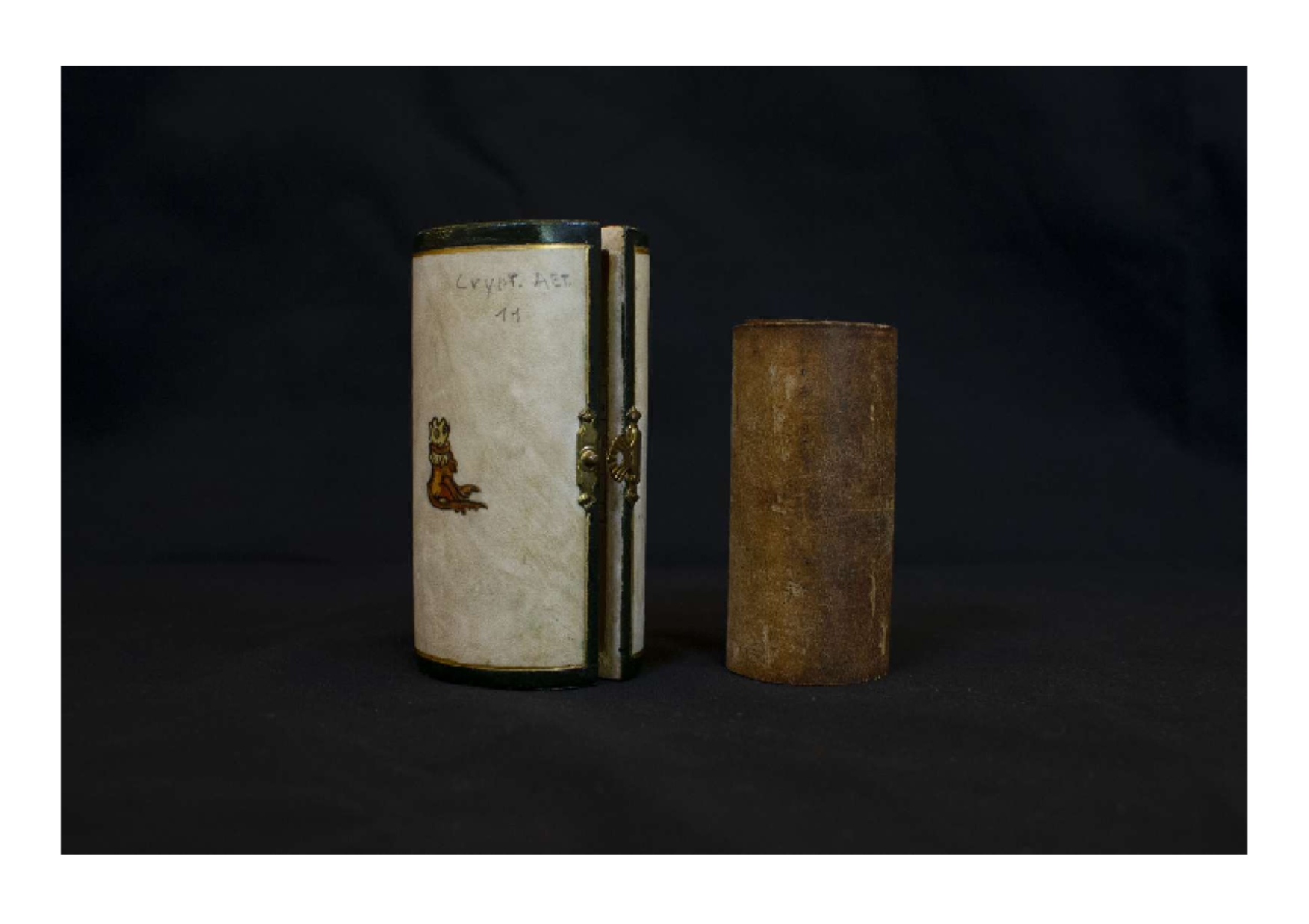 The scroll is stored inside a painted wooden case. |