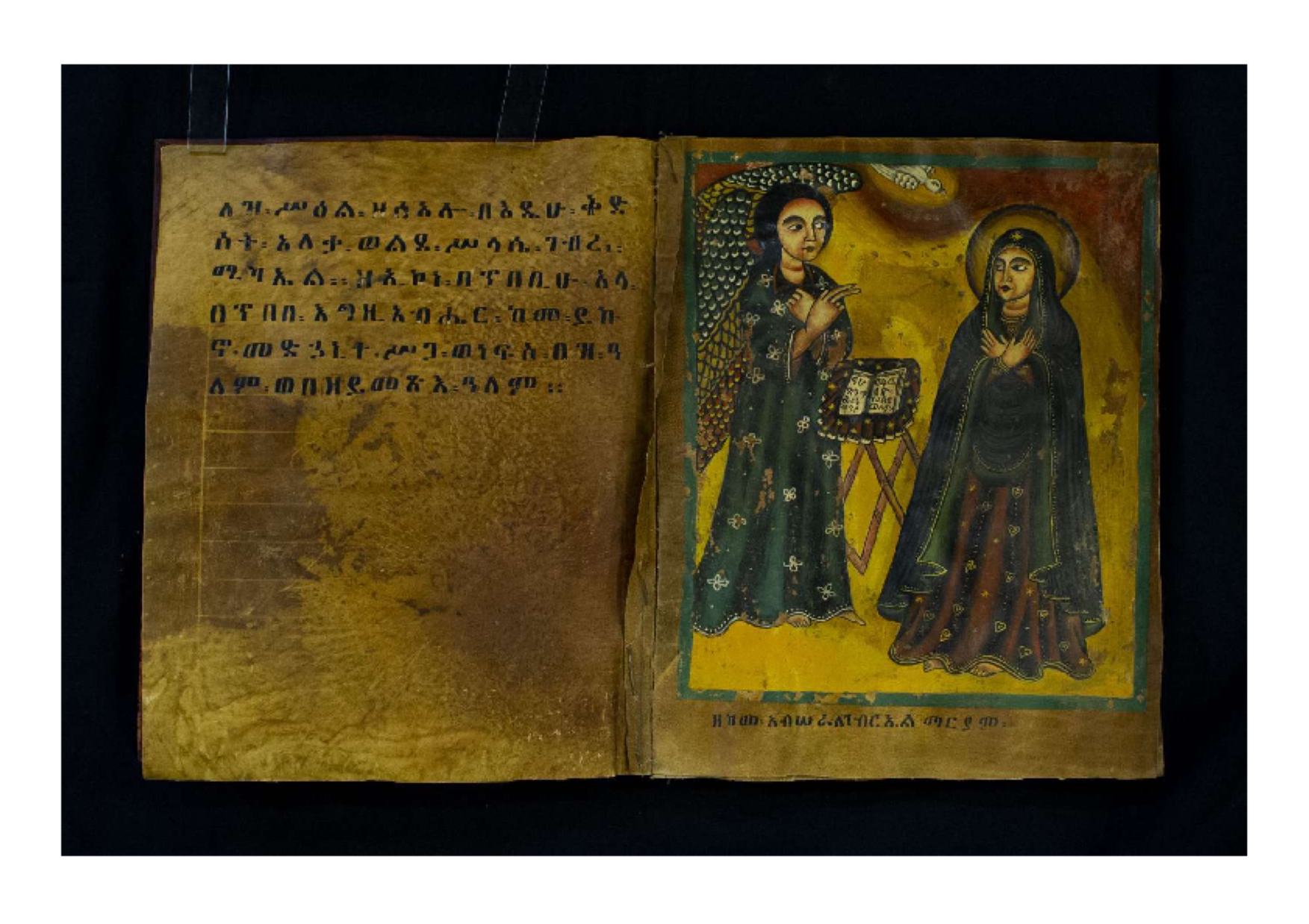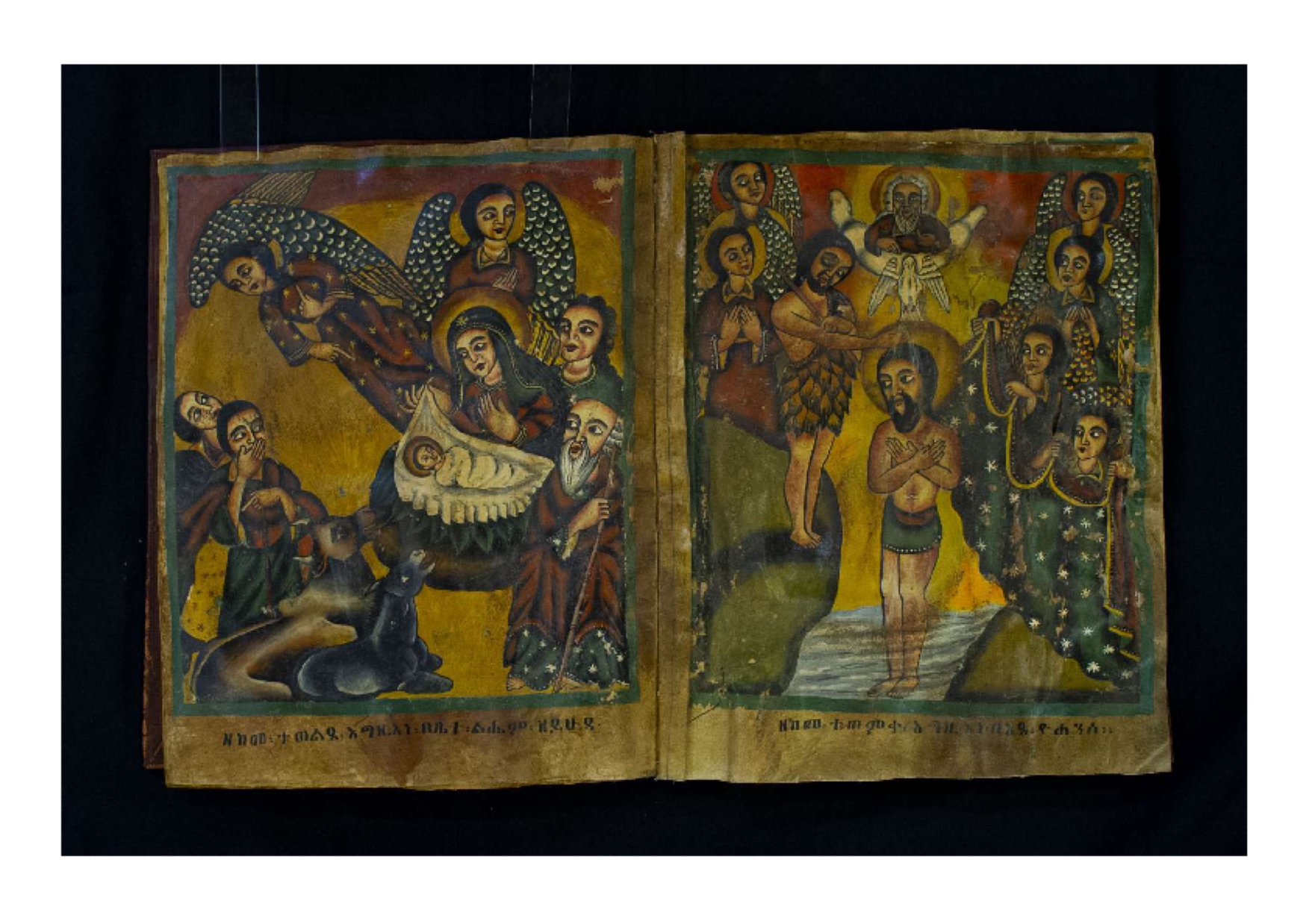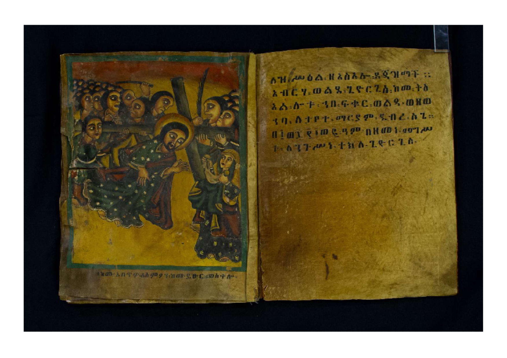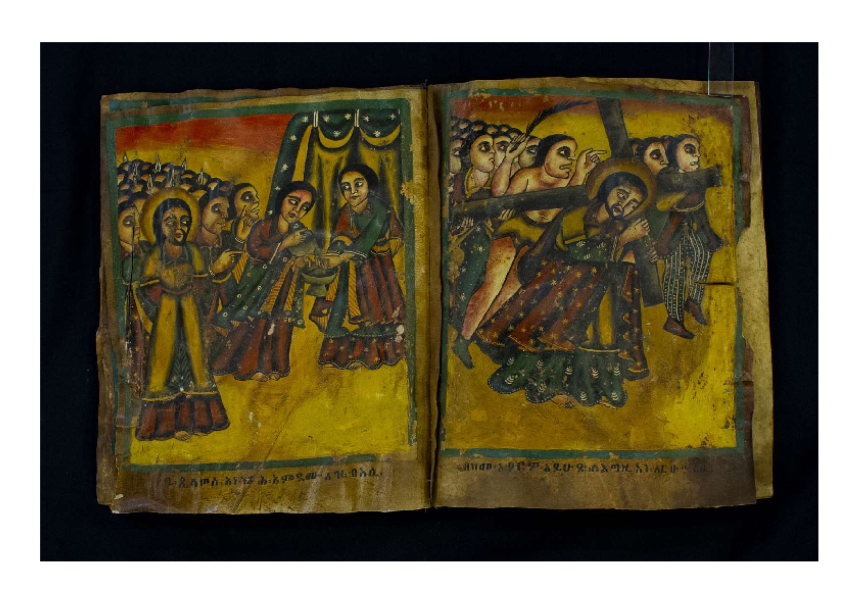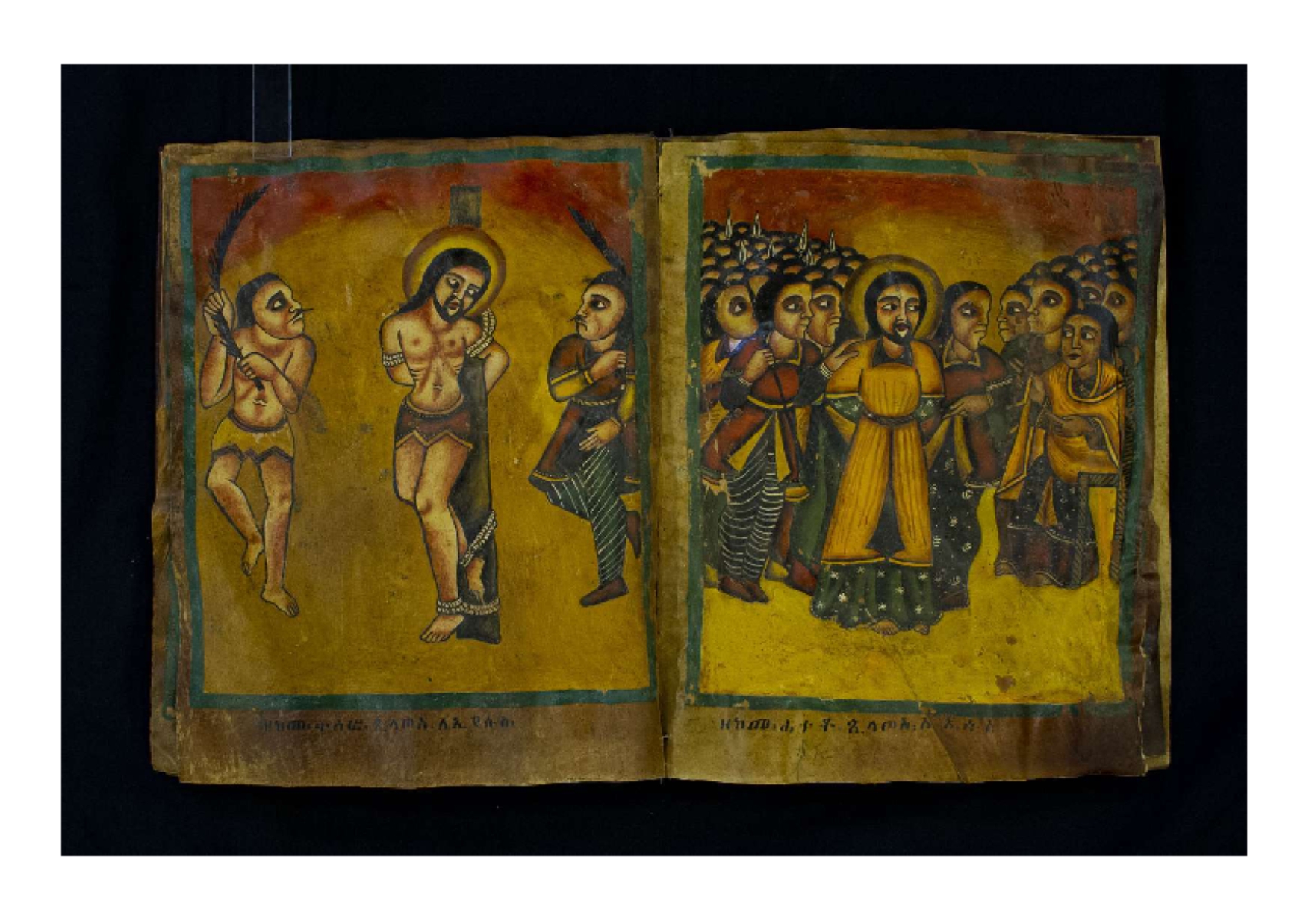 1. F. 2r: Colorful full-page illustration of the Annunciation. Caption: ዘከመ፡ አብሠራ፡ ለገብርኤል፡ ማርያም፡. 2. F. 2v: Colorful full-page illustration of the Nativity. Caption: ዘከመ፡ ተወልደ፡ እግዚእነ፡ በቤተ፡ ልሔም፡ ዘይሁድ፡. 3. F. 3r: Colorful full-page illustration of the Baptism of Christ. Caption: ዘከመ፡ ተጠምቀ፡ እግዚእነ፡ በእደ፡ ዮሐንስ፡. 4. F. 3v: Colorful full-page illustration of the Wedding at Cana. Caption ዘከመ፡ ገብረ፡ እግዚእነ፡ ተአምረ፡ በቃና፡ ዘገሊላ፡: 5. F. 4r: Colorful full-page illustration of the Arrest of Jesus. Caption: ዘከመ፡ አኀዝዎ፡ አይሁድ፡ ለእግዚእነ፡. 6. F. 4v: Colorful full-page illustration of the Flagellation of Jesus. Caption: ዘከመ፡ ቀሠፈኦ፡ ጲላጦስ፡ ለኢየሱስ፡. 7. F. 5r: Colorful full-page illustration of Pilate and Jesus. Caption: ዘከመ፡ ሐተቶ፡ ጲላጦስ፡ ለኢየሱስ፡. 8. F. 5v: Colorful full-page illustration of Pilate washing his hands. Caption: ይቤ፡ ጲላጦስ፡ አነ፡ ንጹሕ፡ እምደሙ፡ ለዝ፡ ብእሲ፡. 9. F. 6r: Colorful full-page illustration of Jesus bearing the Cross. Caption: ዘከመ፡ አጾርዎ፡ አይሁድ፡ ለእግዚእነ፡ አርዑተ፡ መስቀሉ፡. 10. F. 6v: Colorful full-page illustration of Simon of Cyrene bearing the Cross. Caption: ዘከመ፡ ዐበጥዎ፡ ለስምዖን፡ ከመ፡ ይጹር፡ መስቀሎ፡. |