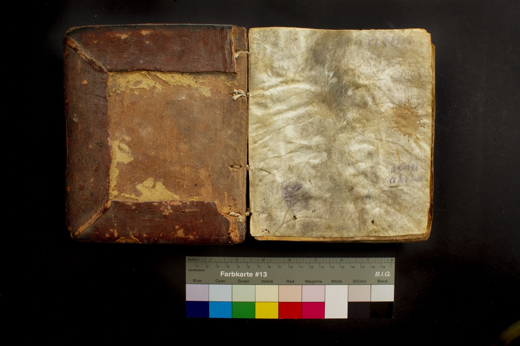 Two wooden boards covered with reddish-brown leather. Both covers are decorated with blind tooled ornament (a cross and other tools). The spine is uncovered. Four sewing stations. |