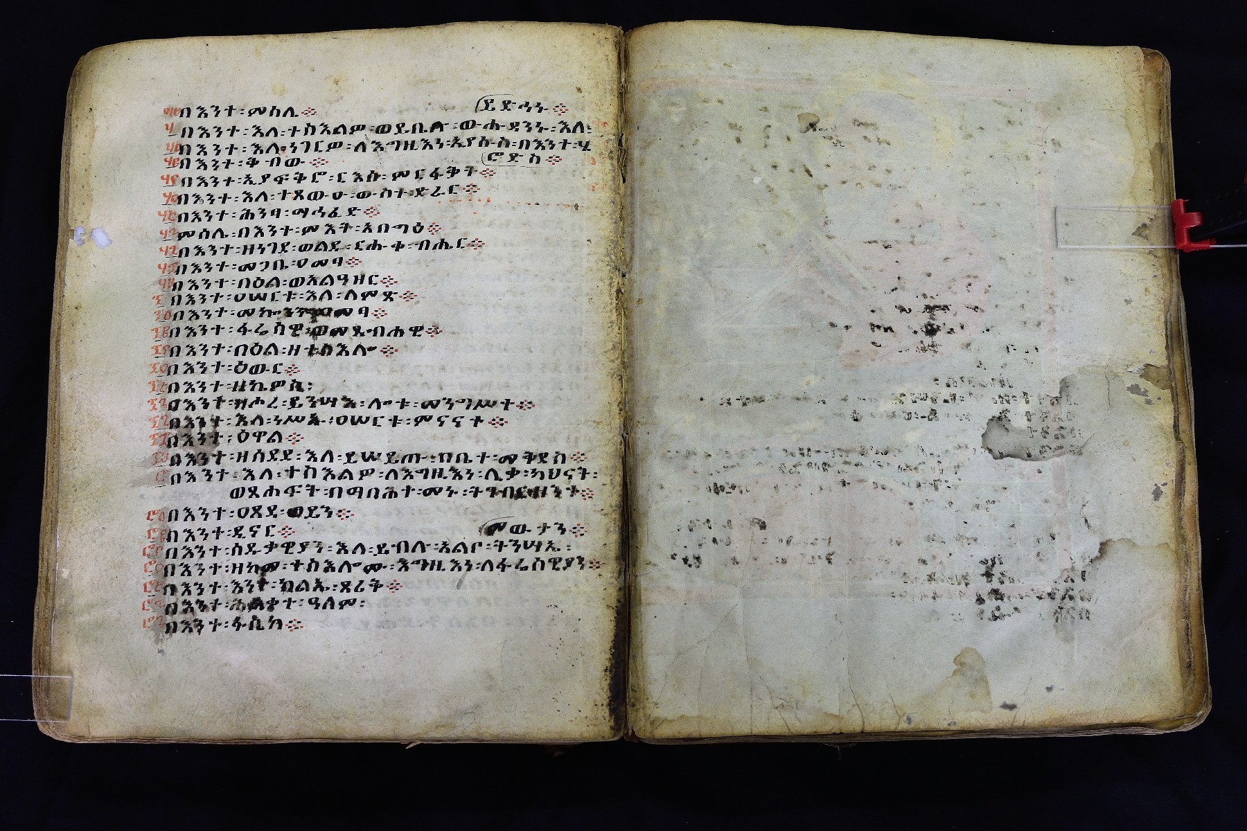 1. Ff. 1va–2rb: Miracle of Mary: Mary offers up water to a thirsty dog. Incipit: ተአምሪሃ፡ ለእግዝእትነ፡ ቅድስት፡ ማርያም፡ ድንግል፡ በክልኤ፡ ወላዲተ፡ አምላክ፡ ጸሎታ፡ ወበረከታ፡ ወምሕ<ረ>ታ፡ ፍቁር፡ ወልዳ፡ የሀሉ፡ ምስለ፡ ገብር፡ […] ሰላም፡ አሜን፡ ወሐለዋ፡ አንስት፡ ምስለ፡ እግዚእት፡ (sic) ቅድስት፡ ማርያም፡ ድንግል፡ በክልኤ፡ ወላዲተ፡ አምላክ፡ ወመጽአ፡ ሃቤሆን፡ ከልብ፡ ጽመአ፡ (scil. ጽሙአ፡), “Miracles of our Lady Holy Mary, two-fold virgin, mother of God. May her prayer, her blessing, and her mercy be upon her beloved son with the servant […], peace, amen. There were some women with our Lady Holy Mary, two-fold virgin, the mother of God, and a thirsty dog came to them”. The text is written in an untrained hand. It begins on the outer margin of f. 2rb and continues on the lower margin of ff. 2ra, 1va, and 1vb. The name of the supplicant has been erased. 2. F. 3r: unidentified note, written in black ink in an inaccurate hand. Text: ሰዐወ፡ ሃበኪ፡ ዘ፡ እብራዊ፡ ለድምያኖስ፡ አመተ፡ ይስሃቅ፡ ዘአትሎኪያ፡ ምስለ[፡] አራቱ፡ ዘእጽ፡ ጌ፡ አፀደ፡ ወይን፡ማርያም፡ ዘካርያስ፡ ሐይልኪ፡ ማርያም፡ ስነ፡ አሪባዋያን፡ ሃይለኪ፡ ተወኪፍኪ፡. 3. Ff. 11va–b: elaborate protective prayer, written in an inaccurate hand by a certain Särṣä Dǝngǝl. The text contains several citations from psalms and other non-biblical sources. Incipit: [..]እግዚኦ፡ መኑ፡ ከማከ፡ (cp. Ps 34.11) እስከ፡ ሳበ፡ (sic) ይብል፡ ምባእ፡ ውስተ፡ ገጾሙ፡ ኅሳረ፡ አቶ<፡> ዮናውል፡ ድልቅስም፡ አዶናይ፡ ይርከትዮን፡ ይንጥርስ፡ አንስእ፡ ኃይልከ፡ ወነአ፡ አድሕነነ<፡> (cp. Ps 79:3) እስመ፡ ሃብአኒ፡ ውስተ፡ ጽላሎቲ፡ በዕለተ፡ ምንዳቤ፡ ወሰወርኒ፡ በእንተ፡ በምሕባአ፡ ጽላሎቱ፡ (cp. Ps 26:9). 4. F. 12vb: note written by the same hand of the previous text, of which this is probably the continuation. 5. F. 15r: Mälkǝʾ-hymn to Mary, probably written in the same hand as texts 3 and 4. Incipit: ይቤላ፡ መልአክ፡ ሰላም፡ ለኪ፡ ይቤላ፡ ገብርኤል፡ ሰላም፡ ለኪ። ማርያም፡ ድንግል፡ ሰላም፡ ለኪ፡ ወላዲተ፡ አምላክ፡ “The angel told her: ‘Salutation to you’. Gabriel told her: ‘Salutation to you, Virgin Mary, salutation to you, mother of God’”. 6. F. 16va: synopsis of the passion of Jesus Christ on Good Friday. The text is written in an ancient hand, probably contemporary to that of the main text. Elements of the interpunction and of the numerals are rubricated. Incipit: በዓርብ፡ ዕለት፡ ሶበ፡ ይጸብሕ፡ ምድረ፡ ዕዝል፡ በል፡ በልዑ፡ ቃል፡ ሃሌ፡ ሃሌ፡ ሉያ። በጽባሕ፡ ተመከሩ፡ ሊቀነ፡ (sic) ካህናት፡ ይስቅልዎ፡ ለኢየሱስ።. |