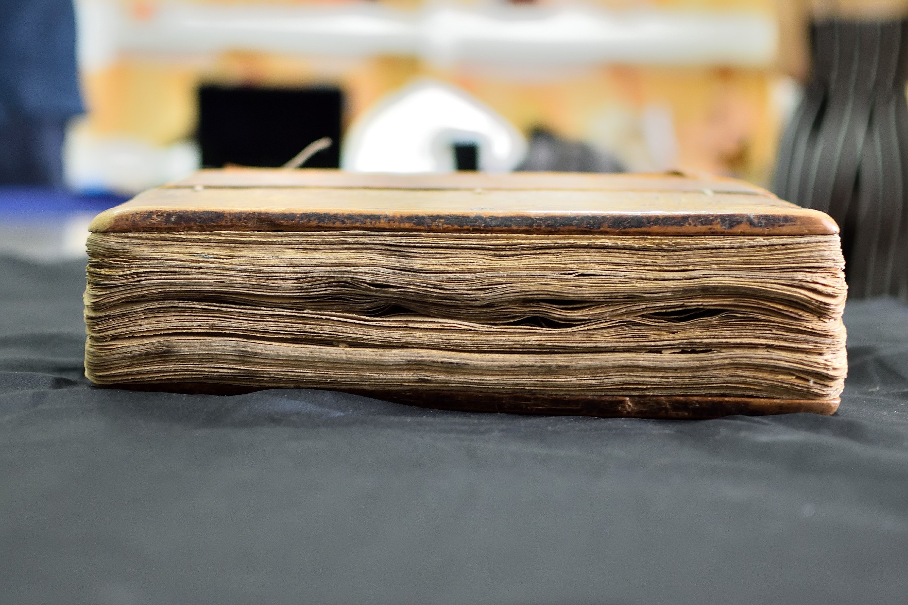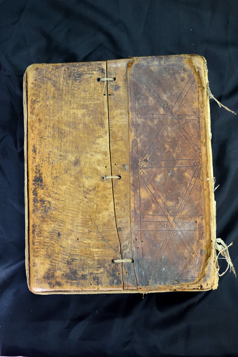 Two wooden boards covered with reddish-brown leather for the inner half along the vertical axis. Both covers are decorated on the outer side with blind tooled ornaments in the shape of lines and circles. Four sewing stations. Presence of a dark blue cotton bookmark, sewn in the outer upper margin of f. 145. |