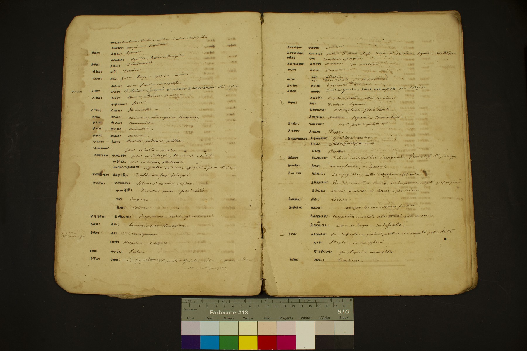 The manuscript was written by Padre Giovanni Stella (1822–1869) in 1854. The vocabulary was expanded by P. Stella over the following years. The manuscript came into possession of the Società Geografica Italiana at some time between 1869, when P. Stella died, and 1930, when the existence of this material was first reported in Giuseppe Gabrieli’s Manoscritti e carte orientali nelle biblioteche e negli archivi d'Italia: dati statistici e bibliografici delle collezioni, loro storia e catalogazione, 1930. The manuscript is also mentioned in Silvio Zanutto’s Bibliografia etiopica (1932). |