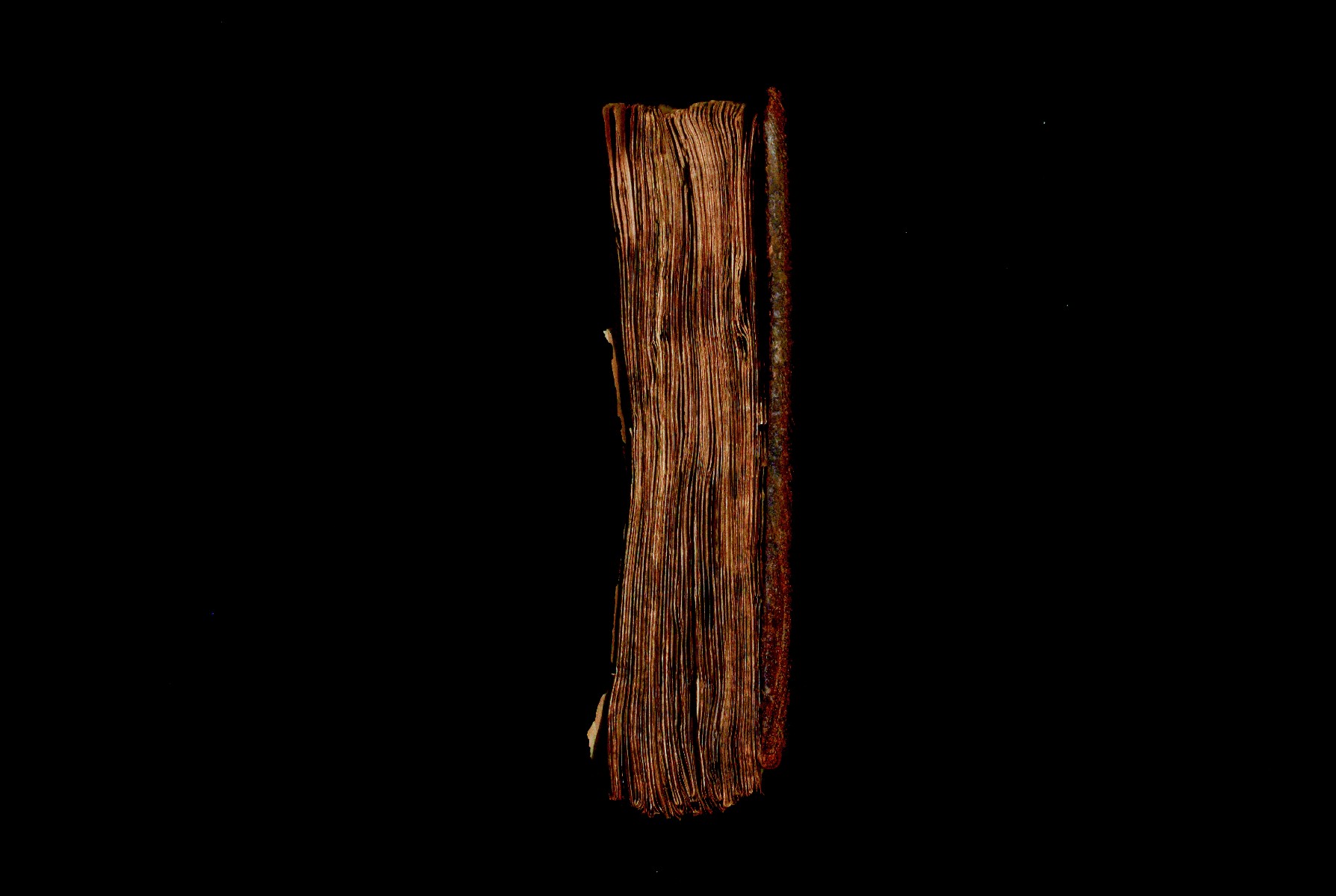 Originally two wooden boards (the back board is missing). The spine is uncovered. Four sewing stations. |