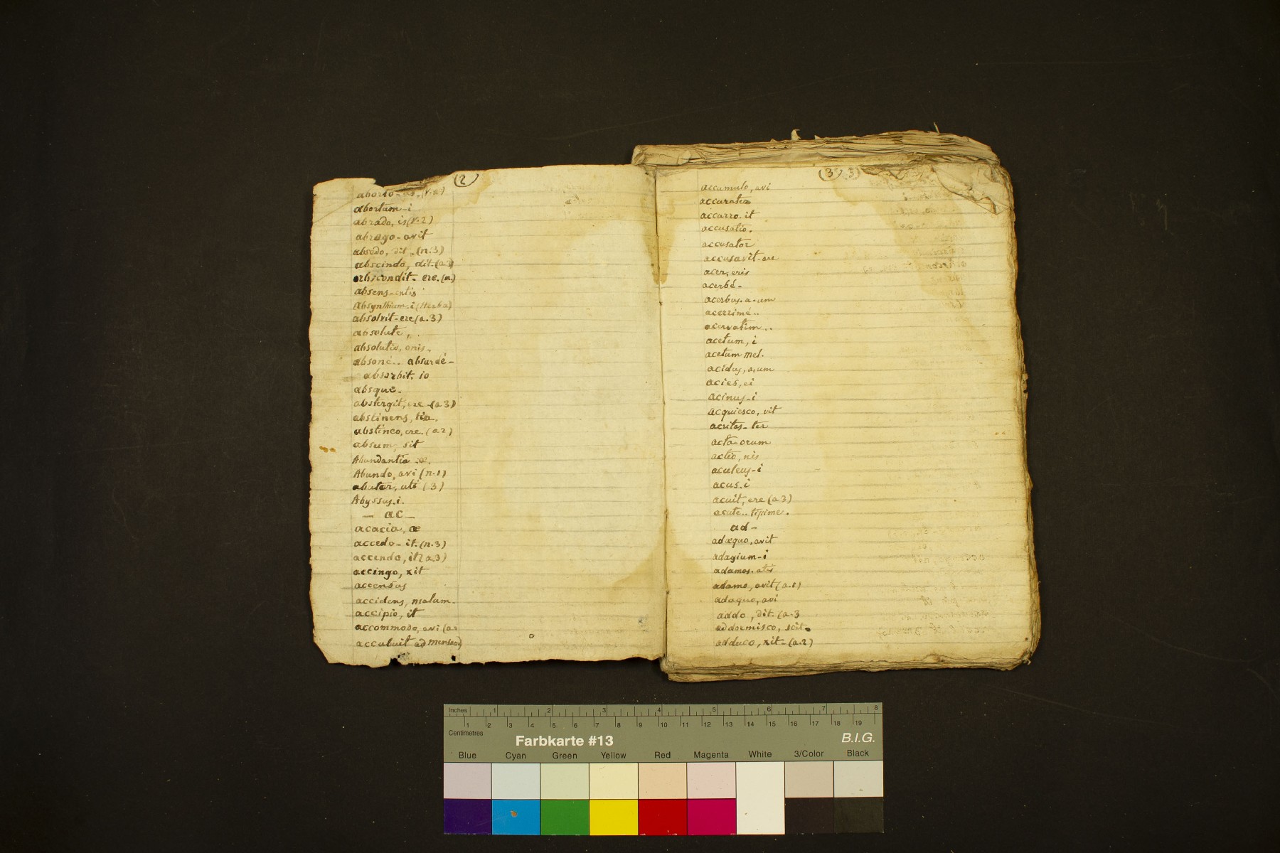 The item also includes two additional loose quires, labelled 1 and 2. Quire 1 is a medium-size paper bifolium. Ff. 1–2 contain a wordlist in an unidentified Ethiopian language written in black ink in Latin script, in all likelihood by Léon des Avanchers. Each entry is accompanied by the respective meaning in Italian. Ff. 3–4 are blank.
