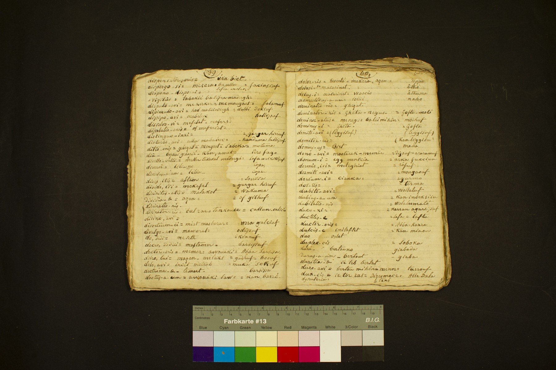 Ff. 1r–75v: Latin-Amharic-Oromo vocabulary, incomplete. The vocabulary is arranged on three irregular columns. The first column accommodates an alphabetical list of Latin words. The second and the third columns accommodate the corresponding meanings in Amharic and Oromo, transcribed in Latin script. On ff. 47v–48v a fourth column has been added with a few counterparts in Sidamo. Languages are indicated on the top of the column; the Oromo wordlist is marked mostly as “Galla” (ff. 7v, 9v–10v, 13v–18r, etc.), sometimes as “Oromo” (ff. 3v, 6v–7r), and occasionally as both (ff. 8v–9r). A large number of Latin entries have no Amharic, Oromo or Sidamo counterpart. Sections are indicated on the top of the page: A (f. 1r), B (f. 6v), C (f. 8r), D (f. 17v), E (f. 21v), F (f. 24r), G (f. 28r), H (f. 30r), I (f. 32r), L (f. 42v), M (f. 47v), N (f. 56v), O (f. 61r), P (f. 66r). The vocabulary is incomplete: it stops abruptly on f. 75v with the word “procurro – curri”. The year of composition of the lexicon has been added in the upper inner corner of f. 1: “1865”. The reading is uncertain due to ink partially faded out. |