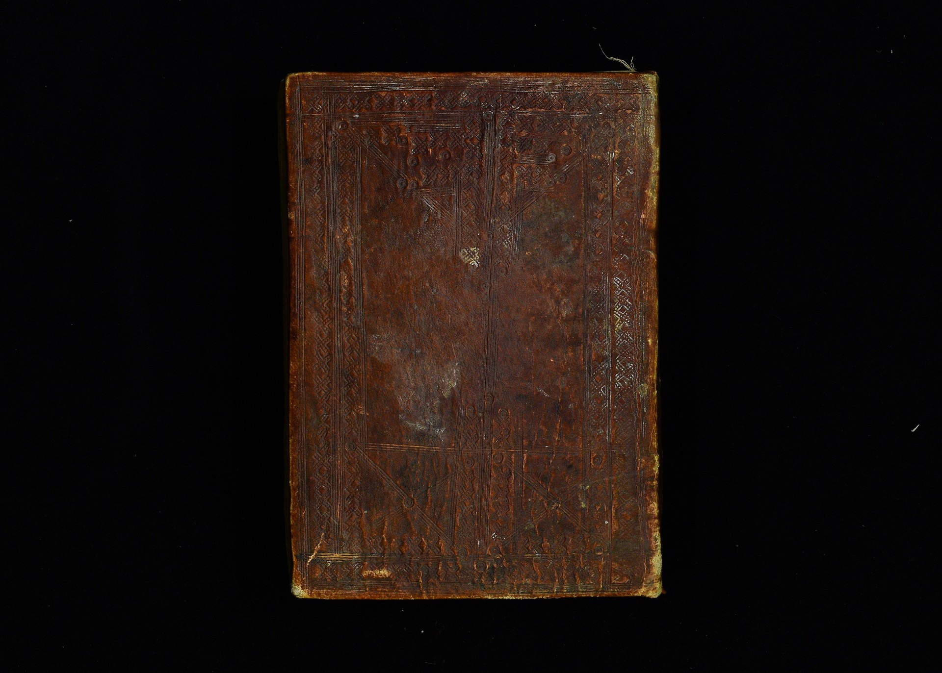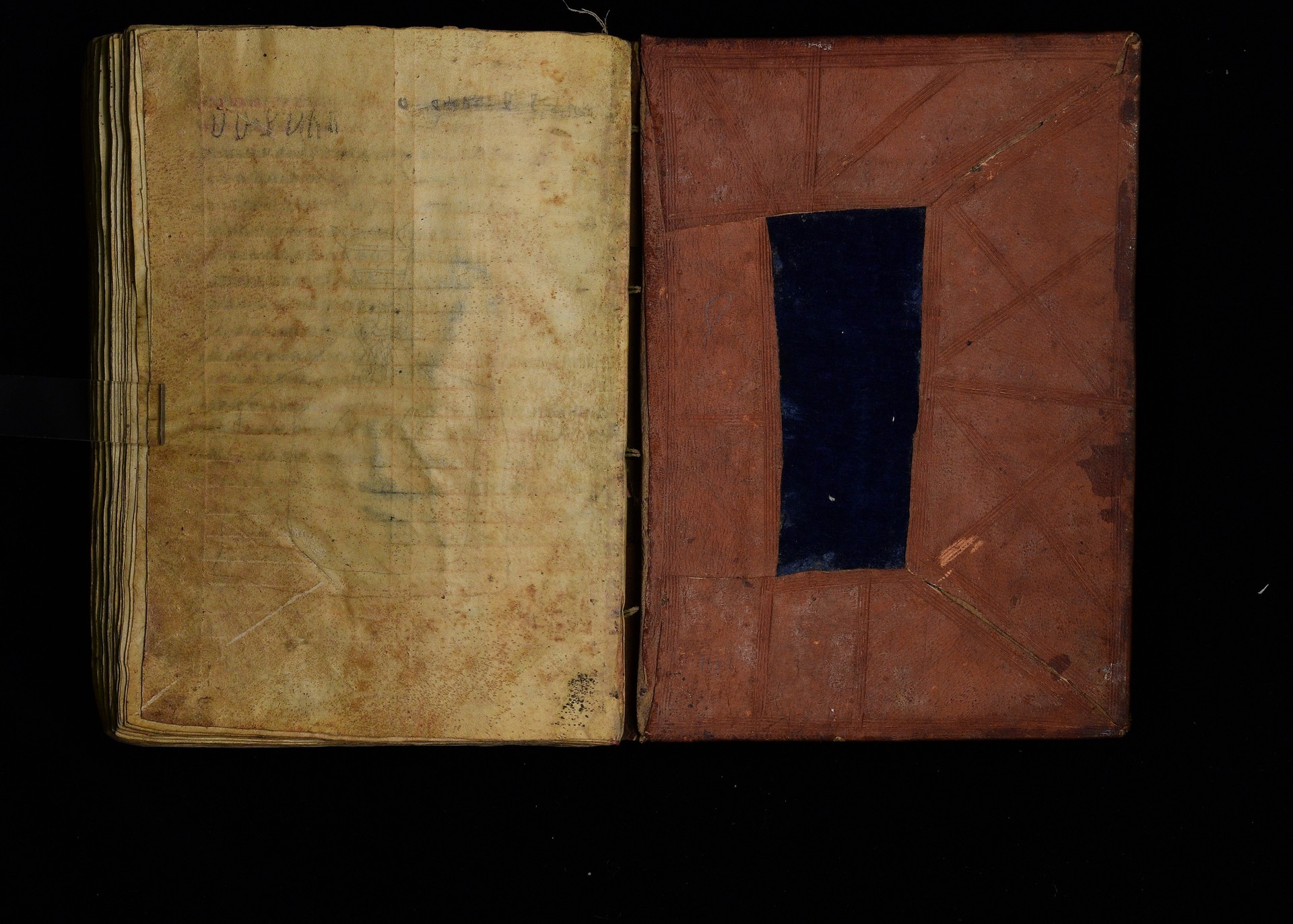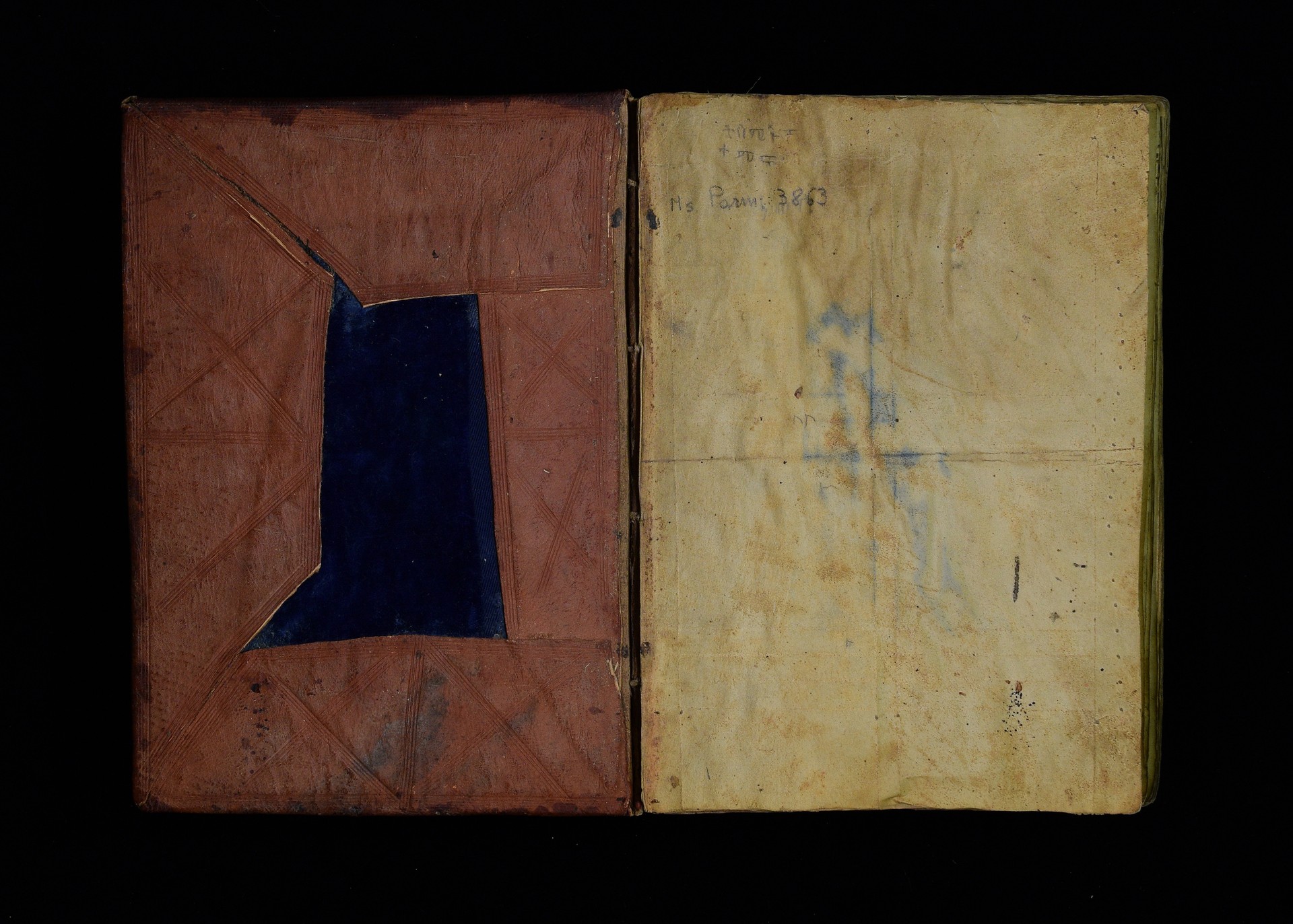 Two wooden boards, leather cover, blue textile. Four sewing stations. |