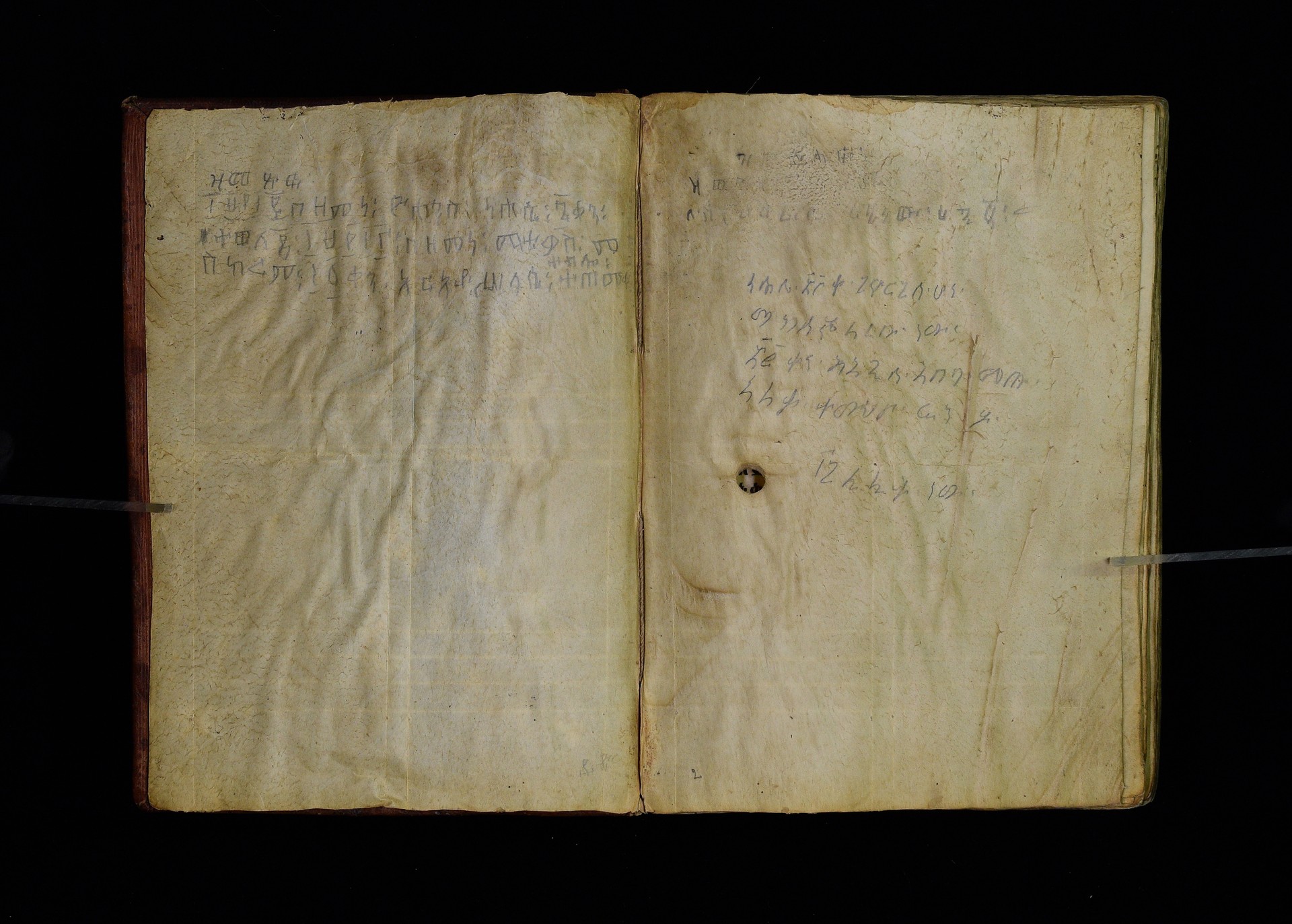 1. F. Iv: note in pencil: ዘመጽፍ፡ ፲፱፻፲፪በዘመነ፡ ዮሐንስ፡ ነሐሴ፡ ፯ቀን፡ ተወለደ፡ ፲፱፻፲፫በዘመነ፡ ማቴዎስ፡ መስከረም፡ ፲፩ቀን፡ አርአየ፡ ሥላሴ፡ ተብሎ፡ ተጠመቀ፡. The note indicates that a certain Arʾaya Śǝllase was born on 7 Näḥase 1912, year of John, i.e. 13 August 1920. |
