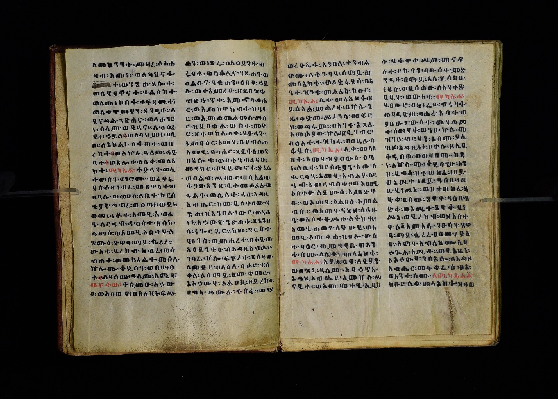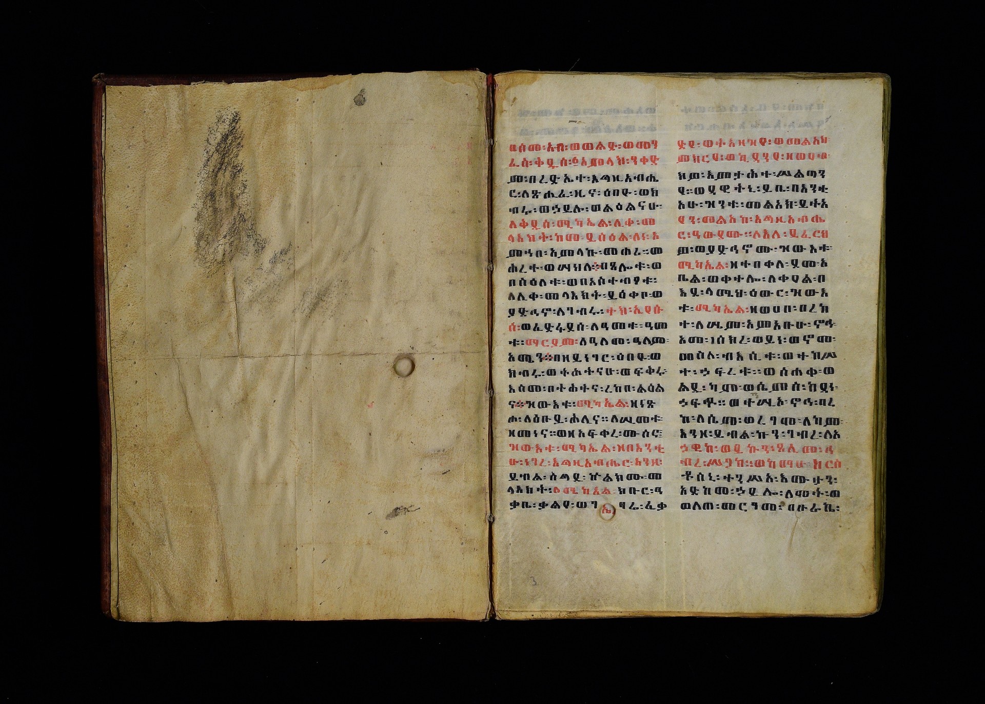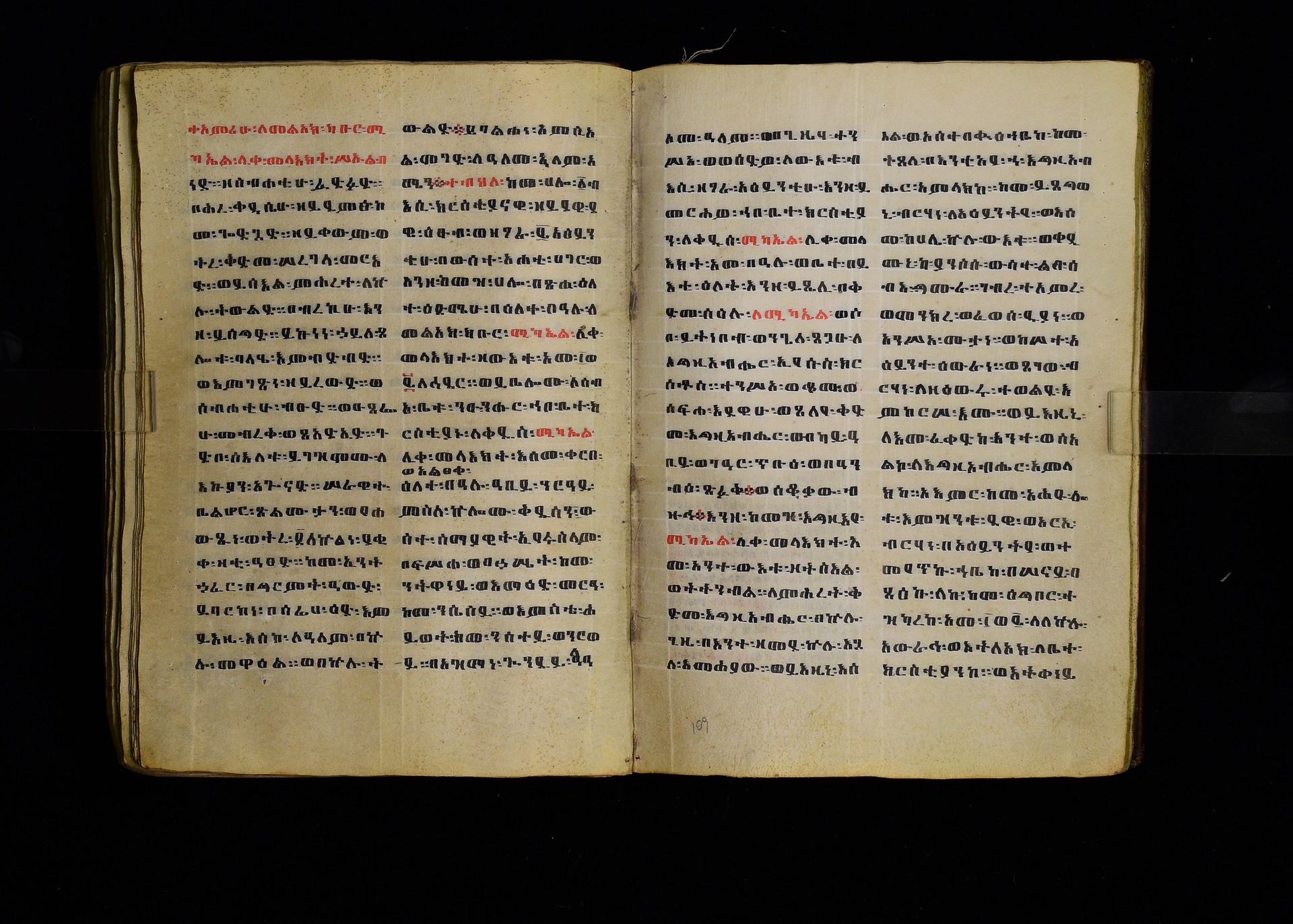 1. ff. 3ra–123rb: Dǝrsanä Mikaʾel, “Homily in Honour of St Michael” (CAe 1295). 1.1. ff. 3ra–8rb: Introduction. Incipit: በስመ፡ አብ፡ ወወልድ፡ ወመንፈስ፡ ቅዱስ፡ ፩አምላክ፡ ንቀድም፡ በረድኤተ፡ እግዚአብሔር፡ ለጽሒፈ፡ ዜና፡ ዕበዮ፡ ወክብሩ፡ ወኃይሉ፡ ወልዕልናሁ፡ ለቅዱስ፡ ሚካኤል፡ ሊቀ፡ መላእክት፡ ከመ፡ ይስዕል፡ ለነ፡ እምኀበ፡ አምላኩ፡ መሐሪ። ምሕረተ፡ ወሣህል። 1.2. ff. 9ra–23rb: Reading for 12 Ḫǝdar. 1.2.1. ff. 9ra–20rb: Homily by Timothy (Dämatewos) of Alexandria (CAe 1637). Heading: በስመ፡ አብ፡ ወወልድ፡ ወመንፈስ፡ ቅዱስ፡ ፩አምላክ፡ ዝንቱ፡ ድርሳን፡ ዘደረሰ፡ አባ፡ ደማቴዎስ፡ ዘለእስክድርያ፡ ዘይትነበብ፡ በዕለተ፡ በዓሉ፡ ለዓቢይ፡ ወክቡር፡ ወለቅዱስ፡ ሊቀ፡ መላእክት፡ ሚካኤል፡ አመ፡ ፲ወ፪ለወርኃ፡ ኅዳር፡ ያርእየኒ፡ ኀይለ፡ ወክብረ፡ ዘወሀቦ፡ እግዚአብሔር፡ 1.2.2. ff. 20rb–21ra: Introduction to the miracles performed by St Michael. Incipit: ንቀድም፡ በረድኤተ፡ እግዚአብሔር፡ ልዑል፡ ለጽሒፈ፡ ተአምራቲሁ፡ ወኃይሉ፡ ለመልአክ፡ ክቡር፡ ሚካኤል፡ ሊቀ፡ መላእክት፡ ትጉሃነ፡ ሰማይ። 1.2.3. ff. 21ra–22vb: Miracle of the Egyptians whose boat was troubled by a strong wind (CAe 7170). Heading: ተአምሪሁ፡ ለመልአክ፡ ክቡር፡ ሚካኤል፡ ሊቀ፡ መላእክት፡ ፍሡሕ፡ ዘስዑል፡ ለነድ፡ መፍርህ። Incipit: እከሥት፡ በምሳሌ፡ ወእነግር፡ አምሳለ፡ ዘእምትካት። ወኅቡዓተ፡ ዘእመሠረት። እንብብ፡ ወእፌክር፡ ተአምረ፡ ወመንክረ፡ ዘገብረ፡ ቅዱስ፡ ሚካኤል፡ 1.2.4. ff. 22vb–23rb: Commemorative notice on Michael’s appearance to Joshua. Incipit: በስመ፡ አብ፡ ወወልድ፡ ወመንፈስ፡ ቅዱስ፡ ፩አምላክ፡ አመ፡ ፲ወ፪ለኅዳር፡ በዛቲ፡ ዕለት፡ ትዝካረ፡ በዓሉ፡ ለመልአከ፡ ሣህል፡ ወምሕረት፡ ሚካኤል፡ ሊቀ፡ መላእክት፡ ወርእሰ፡ ሰማያውያን፡ መሐሪ፡ 1.2.5. f. 23rb: Rhymed sälam-hymn for Ḫǝdar. Incipit: ሰላም፡ ዕብል፡ ኪያከ፡ መልአከ። ርኅሩኅ፡ ልብ፡ ለኵሉ፡ አንተ፡ ኢኮንከ፡ ድሩከ፡ ሚካኤል፡ ሊቅየ፡ ለለእቤለከ። 1.3. ff. 24ra–33rb: Reading for 12 Taḫśaś. 1.3.1. ff. 24ra–30vb: Homily on Durataʾos and Tiyobǝstǝya (CAe 3958). Heading: በስመ፡ አብ፡ ወወልድ፡ ወመንፈስ፡ ቅዱስ፡ ፩አምላክ፡ ድርሳን፡ ወነገር፡ ዘቅዱስ፡ ወክቡር፡ ሊቀ፡ መላእክት፡ ሚካኤል፡ ዘይትነበብ፡ አመ፡ ፲ወ፪ለወርኃ፡ ታኅሣሥ፡ ስምዑ፡ ዘንተ፡ ኵልክሙ፡ አሕዛብ። 1.3.2. ff. 30vb–32va: Miracle on the poor peasant who found a treasure in a fish (CAe 7171). Heading: ተአምሪሁ፡ ለ<ሊ>ቀ፡ መላእክት፡ ሚካኤል፡ መልአክ፡ ኪዳኑ፡ ለክርስቶ(31ra)ስ፡ ንጉሥ፡ ስብሐት። Incipit: ተብሕለ፡ ከመ፡ ሀሎ፡ ፩ብእሲ፡ በውስተ፡ አሐቲ፡ ሀገር፡ መሃይምን፡ ወጻድቅ፡ ዘይፈርሆ፡ ለእግዚአብሔር፡ ወይገብር፡ ምሕረተ፡ ለነዳያን፡ 1.3.3. ff. 32va–33rb: How Michael was sent to the three youths in the furnace. Incipit: በስመ፡ አብ፡ ወወልድ፡ ወመንፈስ፡ ቅዱስ፡ ፩አምላክ፡ {አምላክት፡} አመ፡ ፲ወ፪ለወርኃ፡ ታኅሣሥ፡ (32vb) ተዝካረ፡ በዓሉ፡ ለመልአክ፡ ክቡር፡ ሚካኤል፡ ሊቀ፡ መላእክት፡ ኀበ፡ ሀገረ፡ ባቢሎን። 1.3.4. f. 33rb: Rhymed sälam-hymn for Taḫśaś. Incipit: ሰላም፡ ለከ፡ ዓቃቤ፡ ቅዱሳን፡ እምተሐውኮ። ወለፀረ፡ ነፍሶሙ፡ ዘሞቀሕኮ። አመ፡ መጽአ፡ ወልድ፡ ዘአፈ፡ ነቢያት፡ ሰበኮ። 1.4. ff. 34ra–46rb: Reading for 12 Ṭǝrr. 1.4.1. ff. 34ra–44rb: Homily on the child Tälafinos (CAe 3959). Heading: በስመ፡ አብ፡ ወወልድ፡ ወመንፈስ፡ ቅዱስ፡ ፩አምላ{ላላ}ክ፡ ሥሉስ፡ ዘኢይትሌለይ። ዕሩይ፡ ዘኢይሴደቅ፡ ቃላት። Incipit: መፍትው፡ ትሰምዕዎ፡ በለብዎ፡ እስመ፡ ተጋባእክሙ፡ ከመ፡ ታአምሩ፡ ዕበዮ፡ ለቅዱስ፡ ሚካኤል፡ ሊቀ፡ መላእክት፡ እምካልዓን፡ አብያጺሁ፡ ሊቃነ፡ መላእክት። 1.4.2. ff. 44rb–45vb: Miracle about the rich man who became poor (CAe 7172). Heading: ተአምሪሁ፡ ለቅዱስ፡ ሚካኤል<፡> ሊቀ፡ መላእክት፡ ዘ(44va)ሥዑል፡ በነደ፡ እሳት፡ ርስነ፡ ጸሎቱ፡ ወአስተበቍዖቱ፡ የሃሉ፡ ምስለ፡ ገብሩ፡ ምስለ፡ ኵልነ፡ ሕዝበ፡ ክርስቲ<ያ>ን። Incipit: ተብህለ፡ ከመ፡ ሀሎ፡ ፩ብእሲ፡ ክርስቲያናዊ፡ በውስተ፡ አሐቲ፡ ሀገር፡ ዘይፈርሆ፡ ለእግዚአብሔር፡ ወይገብር፡ ትእዛዞ፡ ወይጽሕቅ፡ ጥቀ፡ ለገቢረ፡ ሠናይ፡ ወይፈቅሮ፡ ለሚካኤል፡ ሊቀ፡ መላእክት። 1.4.3. ff. 45vb–46ra: Commemorative notice on St Michael’s appearance to Jacob. Incipit: በስመ፡ አብ፡ ወወልድ፡ ወመንፈስ፡ ቅዱስ፡ ፩አምላክ፡ አመ፡ ፲ወ፪ለወርኃ፡ ጥር፡ ተዝካረ፡ በዓሉ፡ ለመልአክ፡ ክቡር፡ ሚካኤል፡ ሊቀ፡ መላእክት፡ እስመ፡ በዛቲ፡ ዕለት፡ ፈነወ፡ እግዚአብሔር፡ ለሚካኤል