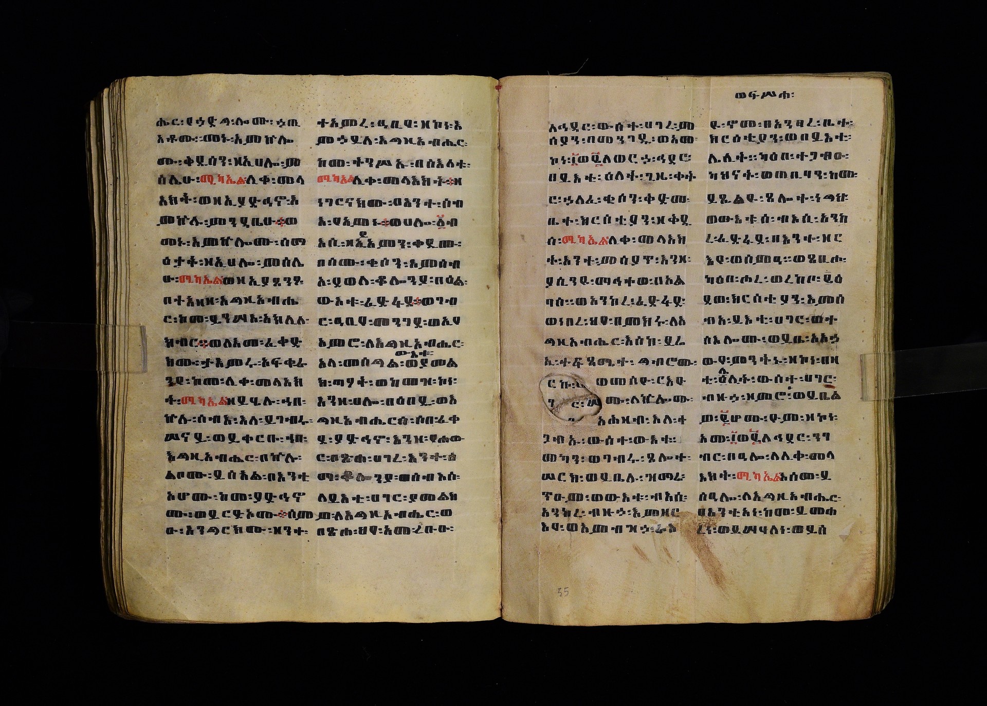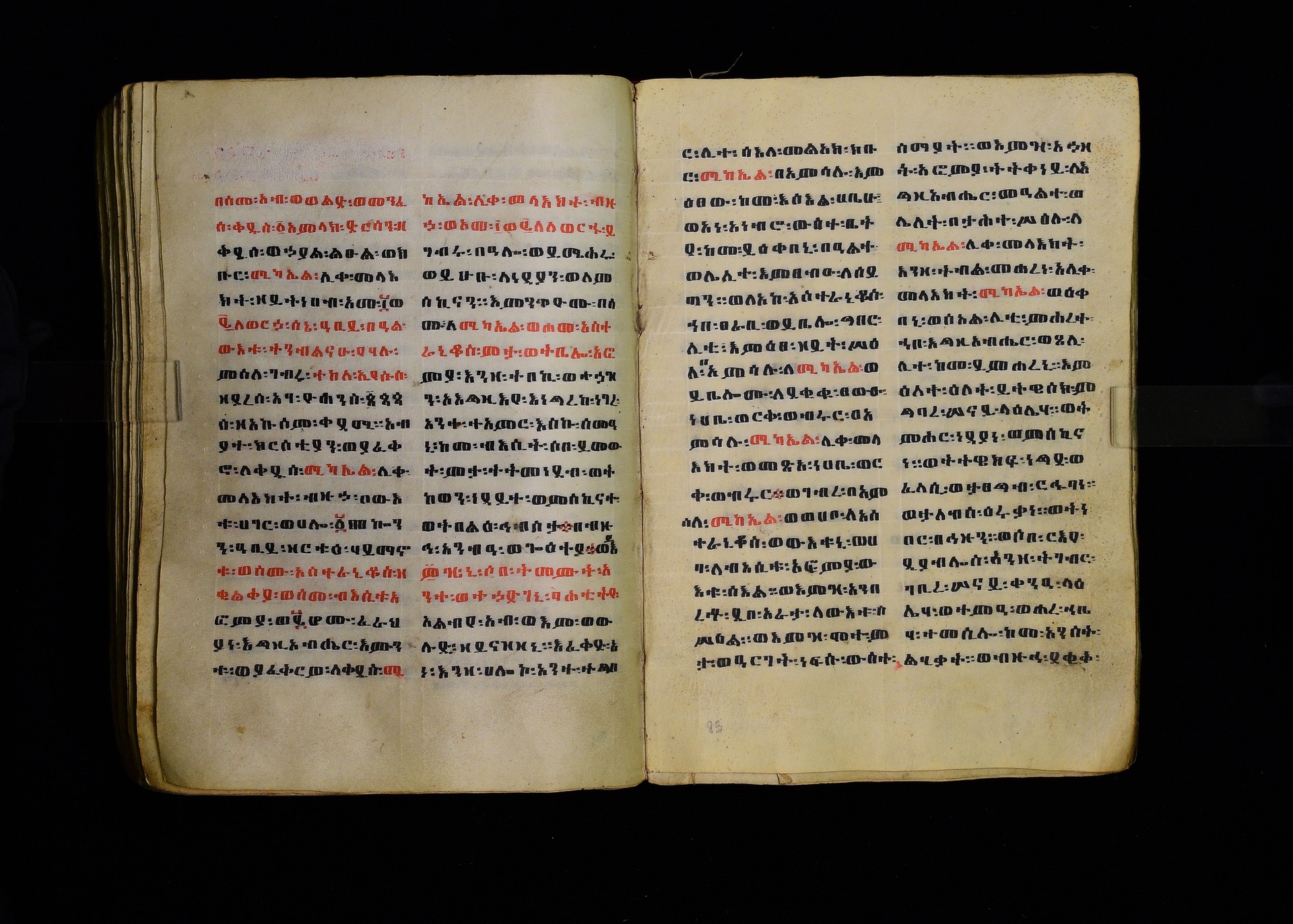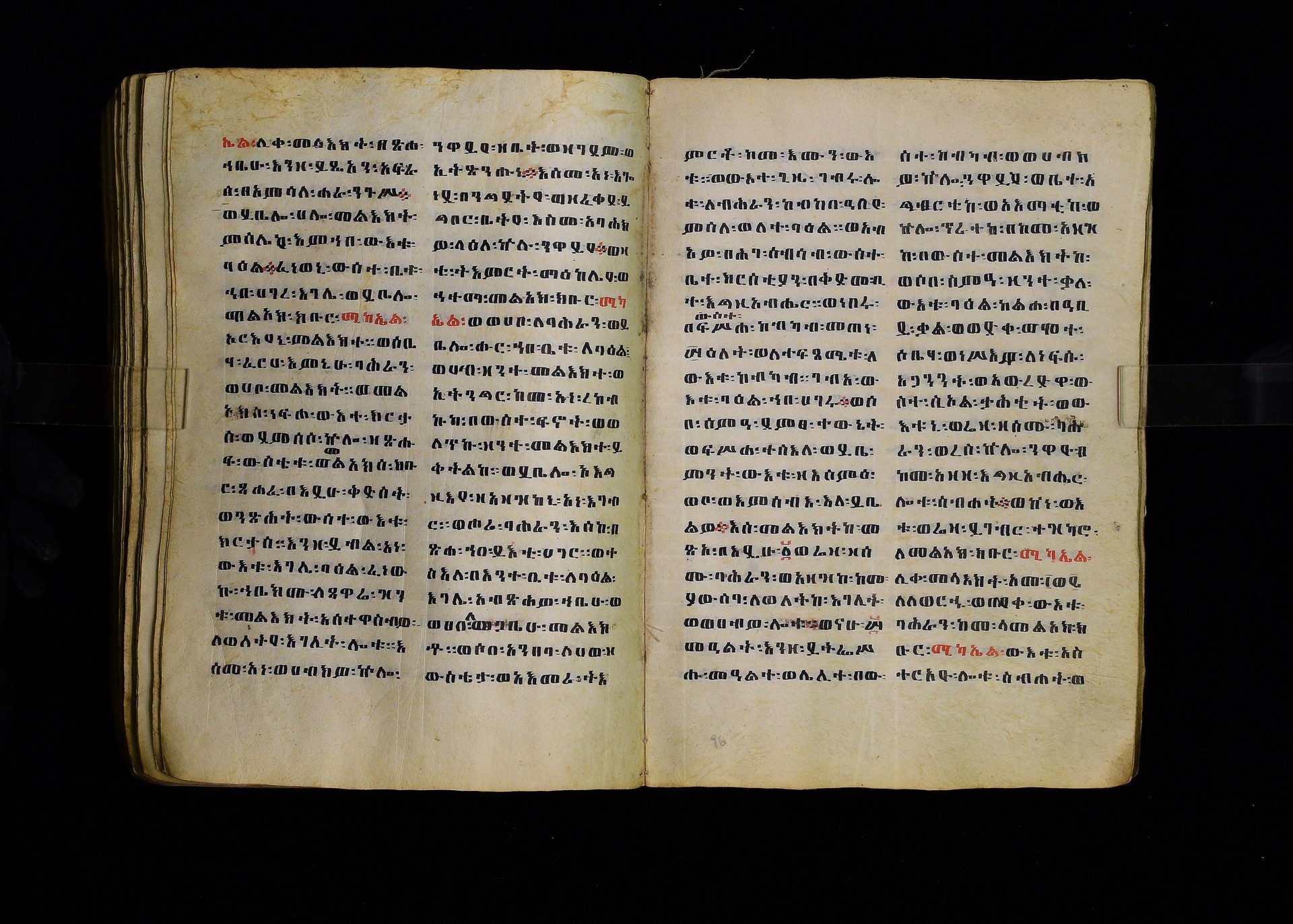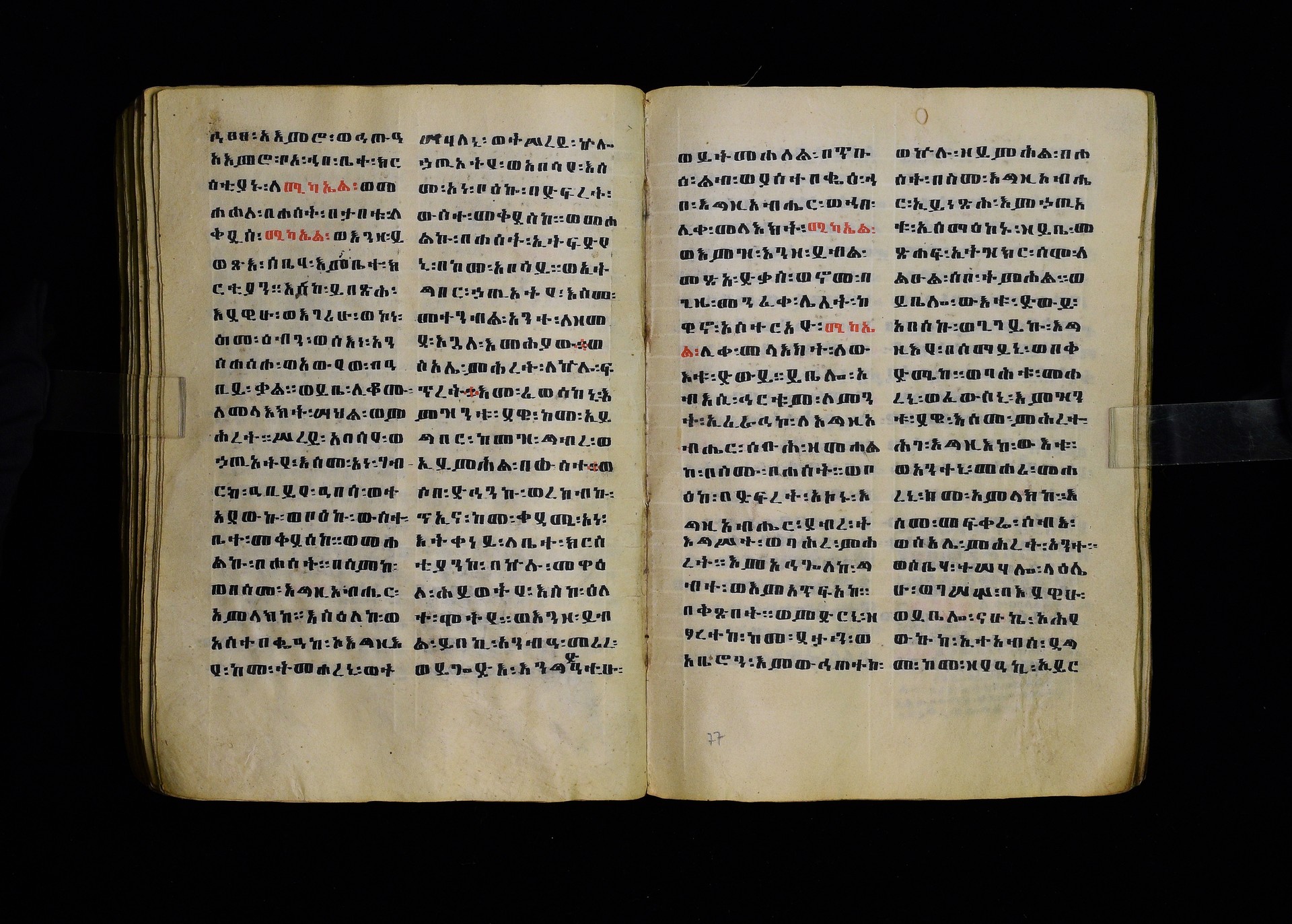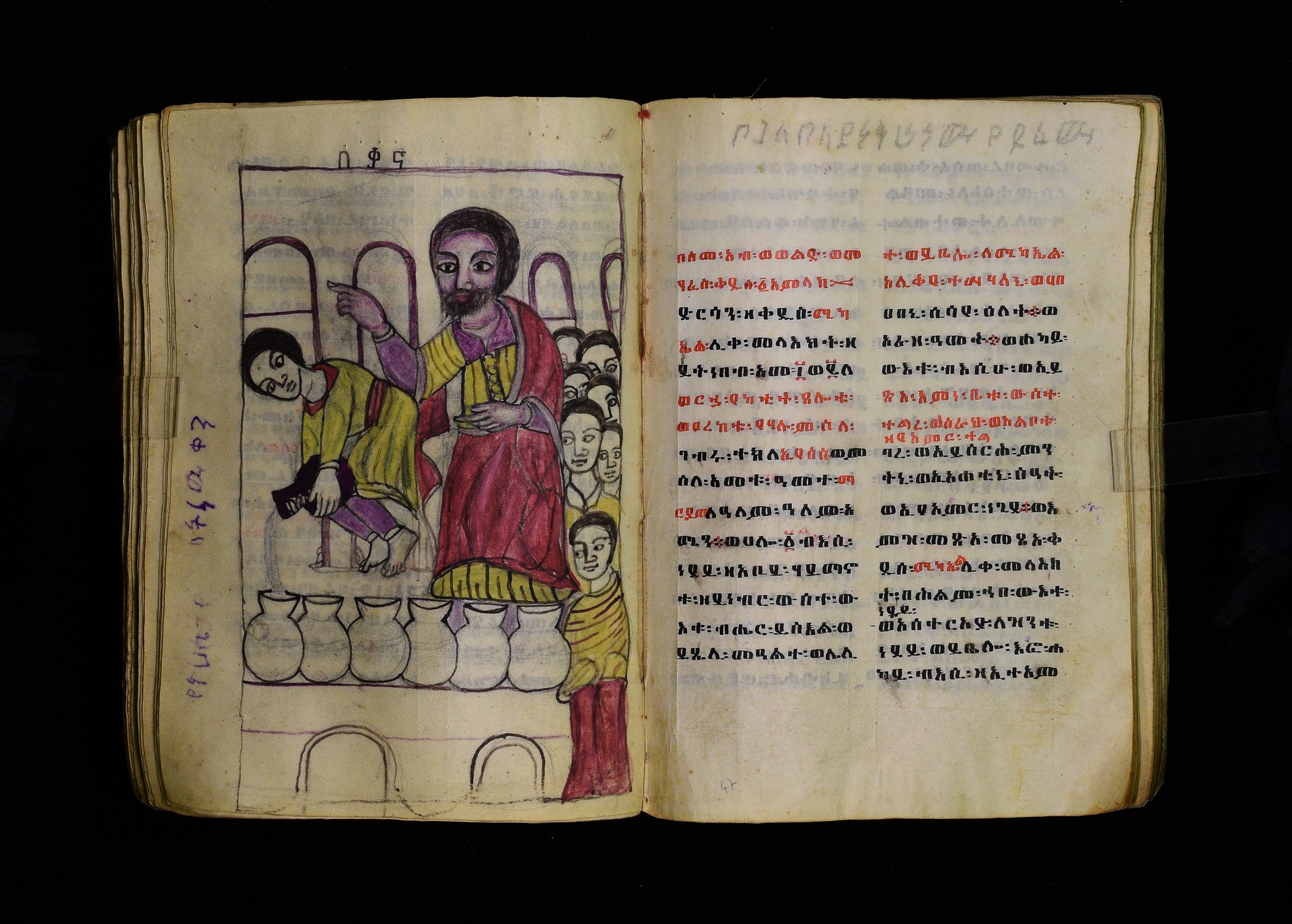 Full-page polychrome miniatures are found on f. 8v (St Michael), f. 33v (George and the dragon), f. 46v (the miracle of the wedding at Cana, with a caption በቃና added in a secondary hand), f. 70v (St Michele). |