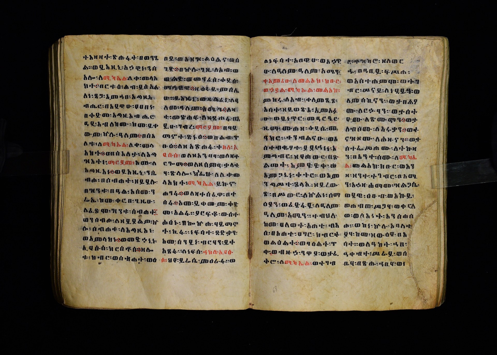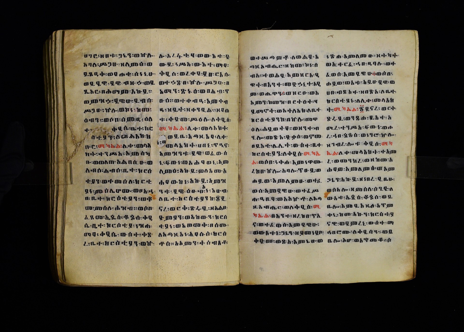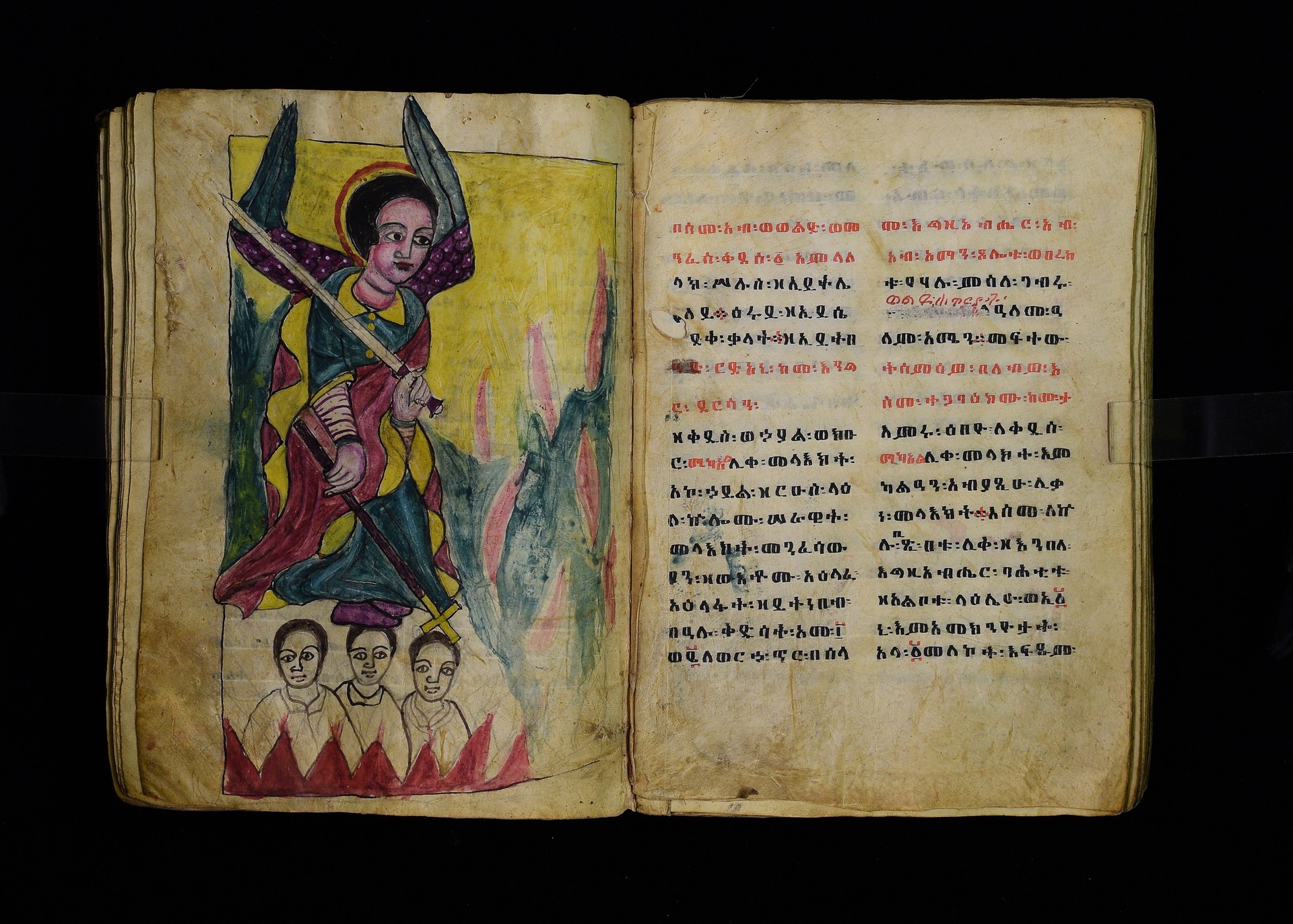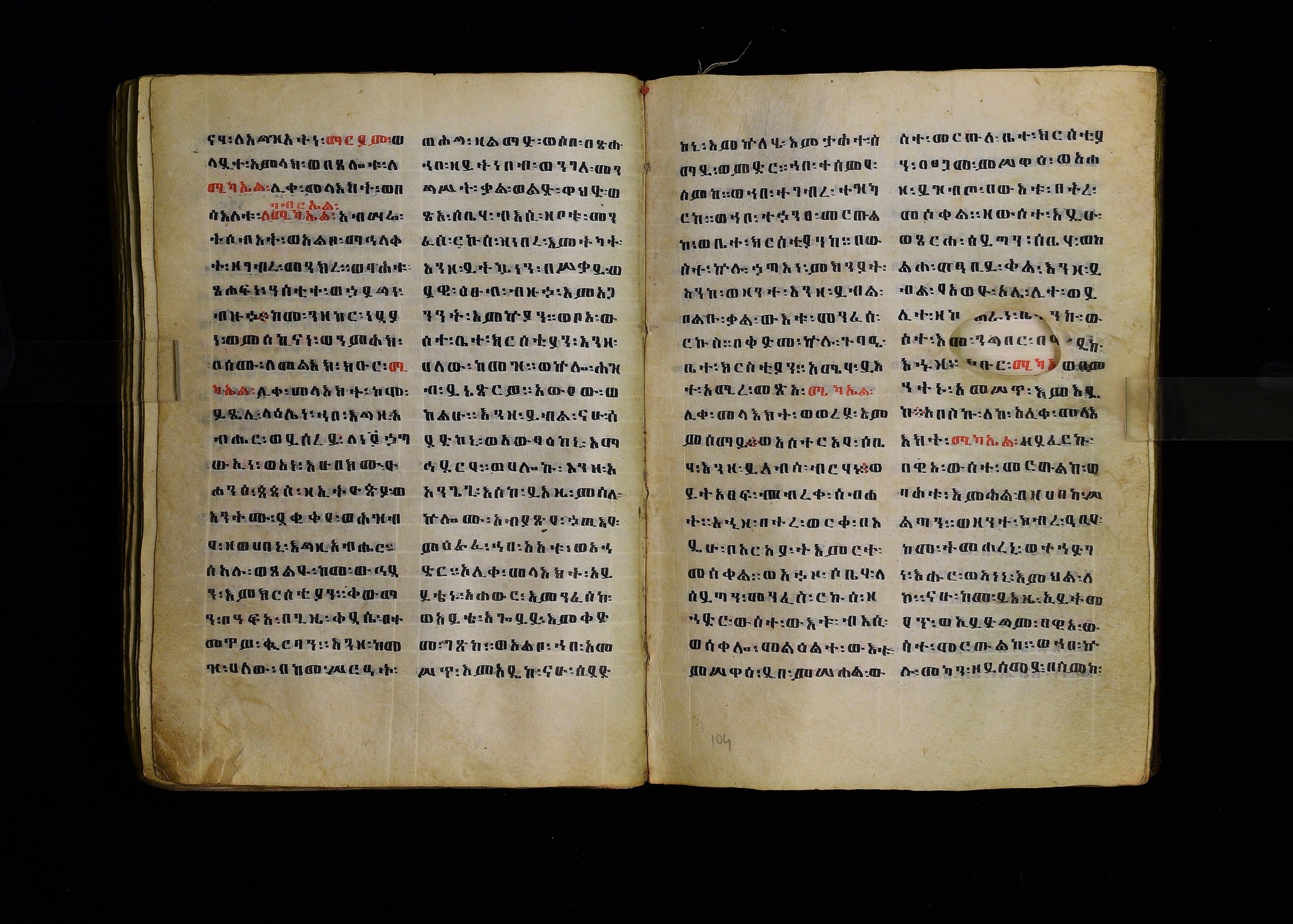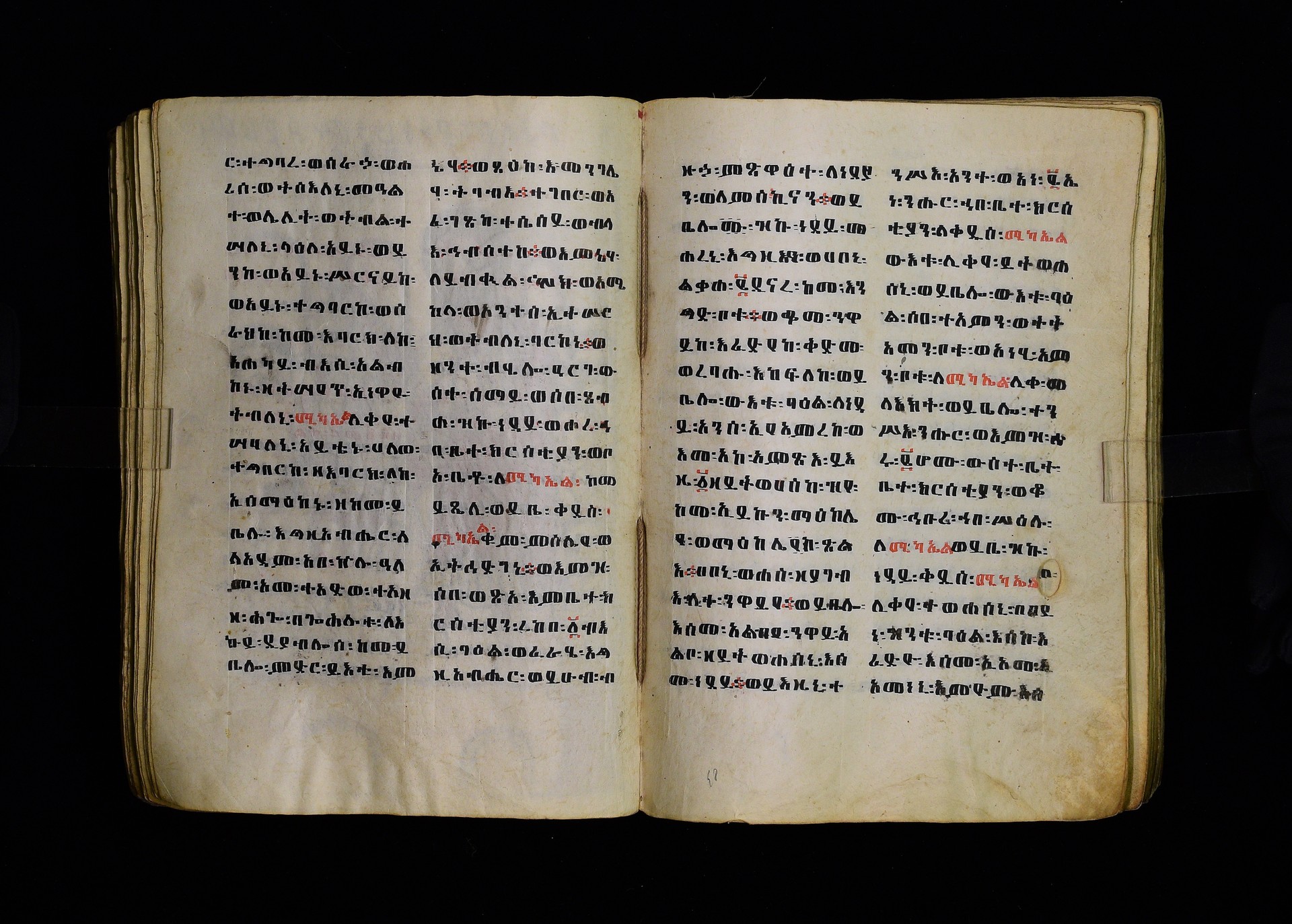 Full-page polychrome miniatures are found on f. 8v (St Michael), f. 33v (George and the dragon), f. 46v (the miracle of the wedding at Cana, with a caption በቃና added in a secondary hand), f. 70v (St Michele). |