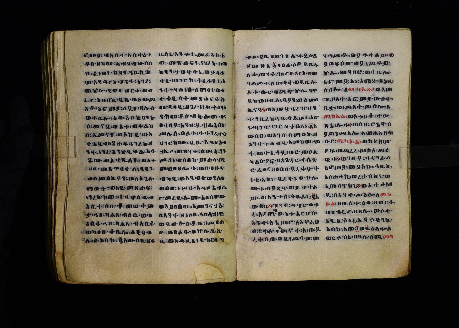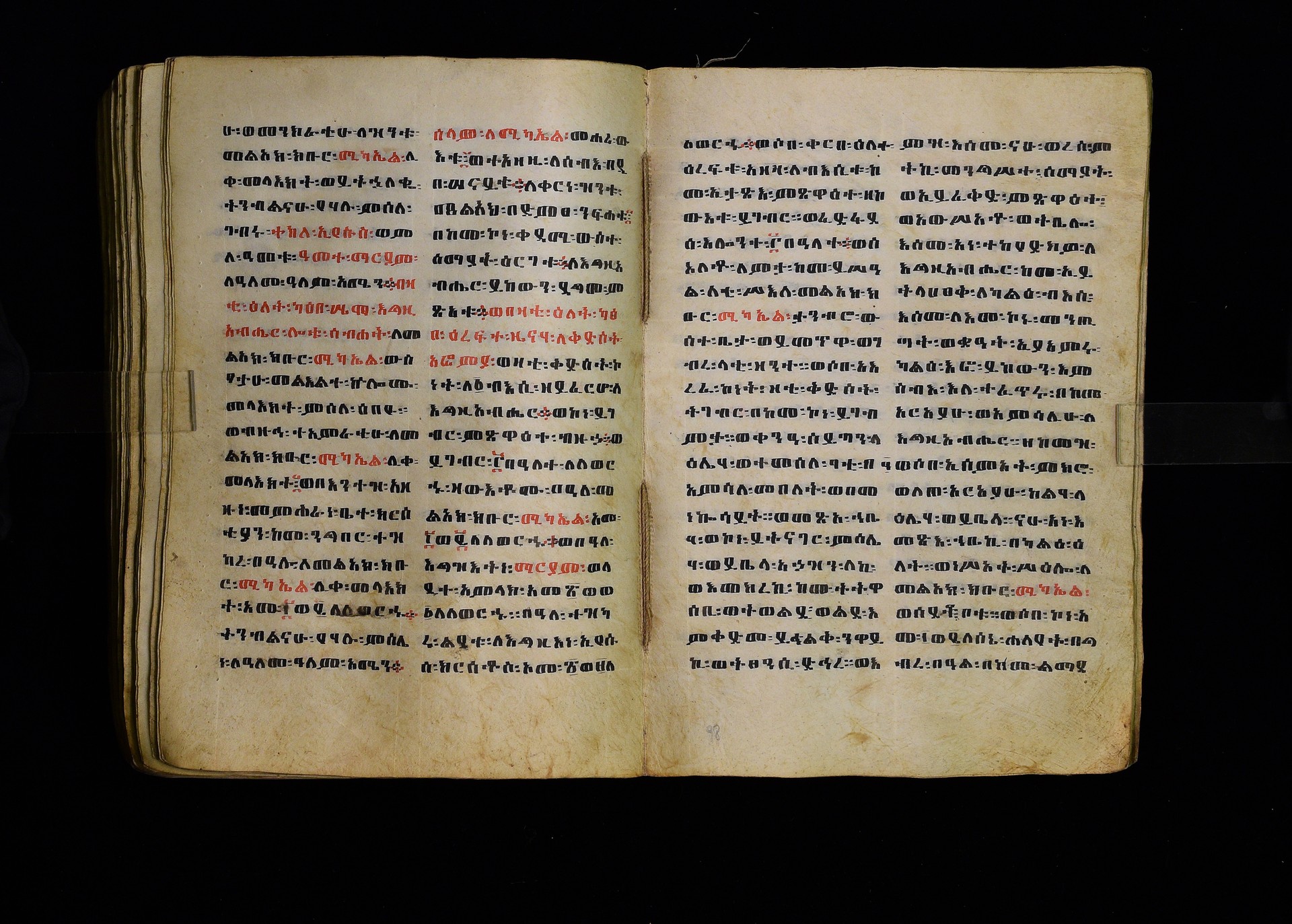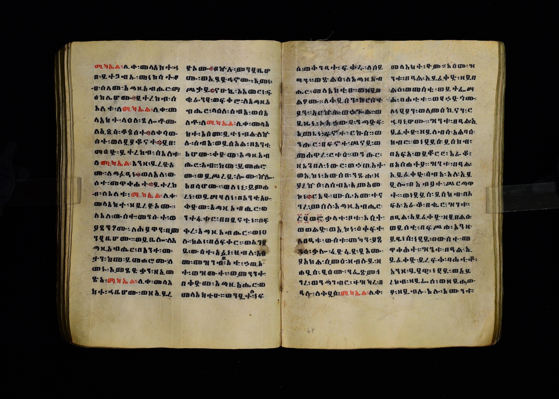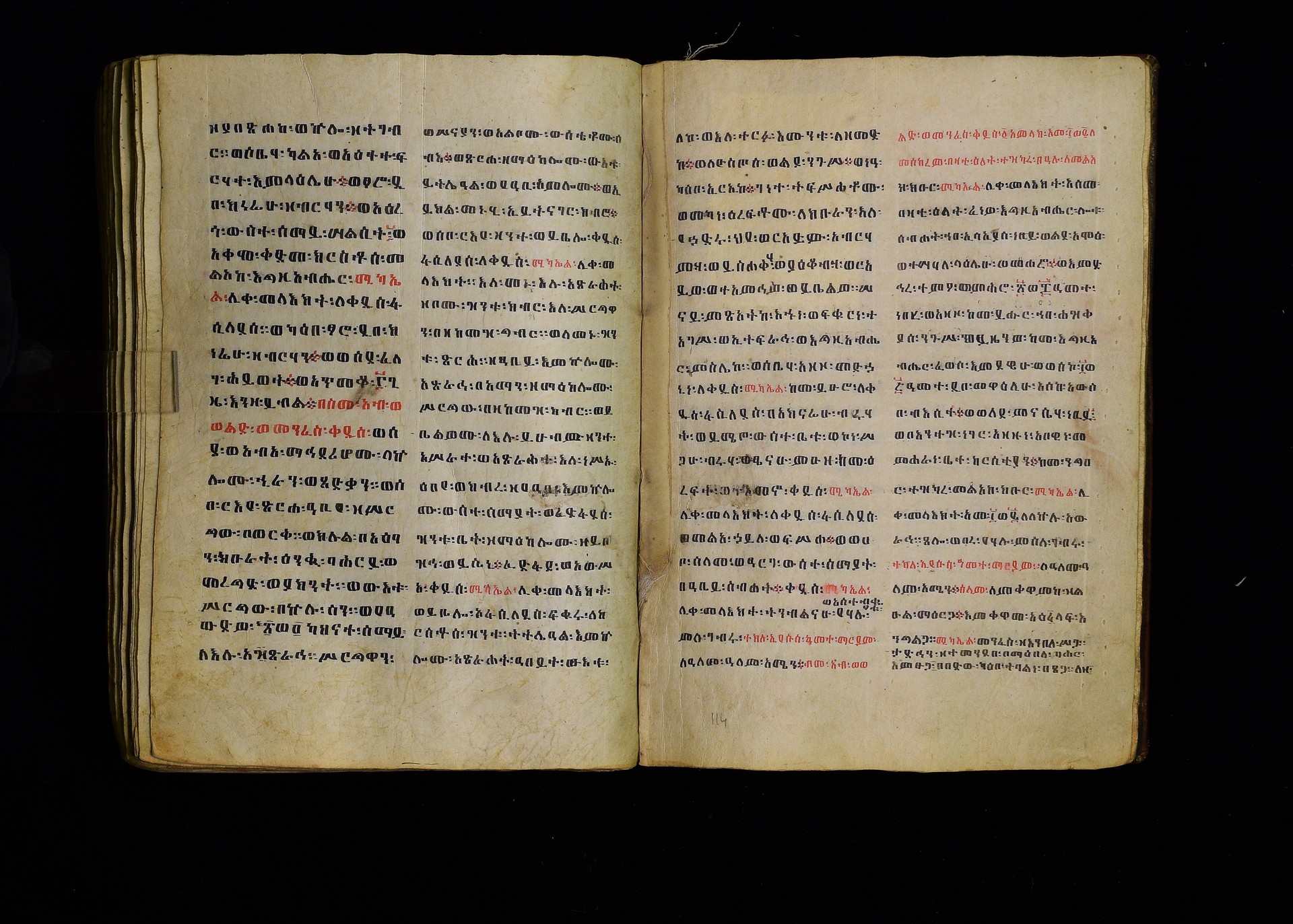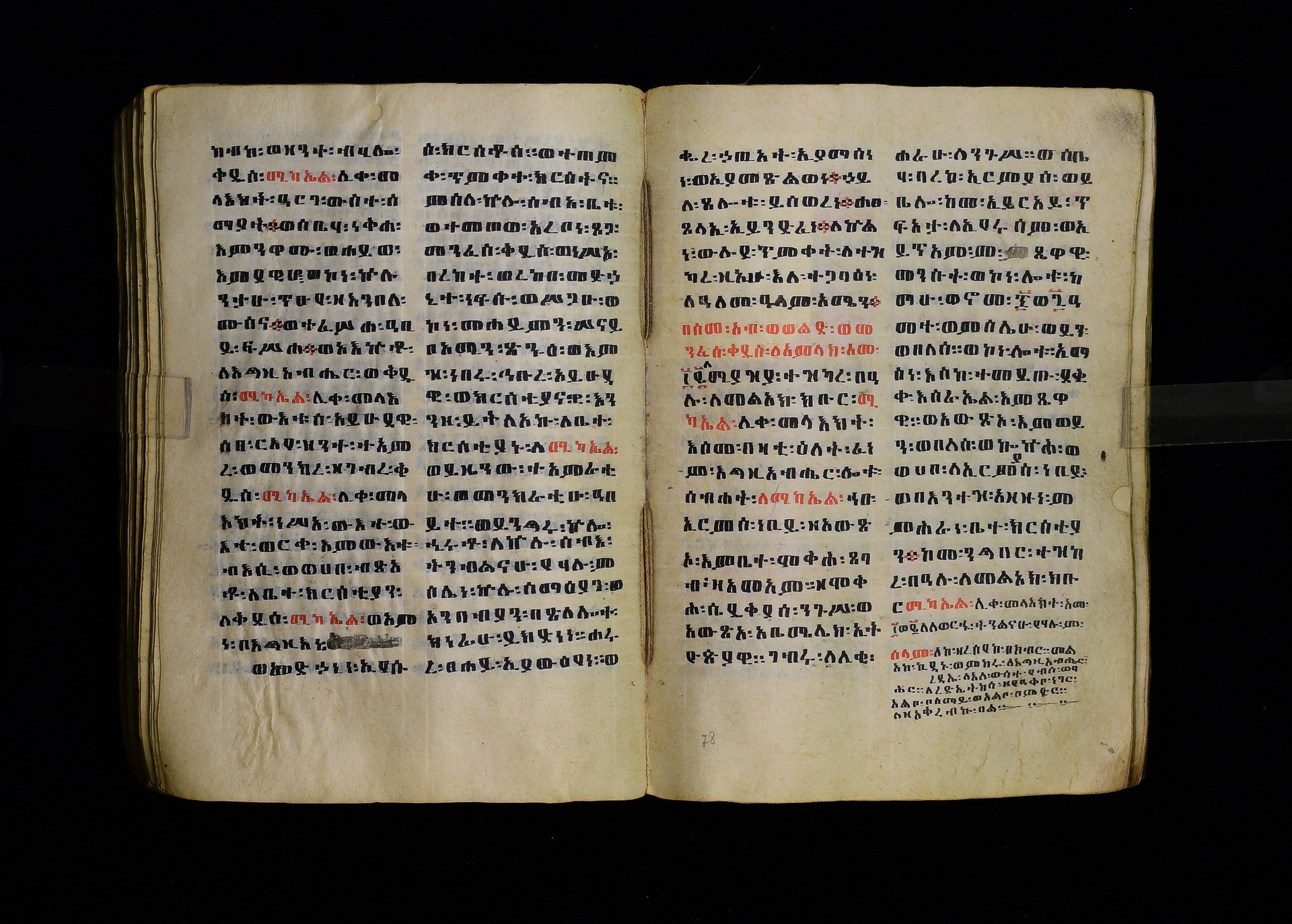 Full-page polychrome miniatures are found on f. 8v (St Michael), f. 33v (George and the dragon), f. 46v (the miracle of the wedding at Cana, with a caption በቃና added in a secondary hand), f. 70v (St Michele). |